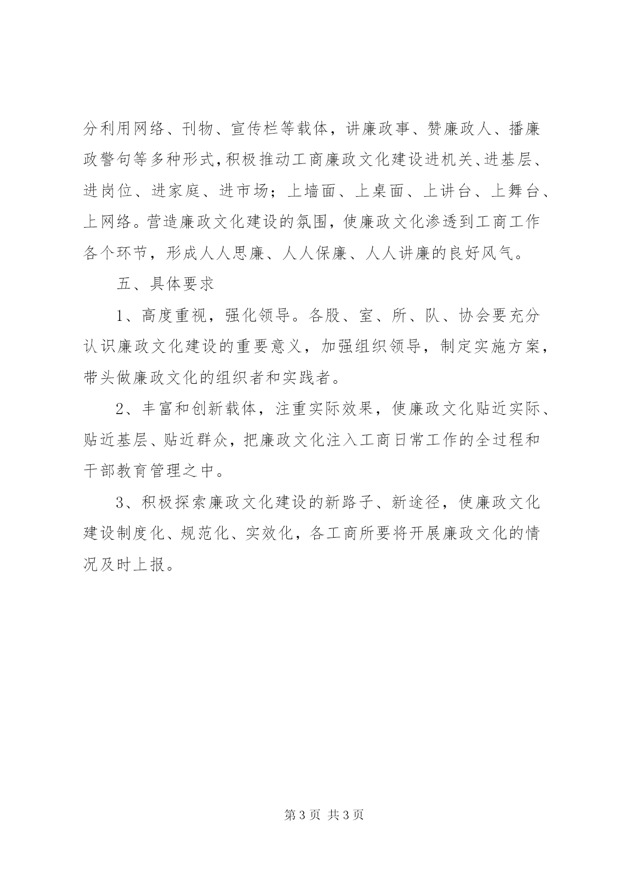 第PAGE\*Arabic\*MERGEFORMAT3页共NUMPAGES\*MERGEFORMAT3页工商开展廉政文化建设方案编者按:本文主要从指导思想;组织领导;廉政文化建设的主要任务;工商廉政文化建设的主要内容;具体要求几个方面进行讲述。其中,主要内容包括:以党的十七大会议精神及“三个代表”重要思想为指导,营造讲廉、思廉、思廉、践廉的环境和氛围;为切实加强这项工作,成立廉政文化建设领导组;主要任务,按照“建一流队伍、带一流班子、树一流形象、创一流业绩”的总体要求;加强廉政理论知识教育、推进廉政文化建设,开展廉政文化活动、加大廉政文化宣传声势和效果,营造廉政文化氛围;工作要求,高度重视,强化领导、丰富和创新载体,注重实际效果、积极探索廉政文化建设的新路子、新途径等。详细信息请参照下面:为进一步贯彻落实中央《关于建立健全教育、制度、监督并重的惩治和预防腐败体系实施纲要》和上级机关关于加强廉政文化建设的具体要求,从制度上不断完善管理体制和运行机制,在全社会营造良好的廉政氛围,构筑思想道德防线,结合我局实际,特制定廉政文化实施方案。一、指导思想以党的十七大会议精神及“三个代表”重要思想为指导,按照建立健全教育、制度、监督并重的惩治和预防反腐败体系的总体要求,多层次地开展廉政文化建设活动,提升全体党员干部的党性修养,开展具有工商特点的廉政文化,营造讲廉、思廉、思廉、践廉的环境和氛围。二、组织领导为切实加强这项工作的领导,我局成立廉政文化建设领导组。组长:*副组长:*成员由股、所、室、队、协会负责人担任,领导组下设办公室,办公室设在监察室。三、廉政文化建设的主要任务按照“建一流队伍、带一流班子、树一流形象、创一流业绩”的总体要求,进一步加强反腐倡廉教育,丰富廉政文化内涵,拓展廉政文化阵地,为县域经济发展提供坚强的保证。四、工商廉政文化建设的主要内容1、加强廉政理论知识教育,让廉政意识和廉政思想深入人心,通过组织学习、民主生活会、纪检监察活动和党课等形式,进行理想、信念、道德教育和党纪条规等国家法律法规教育。2、推进廉政文化建设,开展廉政文化活动。即组织领导干部进行一次公开“廉政承诺”,县局与各股、室、所等单位负责人签订廉政建设目标责任书,建立完善干部廉政档案,组织全体干部读好廉政书,做好读书笔记,学唱廉政歌,筑好廉政墙。3、加大廉政文化宣传声势和效果,营造廉政文化氛围。充分利用网络、刊物、宣传栏等载体,讲廉政事、赞廉政人、播廉政警句等多种形式,积极推动工商廉政文化建设进机关、进基层、进岗位、进家庭、进市场;上墙面、上桌面、上讲台、上舞台、上网络。营造廉政文化建设的氛围,使廉政文化渗透到工商工作各个环节,形成人人思廉、人人保廉、人人讲廉的良好风气。五、具体要求1、高度重视,强化领导。各股、室、所、队、协会要充分认识廉政文化建设的重要意义,加强组织领导,制定实施方案,带头做廉政文化的组织者和实践者。2、丰富和创新载体,注重实际效果,使廉政文化贴近实际、贴近基层、贴近群众,把廉政文化注入工商日常工作的全过程和干部教育管理之中。3、积极探索廉政文化建设的新路子、新途径,使廉政文化建设制度化、规范化、实效化,各工商所要将开展廉政文化的情况及时上报。