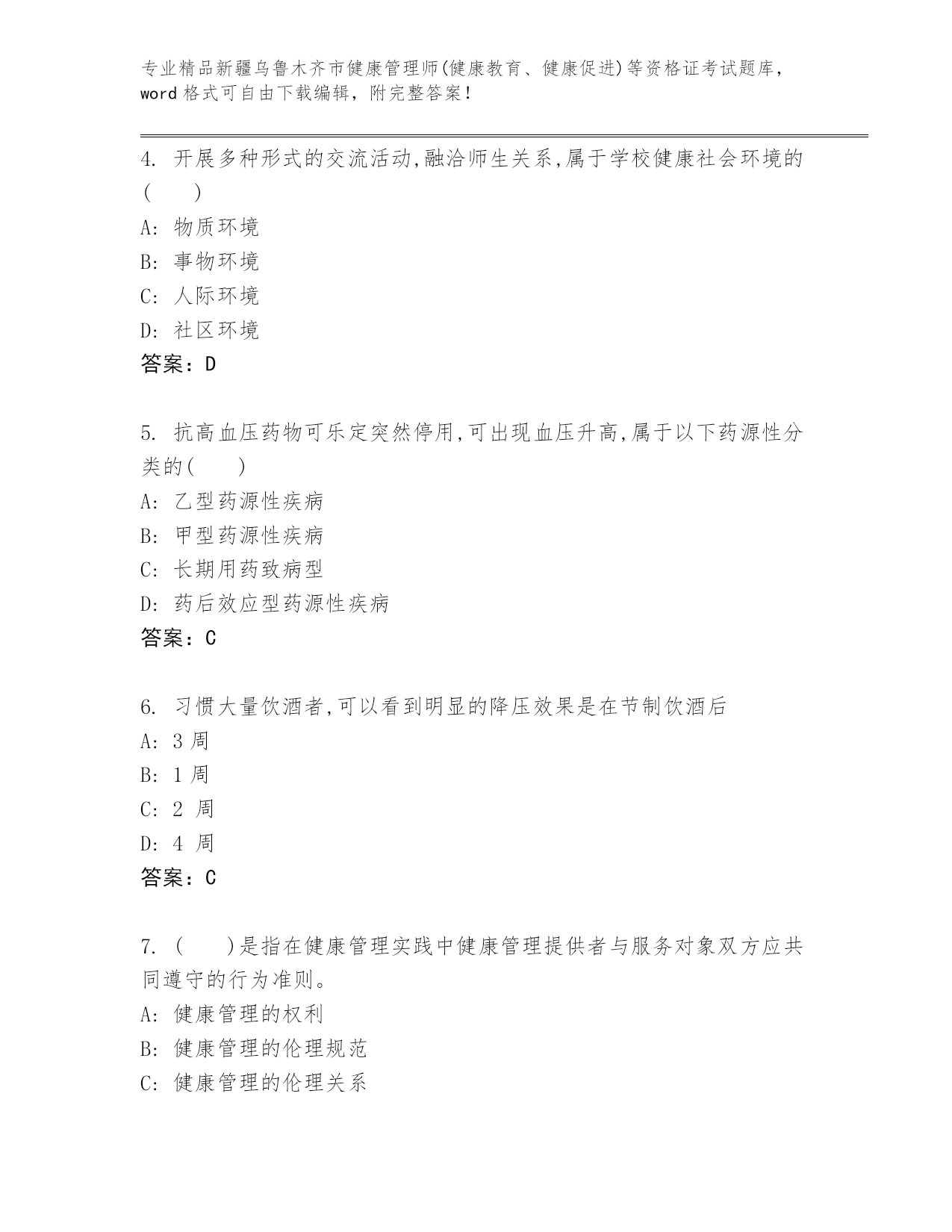 优选新疆乌鲁木齐市健康管理师(健康教育、健康促进)等资格证考试完整题库及答案【全国通用】