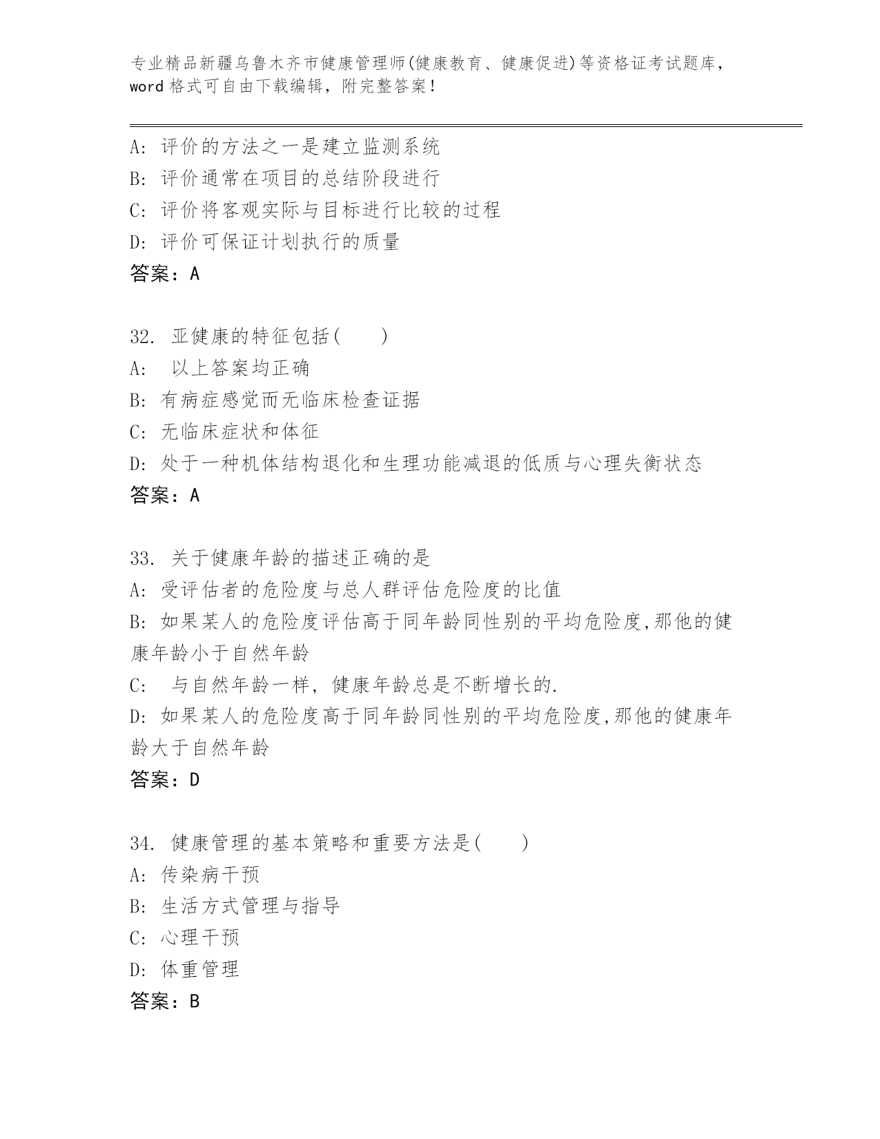 优选新疆乌鲁木齐市健康管理师(健康教育、健康促进)等资格证考试完整题库及答案【全国通用】.docx