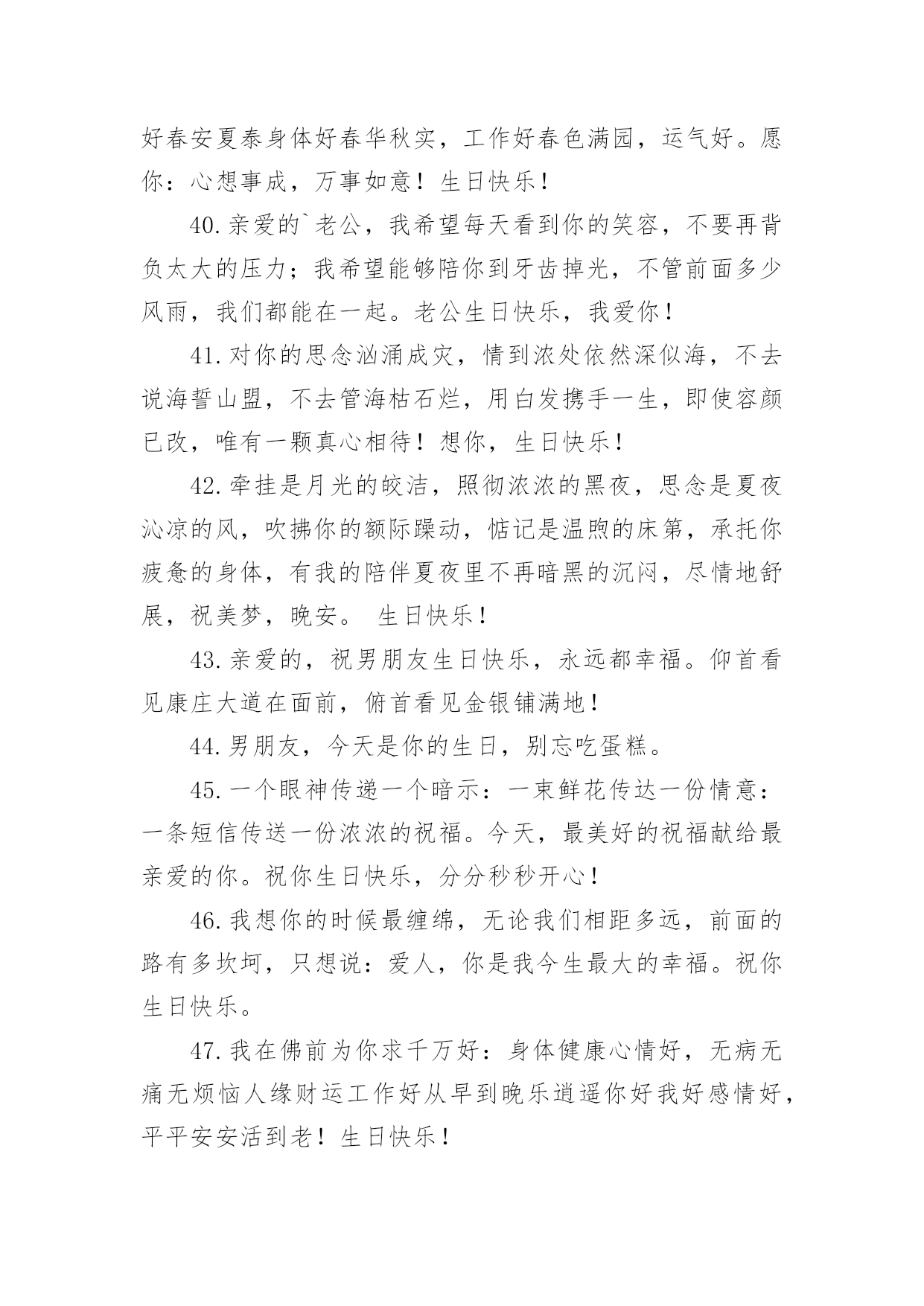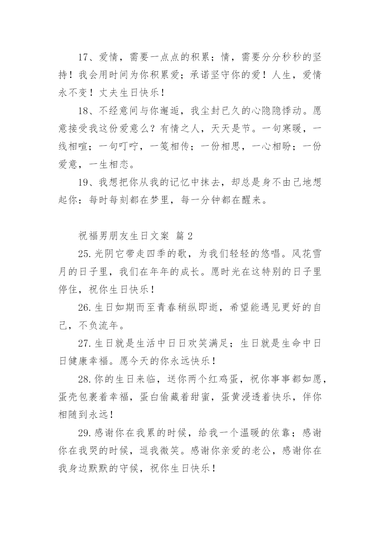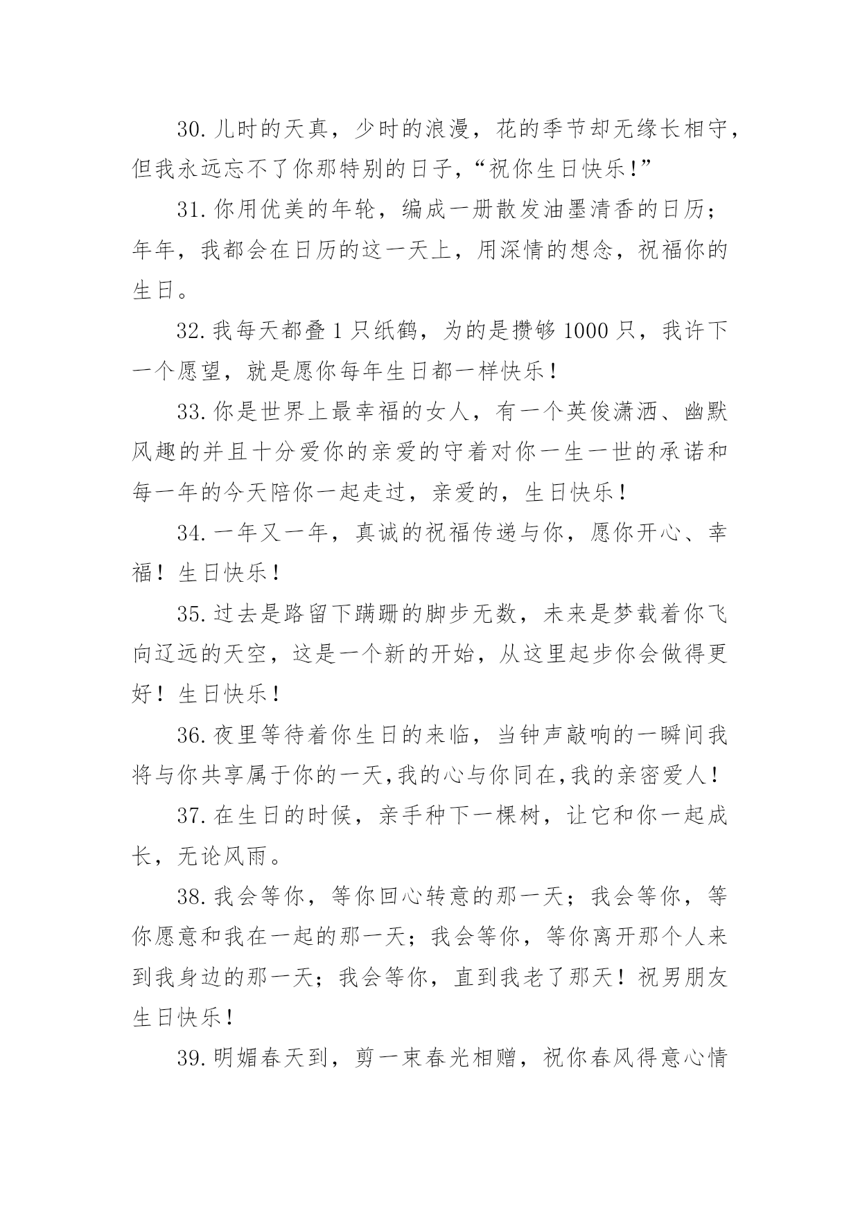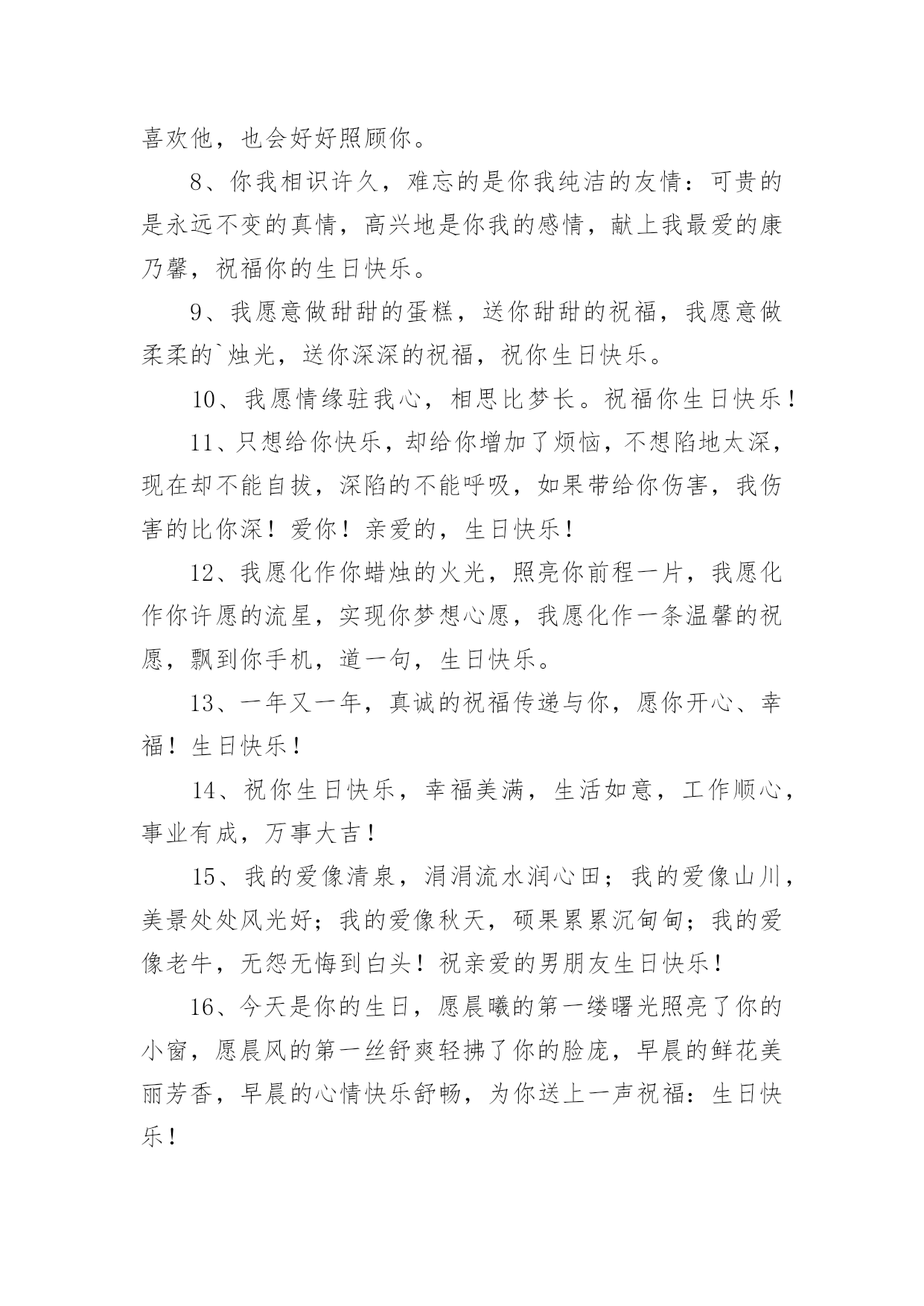 祝福男朋友生日文案无论是身处学校还是步入社会,越来越多人钟情于在网上发布文案,文案用以分享自己生活中值得纪念的小确幸。那么问题来了,到底什么样的文案才是低调奢华有内涵的呢?以下是小编精心整理的祝福男朋友生日文案,仅供参考,大家一起来看看吧。祝福男朋友生日文案篇11、愿一切的快乐,一切的幸福,一切的温馨,生日快乐!2、亲爱的,谢谢你走进我的生命,走进我的生活,让我不在孤单!祝男朋友生日快乐!3、baby,生日快乐!祝你:像猫咪一样可爱,像牦牛一样壮实,像绵羊一样温顺,像狼一样精明,永远像彩虹一样美丽!4、一年,人生与轮回相逢狭窄,满载祝福我赴千里之行,只为追赴流星,为你送上最浓的祝福,生日快乐!5、当奉献成为一种需要,爱,便是那无所谓的事情,在你的生日,接受我深深的祝福,老公生日快乐!6、你的善良让我觉得世界美好,你的可爱让我感到生活美妙,你的生日把我的祝福最先送到,愿男朋友你生日快乐,永远幸福!7、谢谢阿姨对(对象名字)的熏陶和影响,我会好好喜欢他,也会好好照顾你。8、你我相识许久,难忘的是你我纯洁的友情:可贵的是永远不变的真情,高兴地是你我的感情,献上我最爱的康乃馨,祝福你的生日快乐。9、我愿意做甜甜的蛋糕,送你甜甜的祝福,我愿意做柔柔的`烛光,送你深深的祝福,祝你生日快乐。10、我愿情缘驻我心,相思比梦长。祝福你生日快乐!11、只想给你快乐,却给你增加了烦恼,不想陷地太深,现在却不能自拔,深陷的不能呼吸,如果带给你伤害,我伤害的比你深!爱你!亲爱的,生日快乐!12、我愿化作你蜡烛的火光,照亮你前程一片,我愿化作你许愿的流星,实现你梦想心愿,我愿化作一条温馨的祝愿,飘到你手机,道一句,生日快乐。13、一年又一年,真诚的祝福传递与你,愿你开心、幸福!生日快乐!14、祝你生日快乐,幸福美满,生活如意,工作顺心,事业有成,万事大吉!15、我的爱像清泉,涓涓流水润心田;我的爱像山川,美景处处风光好;我的爱像秋天,硕果累累沉甸甸;我的爱像老牛,无怨无悔到白头!祝亲爱的男朋友生日快乐!16、今天是你的生日,愿晨曦的第一缕曙光照亮了你的小窗,愿晨风的第一丝舒爽轻拂了你的脸庞,早晨的鲜花美丽芳香,早晨的心情快乐舒畅,为你送上一声祝福:生日快乐!17、爱情,需要一点点的积累;情,需要分分秒秒的坚持!我会用时间为你积累爱;承诺坚守你的爱!人生,爱情永不变!丈夫生日快乐!18、不经意间与你邂逅,我尘封已久的心隐隐悸动。愿意接受我这份爱意么?有情之人,天天是节。一句寒暖,一线相喧;一句叮咛,一笺相传;一份相思,一心相盼;一份爱意,一生相恋。19、我想把你从我的记忆中抹去,却总是身不由己地想起你:每时每刻都在梦里,每一分钟都在醒来。祝福男朋友生日文案篇225.光阴它带走四季的歌,为我们轻轻的悠唱。风花雪月的日子里,我们在年年的成长。愿时光在这特别的日子里停住,祝你生日快乐!26.生日如期而至青春稍纵即逝,希望能遇见更好的自己,不负流年。27.生日就是生活中日日欢笑满足;生日就是生命中日日健康幸福。愿今天的你永远快乐!28.你的生日来临,送你两个红鸡蛋,祝你事事都如愿,蛋壳包裹着幸福,蛋白偷藏着甜蜜,蛋黄浸透着快乐,伴你相随到永远!29.感谢你在我累的时候,给我一个温暖的依靠;感谢你在我哭的时候,逗我微笑。感谢你亲爱的老公,感谢你在我身边默默的守候,祝你生日快乐!30.儿时的天真,少时的浪漫,花的季节却无缘长相守,但我永远忘不了你那特别的日子,“祝你生日快乐!”31.你用优美的年轮,编成一册散发油墨清香的日历;年年,我都会在日历的这一天上,用深情的想念,祝福你的生日。32.我每天都叠1只纸鹤,为的是攒够1000只,我许下一个愿望,就是愿你每年生日都一样快乐!33.你是世界上最幸福的女人,有一个英俊潇洒、幽默风趣的并且十分爱你的亲爱的守着对你一生一世的承诺和每一年的今天陪你一起走过,亲爱的,生日快乐!34.一年又一年,真诚的祝福传递与你,愿你开心、幸福!生日快乐!35.过去是路留下蹒跚的脚步无数,未来是梦载着你飞向辽远的天空,这是一个新的开始,从这里起步你会做得更好!生日快乐!36.夜里等待着你生日的来临,当钟声敲响的一瞬间我将与你共享属于你的一天,我的心与你同在,我的亲密爱人!37.在生日的时候,亲手种下一棵树,让它和你一起成长,无论风雨。38.我会等你,等你回心转意的那一天;我会等你,等你愿意和我在一起的那一天;我会等你,等你离开那个人来到我身边的那一天;我会等你,直到我老了那天!祝男朋友生日快乐!39.明媚春天到,剪一束春光相赠,祝你春风得意心情好春安夏泰身体好春华秋实,工作好春色满园,运气好。愿你:心想事成,万事如意!生日快乐!40.亲爱的`老公,我希望每天看到你的笑容,不要再背负太大的压力;我希望能够陪你到牙齿掉光,不管前面多少风雨,我们都