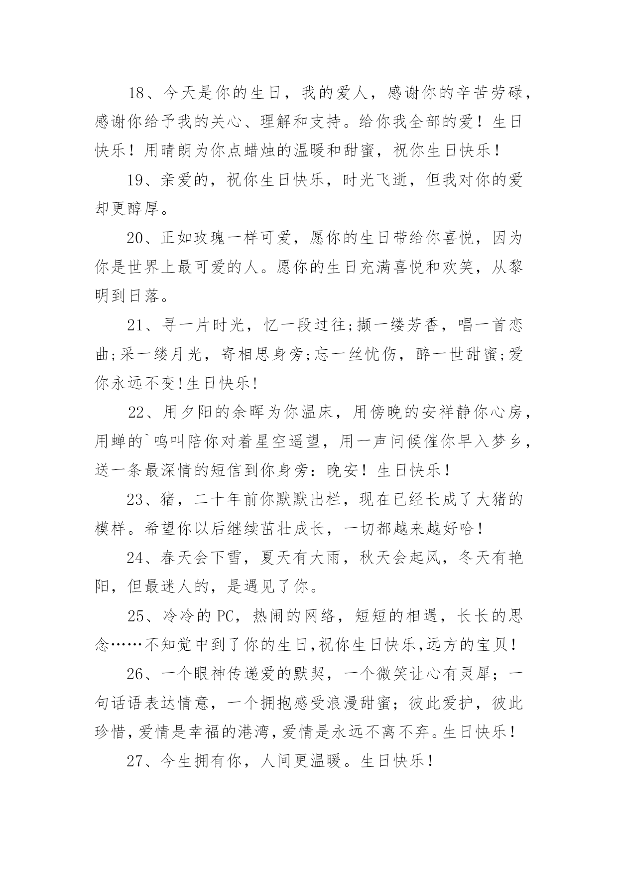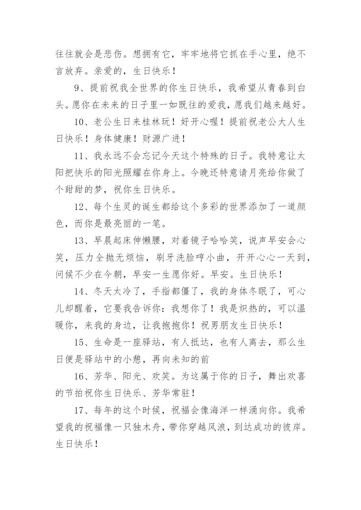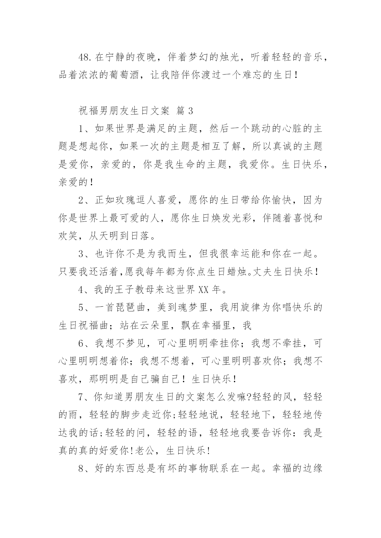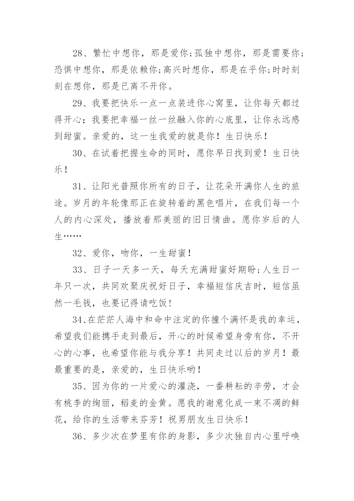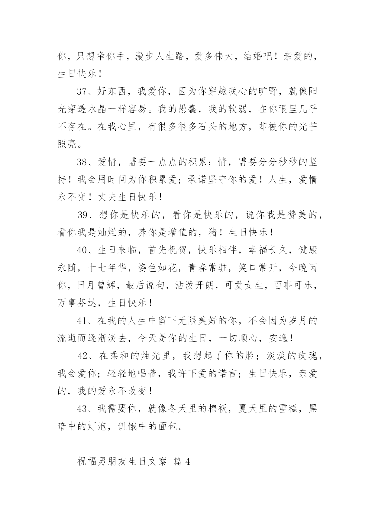 祝福男朋友生日文案无论是身处学校还是步入社会,越来越多人钟情于在网上发布文案,文案用以分享自己生活中值得纪念的小确幸。那么问题来了,到底什么样的文案才是低调奢华有内涵的呢?以下是小编精心整理的祝福男朋友生日文案,仅供参考,大家一起来看看吧。祝福男朋友生日文案篇11、愿一切的快乐,一切的幸福,一切的温馨,生日快乐!2、亲爱的,谢谢你走进我的生命,走进我的生活,让我不在孤单!祝男朋友生日快乐!3、baby,生日快乐!祝你:像猫咪一样可爱,像牦牛一样壮实,像绵羊一样温顺,像狼一样精明,永远像彩虹一样美丽!4、一年,人生与轮回相逢狭窄,满载祝福我赴千里之行,只为追赴流星,为你送上最浓的祝福,生日快乐!5、当奉献成为一种需要,爱,便是那无所谓的事情,在你的生日,接受我深深的祝福,老公生日快乐!6、你的善良让我觉得世界美好,你的可爱让我感到生活美妙,你的生日把我的祝福最先送到,愿男朋友你生日快乐,永远幸福!7、谢谢阿姨对(对象名字)的熏陶和影响,我会好好喜欢他,也会好好照顾你。8、你我相识许久,难忘的是你我纯洁的友情:可贵的是永远不变的真情,高兴地是你我的感情,献上我最爱的康乃馨,祝福你的生日快乐。9、我愿意做甜甜的蛋糕,送你甜甜的祝福,我愿意做柔柔的`烛光,送你深深的祝福,祝你生日快乐。10、我愿情缘驻我心,相思比梦长。祝福你生日快乐!11、只想给你快乐,却给你增加了烦恼,不想陷地太深,现在却不能自拔,深陷的不能呼吸,如果带给你伤害,我伤害的比你深!爱你!亲爱的,生日快乐!12、我愿化作你蜡烛的火光,照亮你前程一片,我愿化作你许愿的流星,实现你梦想心愿,我愿化作一条温馨的祝愿,飘到你手机,道一句,生日快乐。13、一年又一年,真诚的祝福传递与你,愿你开心、幸福!生日快乐!14、祝你生日快乐,幸福美满,生活如意,工作顺心,事业有成,万事大吉!15、我的爱像清泉,涓涓流水润心田;我的爱像山川,美景处处风光好;我的爱像秋天,硕果累累沉甸甸;我的爱像老牛,无怨无悔到白头!祝亲爱的男朋友生日快乐!16、今天是你的生日,愿晨曦的第一缕曙光照亮了你的小窗,愿晨风的第一丝舒爽轻拂了你的脸庞,早晨的鲜花美丽芳香,早晨的心情快乐舒畅,为你送上一声祝福:生日快乐!17、爱情,需要一点点的积累;情,需要分分秒秒的坚持!我会用时间为你积累爱;承诺坚守你的爱!人生,爱情永不变!丈夫生日快乐!18、不经意间与你邂逅,我尘封已久的心隐隐悸动。愿意接受我这份爱意么?有情之人,天天是节。一句寒暖,一线相喧;一句叮咛,一笺相传;一份相思,一心相盼;一份爱意,一生相恋。19、我想把你从我的记忆中抹去,却总是身不由己地想起你:每时每刻都在梦里,每一分钟都在醒来。祝福男朋友生日文案篇225.光阴它带走四季的歌,为我们轻轻的悠唱。风花雪月的日子里,我们在年年的成长。愿时光在这特别的日子里停住,祝你生日快乐!26.生日如期而至青春稍纵即逝,希望能遇见更好的自己,不负流年。27.生日就是生活中日日欢笑满足;生日就是生命中日日健康幸福。愿今天的你永远快乐!28.你的生日来临,送你两个红鸡蛋,祝你事事都如愿,蛋壳包裹着幸福,蛋白偷藏着甜蜜,蛋黄浸透着快乐,伴你相随到永远!29.感谢你在我累的时候,给我一个温暖的依靠;感谢你在我哭的时候,逗我微笑。感谢你亲爱的老公,感谢你在我身边默默的守候,祝你生日快乐!30.儿时的天真,少时的浪漫,花的季节却无缘长相守,但我永远忘不了你那特别的日子,“祝你生日快乐!”31.你用优美的年轮,编成一册散发油墨清香的日历;年年,我都会在日历的这一天上,用深情的想念,祝福你的生日。32.我每天都叠1只纸鹤,为的是攒够1000只,我许下一个愿望,就是愿你每年生日都一样快乐!33.你是世界上最幸福的女人,有一个英俊潇洒、幽默风趣的并且十分爱你的亲爱的守着对你一生一世的承诺和每一年的今天陪你一起走过,亲爱的,生日快乐!34.一年又一年,真诚的祝福传递与你,愿你开心、幸福!生日快乐!35.过去是路留下蹒跚的脚步无数,未来是梦载着你飞向辽远的天空,这是一个新的开始,从这里起步你会做得更好!生日快乐!36.夜里等待着你生日的来临,当钟声敲响的一瞬间我将与你共享属于你的一天,我的心与你同在,我的亲密爱人!37.在生日的时候,亲手种下一棵树,让它和你一起成长,无论风雨。38.我会等你,等你回心转意的那一天;我会等你,等你愿意和我在一起的那一天;我会等你,等你离开那个人来到我身边的那一天;我会等你,直到我老了那天!祝男朋友生日快乐!39.明媚春天到,剪一束春光相赠,祝你春风得意心情好春安夏泰身体好春华秋实,工作好春色满园,运气好。愿你:心想事成,万事如意!生日快乐!40.亲爱的`老公,我希望每天看到你的笑容,不要再背负太大的压力;我希望能够陪你到牙齿掉光,不管前面多少风雨,我们都