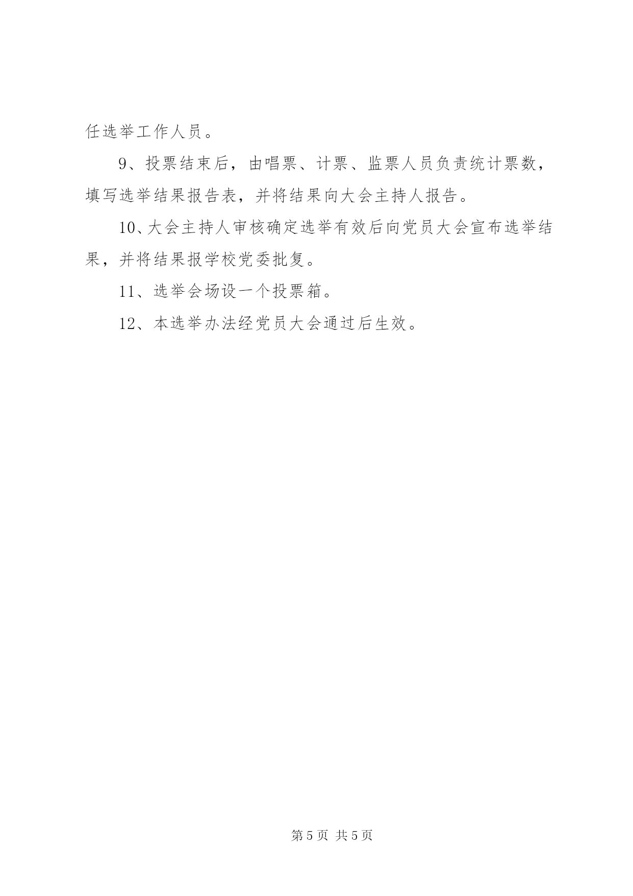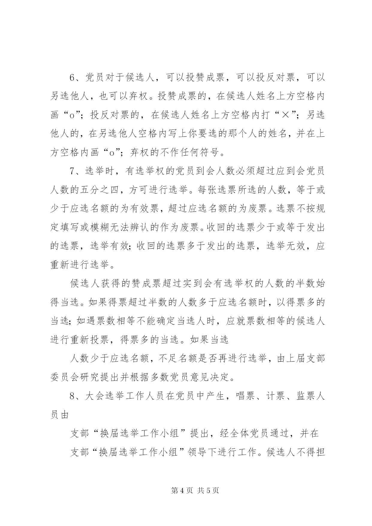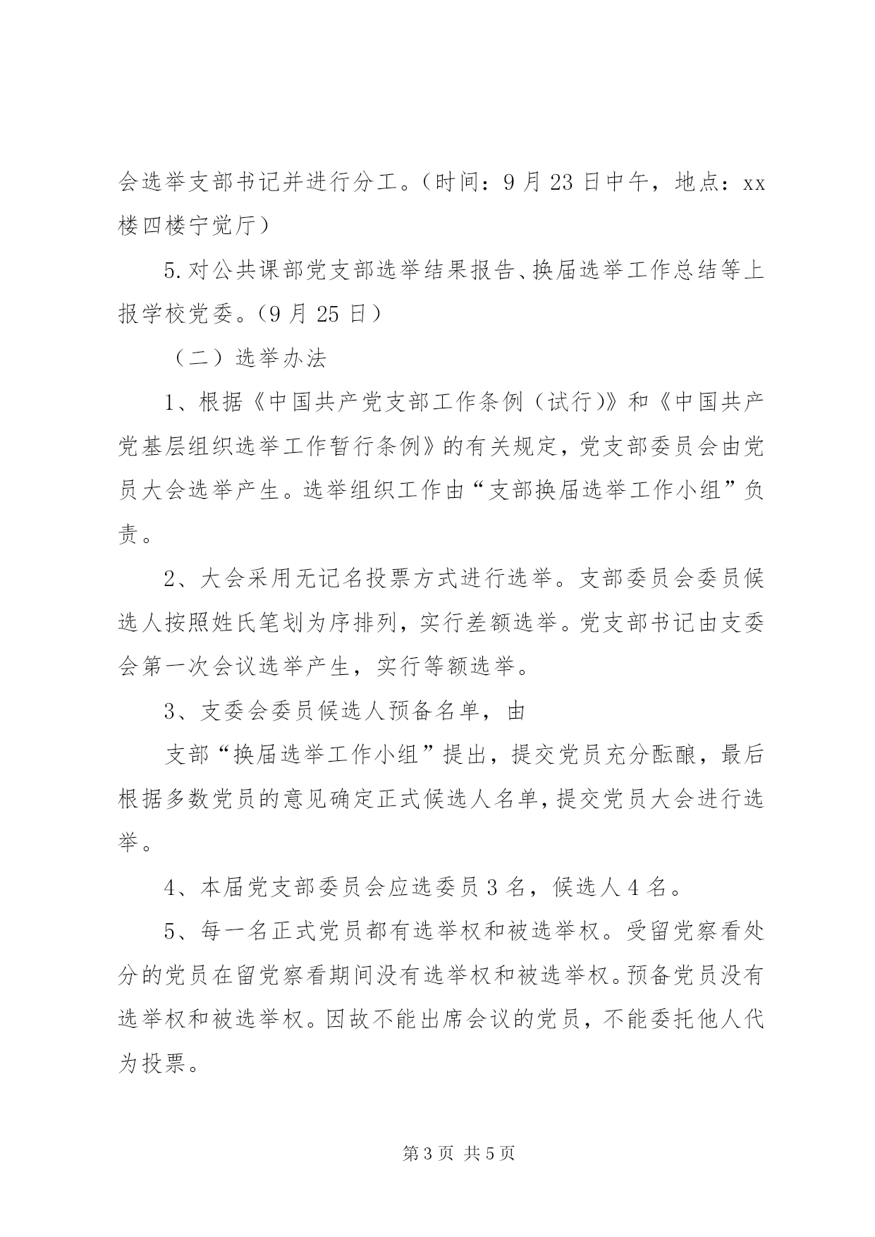 第PAGE\*Arabic\*MERGEFORMAT5页共NUMPAGES\*MERGEFORMAT5页学校公共课部党支部换届选举工作方案一、指导思想以习近平新时代中国特色社会主义思想为指导,遵守党章,坚持民主集中制,按照加强党的执政能力建设和先进性建设的要求,把思想政治素质好、工作能力强、在师生中有威信的优秀党员选拔到支部领导岗位上来,不断增强基层党组织的创造力、凝聚力和战斗力,为两校融合发展和创建幼儿师范高专提供坚强的组织保证。二、基本原则党管干部、德才兼备原则;公开平等、竞争择优原则;严格程序、规范操作原则。三、党支部委员会构成党支部委员会由3人组成,即党支部书记和组织委员、宣传委员,其中组织委员兼任纪检委员。四、党支部委员会委员候选人条件党支部委员会委员候选人必须是正式组织关系隶属于学校委员会的中国共产党正式党员,能任满一届(三年)。同时符合下列条件:(一)理想信念坚定,党性强,作风好。(二)认真执行党中央和上级党组织的决议、决定,有较强的组织观念、管理能力和议事决策水平。对党的事业高度负责,能够如实反映党员的意见,正确行使委员的职权和义务。(三)具有大局观念和宗旨意识,爱岗敬业,教书育人,为人公道正派,清正廉洁,团结同志,有良好的群众基础。(四)党支部书记一般应有1年以上党龄,具有一定的党内政治生活和党务工作经验。五、工作程序(一)工作流程1.成立在职党员支部“换届选举工作小组”。根据学校发展的需要,由于党支部设置和支部成员发生变化,为了便于开展换届选举工作,党总支指定公共课部三名党员组成“换届选举工作小组”,全面负责本支部的换届选举工作,组长主持会议。组长:xxx;成员:xx,xx2.召开支部“换届选举工作小组”成员会议,布置换届选举具体工作。(时间:9月13日,地点:公共课部办公室)3.召开支部“换届选举工作小组”会议,研究本支部换届选举工作,提名新一届党支部委员候选人预备人选并上报,推选换届选举大会计票、唱票和监票人员。(时间:9月16日,地点:公共课部办公室)4.召开支部党员大会,将经学校党委批准的支委候选人预备人选名单提交党员大会讨论,根据多数党员的意见确定正式候选人(4人);选举产生新一届党支部委员会;新一届党支部委员会选举支部书记并进行分工。(时间:9月23日中午,地点:xx楼四楼宁觉厅)5.对公共课部党支部选举结果报告、换届选举工作总结等上报学校党委。(9月25日)(二)选举办法1、根据《中国共产党支部工作条例(试行)》和《中国共产党基层组织选举工作暂行条例》的有关规定,党支部委员会由党员大会选举产生。选举组织工作由“支部换届选举工作小组”负责。2、大会采用无记名投票方式进行选举。支部委员会委员候选人按照姓氏笔划为序排列,实行差额选举。党支部书记由支委会第一次会议选举产生,实行等额选举。3、支委会委员候选人预备名单,由支部“换届选举工作小组”提出,提交党员充分酝酿,最后根据多数党员的意见确定正式候选人名单,提交党员大会进行选举。4、本届党支部委员会应选委员3名,候选人4名。5、每一名正式党员都有选举权和被选举权。受留党察看处分的党员在留党察看期间没有选举权和被选举权。预备党员没有选举权和被选举权。因故不能出席会议的党员,不能委托他人代为投票。6、党员对于候选人,可以投赞成票,可以投反对票,可以另选他人,也可以弃权。投赞成票的,在候选人姓名上方空格内画“o”;投反对票的,在候选人姓名上方空格内打“×”;另选他人的,在另选他人空格内写上你要选的那个人的姓名,并在上方空格内画“o”;弃权的不作任何符号。7、选举时,有选举权的党员到会人数必须超过应到会党员人数的五分之四,方可进行选举。每张选票所选的人数,等于或少于应选名额的为有效票,超过应选名额的为废票。选票不按规定填写或模糊无法辨认的作为废票。收回的选票少于或等于发出的选票,选举有效;收回的选票多于发出的选票,选举无效,应重新进行选举。候选人获得的赞成票超过实到会有选举权的人数的半数始得当选。如果得票超过半数的人数多于应选名额时,以得票多的当选;如遇票数相等不能确定当选人时,应就票数相等的候选人进行重新投票,得票多的当选。如果当选人数少于应选名额,不足名额是否再进行选举,由上届支部委员会研究提出并根据多数党员意见决定。8、大会选举工作人员在党员中产生,唱票、计票、监票人员由支部“换届选举工作小组”提出,经全体党员通过,并在支部“换届选举工作小组”领导下进行工作。候选人不得担任选举工作人员。9、投票结束后,由唱票、计票、监票人员负责统计票数,填写选举结果报告表,并将结果向大会主持人报告。10、大会主持人审核确定选举有效后向党员大会宣布选举结果,并将结果报学校党委批复。11、选举会场设一个投票箱。12、本选举办法经党员大会通过后生效。