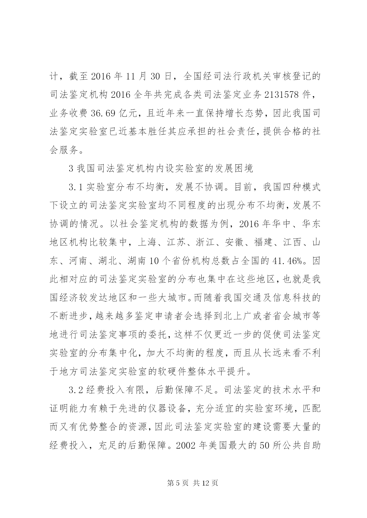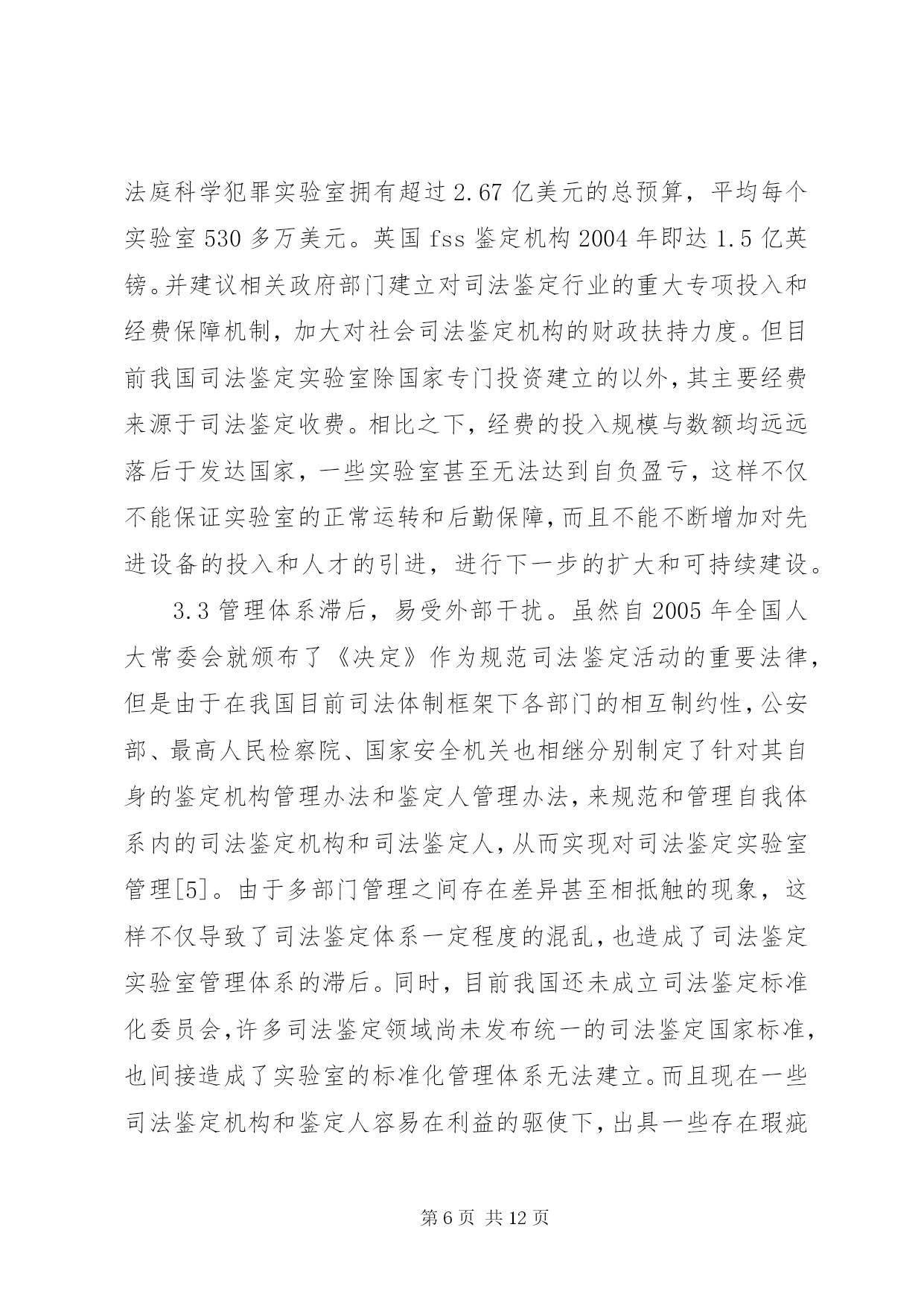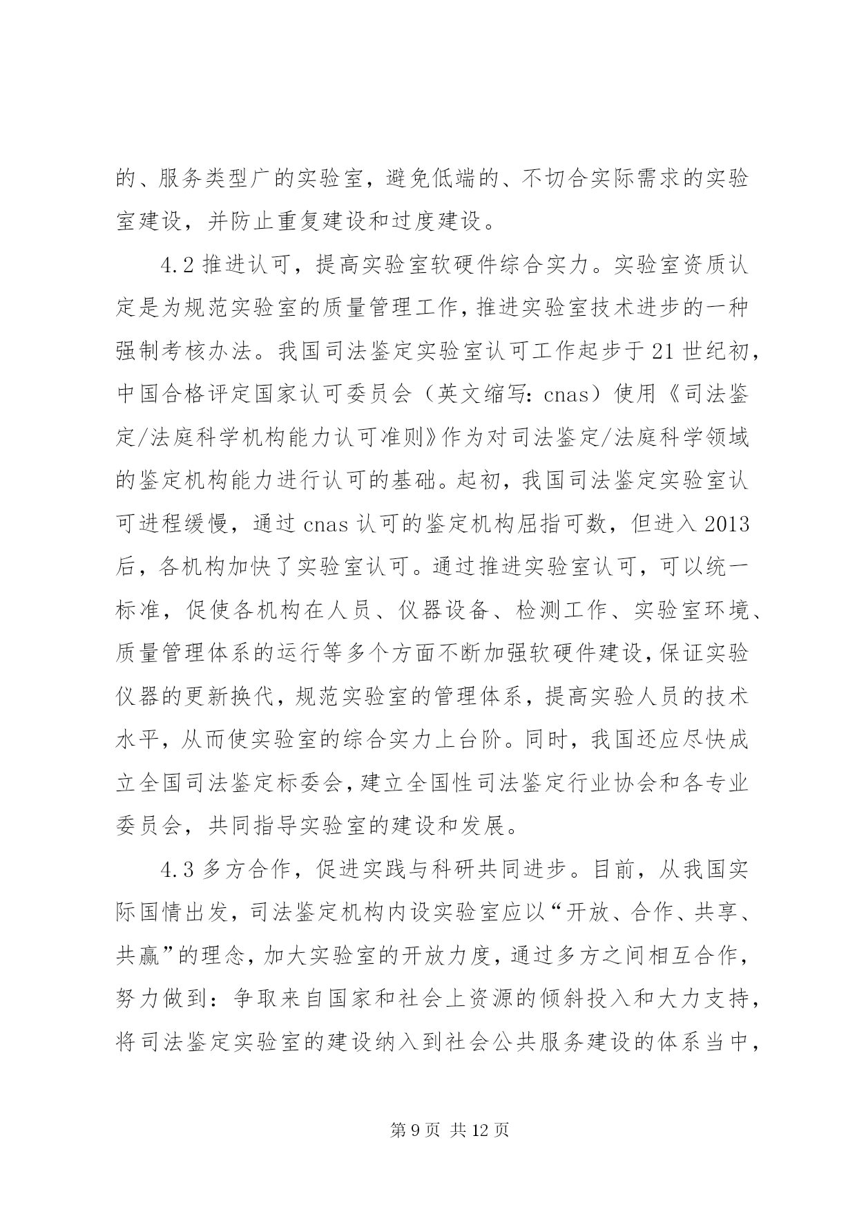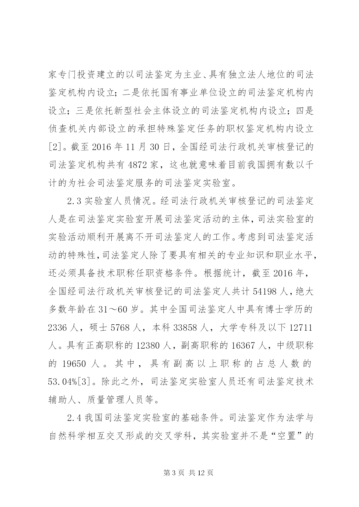 第PAGE\*Arabic\*MERGEFORMAT12页共NUMPAGES\*MERGEFORMAT12页司法鉴定机构实验室探讨[摘要]司法鉴定机构内设实验室是进行司法鉴定活动的专门实验室。随着我国司法鉴定事业的不断前进,各实验室也迎来了飞速发展的时期,成为我国司法鉴定系统不可或缺的重要组成部分。但是在分析其现状的基础上,发现实验室在整体布局、资源投入、管理体制、科研定位、人才梯队等方面存在困难,必须通过整合资源、推进认可、多方合作、培育人才等多方面举措,才能促进其快速健康发展,才能使其切实履行好司法保障功能,推动我国司法鉴定事业更好更快的发展。[关键词]司法鉴定;实验室管理;建设与发展1引言司法鉴定实验室是司法鉴定人员运用科学技术或者专门知识,针对争议解决中涉及的专门性问题进行鉴别和判断的实验场所,是司法鉴定意见主要的产生基地[1]。目前在我国司法鉴定实验室多建立在侦查机关、科研院所与社会司法鉴定机构之中,它不仅是司法机关和司法鉴定机构必不可少的组成部分,同时也是开展司法鉴定基础研究和应用研究、聚集和培育司法鉴定人才、开展学术交流的重要基地。随着社会主义法治建设的不断完善,人民群众对鉴定意见等证据的要求越来越严格,对司法鉴定活动的合法性、公正性、准确性的要求也越来越高,因此司法鉴定实验室的建设与发展也必须跟上法治建设的进程,做好软硬件建设,明确建设目标和标准,从而确保司法鉴定质量,发挥好司法鉴定的司法保障功能。2我国司法鉴定机构内设实验室基本情况2.1实验室的分类情况。根据《司法鉴定执业分类规定(试行)》《司法鉴定程序通则》(2016)等法律法规的相关规定,我国目前司法鉴定所涉及的主要鉴定类型包括:法医类鉴定、法医病理鉴定、法医临床鉴定、法医精神病鉴定、法医物证鉴定、法医毒物鉴定、物证类鉴定、文书鉴定、痕迹鉴定、微量鉴定、声像资料鉴定、计算机司法鉴定、环境监测司法鉴定、工程造价司法鉴定、产品质量司法鉴定、司法会计鉴定、知识产权司法鉴定、税务司法鉴定、农业司法鉴定、资产评估司法鉴定、建筑工程司法鉴定、枪弹痕迹司法鉴定,等等。因此司法鉴定实验室需根据鉴定类型进行对应的分类和建立。但根据实际情况,实验室一方面可以进行科学的统一,如法医类相关鉴定可统一设立法医司法鉴定实验室;另一方面要进行有必要的划分,如痕迹类司法鉴定实验室就要分别设立指纹实验室、枪弹痕迹鉴定实验室、足迹鉴定实验室等。2.2实验室的设立情况。我国司法鉴定实验室的设立情况是由我国的司法鉴定管理体制所决定的。根据《全国人民代表大会常务委员会关于司法鉴定管理问题的决定》(以下简称《决定》)相关规定,目前我国司法鉴定实验室的设立有4种模式:一是国家专门投资建立的以司法鉴定为主业、具有独立法人地位的司法鉴定机构内设立;二是依托国有事业单位设立的司法鉴定机构内设立;三是依托新型社会主体设立的司法鉴定机构内设立;四是侦查机关内部设立的承担特殊鉴定任务的职权鉴定机构内设立[2]。截至2016年11月30日,全国经司法行政机关审核登记的司法鉴定机构共有4872家,这也就意味着目前我国拥有数以千计的为社会司法鉴定服务的司法鉴定实验室。2.3实验室人员情况。经司法行政机关审核登记的司法鉴定人是在司法鉴定实验室开展司法鉴定活动的主体,司法实验室的实验活动顺利开展离不开司法鉴定人的工作。考虑到司法鉴定活动的特殊性,司法鉴定人除了要具有相关的专业知识和职业水平,还必须具备技术职称任职资格条件。根据统计,截至2016年,全国经司法行政机关审核登记的司法鉴定人共计54198人,绝大多数年龄在31~60岁。其中全国司法鉴定人中具有博士学历的2336人,硕士5768人,本科33858人,大学专科及以下12711人。具有正高职称的12380人,副高职称的16367人,中级职称的19650人。其中,具有副高以上职称的占总人数的53.04%[3]。除此之外,司法鉴定实验室人员还有司法鉴定技术辅助人、质量管理人员等。2.4我国司法鉴定实验室的基础条件。司法鉴定作为法学与自然科学相互交叉形成的交叉学科,其实验室并不是“空置”的实验室,而是需要有在业务范围内进行司法鉴定必要的仪器、设备;有在业务范围内进行司法鉴定必需的依法通过计量认证或者实验室认可的检测实验室[4]。为了适应诉讼活动和科技发展的需要,进一步提高司法鉴定机构的资质条件,结合司法鉴定行业的实际,做好不同类型司法鉴定机构仪器设备配置的分类化管理,司法部颁布了《司法鉴定机构仪器设备配置标准》,规定了各类司法鉴定实验室的必备和选配的实验器材,如规定了文书物证鉴定的基本必备设备有放大镜(5倍以上)、测量工具或软件(距离、角度、厚度等测量,精度应达到毫米级)、体视显微镜(45倍以上)、高倍材料显微镜(200倍以上)、图像比对系统(包