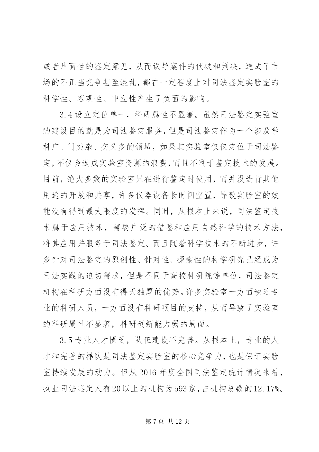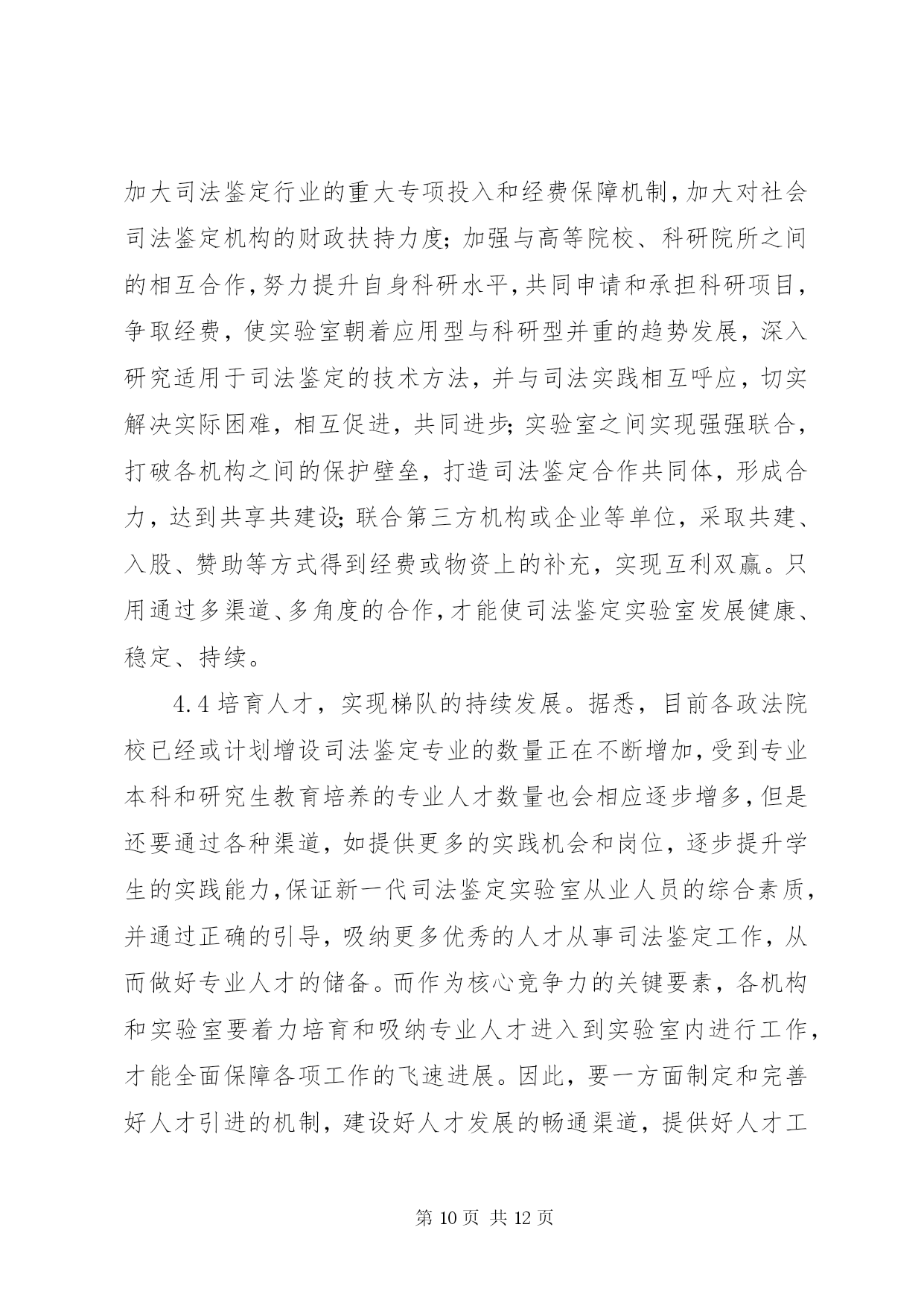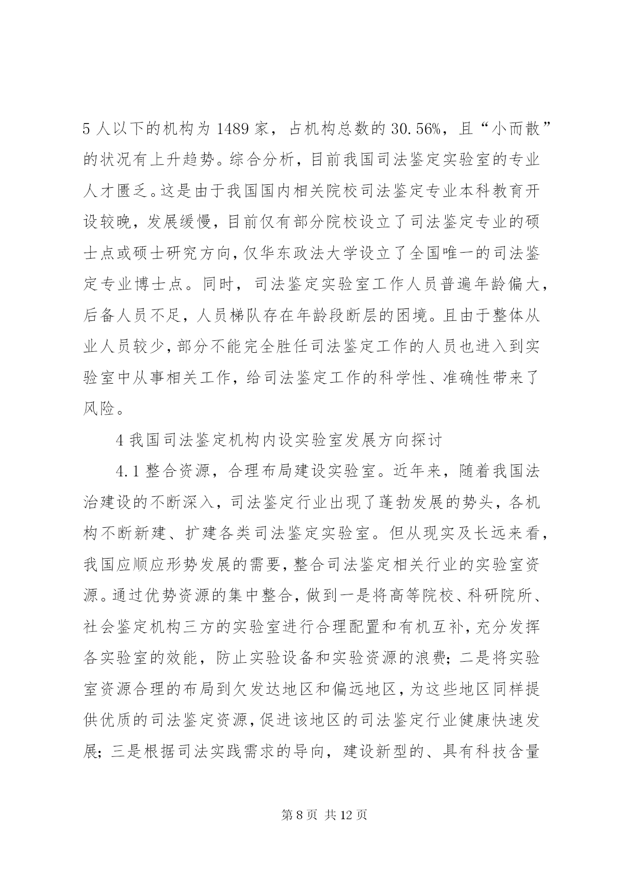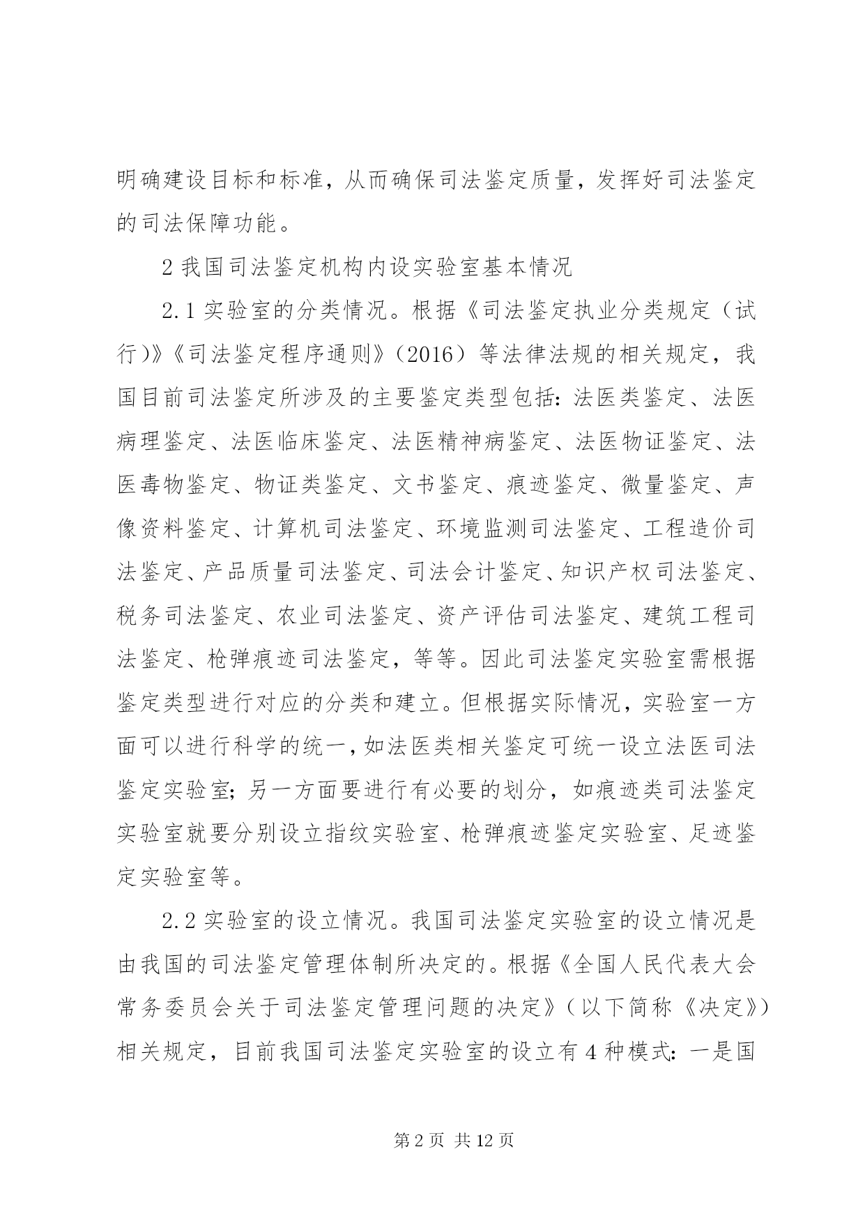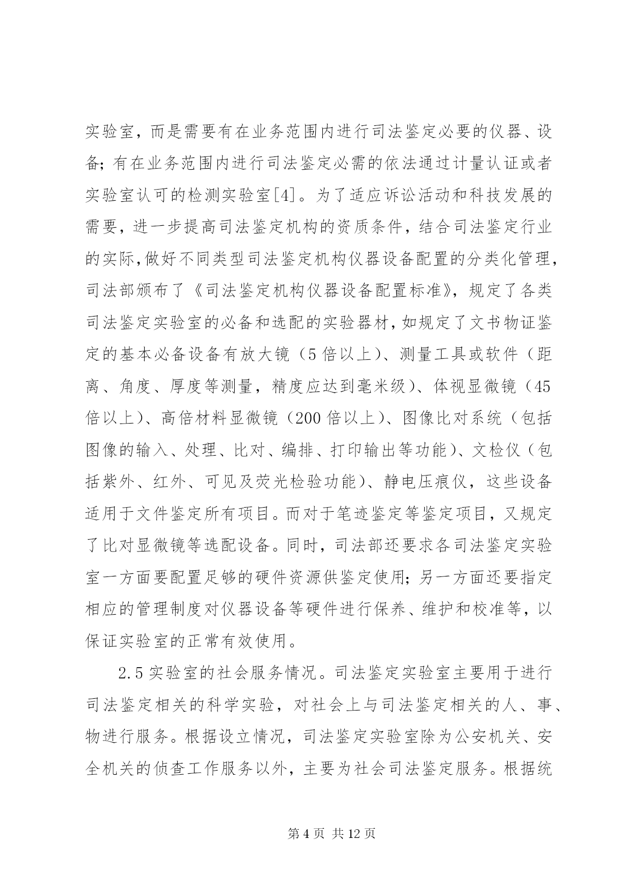 第PAGE\*Arabic\*MERGEFORMAT12页共NUMPAGES\*MERGEFORMAT12页司法鉴定机构实验室探讨[摘要]司法鉴定机构内设实验室是进行司法鉴定活动的专门实验室。随着我国司法鉴定事业的不断前进,各实验室也迎来了飞速发展的时期,成为我国司法鉴定系统不可或缺的重要组成部分。但是在分析其现状的基础上,发现实验室在整体布局、资源投入、管理体制、科研定位、人才梯队等方面存在困难,必须通过整合资源、推进认可、多方合作、培育人才等多方面举措,才能促进其快速健康发展,才能使其切实履行好司法保障功能,推动我国司法鉴定事业更好更快的发展。[关键词]司法鉴定;实验室管理;建设与发展1引言司法鉴定实验室是司法鉴定人员运用科学技术或者专门知识,针对争议解决中涉及的专门性问题进行鉴别和判断的实验场所,是司法鉴定意见主要的产生基地[1]。目前在我国司法鉴定实验室多建立在侦查机关、科研院所与社会司法鉴定机构之中,它不仅是司法机关和司法鉴定机构必不可少的组成部分,同时也是开展司法鉴定基础研究和应用研究、聚集和培育司法鉴定人才、开展学术交流的重要基地。随着社会主义法治建设的不断完善,人民群众对鉴定意见等证据的要求越来越严格,对司法鉴定活动的合法性、公正性、准确性的要求也越来越高,因此司法鉴定实验室的建设与发展也必须跟上法治建设的进程,做好软硬件建设,明确建设目标和标准,从而确保司法鉴定质量,发挥好司法鉴定的司法保障功能。2我国司法鉴定机构内设实验室基本情况2.1实验室的分类情况。根据《司法鉴定执业分类规定(试行)》《司法鉴定程序通则》(2016)等法律法规的相关规定,我国目前司法鉴定所涉及的主要鉴定类型包括:法医类鉴定、法医病理鉴定、法医临床鉴定、法医精神病鉴定、法医物证鉴定、法医毒物鉴定、物证类鉴定、文书鉴定、痕迹鉴定、微量鉴定、声像资料鉴定、计算机司法鉴定、环境监测司法鉴定、工程造价司法鉴定、产品质量司法鉴定、司法会计鉴定、知识产权司法鉴定、税务司法鉴定、农业司法鉴定、资产评估司法鉴定、建筑工程司法鉴定、枪弹痕迹司法鉴定,等等。因此司法鉴定实验室需根据鉴定类型进行对应的分类和建立。但根据实际情况,实验室一方面可以进行科学的统一,如法医类相关鉴定可统一设立法医司法鉴定实验室;另一方面要进行有必要的划分,如痕迹类司法鉴定实验室就要分别设立指纹实验室、枪弹痕迹鉴定实验室、足迹鉴定实验室等。2.2实验室的设立情况。我国司法鉴定实验室的设立情况是由我国的司法鉴定管理体制所决定的。根据《全国人民代表大会常务委员会关于司法鉴定管理问题的决定》(以下简称《决定》)相关规定,目前我国司法鉴定实验室的设立有4种模式:一是国家专门投资建立的以司法鉴定为主业、具有独立法人地位的司法鉴定机构内设立;二是依托国有事业单位设立的司法鉴定机构内设立;三是依托新型社会主体设立的司法鉴定机构内设立;四是侦查机关内部设立的承担特殊鉴定任务的职权鉴定机构内设立[2]。截至2016年11月30日,全国经司法行政机关审核登记的司法鉴定机构共有4872家,这也就意味着目前我国拥有数以千计的为社会司法鉴定服务的司法鉴定实验室。2.3实验室人员情况。经司法行政机关审核登记的司法鉴定人是在司法鉴定实验室开展司法鉴定活动的主体,司法实验室的实验活动顺利开展离不开司法鉴定人的工作。考虑到司法鉴定活动的特殊性,司法鉴定人除了要具有相关的专业知识和职业水平,还必须具备技术职称任职资格条件。根据统计,截至2016年,全国经司法行政机关审核登记的司法鉴定人共计54198人,绝大多数年龄在31~60岁。其中全国司法鉴定人中具有博士学历的2336人,硕士5768人,本科33858人,大学专科及以下12711人。具有正高职称的12380人,副高职称的16367人,中级职称的19650人。其中,具有副高以上职称的占总人数的53.04%[3]。除此之外,司法鉴定实验室人员还有司法鉴定技术辅助人、质量管理人员等。2.4我国司法鉴定实验室的基础条件。司法鉴定作为法学与自然科学相互交叉形成的交叉学科,其实验室并不是“空置”的实验室,而是需要有在业务范围内进行司法鉴定必要的仪器、设备;有在业务范围内进行司法鉴定必需的依法通过计量认证或者实验室认可的检测实验室[4]。为了适应诉讼活动和科技发展的需要,进一步提高司法鉴定机构的资质条件,结合司法鉴定行业的实际,做好不同类型司法鉴定机构仪器设备配置的分类化管理,司法部颁布了《司法鉴定机构仪器设备配置标准》,规定了各类司法鉴定实验室的必备和选配的实验器材,如规定了文书物证鉴定的基本必备设备有放大镜(5倍以上)、测量工具或软件(距离、角度、厚度等测量,精度应达到毫米级)、体视显微镜(45倍以上)、高倍材料显微镜(200倍以上)、图像比对系统(包