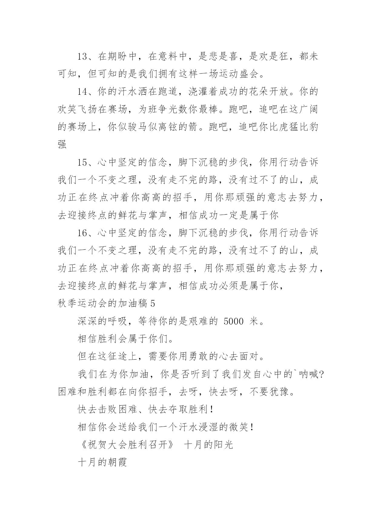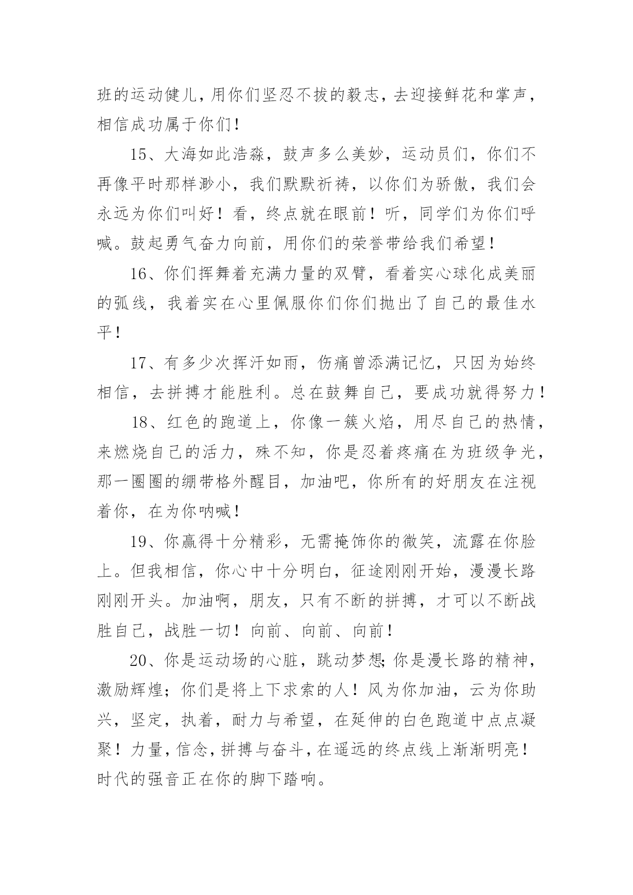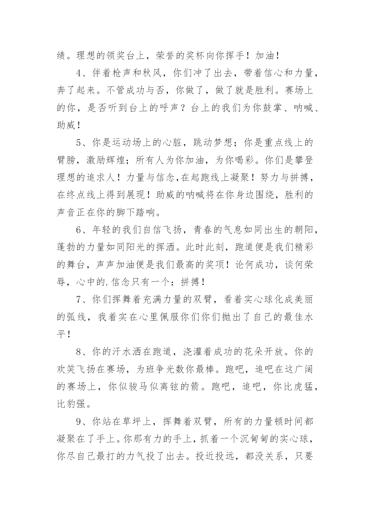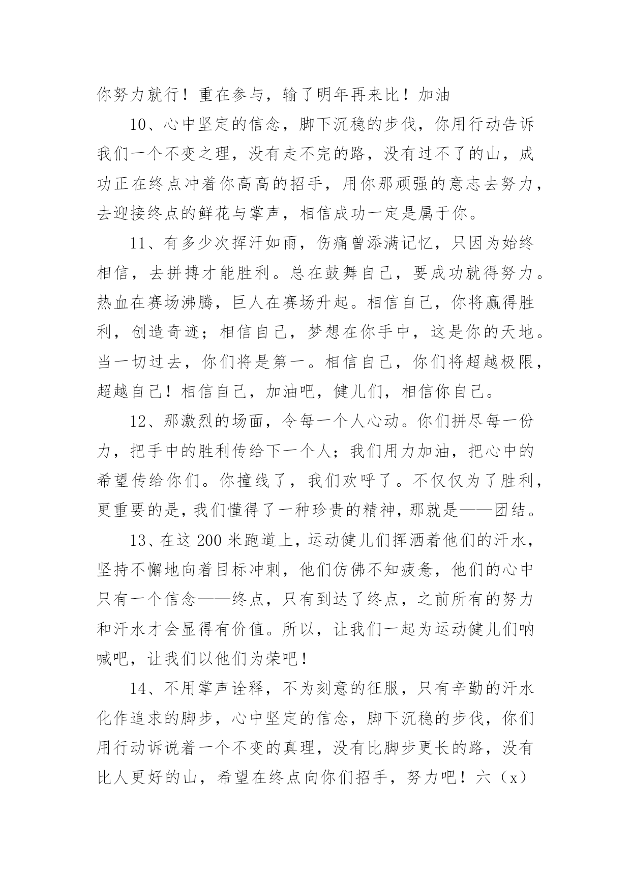 秋季运动会的加油稿秋季运动会的加油稿在日常生活和工作中,能够利用到加油稿的场合越来越多,借助加油稿可以给对方传达鼓励。那要怎么写好加油稿呢?以下是小编精心整理的秋季运动会的加油稿,供大家参考借鉴,希望可以帮助到有需要的朋友。秋季运动会的加油稿1秋风飒爽,含载了多少人的期盼与等待。为着能与胜利经历一次美丽的邂逅;为着能与冠军经历一回动人的相遇;为着,心中的梦想那不熄的拼搏之焰:燃烧斗志,铸就辉煌!此刻的跳跃或许只是生命短暂的.一瞬,却如昙花一般绚烂的开放,记忆走进青春,选取跳跃,选取呐喊与欢呼交织的舞台,户外的律动生生不息。选取跳跃,选取汗水与泪水浇灌的沃野,生命的绿草丰茂浓密。跳得更远吧,跨过崭新的里程碑我在那里等你,用我嫩绿的诗句,装点你鲜艳的胜利。枪声响了,你们冲向前,不为别的,就为为班级一马当先,没有昔日的汗水,怎见今天的胜利?相信自己,鼓励自己,超越自己。为太阳的光辉在添上永恒的一笔!要的就是坚持到底,不是华丽。冲吧!向着那未来,进行到底。环形的跑道一圈又一圈的坚持,毅力与精神活跃在会场上,湿透的衣衫,满头的大汗,无限追求奋力追赶,我们为你欢呼跳跃,我们为你骄傲!自信就是希望,是种子就该有绿色的希望,是种子就该有金色的梦想,不要躺在封闭的暖房,怕什么秋日薄薄的风霜,既然已走上了运动场。努力、努力、再努力!加油、加油、再加油!你一定可以像苍龙一样,光耀九州,也可以像孤鹰一样翱翔世界,相信自己,。超越自我,胜利永远属于努力的拼搏的你!秋季运动会的加油稿21、同学,你站在草坪上,挥舞着双臂,所有的力量顿时间都凝聚在了手上。你那有力的手上,抓着一个沉甸甸的实心球,你尽自己最打的力气投了出去。投近投远,都没关系,只要你努力就行!重在参与,输了明年再来比!加油!2、同学,你们挥舞着充满力量的双臂看着实心球化成美丽的弧线我着实在心里佩服你们你们抛出了自己的最佳水平!你是运动场的心脏,跳动梦想;你是漫长路的精神,激励辉煌;你们是将上下求索的人!风为你加油,云为你助兴,坚定,执着,耐力与希望,在延伸的白色跑道中点点凝聚!力量,信念,拼搏与奋斗,在遥远的终点线上渐渐明亮!时代的强音正在你的脚下踏响。3、操场上拼搏努力的是你们,掠过矫健的身影也是你们,超越对手是你们的目标,但是对手只有一个,那就是你们自己!加油啊!六(x)班的运动健儿们,祝你们取得佳绩。理想的领奖台上,荣誉的奖杯向你挥手!加油!4、伴着枪声和秋风,你们冲了出去,带着信心和力量,奔了起来。不管成功与否,你做了,做了就是胜利。赛场上的你,是否听到台上的呼声?台上的我们为你鼓掌、呐喊、助威!5、你是运动场上的心脏,跳动梦想;你是重点线上的臂膀,激励辉煌;所有人为你加油,为你喝彩。你们是攀登理想的追求人!力量与信念,在起跑线上凝聚!努力与拼搏,在终点线上得到展现!助威的呐喊将在你身边围绕,胜利的声音正在你的脚下踏响。6、年轻的我们自信飞扬,青春的气息如同出生的朝阳,蓬勃的力量如同阳光的挥洒。此时此刻,跑道便是我们精彩的舞台,声声加油便是我们最高的奖项!论何成功,谈何荣辱,心中的.信念只有一个:拼搏!7、你们挥舞着充满力量的双臂,看着实心球化成美丽的弧线,我着实在心里佩服你们你们抛出了自己的最佳水平!8、你的汗水洒在跑道,浇灌着成功的花朵开放。你的欢笑飞扬在赛场,为班争光数你最棒。跑吧,追吧在这广阔的赛场上,你似骏马似离铉的箭。跑吧,追吧,你比虎猛,比豹强。9、你站在草坪上,挥舞着双臂,所有的力量顿时间都凝聚在了手上。你那有力的手上,抓着一个沉甸甸的实心球,你尽自己最打的力气投了出去。投近投远,都没关系,只要你努力就行!重在参与,输了明年再来比!加油10、心中坚定的信念,脚下沉稳的步伐,你用行动告诉我们一个不变之理,没有走不完的路,没有过不了的山,成功正在终点冲着你高高的招手,用你那顽强的意志去努力,去迎接终点的鲜花与掌声,相信成功一定是属于你。11、有多少次挥汗如雨,伤痛曾添满记忆,只因为始终相信,去拼搏才能胜利。总在鼓舞自己,要成功就得努力。热血在赛场沸腾,巨人在赛场升起。相信自己,你将赢得胜利,创造奇迹;相信自己,梦想在你手中,这是你的天地。当一切过去,你们将是第一。相信自己,你们将超越极限,超越自己!相信自己,加油吧,健儿们,相信你自己。12、那激烈的场面,令每一个人心动。你们拼尽每一份力,把手中的胜利传给下一个人;我们用力加油,把心中的希望传给你们。你撞线了,我们欢呼了。不仅仅为了胜利,更重要的是,我们懂得了一种珍贵的精神,那就是——团结。13、在这200米跑道上,运动健儿们挥洒着他们的汗水,坚持不懈地向着目标冲刺,他们仿佛不知疲惫,他们的心中只有一个信念——终点,只有到达了终点,之前所有的努力和汗水才会显得有价值。所以,让我们一起为运动健儿们呐喊吧,让我们以他们为荣吧