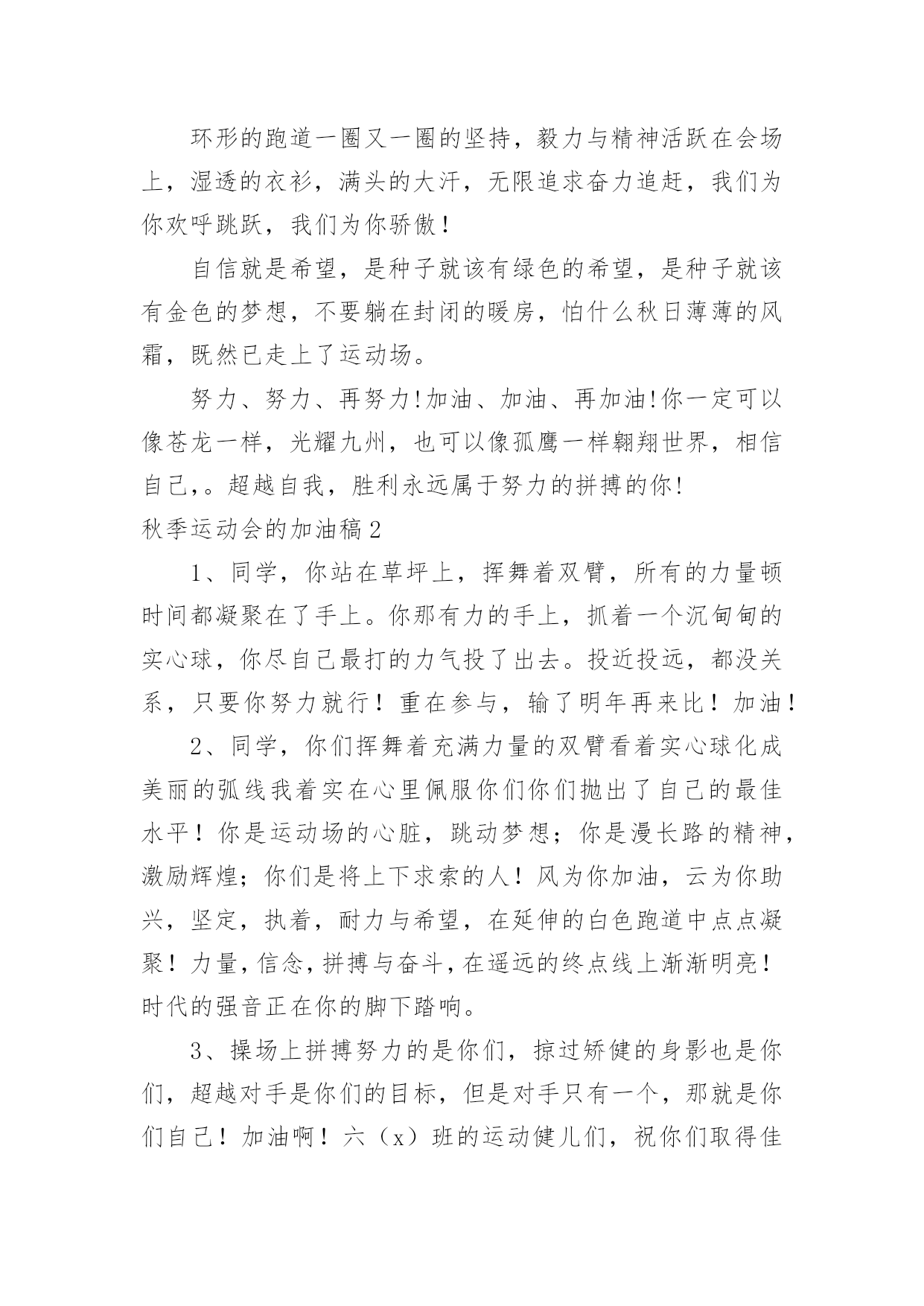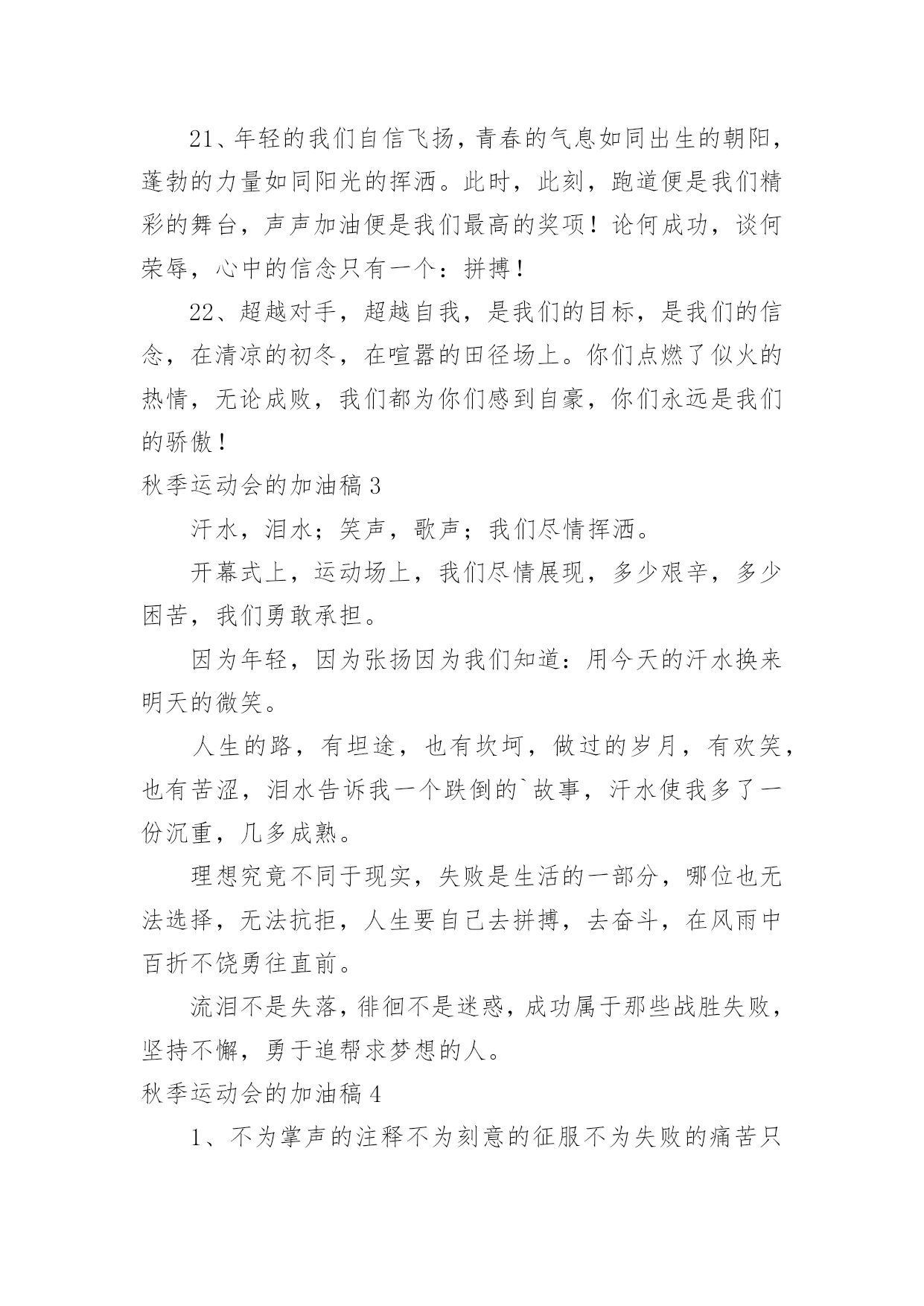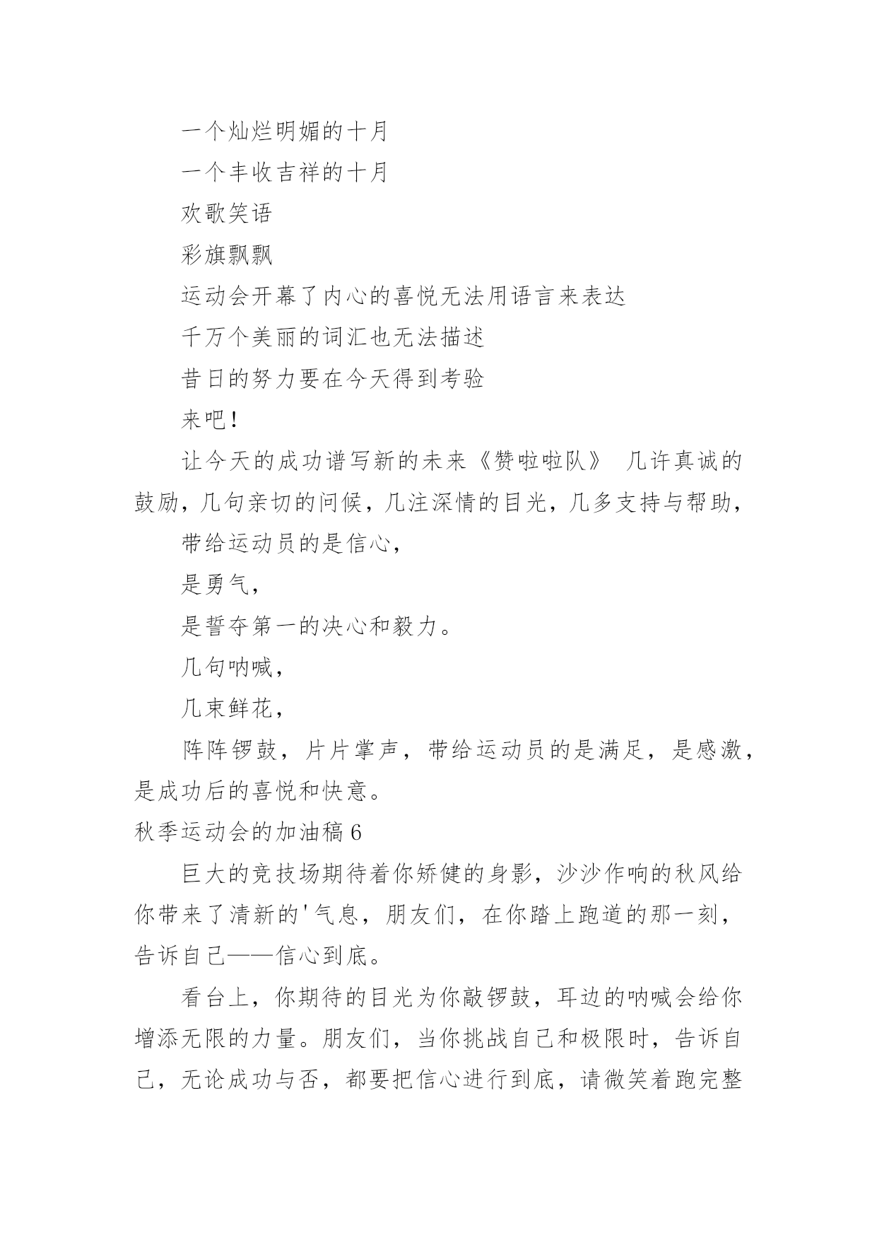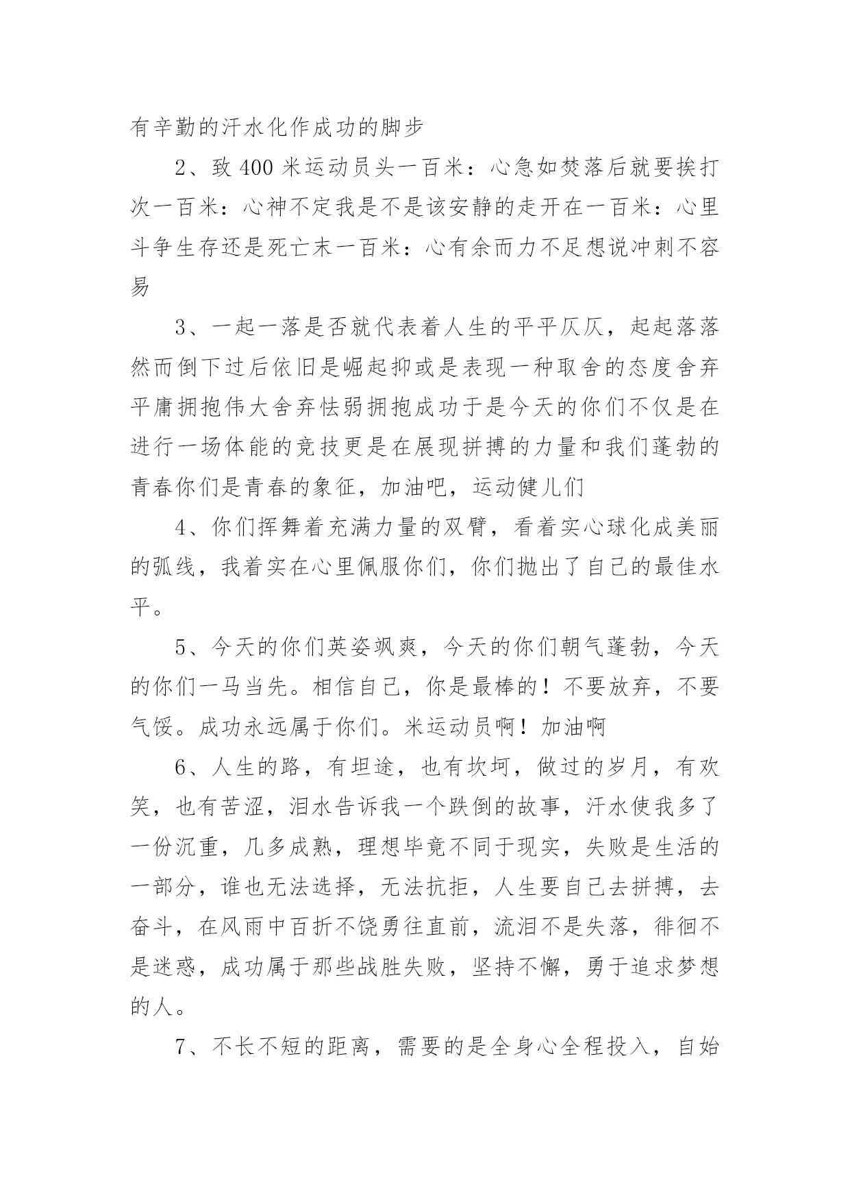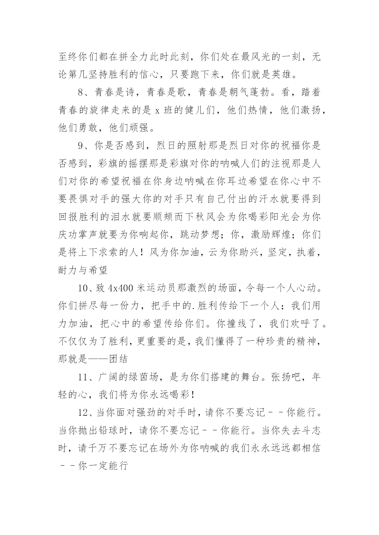 秋季运动会的加油稿秋季运动会的加油稿在日常生活和工作中,能够利用到加油稿的场合越来越多,借助加油稿可以给对方传达鼓励。那要怎么写好加油稿呢?以下是小编精心整理的秋季运动会的加油稿,供大家参考借鉴,希望可以帮助到有需要的朋友。秋季运动会的加油稿1秋风飒爽,含载了多少人的期盼与等待。为着能与胜利经历一次美丽的邂逅;为着能与冠军经历一回动人的相遇;为着,心中的梦想那不熄的拼搏之焰:燃烧斗志,铸就辉煌!此刻的跳跃或许只是生命短暂的.一瞬,却如昙花一般绚烂的开放,记忆走进青春,选取跳跃,选取呐喊与欢呼交织的舞台,户外的律动生生不息。选取跳跃,选取汗水与泪水浇灌的沃野,生命的绿草丰茂浓密。跳得更远吧,跨过崭新的里程碑我在那里等你,用我嫩绿的诗句,装点你鲜艳的胜利。枪声响了,你们冲向前,不为别的,就为为班级一马当先,没有昔日的汗水,怎见今天的胜利?相信自己,鼓励自己,超越自己。为太阳的光辉在添上永恒的一笔!要的就是坚持到底,不是华丽。冲吧!向着那未来,进行到底。环形的跑道一圈又一圈的坚持,毅力与精神活跃在会场上,湿透的衣衫,满头的大汗,无限追求奋力追赶,我们为你欢呼跳跃,我们为你骄傲!自信就是希望,是种子就该有绿色的希望,是种子就该有金色的梦想,不要躺在封闭的暖房,怕什么秋日薄薄的风霜,既然已走上了运动场。努力、努力、再努力!加油、加油、再加油!你一定可以像苍龙一样,光耀九州,也可以像孤鹰一样翱翔世界,相信自己,。超越自我,胜利永远属于努力的拼搏的你!秋季运动会的加油稿21、同学,你站在草坪上,挥舞着双臂,所有的力量顿时间都凝聚在了手上。你那有力的手上,抓着一个沉甸甸的实心球,你尽自己最打的力气投了出去。投近投远,都没关系,只要你努力就行!重在参与,输了明年再来比!加油!2、同学,你们挥舞着充满力量的双臂看着实心球化成美丽的弧线我着实在心里佩服你们你们抛出了自己的最佳水平!你是运动场的心脏,跳动梦想;你是漫长路的精神,激励辉煌;你们是将上下求索的人!风为你加油,云为你助兴,坚定,执着,耐力与希望,在延伸的白色跑道中点点凝聚!力量,信念,拼搏与奋斗,在遥远的终点线上渐渐明亮!时代的强音正在你的脚下踏响。3、操场上拼搏努力的是你们,掠过矫健的身影也是你们,超越对手是你们的目标,但是对手只有一个,那就是你们自己!加油啊!六(x)班的运动健儿们,祝你们取得佳绩。理想的领奖台上,荣誉的奖杯向你挥手!加油!4、伴着枪声和秋风,你们冲了出去,带着信心和力量,奔了起来。不管成功与否,你做了,做了就是胜利。赛场上的你,是否听到台上的呼声?台上的我们为你鼓掌、呐喊、助威!5、你是运动场上的心脏,跳动梦想;你是重点线上的臂膀,激励辉煌;所有人为你加油,为你喝彩。你们是攀登理想的追求人!力量与信念,在起跑线上凝聚!努力与拼搏,在终点线上得到展现!助威的呐喊将在你身边围绕,胜利的声音正在你的脚下踏响。6、年轻的我们自信飞扬,青春的气息如同出生的朝阳,蓬勃的力量如同阳光的挥洒。此时此刻,跑道便是我们精彩的舞台,声声加油便是我们最高的奖项!论何成功,谈何荣辱,心中的.信念只有一个:拼搏!7、你们挥舞着充满力量的双臂,看着实心球化成美丽的弧线,我着实在心里佩服你们你们抛出了自己的最佳水平!8、你的汗水洒在跑道,浇灌着成功的花朵开放。你的欢笑飞扬在赛场,为班争光数你最棒。跑吧,追吧在这广阔的赛场上,你似骏马似离铉的箭。跑吧,追吧,你比虎猛,比豹强。9、你站在草坪上,挥舞着双臂,所有的力量顿时间都凝聚在了手上。你那有力的手上,抓着一个沉甸甸的实心球,你尽自己最打的力气投了出去。投近投远,都没关系,只要你努力就行!重在参与,输了明年再来比!加油10、心中坚定的信念,脚下沉稳的步伐,你用行动告诉我们一个不变之理,没有走不完的路,没有过不了的山,成功正在终点冲着你高高的招手,用你那顽强的意志去努力,去迎接终点的鲜花与掌声,相信成功一定是属于你。11、有多少次挥汗如雨,伤痛曾添满记忆,只因为始终相信,去拼搏才能胜利。总在鼓舞自己,要成功就得努力。热血在赛场沸腾,巨人在赛场升起。相信自己,你将赢得胜利,创造奇迹;相信自己,梦想在你手中,这是你的天地。当一切过去,你们将是第一。相信自己,你们将超越极限,超越自己!相信自己,加油吧,健儿们,相信你自己。12、那激烈的场面,令每一个人心动。你们拼尽每一份力,把手中的胜利传给下一个人;我们用力加油,把心中的希望传给你们。你撞线了,我们欢呼了。不仅仅为了胜利,更重要的是,我们懂得了一种珍贵的精神,那就是——团结。13、在这200米跑道上,运动健儿们挥洒着他们的汗水,坚持不懈地向着目标冲刺,他们仿佛不知疲惫,他们的心中只有一个信念——终点,只有到达了终点,之前所有的努力和汗水才会显得有价值。所以,让我们一起为运动健儿们呐喊吧,让我们以他们为荣吧