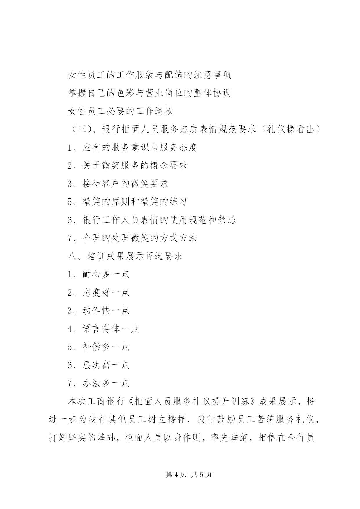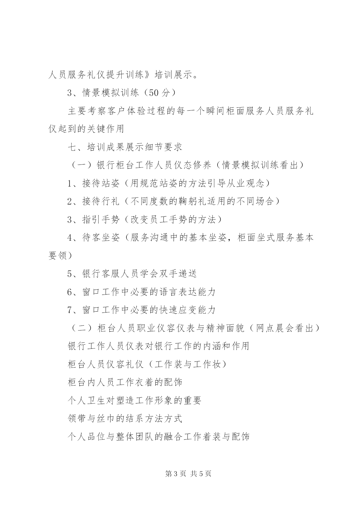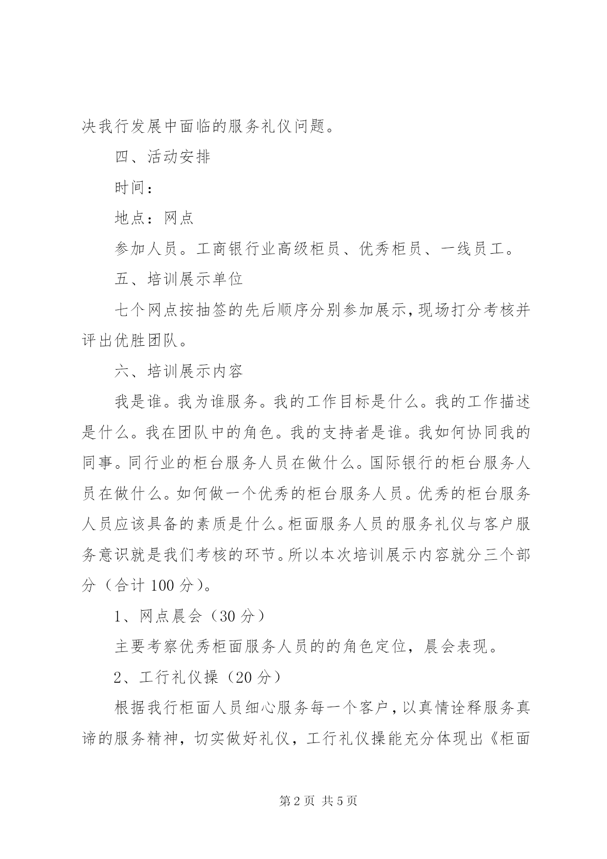 第PAGE\*Arabic\*MERGEFORMAT5页共NUMPAGES\*MERGEFORMAT5页工商银行成果展示工作方案今年,全新的金融市场要求银行柜面人员展现出全新银行服务形象,经我行上级领导研究决定,结合我行七个网点的柜面人员工作,对我行柜面人员开展《柜面人员服务礼仪提升训练》培训成果展示,制订果展示工作方案如下:一、活动背景为了使工商银行柜面人员得到有效、专业到位的岗位技能指导,从而提升柜员的服务礼仪,进而间接改善其工作心态和操作方法,大力提升柜面人员的服务形象,为我行创造最大的效益。去年我行组织柜面人员进行了《柜面人员服务礼仪提升训练》短期培训。封闭互动式培训,引入头脑风暴、角色扮演、客户分析等互动内容,真正有效的提升员工的职业素养与礼仪规范,增强员工的团队沟通协作和客户服务能力。二、活动目的以落实科学发展观、构建社会主义和谐社会、全面建设小康社会为导向,充分认识工商银行柜面人员服务礼仪重性,抓住“十二五规划”这一有利时机,深入开展工商银行各个网点柜面人员服务礼仪提升,使客户切身感受到我行柜面人员服务的真诚关怀。三、活动方式以我行各个网点柜面人员服务礼仪提升培训展示为载体,深入考核排查,评选出优秀柜面人员。从而完善服务礼仪,有效解决我行发展中面临的服务礼仪问题。四、活动安排时间:地点:网点参加人员。工商银行业高级柜员、优秀柜员、一线员工。五、培训展示单位七个网点按抽签的先后顺序分别参加展示,现场打分考核并评出优胜团队。六、培训展示内容我是谁。我为谁服务。我的工作目标是什么。我的工作描述是什么。我在团队中的角色。我的支持者是谁。我如何协同我的同事。同行业的柜台服务人员在做什么。国际银行的柜台服务人员在做什么。如何做一个优秀的柜台服务人员。优秀的柜台服务人员应该具备的素质是什么。柜面服务人员的服务礼仪与客户服务意识就是我们考核的环节。所以本次培训展示内容就分三个部分(合计100分)。1、网点晨会(30分)主要考察优秀柜面服务人员的的角色定位,晨会表现。2、工行礼仪操(20分)根据我行柜面人员细心服务每一个客户,以真情诠释服务真谛的服务精神,切实做好礼仪,工行礼仪操能充分体现出《柜面人员服务礼仪提升训练》培训展示。3、情景模拟训练(50分)主要考察客户体验过程的每一个瞬间柜面服务人员服务礼仪起到的关键作用七、培训成果展示细节要求(一)银行柜台工作人员仪态修养(情景模拟训练看出)1、接待站姿(用规范站姿的方法引导从业观念)2、接待行礼(不同度数的鞠躬礼适用的不同场合)3、指引手势(改变员工手势的方法)4、待客坐姿(服务沟通中的基本坐姿,柜面坐式服务基本要领)5、银行客服人员学会双手递送6、窗口工作中必要的语言表达能力7、窗口工作中必要的快速应变能力(二)柜台人员职业仪容仪表与精神面貌(网点晨会看出)银行工作人员仪表对银行工作的内涵和作用柜台人员仪容礼仪(工作装与工作妆)柜台内人员工作衣着的配饰个人卫生对塑造工作形象的重要领带与丝巾的结系方法方式个人品位与整体团队的融合工作着装与配饰女性员工的工作服装与配饰的注意事项掌握自己的色彩与营业岗位的整体协调女性员工必要的工作淡妆(三)、银行柜面人员服务态度表情规范要求(礼仪操看出)1、应有的服务意识与服务态度2、关于微笑服务的概念要求3、接待客户的微笑要求5、微笑的原则和微笑的练习6、银行工作人员表情的使用规范和禁忌7、合理的处理微笑的方式方法八、培训成果展示评选要求1、耐心多一点2、态度好一点3、动作快一点4、语言得体一点5、补偿多一点6、层次高一点7、办法多一点本次工商银行《柜面人员服务礼仪提升训练》成果展示,将进一步为我行其他员工树立榜样,我行鼓励员工苦练服务礼仪,打好坚实的基础,柜面人员以身作则,率先垂范,相信在全行员工的共同努力下,我行服务水平登上全新台阶。