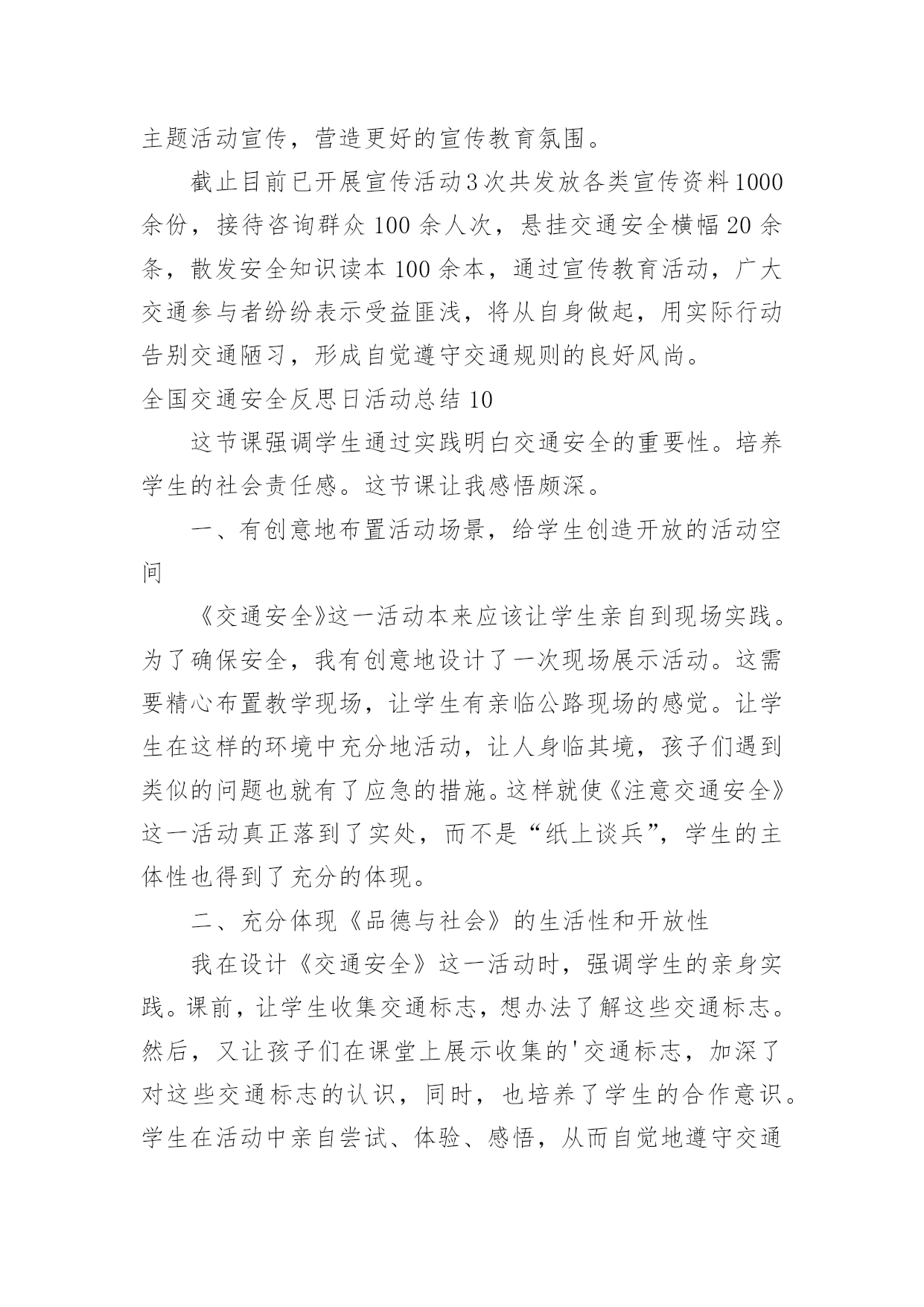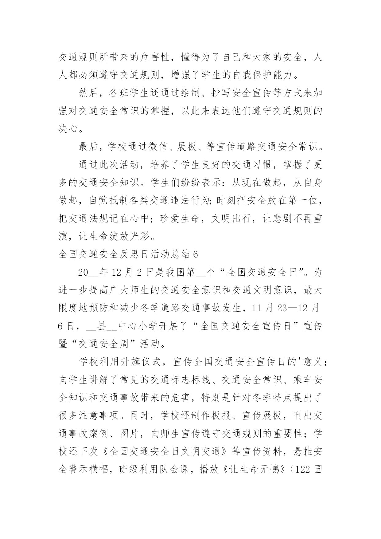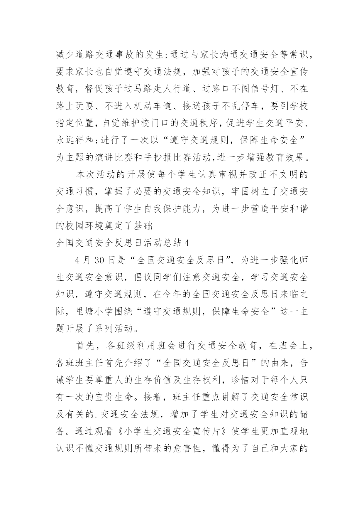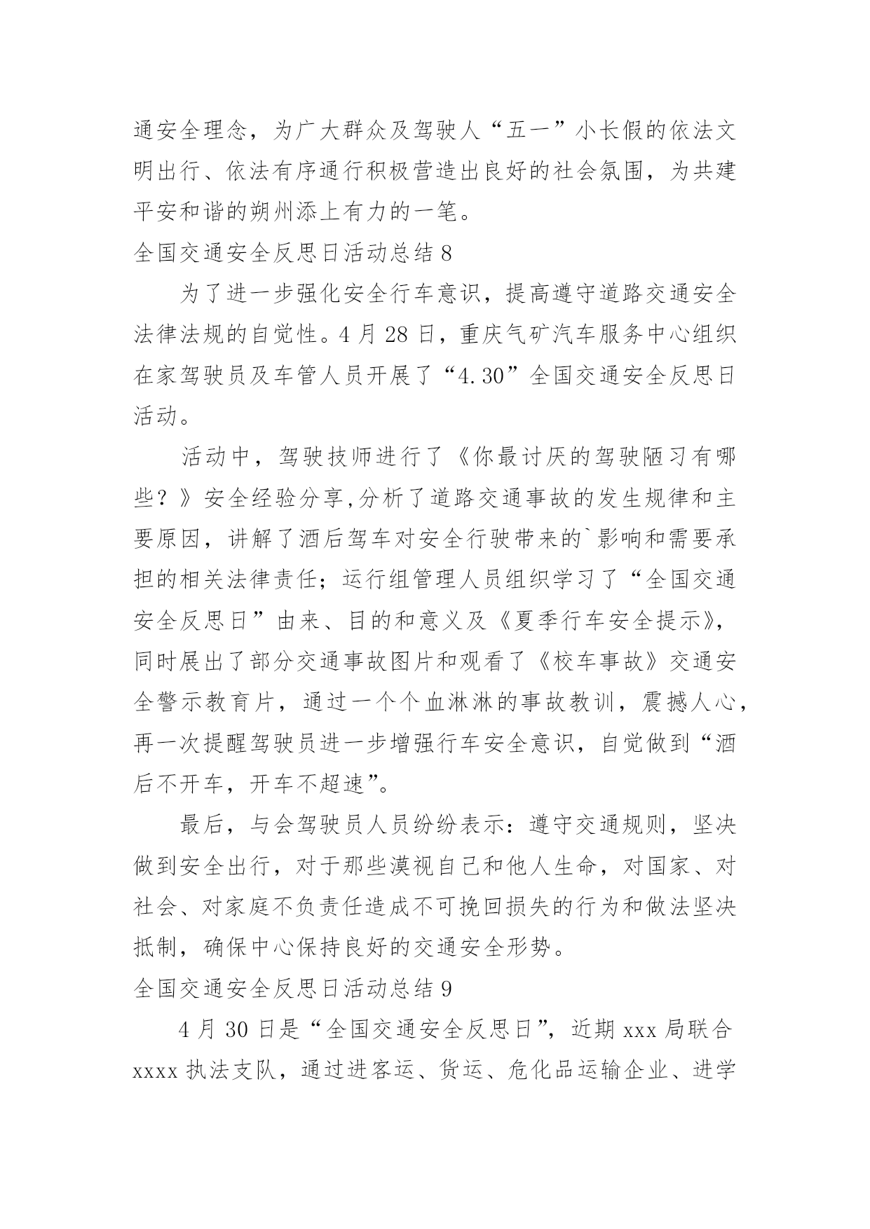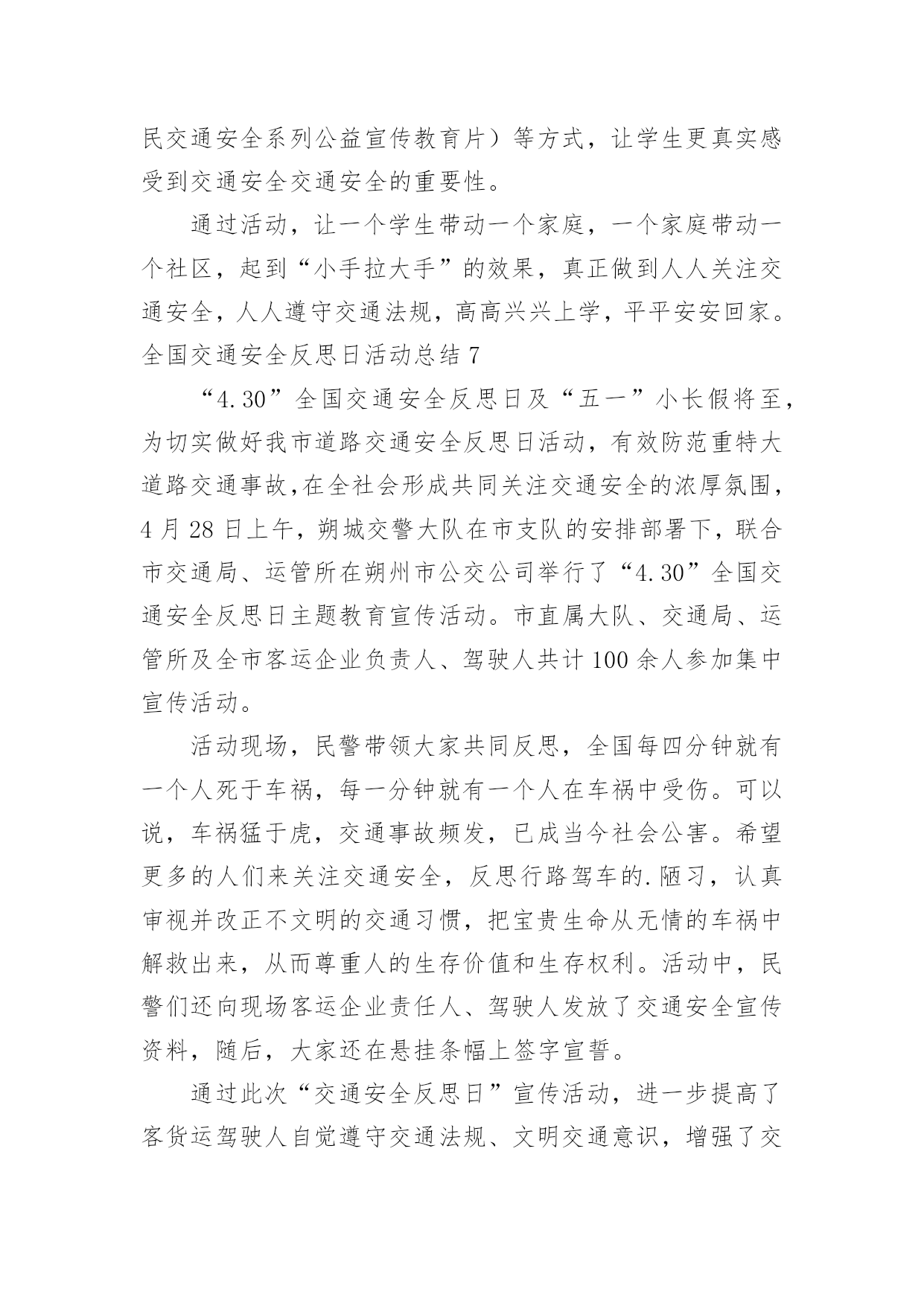 全国交通安全反思日活动总结全国交通安全反思日活动总结12篇总结在一个时期、一个年度、一个阶段对学习和工作生活等情况加以回顾和分析的一种书面材料,它可以促使我们思考,因此我们需要回头归纳,写一份总结了。总结怎么写才不会流于形式呢?下面是小编为大家整理的全国交通安全反思日活动总结,希望能够帮助到大家。全国交通安全反思日活动总结14月30日是全国交通安全反思日。当日,由张家口市文明办主办,桥西区文明办、市公益事业促进会、张家口学院、张家口职业技术学院、汇青春青年志愿服务协会联合协办的“迎冬奥讲文明树新风”系列活动之“交通安全牢记心,文明城市文明人”宣传活动在市文化广场举行。活动现场,150名志愿者现场向过往群众就交通事故案例进行展示和讲解,对交通事故造成的'危害进行反思,引导市民参加“交通安全、人人有责”签名活动。同时,志愿者向市民发送“五·一平安出行”交通安全宣传手册,在附近路口的斑马线做文明劝导,向外卖小哥赠送交通安全宣传钥匙扣,在共享单车存放处摆放车辆发放宣传页。另外,志愿者在市公益事业促进会微信公众号、各活动联络群内发布活动相关链接消息,倡导更多民众通过网络积极参与交通安全宣传。全国交通安全反思日活动总结2近日,我市中小学开展的“全国交通安全反思日”主题教育活动拉开序幕,教体局专门下发通知,要求全市各中小学、幼儿园利用4月30日“全国交通安全反思日”,普遍开展一次以“遵守交通规则,保障生命安全”为主题的交通安全宣传教育活动。本次“全国交通安全反思日”主题教育活动,旨在进一步加强我市学校交通法规宣传工作,增强师生文明交通意识,提高中小学生自我防范能力,避免发生道路交通安全事故。其主要形式有:一是开展一次道路交通安全专题教育。各学校主动邀请公安交警、法制副校长、法制辅导员等人员,以“遵守交通规则,保障生命安全”为主题,通过学习交通法规,普及安全知识,观看交通事故典型案例等形式方法,教育引导师生自觉维护公共交通秩序,保障交通安全,提高文明交通素养。二是开展一次“全国交通安全反思日”主题宣传活动。利用国家《校车安全管理条例》正式在全国颁布实施的契机,紧扣“遵守交通规则,保障生命安全”教育主题,通过学校网络、校园广播、版面橱窗等宣传阵地,大力宣传国家校车安全条例内容及中小学生道路交通安全有关常识,进一步强化学生交通安全意识,严防发生师生道路交通安全事故。三是组织一次“小手拉大手”主题实践活动。突出“安全第一”原则,结合文明交通行动计划安排、“全国交通安全反思日”教育要求、“五一”师生假日活动实际,以“文明安全出行”为主题,以强化学生“安全乘车、安全骑车、安全走路”为重点,通过开展交通安全主题班(队)会活动,开展学习“小交警”交通指挥手势操、“小手拉大手”社会实践活动等形式,引导师生自觉做到“过马路走人行道,过路口不闯红灯,行人不进入机动车道,不乱停乱放车辆”,珍惜生命安全,积极推进全社会文明交通进程。通知要求各学校要统一思想,提高认识,加强组织领导,切实把开展“全国交通安全反思日”主题教育活动摆上重要议事日程,认真组织开展好“遵守交通规则,保障生命安全”学习实践系列活动,真正把预防学生交通事故工作落到实处。按照通知要求,各学校在“全国交通安全反思日”主题教育活动期间,科学制定活动计划,明确职责分工,通过电视、报刊等媒体平台,广泛宣传活动开展情况,加强“遵守交通规则,保障生命安全”的.宣传报道力度,在全社会大力营造“交通安全,人人有责”浓厚氛围。全国交通安全反思日活动总结3为了进一步构建“和谐校园”,培养学生的交通安全意识,提高自我防范能力,在“全国交通安全反思日”和五一假期来临之际,高青县寨子小学开展了“关爱生命、安全出行”为主题的教育活动。学校利用教室的多媒体让学生观看了各种安全教育宣传片,用真实的.交通事故案例教育全体学生要遵守交通规则,珍惜生命;通过班队会、黑板报、宣传栏等形式,积极倡导与教育学生遵守公共秩序,保障交通安全,切实预防和减少道路交通事故的发生;通过与家长沟通交通安全等常识,要求家长也自觉遵守交通法规,加强对孩子的交通安全宣传教育,督促孩子过马路走人行道、过路口不闯信号灯、不在路上玩耍、不进入机动车道、接送孩子不乱停车,要到学校指定位置,自觉维护校门口的交通秩序,促进学生交通平安、永远祥和;进行了一次以“遵守交通规则,保障生命安全”为主题的演讲比赛和手抄报比赛活动,进一步增强教育效果。本次活动的开展使每个学生认真审视并改正不文明的交通习惯,掌握了必要的交通安全知识,牢固树立了交通安全意识,提高了学生自我保护能力,为进一步营造平安和谐的校园环境奠定了基础全国交通安全反思日活动总结44月30日是“全国交通安全反思日”,为进一步强化师生交通安全意识,倡议同学们注意交通安全,学习交通安全知识,遵守交通规则,在今年的全国交