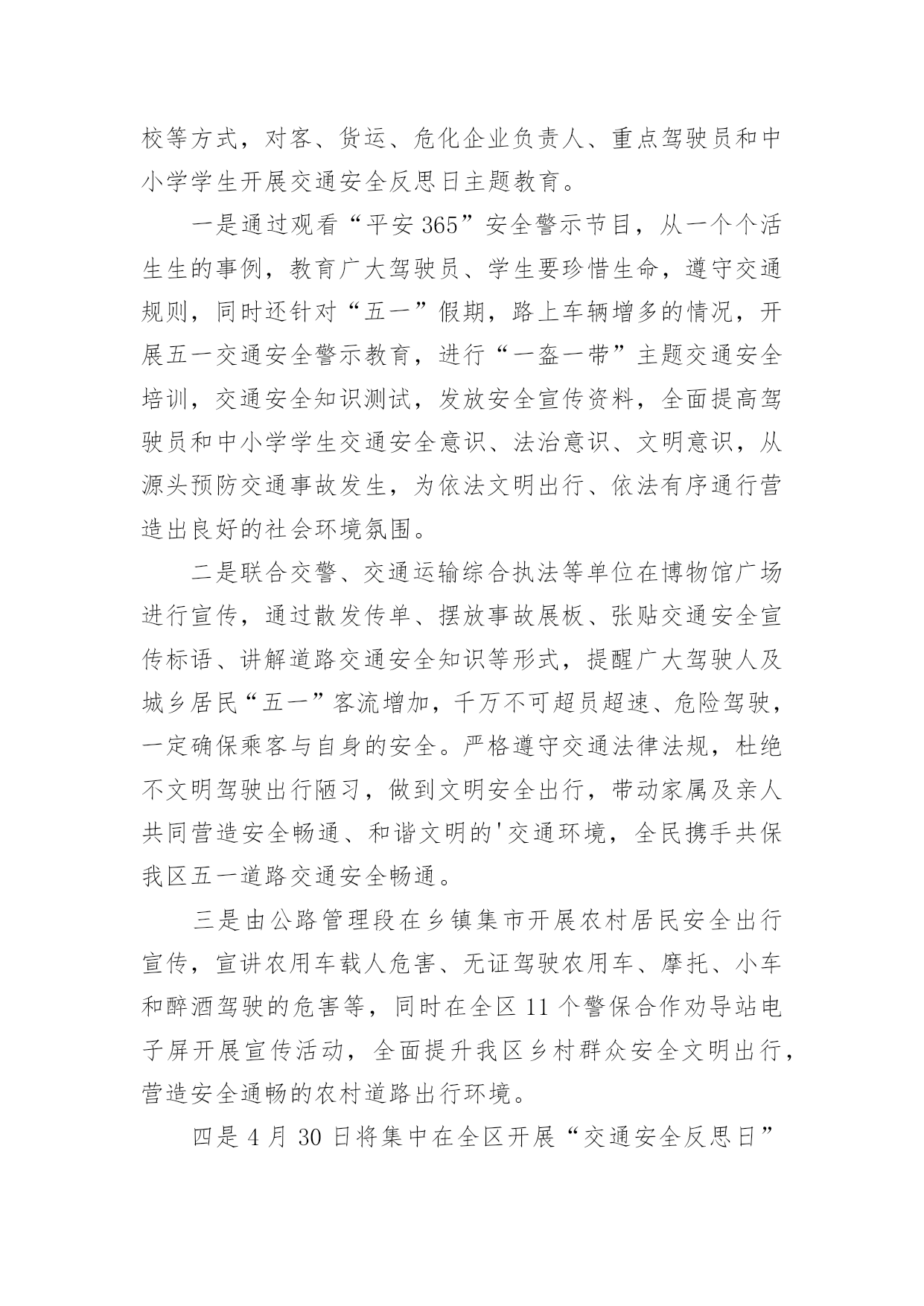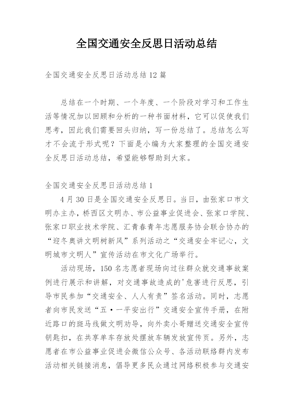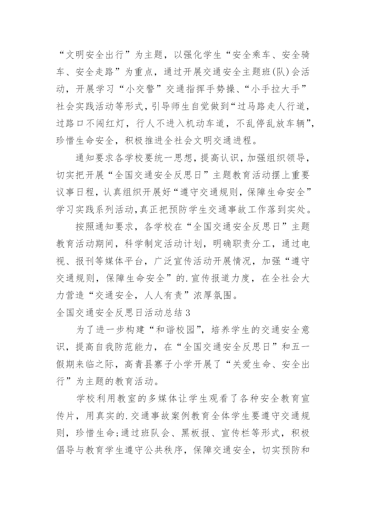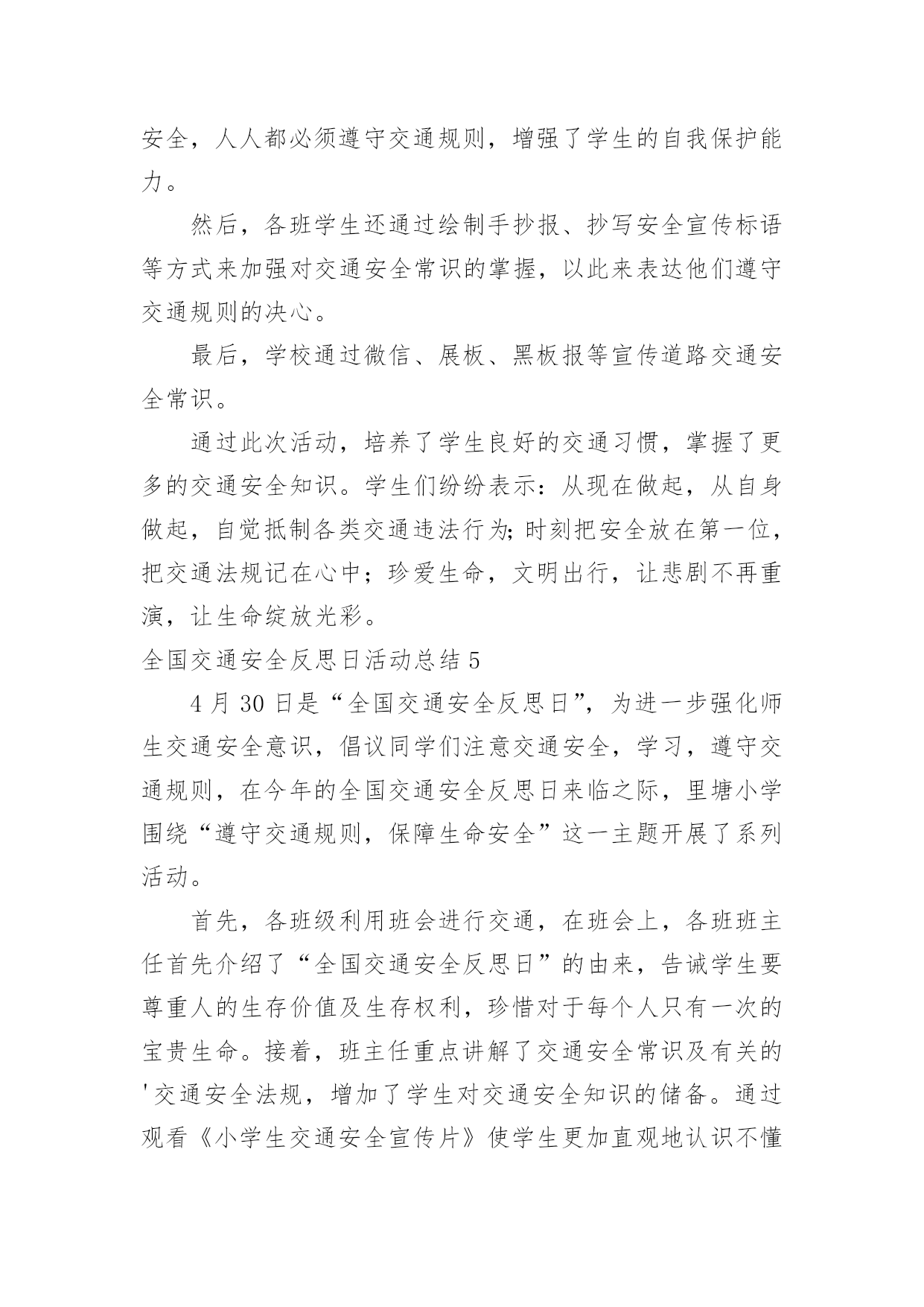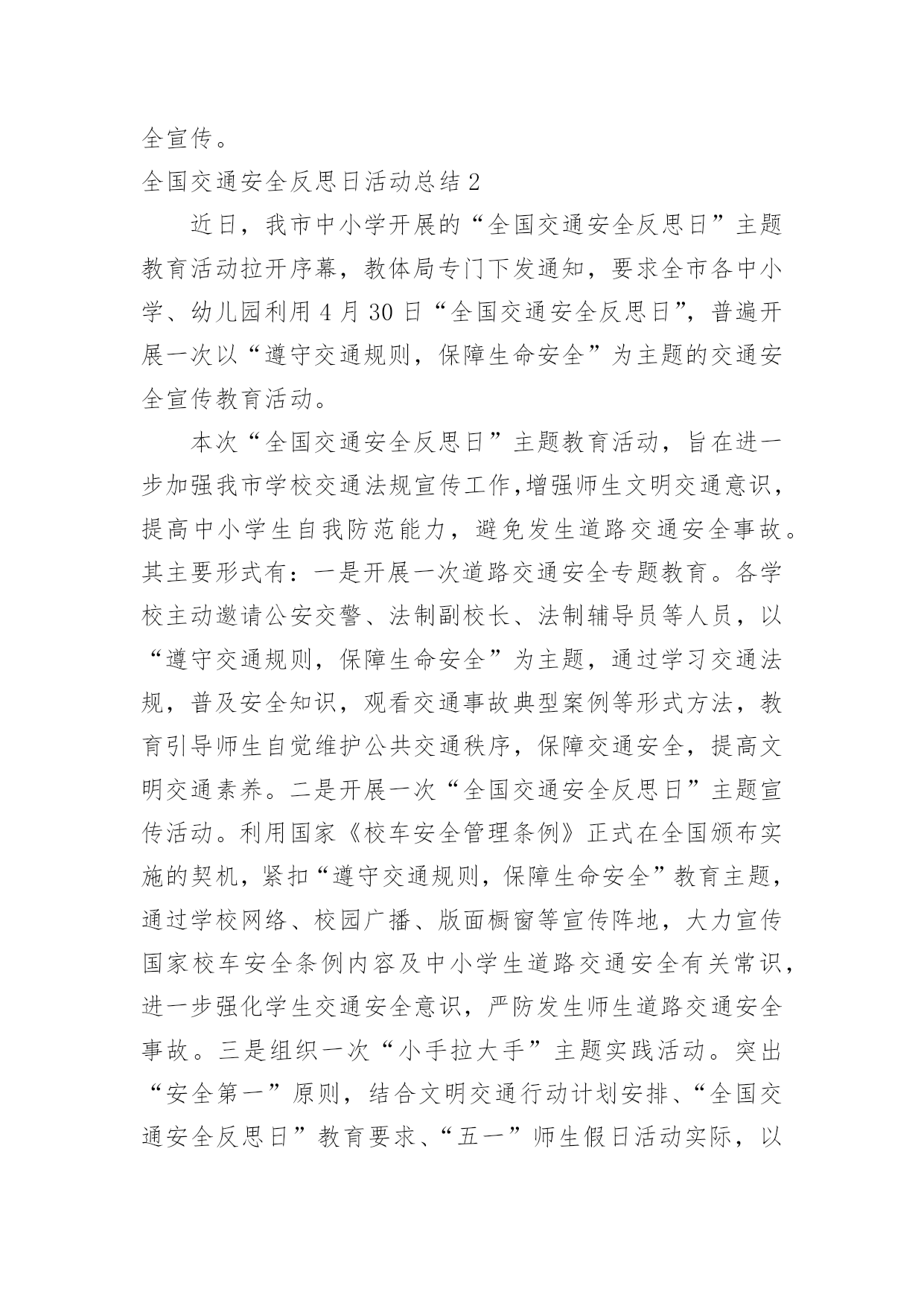 全国交通安全反思日活动总结全国交通安全反思日活动总结12篇总结在一个时期、一个年度、一个阶段对学习和工作生活等情况加以回顾和分析的一种书面材料,它可以促使我们思考,因此我们需要回头归纳,写一份总结了。总结怎么写才不会流于形式呢?下面是小编为大家整理的全国交通安全反思日活动总结,希望能够帮助到大家。全国交通安全反思日活动总结14月30日是全国交通安全反思日。当日,由张家口市文明办主办,桥西区文明办、市公益事业促进会、张家口学院、张家口职业技术学院、汇青春青年志愿服务协会联合协办的“迎冬奥讲文明树新风”系列活动之“交通安全牢记心,文明城市文明人”宣传活动在市文化广场举行。活动现场,150名志愿者现场向过往群众就交通事故案例进行展示和讲解,对交通事故造成的'危害进行反思,引导市民参加“交通安全、人人有责”签名活动。同时,志愿者向市民发送“五·一平安出行”交通安全宣传手册,在附近路口的斑马线做文明劝导,向外卖小哥赠送交通安全宣传钥匙扣,在共享单车存放处摆放车辆发放宣传页。另外,志愿者在市公益事业促进会微信公众号、各活动联络群内发布活动相关链接消息,倡导更多民众通过网络积极参与交通安全宣传。全国交通安全反思日活动总结2近日,我市中小学开展的“全国交通安全反思日”主题教育活动拉开序幕,教体局专门下发通知,要求全市各中小学、幼儿园利用4月30日“全国交通安全反思日”,普遍开展一次以“遵守交通规则,保障生命安全”为主题的交通安全宣传教育活动。本次“全国交通安全反思日”主题教育活动,旨在进一步加强我市学校交通法规宣传工作,增强师生文明交通意识,提高中小学生自我防范能力,避免发生道路交通安全事故。其主要形式有:一是开展一次道路交通安全专题教育。各学校主动邀请公安交警、法制副校长、法制辅导员等人员,以“遵守交通规则,保障生命安全”为主题,通过学习交通法规,普及安全知识,观看交通事故典型案例等形式方法,教育引导师生自觉维护公共交通秩序,保障交通安全,提高文明交通素养。二是开展一次“全国交通安全反思日”主题宣传活动。利用国家《校车安全管理条例》正式在全国颁布实施的契机,紧扣“遵守交通规则,保障生命安全”教育主题,通过学校网络、校园广播、版面橱窗等宣传阵地,大力宣传国家校车安全条例内容及中小学生道路交通安全有关常识,进一步强化学生交通安全意识,严防发生师生道路交通安全事故。三是组织一次“小手拉大手”主题实践活动。突出“安全第一”原则,结合文明交通行动计划安排、“全国交通安全反思日”教育要求、“五一”师生假日活动实际,以“文明安全出行”为主题,以强化学生“安全乘车、安全骑车、安全走路”为重点,通过开展交通安全主题班(队)会活动,开展学习“小交警”交通指挥手势操、“小手拉大手”社会实践活动等形式,引导师生自觉做到“过马路走人行道,过路口不闯红灯,行人不进入机动车道,不乱停乱放车辆”,珍惜生命安全,积极推进全社会文明交通进程。通知要求各学校要统一思想,提高认识,加强组织领导,切实把开展“全国交通安全反思日”主题教育活动摆上重要议事日程,认真组织开展好“遵守交通规则,保障生命安全”学习实践系列活动,真正把预防学生交通事故工作落到实处。按照通知要求,各学校在“全国交通安全反思日”主题教育活动期间,科学制定活动计划,明确职责分工,通过电视、报刊等媒体平台,广泛宣传活动开展情况,加强“遵守交通规则,保障生命安全”的.宣传报道力度,在全社会大力营造“交通安全,人人有责”浓厚氛围。全国交通安全反思日活动总结3为了进一步构建“和谐校园”,培养学生的交通安全意识,提高自我防范能力,在“全国交通安全反思日”和五一假期来临之际,高青县寨子小学开展了“关爱生命、安全出行”为主题的教育活动。学校利用教室的多媒体让学生观看了各种安全教育宣传片,用真实的.交通事故案例教育全体学生要遵守交通规则,珍惜生命;通过班队会、黑板报、宣传栏等形式,积极倡导与教育学生遵守公共秩序,保障交通安全,切实预防和减少道路交通事故的发生;通过与家长沟通交通安全等常识,要求家长也自觉遵守交通法规,加强对孩子的交通安全宣传教育,督促孩子过马路走人行道、过路口不闯信号灯、不在路上玩耍、不进入机动车道、接送孩子不乱停车,要到学校指定位置,自觉维护校门口的交通秩序,促进学生交通平安、永远祥和;进行了一次以“遵守交通规则,保障生命安全”为主题的演讲比赛和手抄报比赛活动,进一步增强教育效果。本次活动的开展使每个学生认真审视并改正不文明的交通习惯,掌握了必要的交通安全知识,牢固树立了交通安全意识,提高了学生自我保护能力,为进一步营造平安和谐的校园环境奠定了基础全国交通安全反思日活动总结44月30日是“全国交通安全反思日”,为进一步强化师生交通安全意识,倡议同学们注意交通安全,学习交通安全知识,遵守交通规则,在今年的全国交