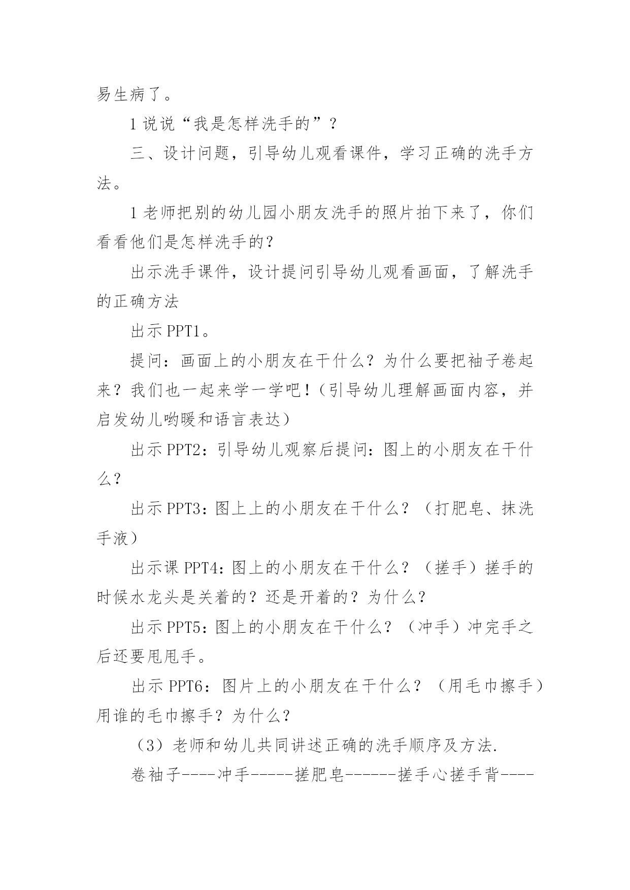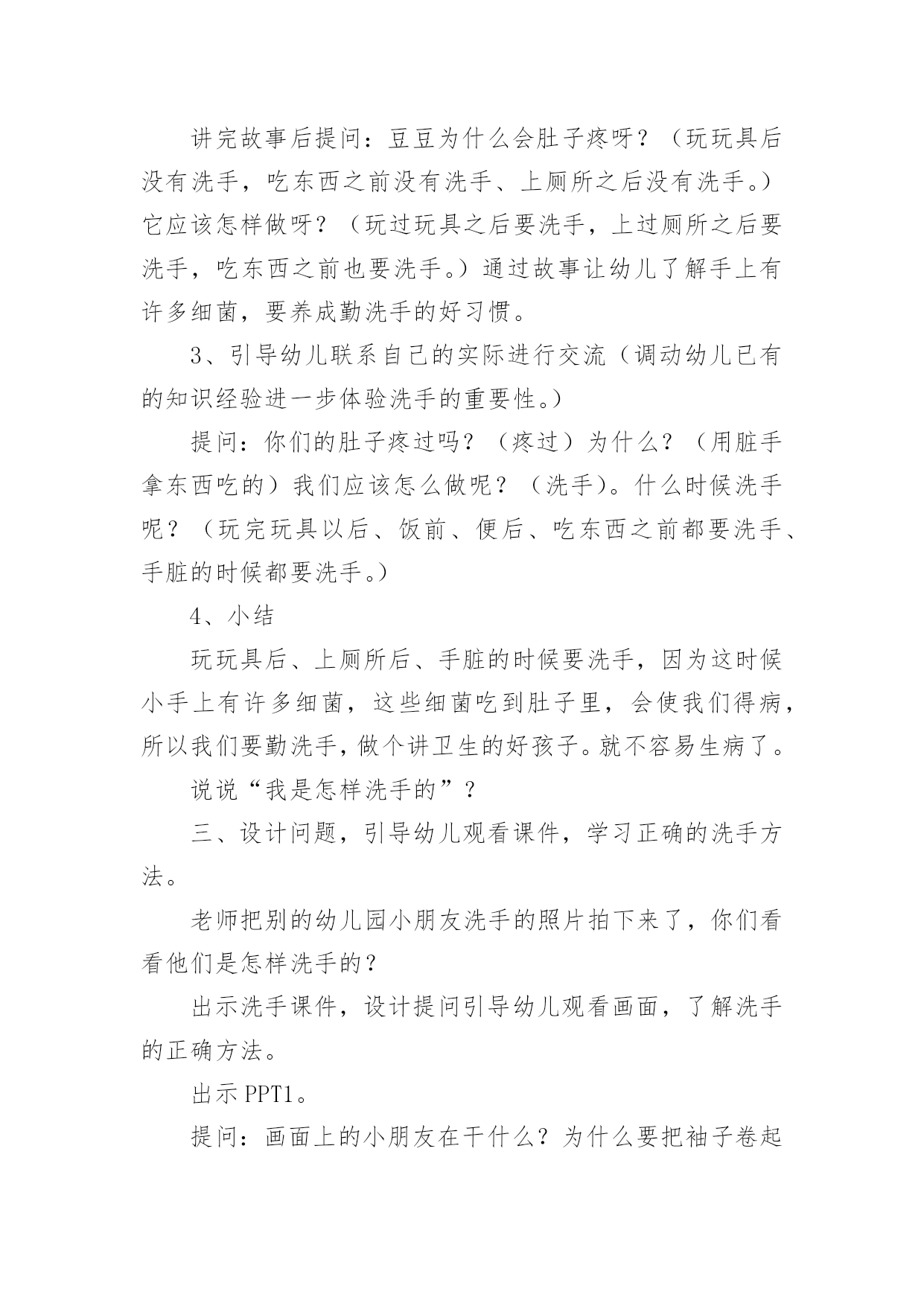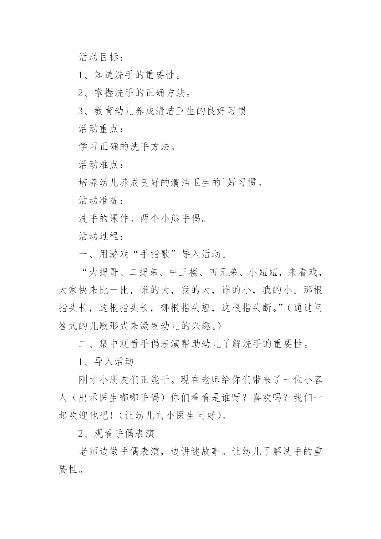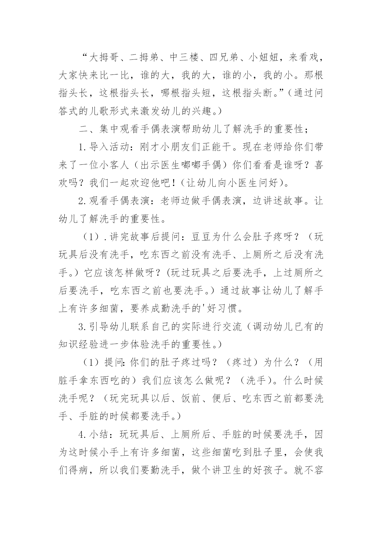 小班卫生健康教案作为一位不辞辛劳的人民教师,时常需要编写教案,编写教案有利于我们科学、合理地支配课堂时间。来参考自己需要的教案吧!下面是小编帮大家整理的小班卫生健康教案,欢迎阅读,希望大家能够喜欢。小班卫生健康教案1设计意图:小班的孩子对自己的小手的各部分名称及用途都有了初步的认知,但许多孩子还不知道怎样正确地洗手,只是匆匆的湿一下手甚至袖口都已经潮湿了半截,地上也“发了水”。整天摸摸这、摸摸那,手上沾满各种细菌,培养幼儿养成良好的生活习惯,让幼儿具备基本的生活自理能力,是对幼儿进行健康教育的重要内容,也是幼儿身心健康的基础。活动目标:1.知道洗手的重要性。2。掌握洗手的正确方法。3.教育幼儿养成清洁卫生的良好习惯活动重点:1.学习正确的洗手方法。活动难点:培养幼儿养成良好的清洁卫生的好习惯。活动准备:洗手的课件。两个小熊手偶。活动过程:一、用游戏“手指歌”导入活动。“大拇哥、二拇弟、中三楼、四兄弟、小妞妞,来看戏,大家快来比一比,谁的大,我的大,谁的小,我的小。那根指头长,这根指头长,哪根指头短,这根指头断。”(通过问答式的儿歌形式来激发幼儿的兴趣。)二、集中观看手偶表演帮助幼儿了解洗手的重要性;1.导入活动:刚才小朋友们正能干。现在老师给你们带来了一位小客人(出示医生嘟嘟手偶)你们看看是谁呀?喜欢吗?我们一起欢迎他吧!(让幼儿向小医生问好)。2.观看手偶表演:老师边做手偶表演,边讲述故事。让幼儿了解洗手的重要性。(1).讲完故事后提问:豆豆为什么会肚子疼呀?(玩玩具后没有洗手,吃东西之前没有洗手、上厕所之后没有洗手。)它应该怎样做呀?(玩过玩具之后要洗手,上过厕所之后要洗手,吃东西之前也要洗手。)通过故事让幼儿了解手上有许多细菌,要养成勤洗手的'好习惯。3.引导幼儿联系自己的实际进行交流(调动幼儿已有的知识经验进一步体验洗手的重要性。)(1)提问:你们的肚子疼过吗?(疼过)为什么?(用脏手拿东西吃的)我们应该怎么做呢?(洗手)。什么时候洗手呢?(玩完玩具以后、饭前、便后、吃东西之前都要洗手、手脏的时候都要洗手。)4.小结:玩玩具后、上厕所后、手脏的时候要洗手,因为这时候小手上有许多细菌,这些细菌吃到肚子里,会使我们得病,所以我们要勤洗手,做个讲卫生的好孩子。就不容易生病了。1说说“我是怎样洗手的”?三、设计问题,引导幼儿观看课件,学习正确的洗手方法。1老师把别的幼儿园小朋友洗手的照片拍下来了,你们看看他们是怎样洗手的?出示洗手课件,设计提问引导幼儿观看画面,了解洗手的正确方法出示PPT1。提问:画面上的小朋友在干什么?为什么要把袖子卷起来?我们也一起来学一学吧!(引导幼儿理解画面内容,并启发幼儿哟暖和语言表达)出示PPT2:引导幼儿观察后提问:图上的小朋友在干什么?出示PPT3:图上上的小朋友在干什么?(打肥皂、抹洗手液)出示课PPT4:图上的小朋友在干什么?(搓手)搓手的时候水龙头是关着的?还是开着的?为什么?出示PPT5:图上的小朋友在干什么?(冲手)冲完手之后还要甩甩手。出示PPT6:图片上的小朋友在干什么?(用毛巾擦手)用谁的毛巾擦手?为什么?(3)老师和幼儿共同讲述正确的洗手顺序及方法.卷袖子----冲手-----搓肥皂------搓手心搓手背----冲肥皂---甩手---用毛巾擦手。(根据画面边做动作边讲解)(4)引导幼儿边说儿歌边做模仿动作。(进一步学习正确的洗手顺序及方法。我有一双小小手,快来快来洗洗手,洗手前,快卷袖,不让水滴沾衣袖。打开水龙头,冲冲小小手,关上水龙头,搓出肥皂泡,搓搓手心,搓手背,打开水管冲一冲,再用毛巾擦擦手,小小手真干净。(5)师幼谈话:“我们什么时候该洗手”(饭前、便后、玩完玩具、手脏时候)。四、幼儿实际练习:洗洗小手讲卫生,进一步掌握洗手的方法。1.教师导语:马上要吃点心了,我们一起来洗洗小手吧!看看谁的小手最干净。2.在实际练习中引导幼儿边说儿歌边洗手。指导幼儿正确的洗手。小班卫生健康教案2设计意图:小班的孩子对自己的小手的各部分名称及用途都有了初步的认知,但许多孩子还不知道怎样正确地洗手,只是匆匆的湿一下手甚至袖口都已经潮湿了半截,地上也“发了水”。整天摸摸这、摸摸那,手上沾满各种细菌,培养幼儿养成良好的生活习惯,让幼儿具备基本的生活自理能力,是对幼儿进行健康教育的重要内容,也是幼儿身心健康的基础。活动目标:1、知道洗手的重要性。2、掌握洗手的正确方法。3、教育幼儿养成清洁卫生的良好习惯活动重点:学习正确的洗手方法。活动难点:培养幼儿养成良好的清洁卫生的`好习惯。活动准备:洗手的课件。两个小熊手偶。活动过程:一、用游戏“手指歌”导入活动。“大拇哥、二拇弟、中三楼、四兄弟、小妞妞,来看戏,大家快来比一比,谁的大,我的大,谁的小,我的小。那根指头长,这根指头长,哪根指头短,这