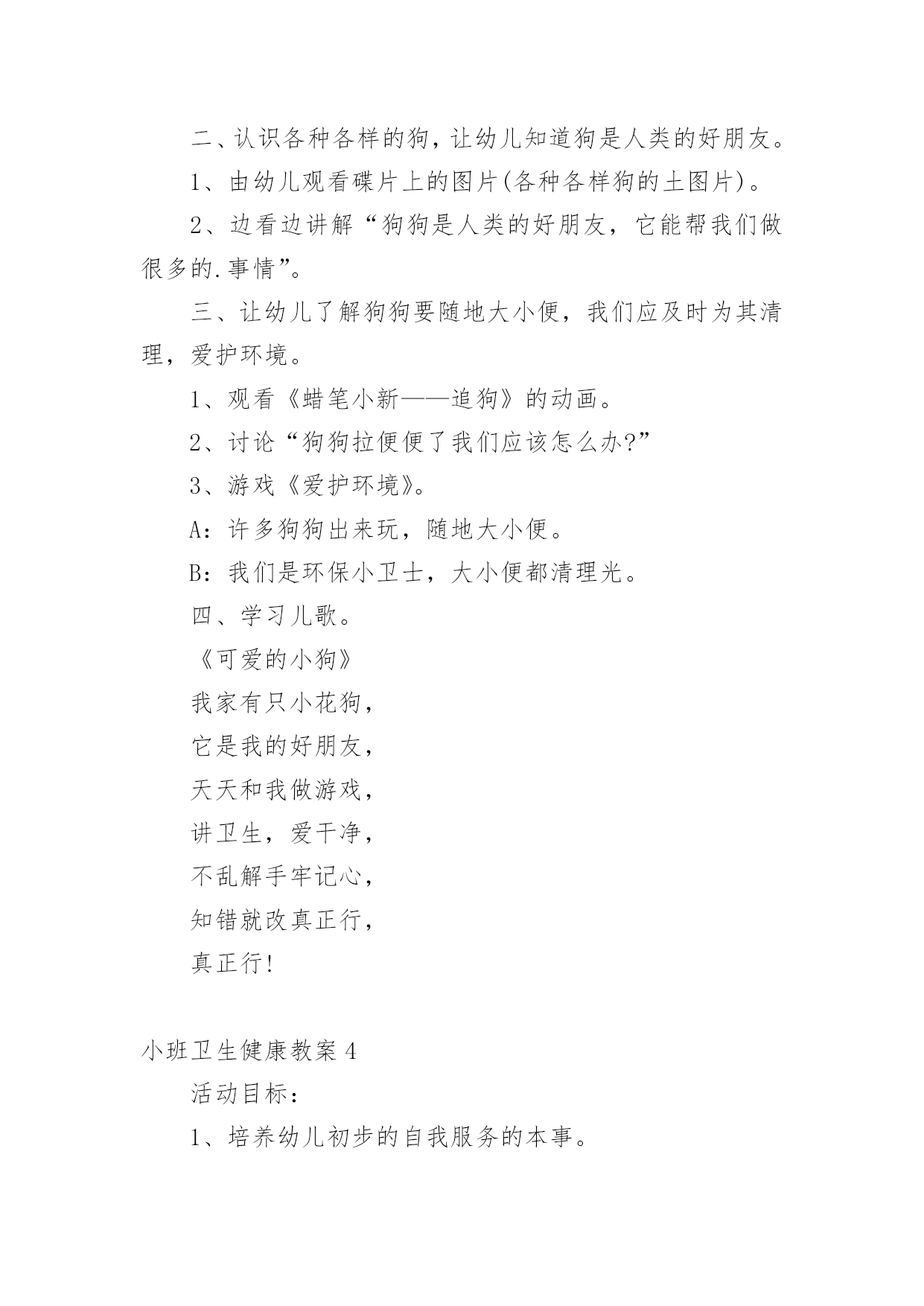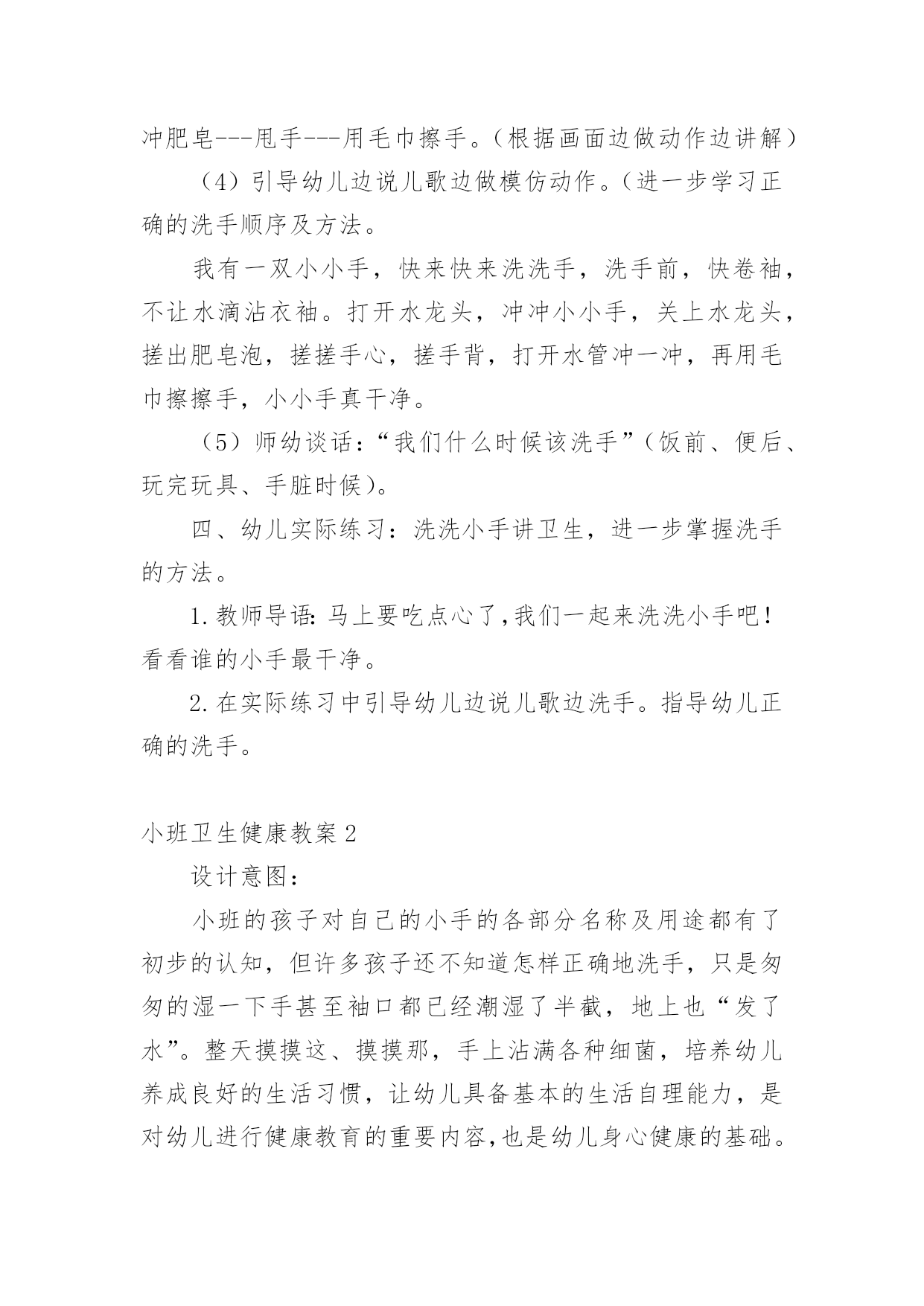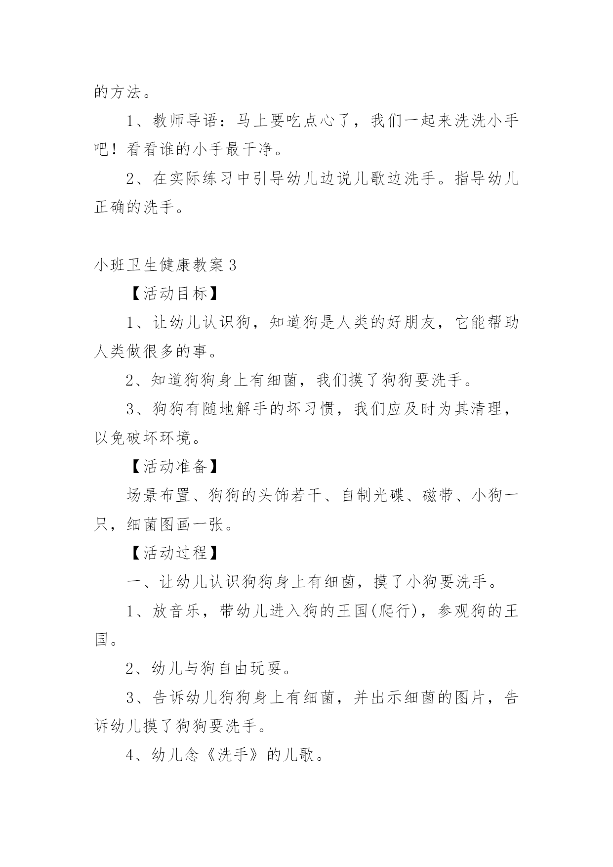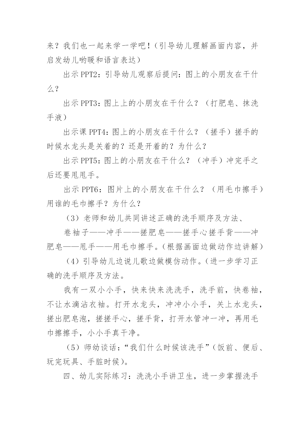 小班卫生健康教案作为一位不辞辛劳的人民教师,时常需要编写教案,编写教案有利于我们科学、合理地支配课堂时间。来参考自己需要的教案吧!下面是小编帮大家整理的小班卫生健康教案,欢迎阅读,希望大家能够喜欢。小班卫生健康教案1设计意图:小班的孩子对自己的小手的各部分名称及用途都有了初步的认知,但许多孩子还不知道怎样正确地洗手,只是匆匆的湿一下手甚至袖口都已经潮湿了半截,地上也“发了水”。整天摸摸这、摸摸那,手上沾满各种细菌,培养幼儿养成良好的生活习惯,让幼儿具备基本的生活自理能力,是对幼儿进行健康教育的重要内容,也是幼儿身心健康的基础。活动目标:1.知道洗手的重要性。2。掌握洗手的正确方法。3.教育幼儿养成清洁卫生的良好习惯活动重点:1.学习正确的洗手方法。活动难点:培养幼儿养成良好的清洁卫生的好习惯。活动准备:洗手的课件。两个小熊手偶。活动过程:一、用游戏“手指歌”导入活动。“大拇哥、二拇弟、中三楼、四兄弟、小妞妞,来看戏,大家快来比一比,谁的大,我的大,谁的小,我的小。那根指头长,这根指头长,哪根指头短,这根指头断。”(通过问答式的儿歌形式来激发幼儿的兴趣。)二、集中观看手偶表演帮助幼儿了解洗手的重要性;1.导入活动:刚才小朋友们正能干。现在老师给你们带来了一位小客人(出示医生嘟嘟手偶)你们看看是谁呀?喜欢吗?我们一起欢迎他吧!(让幼儿向小医生问好)。2.观看手偶表演:老师边做手偶表演,边讲述故事。让幼儿了解洗手的重要性。(1).讲完故事后提问:豆豆为什么会肚子疼呀?(玩玩具后没有洗手,吃东西之前没有洗手、上厕所之后没有洗手。)它应该怎样做呀?(玩过玩具之后要洗手,上过厕所之后要洗手,吃东西之前也要洗手。)通过故事让幼儿了解手上有许多细菌,要养成勤洗手的'好习惯。3.引导幼儿联系自己的实际进行交流(调动幼儿已有的知识经验进一步体验洗手的重要性。)(1)提问:你们的肚子疼过吗?(疼过)为什么?(用脏手拿东西吃的)我们应该怎么做呢?(洗手)。什么时候洗手呢?(玩完玩具以后、饭前、便后、吃东西之前都要洗手、手脏的时候都要洗手。)4.小结:玩玩具后、上厕所后、手脏的时候要洗手,因为这时候小手上有许多细菌,这些细菌吃到肚子里,会使我们得病,所以我们要勤洗手,做个讲卫生的好孩子。就不容易生病了。1说说“我是怎样洗手的”?三、设计问题,引导幼儿观看课件,学习正确的洗手方法。1老师把别的幼儿园小朋友洗手的照片拍下来了,你们看看他们是怎样洗手的?出示洗手课件,设计提问引导幼儿观看画面,了解洗手的正确方法出示PPT1。提问:画面上的小朋友在干什么?为什么要把袖子卷起来?我们也一起来学一学吧!(引导幼儿理解画面内容,并启发幼儿哟暖和语言表达)出示PPT2:引导幼儿观察后提问:图上的小朋友在干什么?出示PPT3:图上上的小朋友在干什么?(打肥皂、抹洗手液)出示课PPT4:图上的小朋友在干什么?(搓手)搓手的时候水龙头是关着的?还是开着的?为什么?出示PPT5:图上的小朋友在干什么?(冲手)冲完手之后还要甩甩手。出示PPT6:图片上的小朋友在干什么?(用毛巾擦手)用谁的毛巾擦手?为什么?(3)老师和幼儿共同讲述正确的洗手顺序及方法.卷袖子----冲手-----搓肥皂------搓手心搓手背----冲肥皂---甩手---用毛巾擦手。(根据画面边做动作边讲解)(4)引导幼儿边说儿歌边做模仿动作。(进一步学习正确的洗手顺序及方法。我有一双小小手,快来快来洗洗手,洗手前,快卷袖,不让水滴沾衣袖。打开水龙头,冲冲小小手,关上水龙头,搓出肥皂泡,搓搓手心,搓手背,打开水管冲一冲,再用毛巾擦擦手,小小手真干净。(5)师幼谈话:“我们什么时候该洗手”(饭前、便后、玩完玩具、手脏时候)。四、幼儿实际练习:洗洗小手讲卫生,进一步掌握洗手的方法。1.教师导语:马上要吃点心了,我们一起来洗洗小手吧!看看谁的小手最干净。2.在实际练习中引导幼儿边说儿歌边洗手。指导幼儿正确的洗手。小班卫生健康教案2设计意图:小班的孩子对自己的小手的各部分名称及用途都有了初步的认知,但许多孩子还不知道怎样正确地洗手,只是匆匆的湿一下手甚至袖口都已经潮湿了半截,地上也“发了水”。整天摸摸这、摸摸那,手上沾满各种细菌,培养幼儿养成良好的生活习惯,让幼儿具备基本的生活自理能力,是对幼儿进行健康教育的重要内容,也是幼儿身心健康的基础。活动目标:1、知道洗手的重要性。2、掌握洗手的正确方法。3、教育幼儿养成清洁卫生的良好习惯活动重点:学习正确的洗手方法。活动难点:培养幼儿养成良好的清洁卫生的`好习惯。活动准备:洗手的课件。两个小熊手偶。活动过程:一、用游戏“手指歌”导入活动。“大拇哥、二拇弟、中三楼、四兄弟、小妞妞,来看戏,大家快来比一比,谁的大,我的大,谁的小,我的小。那根指头长,这根指头长,哪根指头短,这