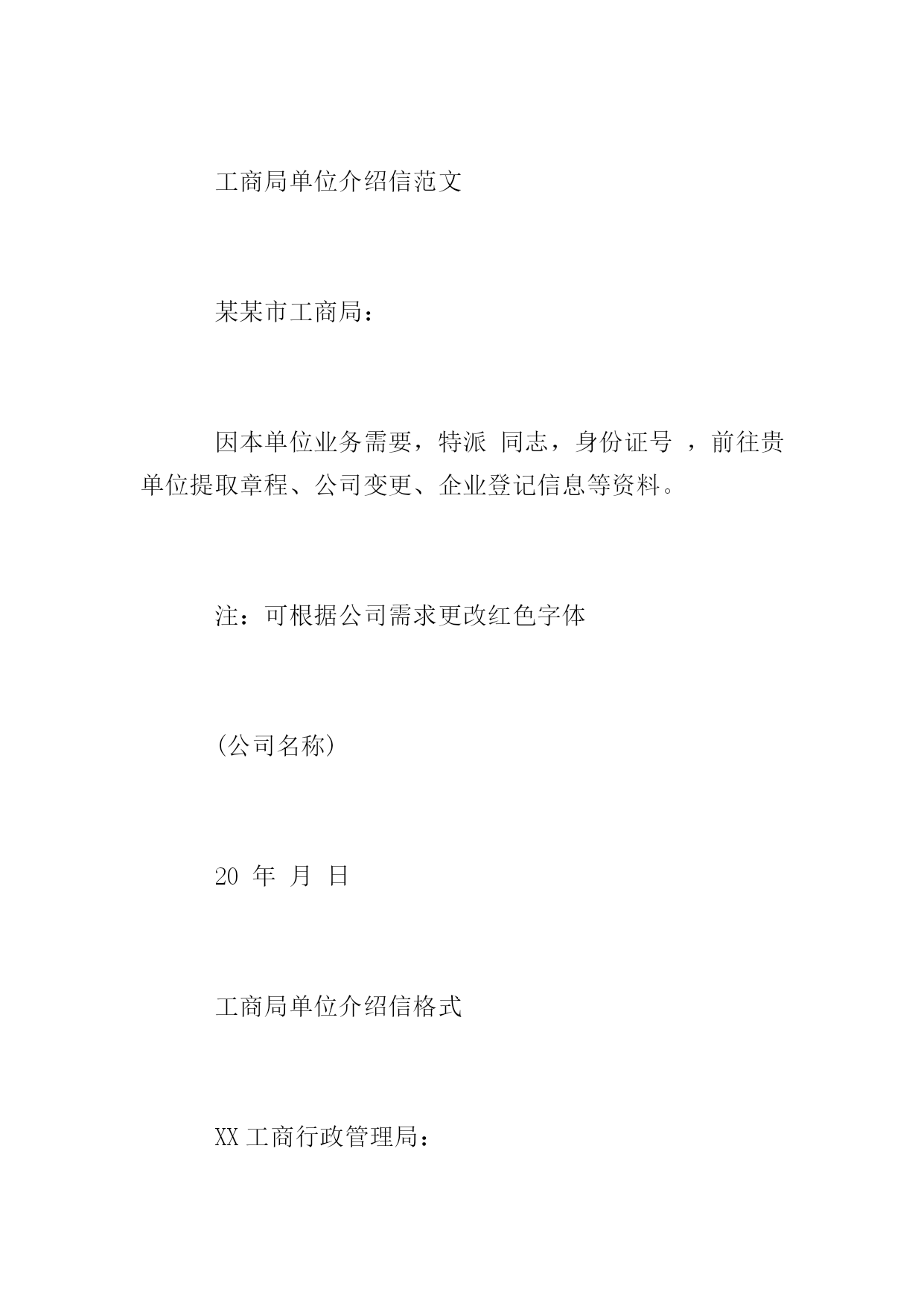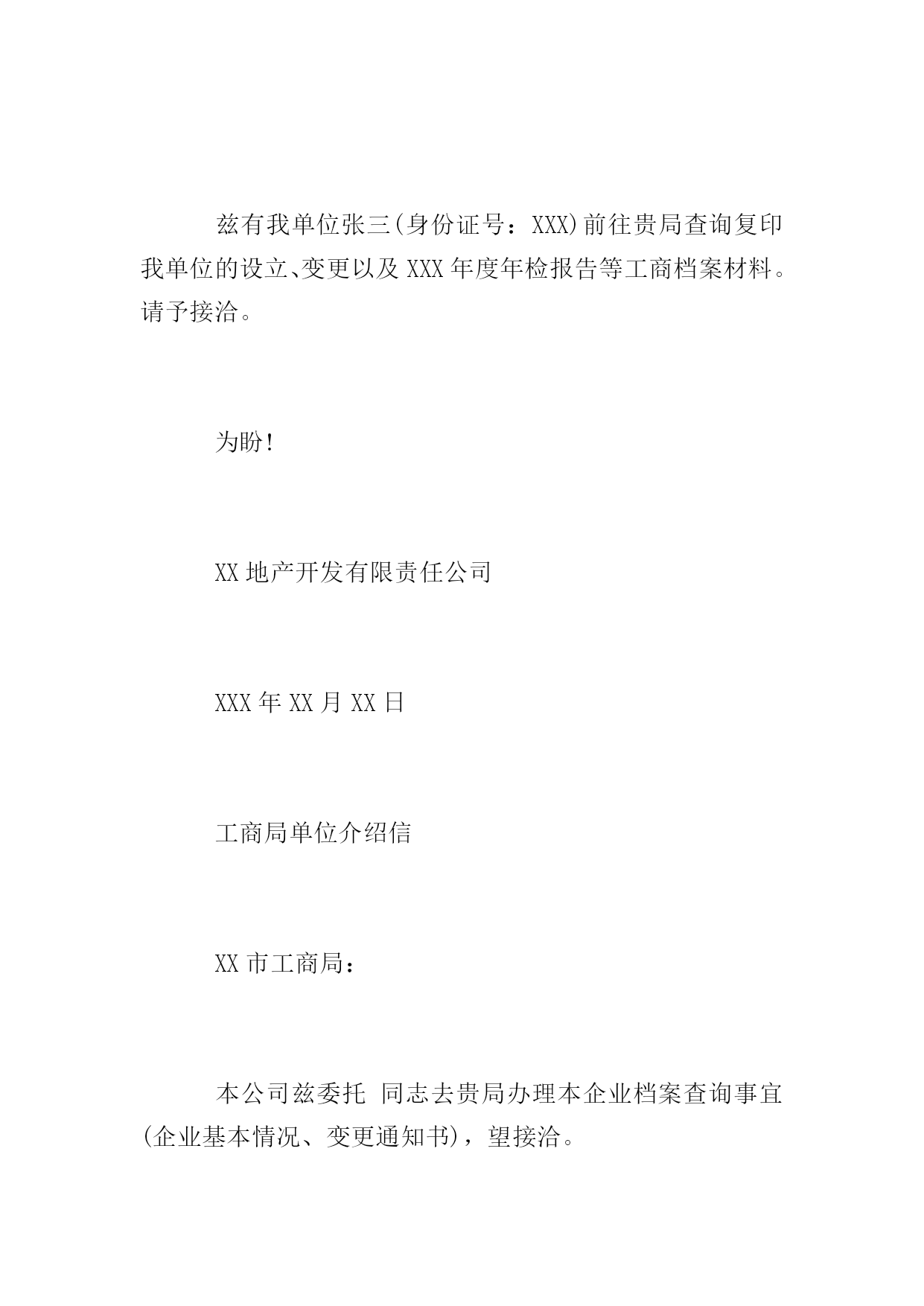 工商局单位介绍信范本工商局单位介绍信范本XX县工商局:因业务需要,兹介绍我单位xxx同志前往贵局开具(复印)我单位(企业信息、变更信息)等信息材料,请给予开具为盼。xxxx有限公司年月日工商局单位介绍信范文某某市工商局:因本单位业务需要,特派同志,身份证号,前往贵单位提取章程、公司变更、企业登记信息等资料。注:可根据公司需求更改红色字体(公司名称)20年月日工商局单位介绍信格式XX工商行政管理局:兹有我单位张三(身份证号:XXX)前往贵局查询复印我单位的设立、变更以及XXX年度年检报告等工商档案材料。请予接洽。为盼!XX地产开发有限责任公司XXX年XX月XX日工商局单位介绍信XX市工商局:本公司兹委托同志去贵局办理本企业档案查询事宜(企业基本情况、变更通知书),望接洽。XX公司XXX年XX月XX日