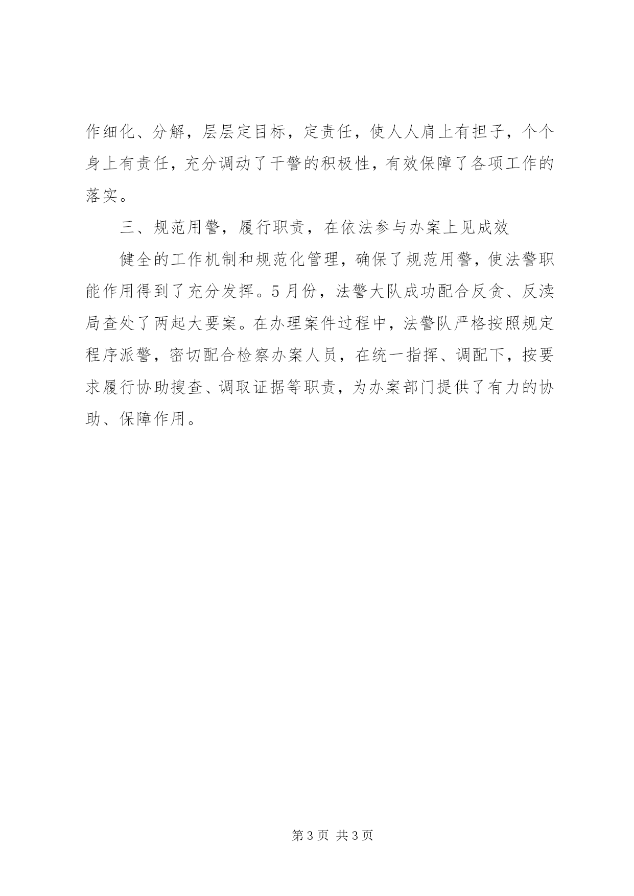 第PAGE\*Arabic\*MERGEFORMAT3页共NUMPAGES\*MERGEFORMAT3页司法行业法警大队规范化管理汇报今年以来,我院法警大队不断加强队伍正规化建设,在健全工作机制,严格规范管理,依法参与办案上下功夫,切实发挥了司法警察的职能作用。一、强化培训,注重提高,从素质上保证规范化建设一是加强思想政治教育,提高职业道德素质。坚持政治理论学习日制度,严格利用周五政治理论学习时间,有计划的组织全队学习政治理论和检察干警的职业道德读本、《司法警察条例》、《人民警察法》、《司法警察规范化建设标准》,教育大家牢固树立“立检为公,执法为民”理念,打牢执法思想根基。结合开展社会主义法治理念教育和专项整改活动,对照先进找差距,对照要求找不足,对照他人查自己,深入剖析原因,切实加强整改。通过学习和教育,全队司法警察的思想政治素质有了明显提高。二是加强业务培训,提高专业化水平。采取内部培训与外出参观学习相结合、业务知识学习和岗位技能训练相结合的方式,推进法警队伍专业化建设。定期举办专题讲座,邀请本院反贪局、反渎职侵权局、公诉处等业务部门干警开展案例式教学,进一步明确司法警察在办案中的职责。组织参观了第二届中国国际警用装备及反恐技术装备展览会,进一步开阔了视野,丰富了知识。通过不断加大培训力度,努力使全队做到既熟悉法警职责,又懂检察业务、办案程序,既会使用警械具、擒拿技术,又会微机操作,切实提高业务技能和综合素质。三是加强办案安全与党风廉政教育,增强安全办案意识。把办案安全工作作为经常性的工作来抓,大力加强宣传教育,克服松懈麻痹思想,切实在思想上筑牢安全防线,有效预防和杜绝事故的发生。法警大队队长与院领导、全体司法警察层层签订了《办案安全责任书》和《党风廉政建设责任书》,进一步确保公正执法、廉洁办案。二、明确职责,完善制度,从机制上保证规范化建设建章立制,加强管理。根据高检院《检察机关司法警察工作规范化建设标准》的要求,结合本院实际,制定、完善了《司法警察工作管理办法》、《司法警察执行看管、押送、搜查等任务的规定》、《枪支器械使用有关规定》、《司法警察送达法律文书管理规定》、《司法警察办案安全工作制度》、《司法警察看管值班制度》等规章制度,使司法警察管理工作有章可循,有法可依,步入了制度化,规范化管理轨道。分工具体,职责分明,建立了司法警察工作目标管理制度,明确了法警大队队长职责、副队长职责、提讯组长职责、提讯组员职责等,实施了组长负责制,由提讯组长具体负责组织提讯、押解等工作,指定专人负责办理法律手续、警械具的使用和警务区的监管,明确了各个岗位的工作内容、标准和职责,将法警工作细化、分解,层层定目标,定责任,使人人肩上有担子,个个身上有责任,充分调动了干警的积极性,有效保障了各项工作的落实。三、规范用警,履行职责,在依法参与办案上见成效健全的工作机制和规范化管理,确保了规范用警,使法警职能作用得到了充分发挥。5月份,法警大队成功配合反贪、反渎局查处了两起大要案。在办理案件过程中,法警队严格按照规定程序派警,密切配合检察办案人员,在统一指挥、调配下,按要求履行协助搜查、调取证据等职责,为办案部门提供了有力的协助、保障作用。