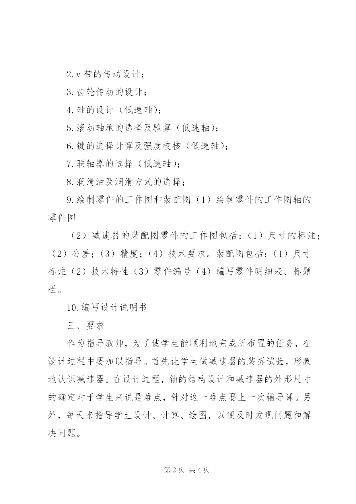 第PAGE\*Arabic\*MERGEFORMAT4页共NUMPAGES\*MERGEFORMAT4页《机械设计课程设计》总结机电11301《机械设计基础课程设计》总结一、课程设计目的《机械设计基础课程设计》是《机械设计基础》课程的的最后一个重要教学环节,也是学生第一次较全面的设计能力训练。其基本目的是:1.培养理论联系实际的设计思想,训练综合运用机械设计和有关先修课程的理论,结合生产实际分析和解决工程实际问题的能力,巩固、加深和扩展有关机械设计方面的知识;2.通过制定设计方案合理选择传动机构和零件类型,正确计算零件工作能力、确定尺寸和选择材料,以及较全面的考虑制造工艺、使用和维护等要求,进行结构设计,达到了解和掌握机械零件、机械传动装置的设计过程和方法;3.进行设计基本技能的训练。例如计算、绘图、熟悉和运用设计资料(手册、图册、标准和规范等)以及使用经验数据、进行经验估算和处理数据的能力。在本课程设计鼓励采用计算机绘图。二、课程设计内容为了达到上述目的,在课程设计中,针对布置题目学生要完成的设计内容有:1.电动机的选择及运动参数的计算;2.v带的传动设计;3.齿轮传动的设计;4.轴的设计(低速轴);5.滚动轴承的选择及验算(低速轴);6.键的选择计算及强度校核(低速轴);7.联轴器的选择(低速轴);8.润滑油及润滑方式的选择;9.绘制零件的工作图和装配图(1)绘制零件的工作图轴的零件图(2)减速器的装配图零件的工作图包括:(1)尺寸的标注;(2)公差;(3)精度;(4)技术要求。装配图包括:(1)尺寸标注(2)技术特性(3)零件编号(4)编写零件明细表、标题栏。10.编写设计说明书三、要求作为指导教师,为了使学生能顺利地完成所布置的任务,在设计过程中要加以指导。首先让学生做减速器的装拆试验,形象地认识减速器。在设计过程,轴的结构设计和减速器的外形尺寸的确定对于学生来说是难点,针对这一难点要上一次辅导课。另外,每天来指导学生设计、计算、绘图,以便及时发现问题和解决问题。要求每位学生在设计过程中,充分发挥自己的独立工作能力及创造能力,对每个问题都应进行分析、比较,并提出自己的见解,反对盲从,杜绝抄袭。在设计过程中必须做到:1)随时复习教科书、听课笔记及习题。2)及时了解有关资料,做好准备工作,充分发挥自己的主观能动性和创造性。3)认真计算和制图,保证计算正确和图纸质量。4)按预定计划循序完成任务。四、评分原则课程设计中,最终的图纸及说明书并不能完全反映学生的真实水平,同学的工作能力也不能在图纸及说明书中得到完全的反映,因此,对同学的评分,特别要注意抓两头:一头抓平时,一头抓答辩.课程设计成绩根据平时出勤和设计图纸、说明书、创新能力和答辩情况综合按百分制制评定。五、存在问题在课程设计过程中,发现学生主要存在以下问题。1)学习态度不够认真,或虽认真但因基础差等原因,不能按时完成进度计划;2)独立工作能力差,设计时不能或不进行独立思考,教师指一步才作一步,或参照其他同学的设计进行“照猫画虎”式的进行;3)设计中有错误,有知其然不知其所以然的现象;4)图纸质量较差,特别是尺寸标注,出现问题较多,表达不清楚;说明书内容不够完整、工整,有个别原则性错误和若干一般性错误;5)答辩中不能很好的回答提问,回答中有个别原则性错误和若于非原则性错误。六、结果分析参加本次课程设计1个班,大部分同学能按老师要求完成每一阶段的任务,设计图纸、说明书和最后的答辩中满足要求。参加本次课程设计共有50名同学,其中优2人,良26人,中20人,及格2人,不及格0人。基本反映了学生的学习情况。七、经验及教训由于《机械设计基础课程设计》需要用到许多先修课程如《工程制图》、《工程力学》及《公差测量及配合》等,而部分学生在由于前期的先修课没有学好,甚至《公差测量及配合》先修课没开,所以在绘图上表达不清楚,尺寸标注等方面做得不好。所以要在学先修课时,督促学生把先修课学好。