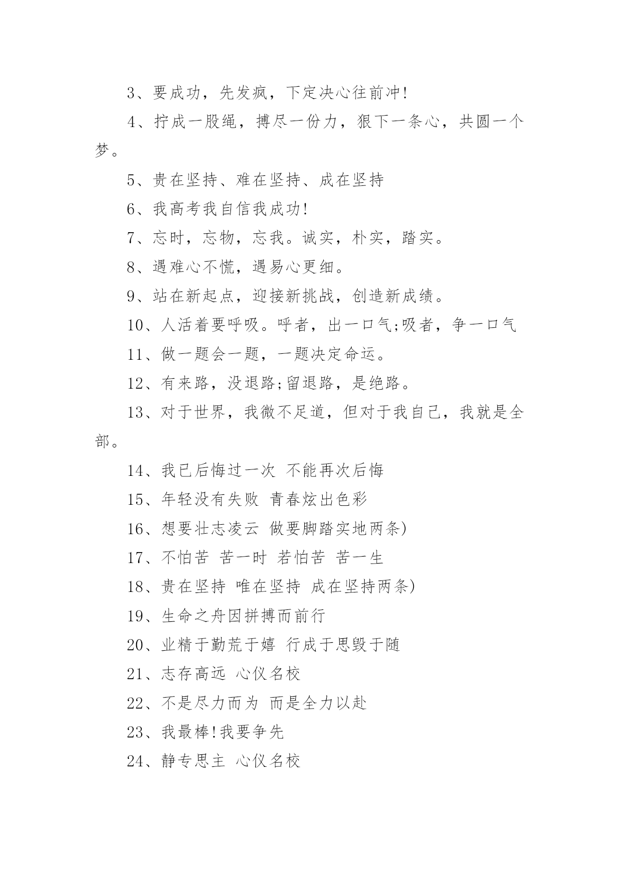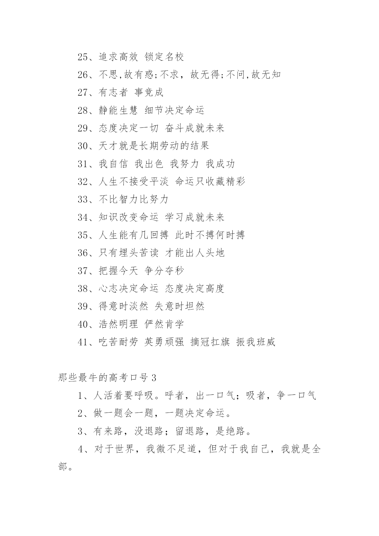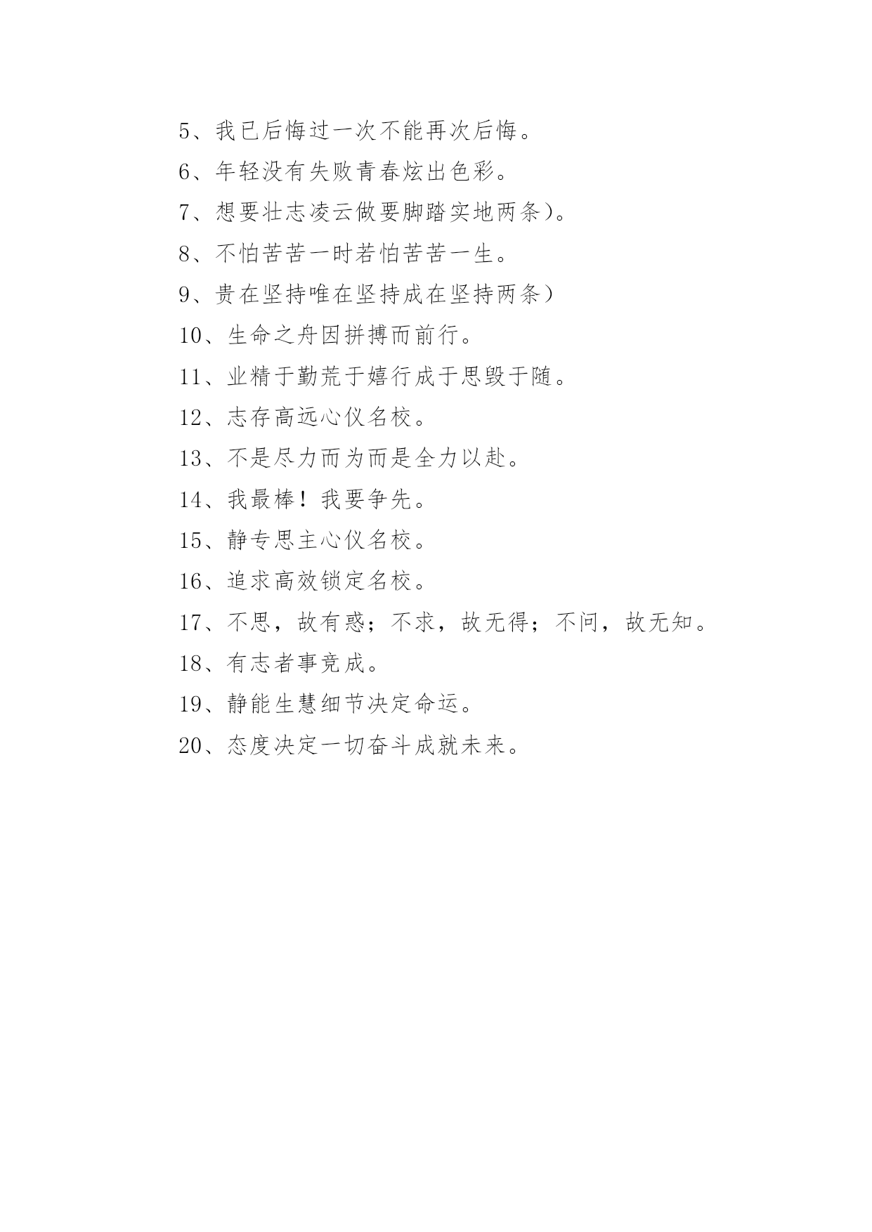 那些最牛的高考口号在现实生活或工作学习中,大家一定都接触过一些使用较为普遍的口号吧,口号往往带有很强的倾向性,它的引导和鼓动作用十分明显。那什么样的口号才是经典的呢?下面是小编收集整理的那些最牛的高考口号,希望对大家有所帮助。那些最牛的高考口号11、拼一分高一分,一分成就终生。2、拼一载春秋,搏一生无悔。3、要成功,先发疯,下定决心往前冲!4、拧成一股绳,搏尽一份力,狠下一条心,共圆一个梦。5、贵在坚持、难在坚持、成在坚持6、我高考我自信我成功!7、精神成就事业,态度决定一切。8、忘时,忘物,忘我。诚实,朴实,踏实。9、遇难心不慌,遇易心更细。10、站在新起点,迎接新挑战,创造新成绩。那些最牛的高考口号21、拼一分高一分,一分成就终生。2、拼一载春秋,搏一生无悔。3、要成功,先发疯,下定决心往前冲!4、拧成一股绳,搏尽一份力,狠下一条心,共圆一个梦。5、贵在坚持、难在坚持、成在坚持6、我高考我自信我成功!7、忘时,忘物,忘我。诚实,朴实,踏实。8、遇难心不慌,遇易心更细。9、站在新起点,迎接新挑战,创造新成绩。10、人活着要呼吸。呼者,出一口气;吸者,争一口气11、做一题会一题,一题决定命运。12、有来路,没退路;留退路,是绝路。13、对于世界,我微不足道,但对于我自己,我就是全部。14、我已后悔过一次不能再次后悔15、年轻没有失败青春炫出色彩16、想要壮志凌云做要脚踏实地两条)17、不怕苦苦一时若怕苦苦一生18、贵在坚持唯在坚持成在坚持两条)19、生命之舟因拼搏而前行20、业精于勤荒于嬉行成于思毁于随21、志存高远心仪名校22、不是尽力而为而是全力以赴23、我最棒!我要争先24、静专思主心仪名校25、追求高效锁定名校26、不思,故有惑;不求,故无得;不问,故无知27、有志者事竞成28、静能生慧细节决定命运29、态度决定一切奋斗成就未来30、天才就是长期劳动的结果31、我自信我出色我努力我成功32、人生不接受平淡命运只收藏精彩33、不比智力比努力34、知识改变命运学习成就未来35、人生能有几回搏此时不搏何时搏36、只有埋头苦读才能出人头地37、把握今天争分夺秒38、心志决定命运态度决定高度39、得意时淡然失意时坦然40、浩然明理俨然肯学41、吃苦耐劳英勇顽强摘冠扛旗振我班威那些最牛的高考口号31、人活着要呼吸。呼者,出一口气;吸者,争一口气2、做一题会一题,一题决定命运。3、有来路,没退路;留退路,是绝路。4、对于世界,我微不足道,但对于我自己,我就是全部。5、我已后悔过一次不能再次后悔。6、年轻没有失败青春炫出色彩。7、想要壮志凌云做要脚踏实地两条)。8、不怕苦苦一时若怕苦苦一生。9、贵在坚持唯在坚持成在坚持两条)10、生命之舟因拼搏而前行。11、业精于勤荒于嬉行成于思毁于随。12、志存高远心仪名校。13、不是尽力而为而是全力以赴。14、我最棒!我要争先。15、静专思主心仪名校。16、追求高效锁定名校。17、不思,故有惑;不求,故无得;不问,故无知。18、有志者事竞成。19、静能生慧细节决定命运。20、态度决定一切奋斗成就未来。