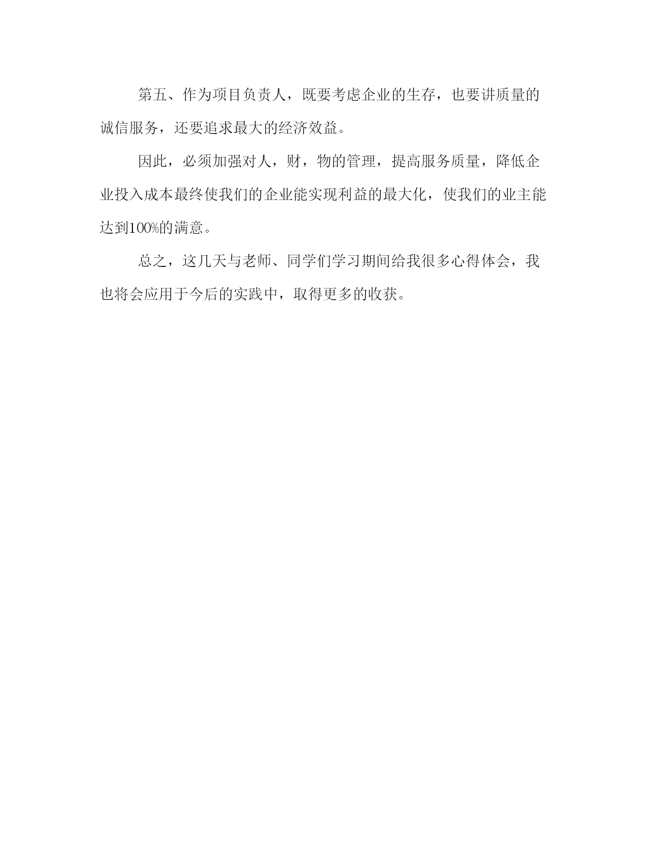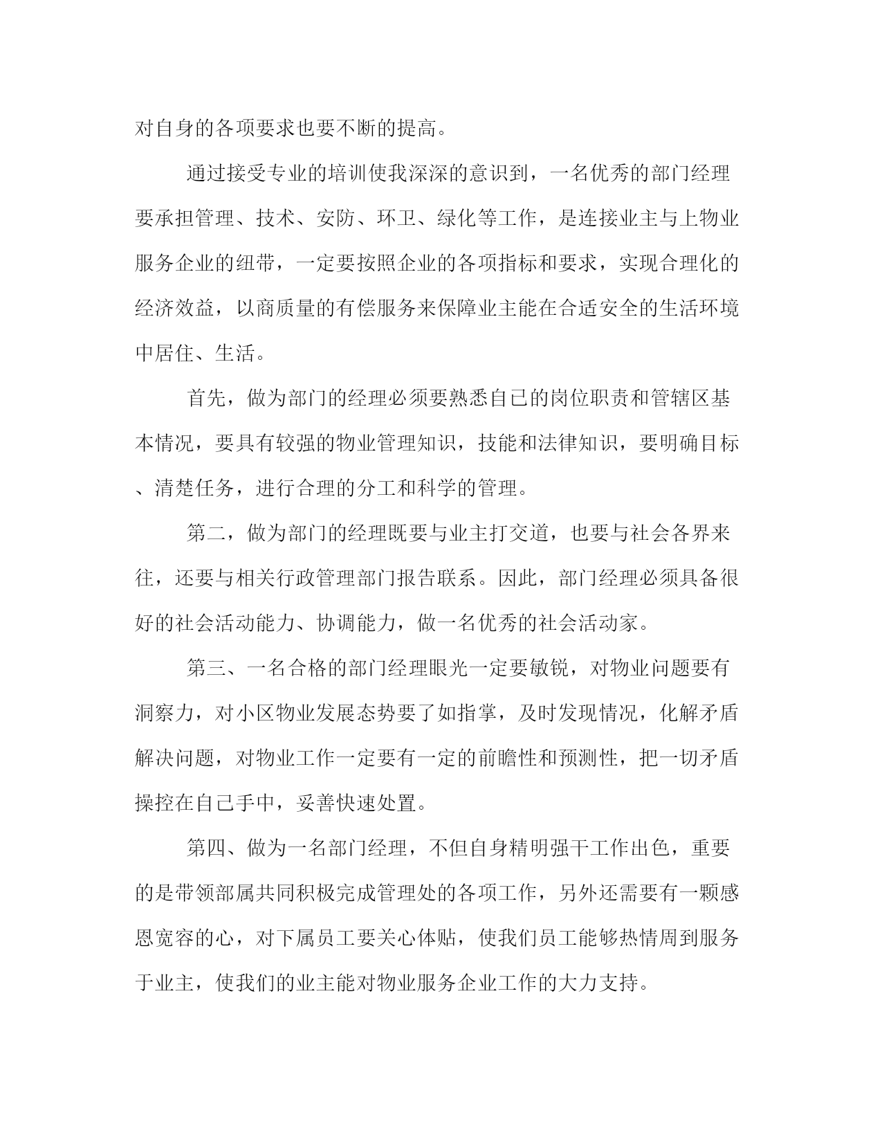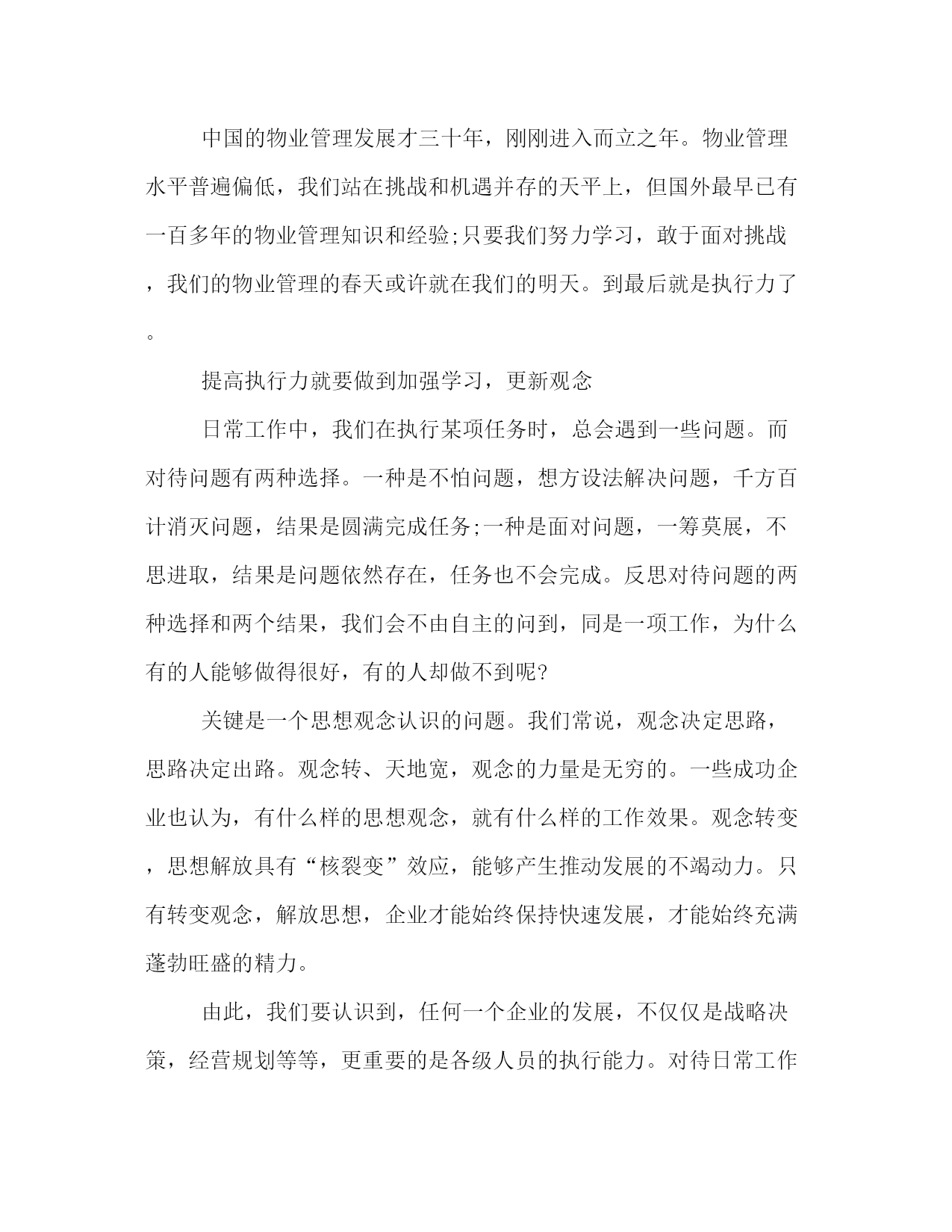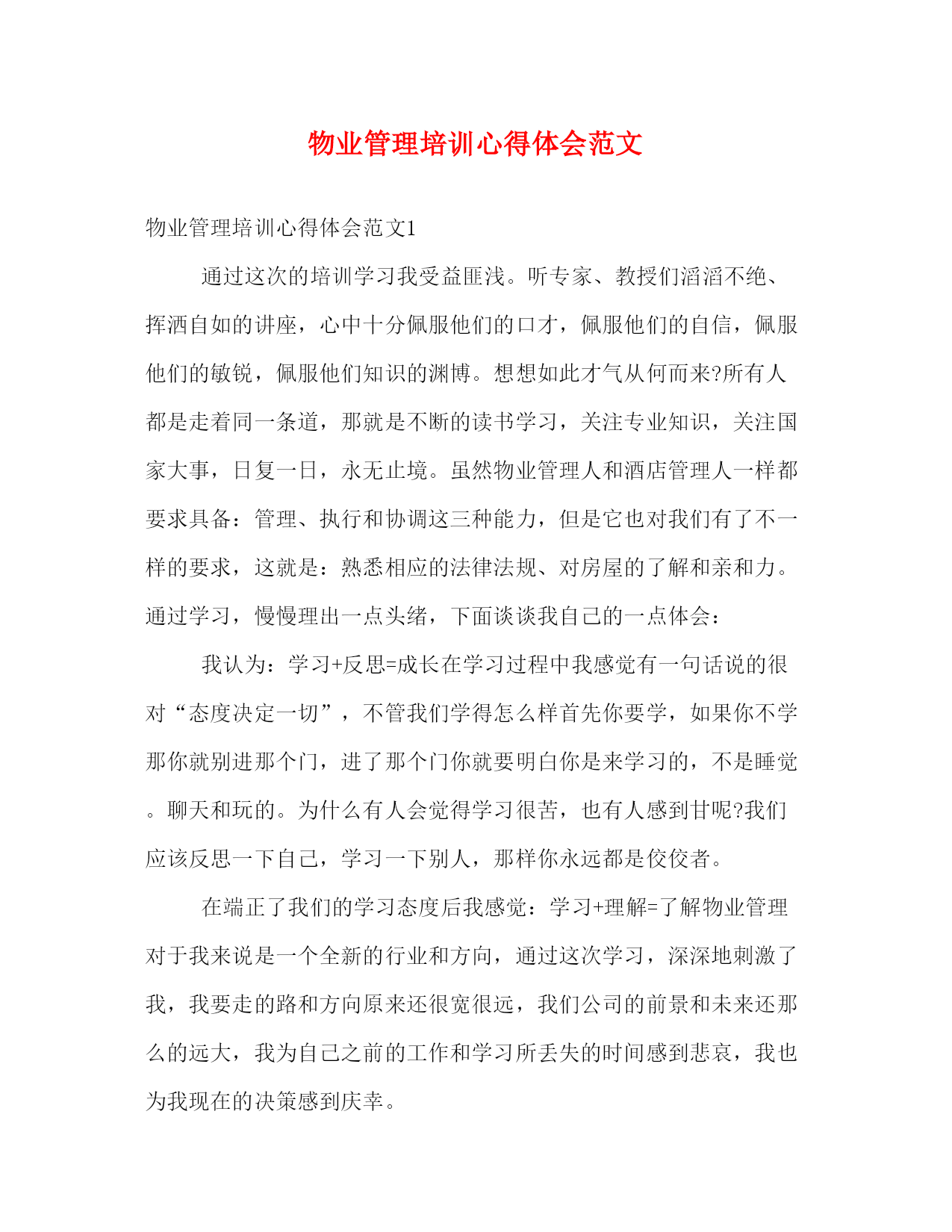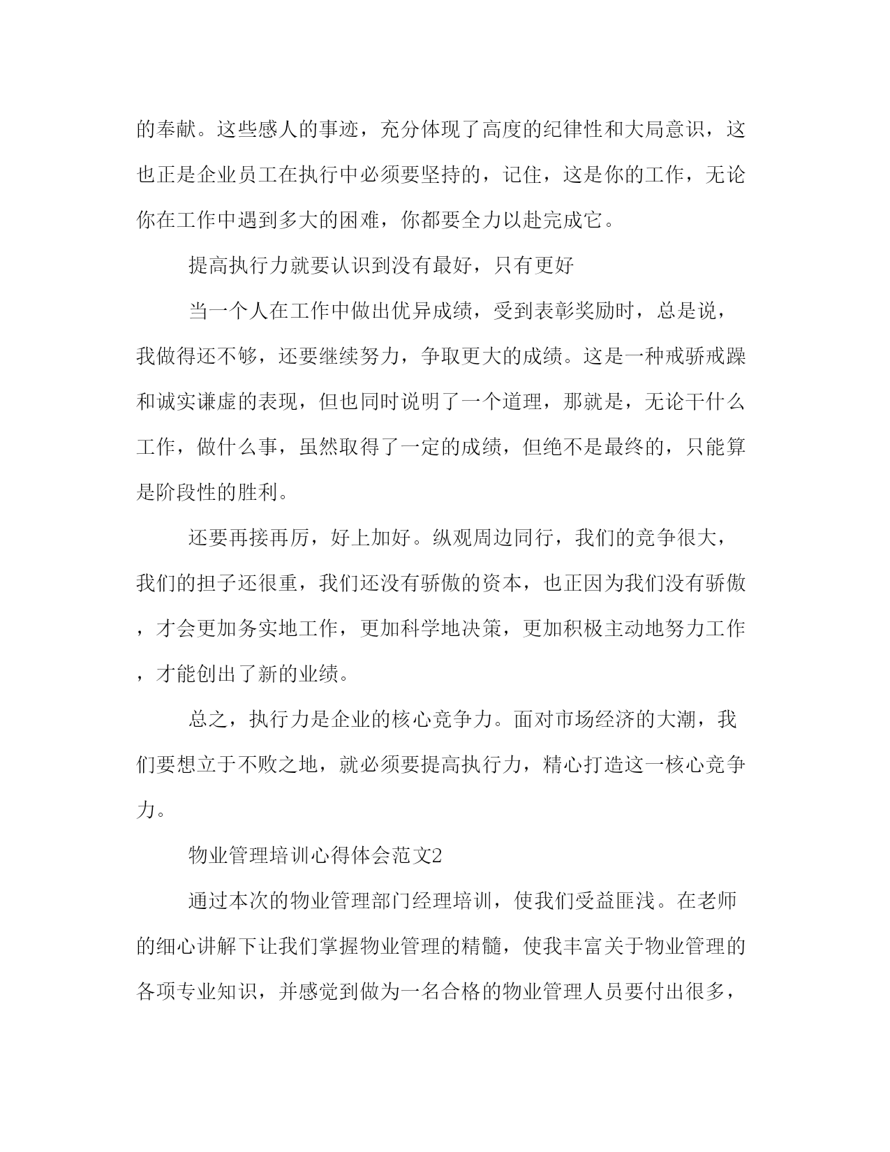 PAGE此资料由网络收集而来,如有侵权请告知上传者立即删除。资料共分享,我们负责传递知识。物业管理培训心得体会范文物业管理培训心得体会范文1通过这次的培训学习我受益匪浅。听专家、教授们滔滔不绝、挥洒自如的讲座,心中十分佩服他们的口才,佩服他们的自信,佩服他们的敏锐,佩服他们知识的渊博。想想如此才气从何而来?所有人都是走着同一条道,那就是不断的读书学习,关注专业知识,关注国家大事,日复一日,永无止境。虽然物业管理人和酒店管理人一样都要求具备:管理、执行和协调这三种能力,但是它也对我们有了不一样的要求,这就是:熟悉相应的法律法规、对房屋的了解和亲和力。通过学习,慢慢理出一点头绪,下面谈谈我自己的一点体会:我认为:学习+反思=成长在学习过程中我感觉有一句话说的很对“态度决定一切”,不管我们学得怎么样首先你要学,如果你不学那你就别进那个门,进了那个门你就要明白你是来学习的,不是睡觉。聊天和玩的。为什么有人会觉得学习很苦,也有人感到甘呢?我们应该反思一下自己,学习一下别人,那样你永远都是佼佼者。在端正了我们的学习态度后我感觉:学习+理解=了解物业管理对于我来说是一个全新的行业和方向,通过这次学习,深深地刺激了我,我要走的路和方向原来还很宽很远,我们公司的前景和未来还那么的远大,我为自己之前的工作和学习所丢失的时间感到悲哀,我也为我现在的决策感到庆幸。中国的物业管理发展才三十年,刚刚进入而立之年。物业管理水平普遍偏低,我们站在挑战和机遇并存的天平上,但国外最早已有一百多年的物业管理知识和经验;只要我们努力学习,敢于面对挑战,我们的物业管理的春天或许就在我们的明天。到最后就是执行力了。提高执行力就要做到加强学习,更新观念日常工作中,我们在执行某项任务时,总会遇到一些问题。而对待问题有两种选择。一种是不怕问题,想方设法解决问题,千方百计消灭问题,结果是圆满完成任务;一种是面对问题,一筹莫展,不思进取,结果是问题依然存在,任务也不会完成。反思对待问题的两种选择和两个结果,我们会不由自主的问到,同是一项工作,为什么有的人能够做得很好,有的人却做不到呢?关键是一个思想观念认识的问题。我们常说,观念决定思路,思路决定出路。观念转、天地宽,观念的力量是无穷的。一些成功企业也认为,有什么样的思想观念,就有什么样的工作效果。观念转变,思想解放具有“核裂变”效应,能够产生推动发展的不竭动力。只有转变观念,解放思想,企业才能始终保持快速发展,才能始终充满蓬勃旺盛的精力。由此,我们要认识到,任何一个企业的发展,不仅仅是战略决策,经营规划等等,更重要的是各级人员的执行能力。对待日常工作,不要总是找借口,要从自身出发,不断加强学习更新观念,不断分析认识提高自己,改变不执行不作为的不良习惯,自动自发地做好本职工作。提高执行力就要做到诚实做人,认真做事我们常说,诚诚实实做人,认认真真做事。做人要有一个做人的标准,做事也要有一个做事的原则。但具体到实际工作中,常常是有制度,有措施,也有违章。究其原因,就是一个态度问题,一个责任感强不强的问题,一个做人是否诚实、做事是否认真的问题。联系到一些企业“做强做大”的发展格局,就象我们餐饮部一样,部门管理的范围越来越大,更需要我们树立一种积极向上的工作态度,诚实认真地执行好企业的每一项决策,正确履行各项工作。要时刻牢记执行工作,没有任何借口,要视服从为美德;工作中无小事,工作就意味着责任,无论在任何岗位,无论做什么工作,都要怀着热情、带着情感去做,而且要竭尽全力、尽职尽责地做好、爱岗敬业。提高执行力就要做到面对困难,勇往直前唯物辩证法认为,任何事物的发展都不是一帆风顺的,毛泽东同志也说过,我们共产党人不怕任何困难,世上无难事,只怕有心人。金通公司虽然成立还未到一年,生活福利也非常艰苦,照样有很多员工为了企业的发展舍小家、顾大家,为企业的可持续发展做着无私的奉献。这些感人的事迹,充分体现了高度的纪律性和大局意识,这也正是企业员工在执行中必须要坚持的,记住,这是你的工作,无论你在工作中遇到多大的困难,你都要全力以赴完成它。提高执行力就要认识到没有最好,只有更好当一个人在工作中做出优异成绩,受到表彰奖励时,总是说,我做得还不够,还要继续努力,争取更大的成绩。这是一种戒骄戒躁和诚实谦虚的表现,但也同时说明了一个道理,那就是,无论干什么工作,做什么事,虽然取得了一定的成绩,但绝不是最终的,只能算是阶段性的胜利。还要再接再厉,好上加好。纵观周边同行,我们的竞争很大,我们的担子还很重,我们还没有骄傲的资本,也正因为我们没有骄傲,才会更加务实地工作,更加科学地决策,更加积极主动地努力工作,才能创出了新的业绩。总之,执行力是企业的核心竞争力。面对市场经济的大潮,我们要