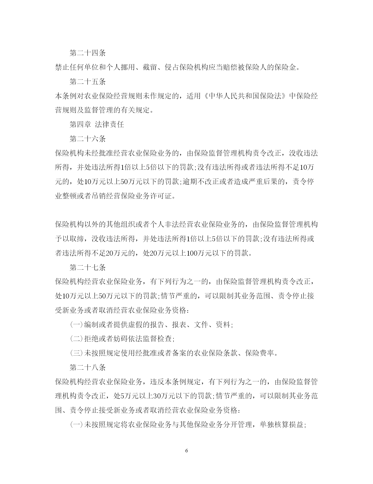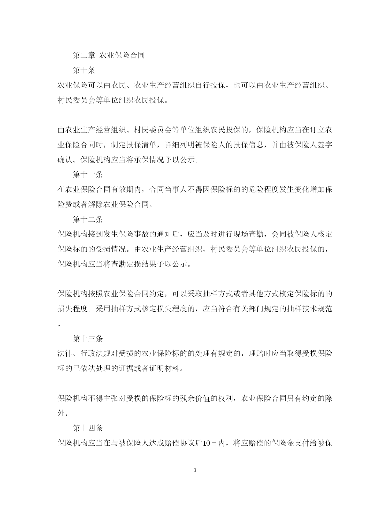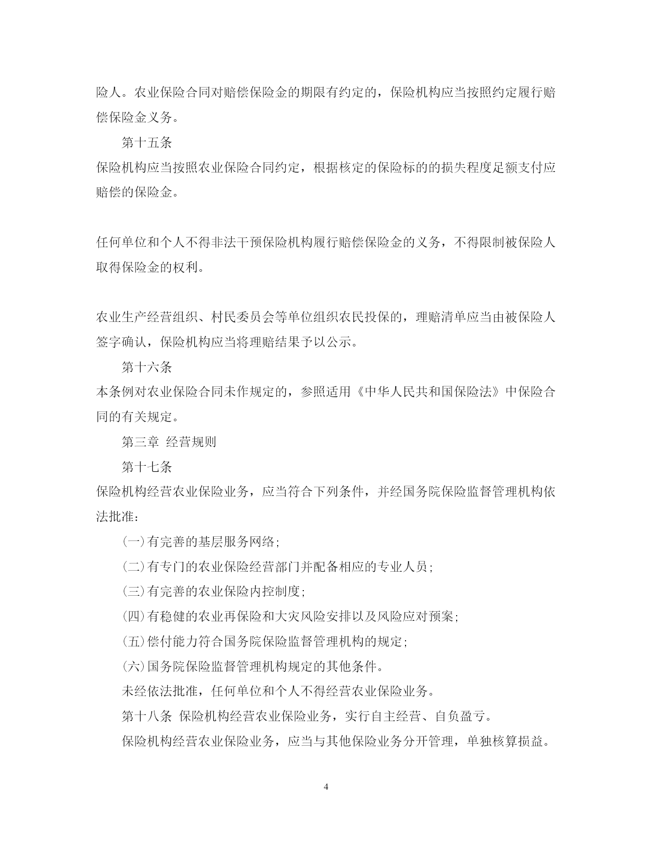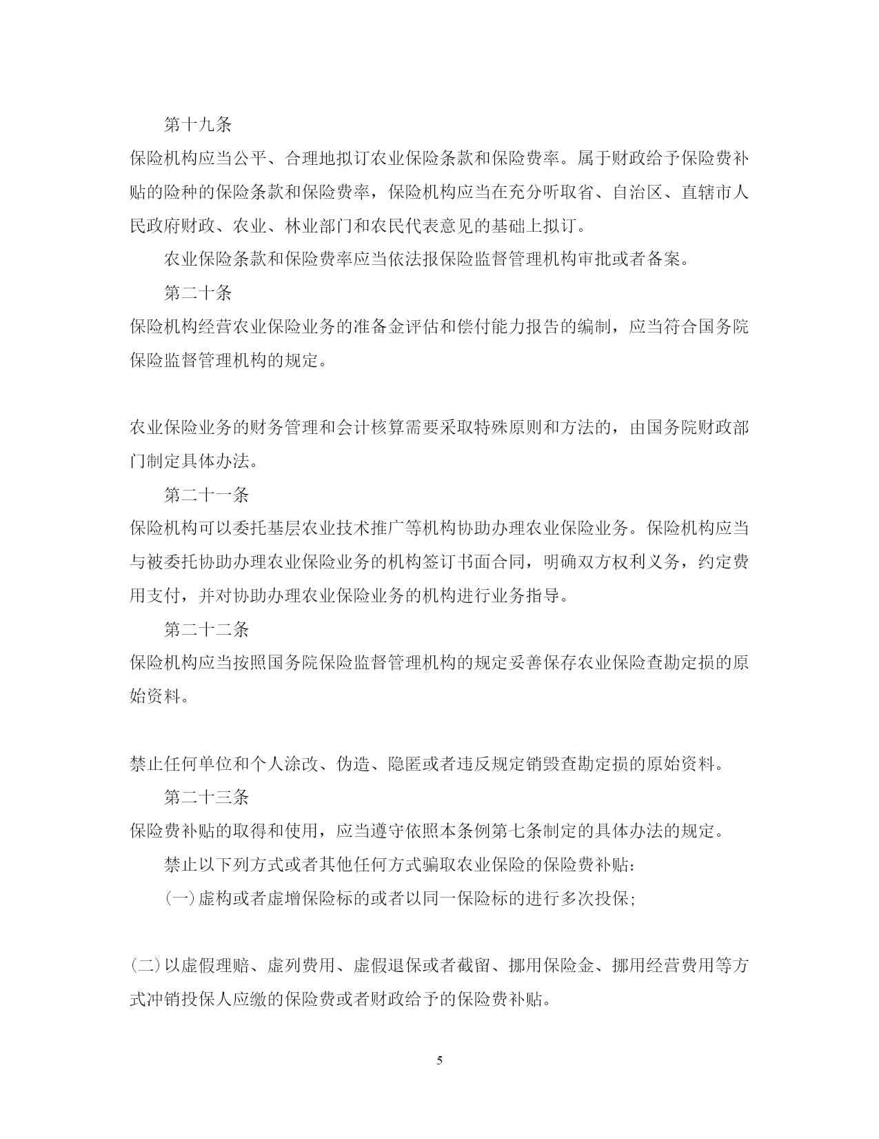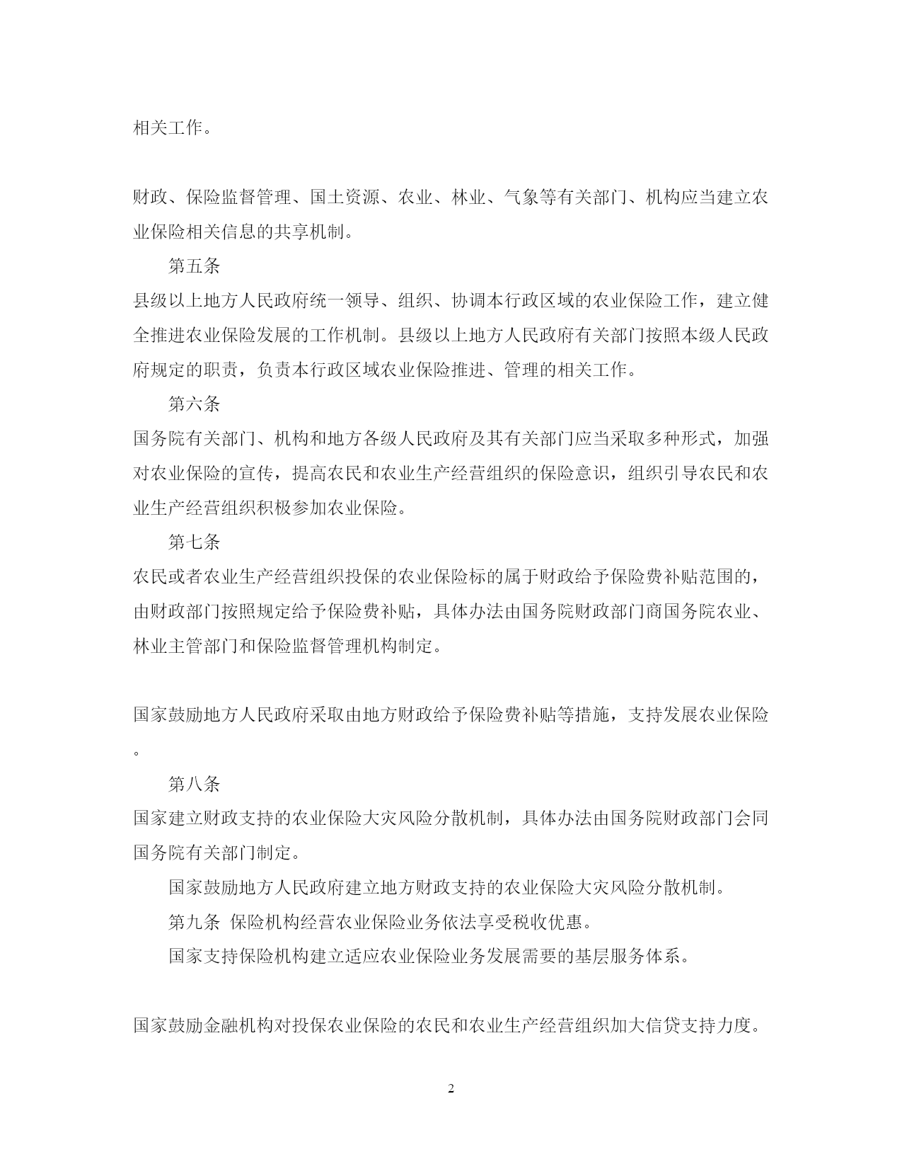此资料由网络收集而来,如有侵权请告知上传者立即删除。资料共分享,我们负责传递知识。PAGEPAGE8农业保险条例为了规范农业保险活动,保护农业保险活动当事人的合法权益,提高农业生产抗风险能力,促进农业保险事业健康发展,根据《中华人民共和国保险法》、《中华人民共和国农业法》等法律,制定农业保险条例。下文是小编收集的农业保险条例,欢迎阅读!!农业保险条例完整版全文第一章总则第一条为了规范农业保险活动,保护农业保险活动当事人的合法权益,提高农业生产抗风险能力,促进农业保险事业健康发展,根据《中华人民共和国保险法》、《中华人民共和国农业法》等法律,制定本条例。第二条本条例所称农业保险,是指保险机构根据农业保险合同,对被保险人在种植业、林业、畜牧业和渔业生产中因保险标的遭受约定的自然灾害、意外事故、疫病、疾病等保险事故所造成的财产损失,承担赔偿保险金责任的保险活动。本条例所称保险机构,是指保险公司以及依法设立的农业互助保险等保险组织。第三条国家支持发展多种形式的农业保险,健全政策性农业保险制度。农业保险实行政府引导、市场运作、自主自愿和协同推进的原则。省、自治区、直辖市人民政府可以确定适合本地区实际的农业保险经营模式。任何单位和个人不得利用行政权力、职务或者职业便利以及其他方式强迫、限制农民或者农业生产经营组织参加农业保险。第四条国务院保险监督管理机构对农业保险业务实施监督管理。国务院财政、农业、林业、发展改革、税务、民政等有关部门按照各自的职责,负责农业保险推进、管理的相关工作。财政、保险监督管理、国土资源、农业、林业、气象等有关部门、机构应当建立农业保险相关信息的共享机制。第五条县级以上地方人民政府统一领导、组织、协调本行政区域的农业保险工作,建立健全推进农业保险发展的工作机制。县级以上地方人民政府有关部门按照本级人民政府规定的职责,负责本行政区域农业保险推进、管理的相关工作。第六条国务院有关部门、机构和地方各级人民政府及其有关部门应当采取多种形式,加强对农业保险的宣传,提高农民和农业生产经营组织的保险意识,组织引导农民和农业生产经营组织积极参加农业保险。第七条农民或者农业生产经营组织投保的农业保险标的属于财政给予保险费补贴范围的,由财政部门按照规定给予保险费补贴,具体办法由国务院财政部门商国务院农业、林业主管部门和保险监督管理机构制定。国家鼓励地方人民政府采取由地方财政给予保险费补贴等措施,支持发展农业保险。第八条国家建立财政支持的农业保险大灾风险分散机制,具体办法由国务院财政部门会同国务院有关部门制定。国家鼓励地方人民政府建立地方财政支持的农业保险大灾风险分散机制。第九条保险机构经营农业保险业务依法享受税收优惠。国家支持保险机构建立适应农业保险业务发展需要的基层服务体系。国家鼓励金融机构对投保农业保险的农民和农业生产经营组织加大信贷支持力度。第二章农业保险合同第十条农业保险可以由农民、农业生产经营组织自行投保,也可以由农业生产经营组织、村民委员会等单位组织农民投保。由农业生产经营组织、村民委员会等单位组织农民投保的,保险机构应当在订立农业保险合同时,制定投保清单,详细列明被保险人的投保信息,并由被保险人签字确认。保险机构应当将承保情况予以公示。第十一条在农业保险合同有效期内,合同当事人不得因保险标的的危险程度发生变化增加保险费或者解除农业保险合同。第十二条保险机构接到发生保险事故的通知后,应当及时进行现场查勘,会同被保险人核定保险标的的受损情况。由农业生产经营组织、村民委员会等单位组织农民投保的,保险机构应当将查勘定损结果予以公示。保险机构按照农业保险合同约定,可以采取抽样方式或者其他方式核定保险标的的损失程度。采用抽样方式核定损失程度的,应当符合有关部门规定的抽样技术规范。第十三条法律、行政法规对受损的农业保险标的的处理有规定的,理赔时应当取得受损保险标的已依法处理的证据或者证明材料。保险机构不得主张对受损的保险标的残余价值的权利,农业保险合同另有约定的除外。第十四条保险机构应当在与被保险人达成赔偿协议后10日内,将应赔偿的保险金支付给被保险人。农业保险合同对赔偿保险金的期限有约定的,保险机构应当按照约定履行赔偿保险金义务。第十五条保险机构应当按照农业保险合同约定,根据核定的保险标的的损失程度足额支付应赔偿的保险金。任何单位和个人不得非法干预保险机构履行赔偿保险金的义务,不得限制被保险人取得保险金的权利。农业生产经营组织、村民委员会等单位组织农民投保的,理赔清单应当由被保险人签字确认,保险机构应当将理赔结果予以公示。第十六条本条例对农业保险合同未作规定的,参照适用《中华人民共和国保险法》中保险合同的有关规定。第三章经营规则第十七条保险