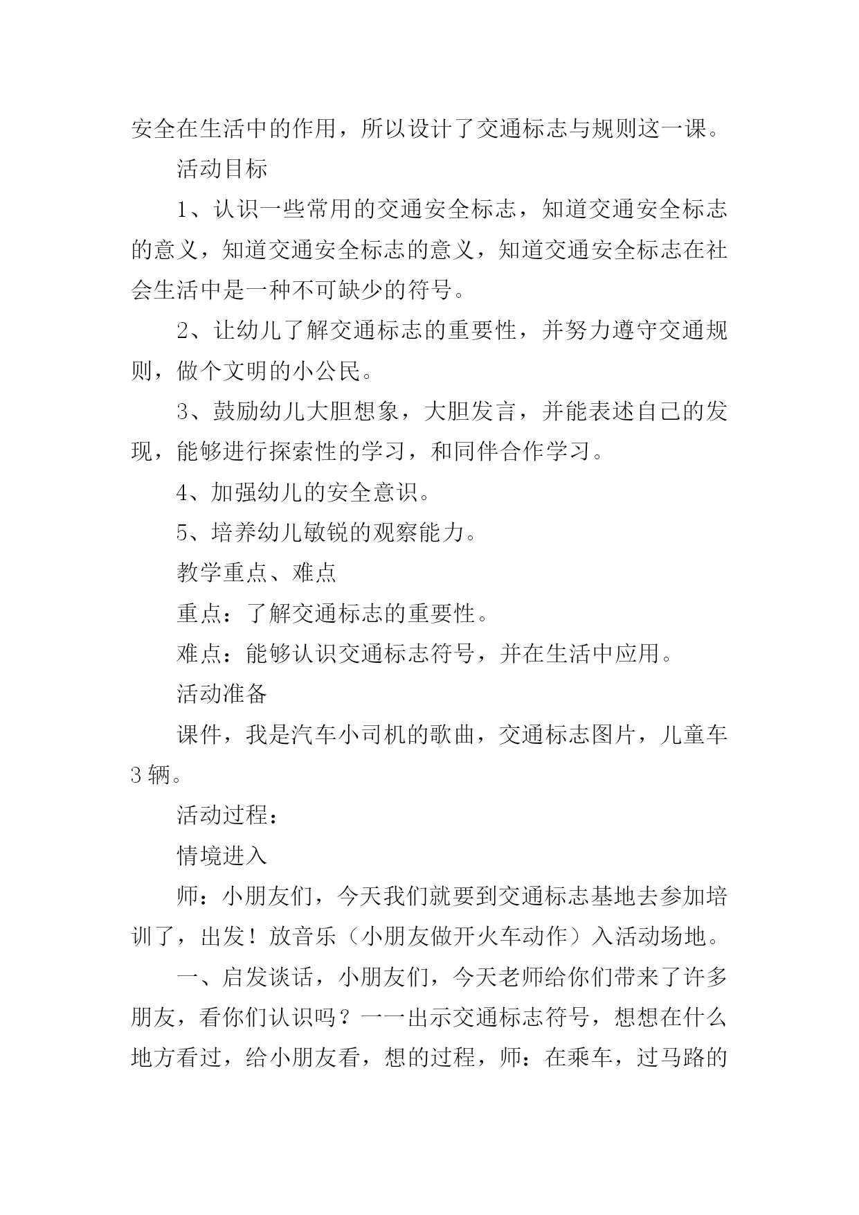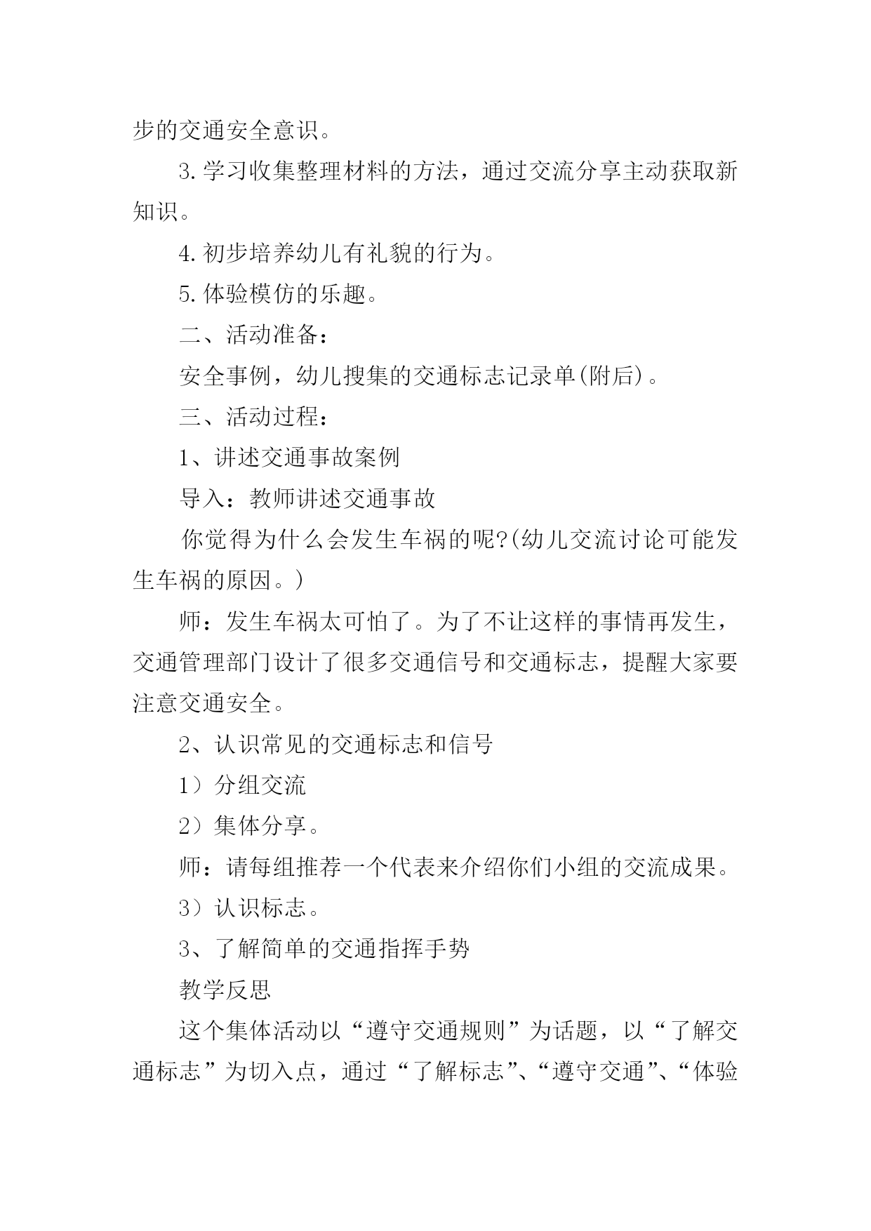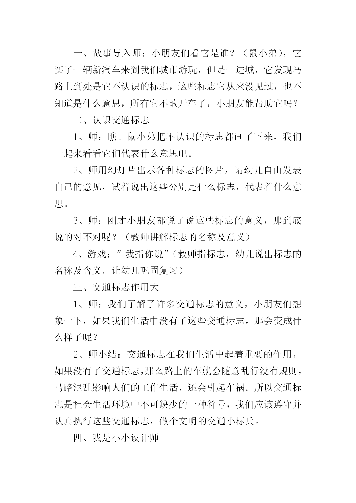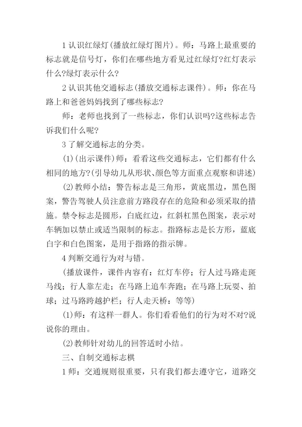 幼儿园大班教案《交通标志》幼儿园大班教案《交通标志》1活动目标1尝试了解各种不同的交通标志图,能用完整、流畅的语言正确表达它们的含义。2能注意观察生活环境中的交通标志,遵守交通规则。培养自我保护意识和能力。3乐意参加交通游戏棋活动,学会与同伴商量、制定游戏规则,并在活动中遵守游戏规则。活动准备孩子和家长共同收集、了解交通标志;教师收集各种交通标志(或图片),制作教学课件(PIyI’),交通事故的动画视频,自制游戏棋盘4幅、小标志若干、游戏骰子4个、棋子若干(红、黄、蓝、绿汽车4组)等,“文明小司机”奖状若干。活动过程一、视频导入,引发探究欲望1播放交通事故的动画视频。师:刚才你们看到了什么?发生了一件什么事情?(引导幼儿用完整的语言讲述)2师:为什么会发生这样的事情呢?二、播放课件,解读交通标志图师:为了不让刚才看到的惨剧在我们的身边发生,我们应该遵守交通规则。让我们从认识交通标志开始学习交通规则。1认识红绿灯(播放红绿灯图片)。师:马路上最重要的标志就是信号灯,你们在哪些地方看见过红绿灯?红灯表示什么?绿灯表示什么?2认识其他交通标志(播放交通标志课件)。师:你在马路上和爸爸妈妈找到了哪些标志?师:老师也找到了一些标志,你们认识吗?这些标志告诉我们什么呢?3了解交通标志的分类。(1)(出示课件)师:看看这些交通标志,它们都有什么相同的地方?(引导幼儿从形状、颜色等方面重点观察和讲述)(2)教师小结:警告标志是三角形,黄底黑边,黑色图案,警告驾驶人员注意前方路段存在的危险和必须采取的措施。禁令标志是圆形,白底红边,红斜杠黑色图案,表示对车辆加以禁止或适当限制的标志。指路标志是长方形,蓝底白字和白色图案,是用于指路的指示牌。4判断交通行为对与错。(播放课件,课件内容有:红灯车停;行人过马路走斑马线;行人靠左走;在马路上追车奔跑;在马路上玩耍、拍球;过马路跨越护栏;行人走天桥:等等)(1)师:有这样一群人。你们看看他们的行为对不对?说说你的理由。(2)教师针对幼儿的回答适时小结。三、自制交通标志棋1师:交通规则很重要,只有我们都去遵守它,道路交通才会变得有序,才不会出交通事故。交通标志在我们的生活中起着重要的作用,我们都应该认真服从这些交通标志,现在我们一起来制作交通规则棋。2商讨规则和做法。步骤(1)根据图片的情境,配对相应的标志图。如:图一是红灯车停(配对:注意红绿灯的标志),图二是在马路上追车奔跑(配对:禁止行人通行的标志)。步骤(2)判断图片的行为是否正确,设置相应的游戏规则(用“箭头”和“数字”表示)。如:图一是红灯车停(正确的交通行为可以设置为“3”。表示前进3格),图二是在马路上追车奔跑(不正确的交通行为可以设置为“2”,表示后退2格。)3幼儿分组制作游戏棋,四、棋类游戏活动:我是文明小司机1幼儿自由组合游戏。游戏规则:幼儿4人一组,分别“驾驶”红、黄、蓝、绿小汽车。根据投掷骰子上面的点数和前进或后退的标志图行驶,第一个到达终点的获胜。2教师巡回指导并维持秩序,提醒幼儿遵守游戏规则,并关注能力弱的幼儿,适时指导。3教师评价:对游戏中获胜和规则意识强的幼儿进行表扬,发“文明小司机”奖状。幼儿园大班教案《交通标志》2活动设计背景在日常生活中发现幼儿走路时特别不注意交通安全,在公共场所出现的简单交通安全符合不知道,没有认识到交通安全在生活中的作用,所以设计了交通标志与规则这一课。活动目标1、认识一些常用的交通安全标志,知道交通安全标志的意义,知道交通安全标志的意义,知道交通安全标志在社会生活中是一种不可缺少的符号。2、让幼儿了解交通标志的重要性,并努力遵守交通规则,做个文明的小公民。3、鼓励幼儿大胆想象,大胆发言,并能表述自己的发现,能够进行探索性的学习,和同伴合作学习。4、加强幼儿的安全意识。5、培养幼儿敏锐的观察能力。教学重点、难点重点:了解交通标志的重要性。难点:能够认识交通标志符号,并在生活中应用。活动准备课件,我是汽车小司机的歌曲,交通标志图片,儿童车3辆。活动过程:情境进入师:小朋友们,今天我们就要到交通标志基地去参加培训了,出发!放音乐(小朋友做开火车动作)入活动场地。一、启发谈话,小朋友们,今天老师给你们带来了许多朋友,看你们认识吗?一一出示交通标志符号,想想在什么地方看过,给小朋友看,想的过程,师:在乘车,过马路的时候就会看到这些朋友,那老师告诉你们他们有一个共同的名字叫交通标志,今天老师就和小朋友们一起来学习交通标志与规则。二、探究学习讲解三个图,信号灯,停车场,禁止鸣喇叭告诉小朋友怎么用。师:小朋友学得真认真,那老师就领你们到马路上看一看,看到了什么?出示课件,让小朋友观察,老师这有斑马线,注意行