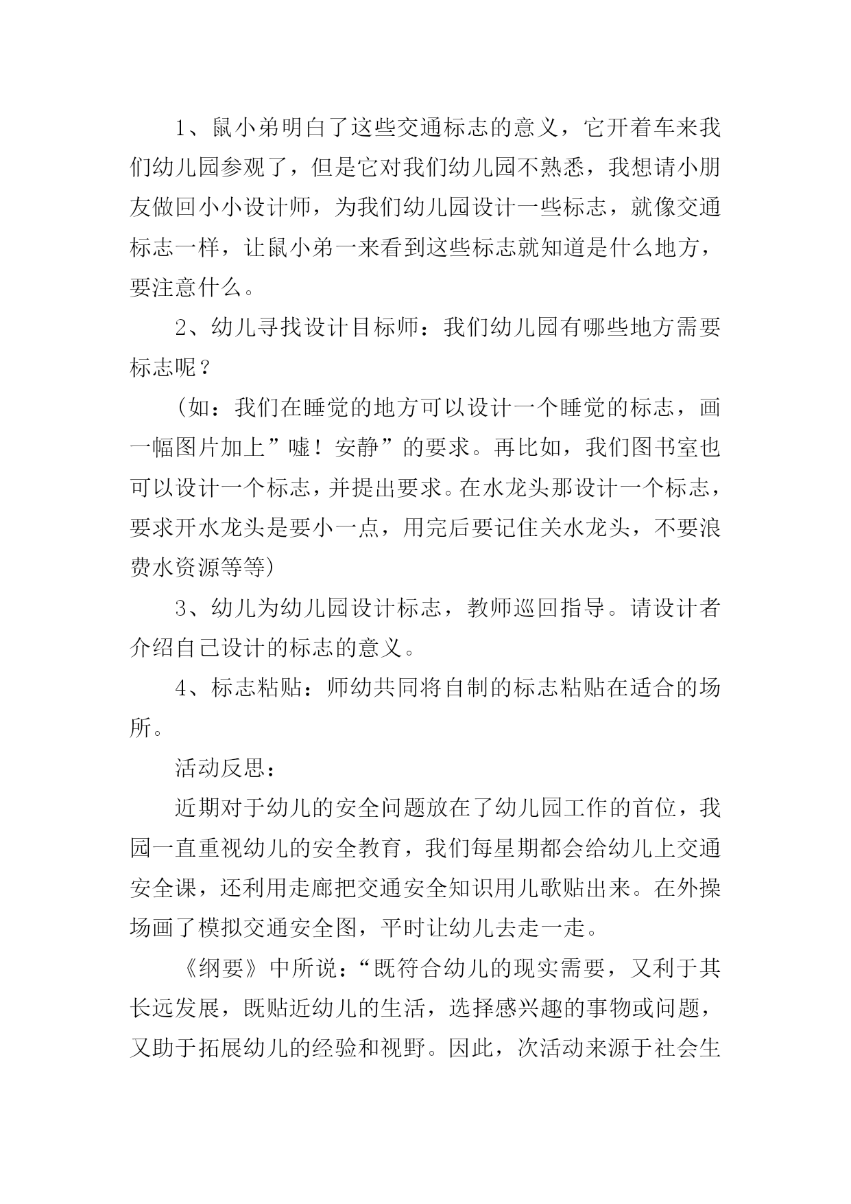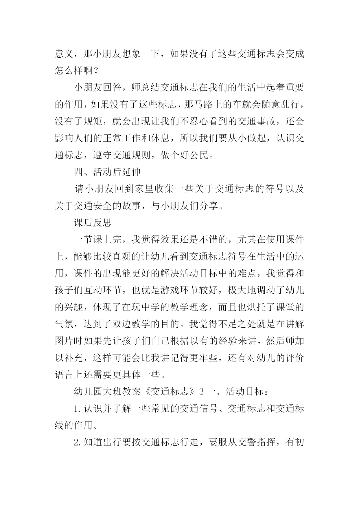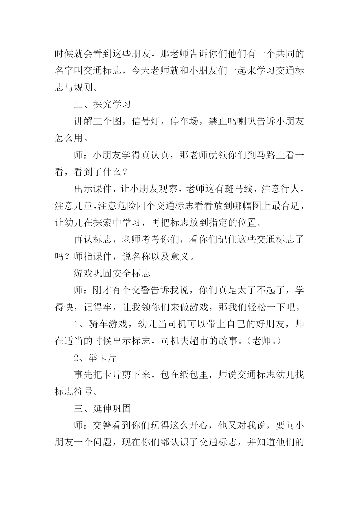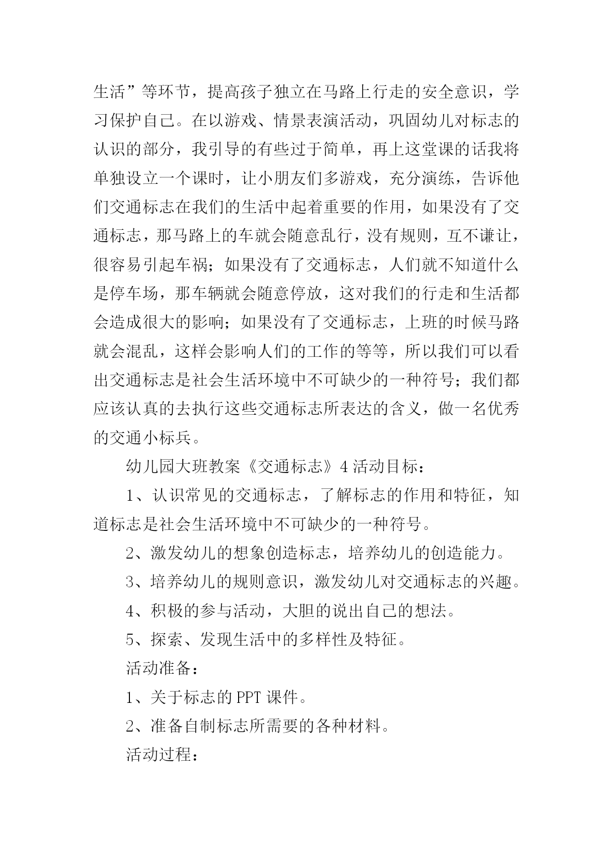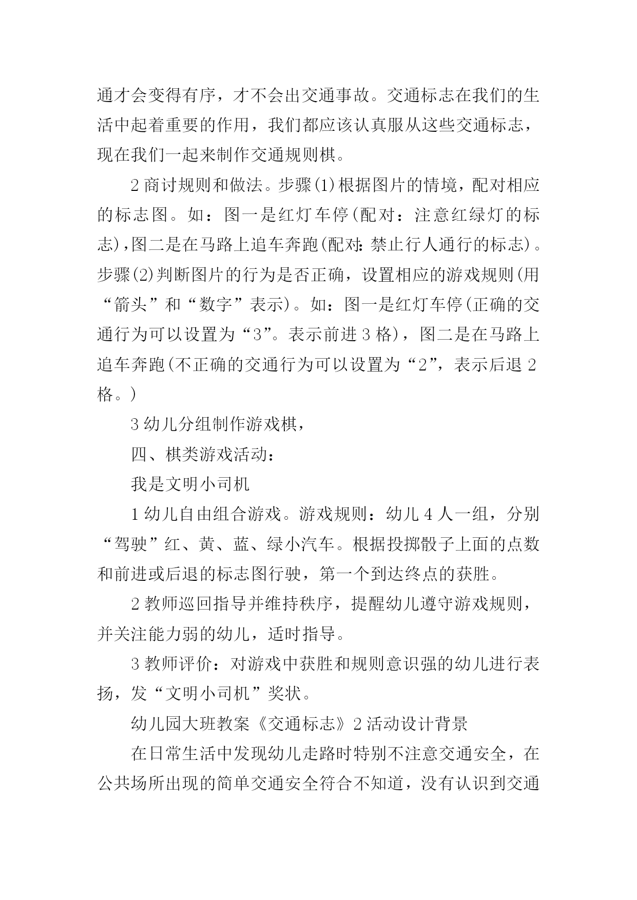 幼儿园大班教案《交通标志》幼儿园大班教案《交通标志》1活动目标1尝试了解各种不同的交通标志图,能用完整、流畅的语言正确表达它们的含义。2能注意观察生活环境中的交通标志,遵守交通规则。培养自我保护意识和能力。3乐意参加交通游戏棋活动,学会与同伴商量、制定游戏规则,并在活动中遵守游戏规则。活动准备孩子和家长共同收集、了解交通标志;教师收集各种交通标志(或图片),制作教学课件(PIyI’),交通事故的动画视频,自制游戏棋盘4幅、小标志若干、游戏骰子4个、棋子若干(红、黄、蓝、绿汽车4组)等,“文明小司机”奖状若干。活动过程一、视频导入,引发探究欲望1播放交通事故的动画视频。师:刚才你们看到了什么?发生了一件什么事情?(引导幼儿用完整的语言讲述)2师:为什么会发生这样的事情呢?二、播放课件,解读交通标志图师:为了不让刚才看到的惨剧在我们的身边发生,我们应该遵守交通规则。让我们从认识交通标志开始学习交通规则。1认识红绿灯(播放红绿灯图片)。师:马路上最重要的标志就是信号灯,你们在哪些地方看见过红绿灯?红灯表示什么?绿灯表示什么?2认识其他交通标志(播放交通标志课件)。师:你在马路上和爸爸妈妈找到了哪些标志?师:老师也找到了一些标志,你们认识吗?这些标志告诉我们什么呢?3了解交通标志的分类。(1)(出示课件)师:看看这些交通标志,它们都有什么相同的地方?(引导幼儿从形状、颜色等方面重点观察和讲述)(2)教师小结:警告标志是三角形,黄底黑边,黑色图案,警告驾驶人员注意前方路段存在的危险和必须采取的措施。禁令标志是圆形,白底红边,红斜杠黑色图案,表示对车辆加以禁止或适当限制的标志。指路标志是长方形,蓝底白字和白色图案,是用于指路的指示牌。4判断交通行为对与错。(播放课件,课件内容有:红灯车停;行人过马路走斑马线;行人靠左走;在马路上追车奔跑;在马路上玩耍、拍球;过马路跨越护栏;行人走天桥:等等)(1)师:有这样一群人。你们看看他们的行为对不对?说说你的理由。(2)教师针对幼儿的回答适时小结。三、自制交通标志棋1师:交通规则很重要,只有我们都去遵守它,道路交通才会变得有序,才不会出交通事故。交通标志在我们的生活中起着重要的作用,我们都应该认真服从这些交通标志,现在我们一起来制作交通规则棋。2商讨规则和做法。步骤(1)根据图片的情境,配对相应的标志图。如:图一是红灯车停(配对:注意红绿灯的标志),图二是在马路上追车奔跑(配对:禁止行人通行的标志)。步骤(2)判断图片的行为是否正确,设置相应的游戏规则(用“箭头”和“数字”表示)。如:图一是红灯车停(正确的交通行为可以设置为“3”。表示前进3格),图二是在马路上追车奔跑(不正确的交通行为可以设置为“2”,表示后退2格。)3幼儿分组制作游戏棋,四、棋类游戏活动:我是文明小司机1幼儿自由组合游戏。游戏规则:幼儿4人一组,分别“驾驶”红、黄、蓝、绿小汽车。根据投掷骰子上面的点数和前进或后退的标志图行驶,第一个到达终点的获胜。2教师巡回指导并维持秩序,提醒幼儿遵守游戏规则,并关注能力弱的幼儿,适时指导。3教师评价:对游戏中获胜和规则意识强的幼儿进行表扬,发“文明小司机”奖状。幼儿园大班教案《交通标志》2活动设计背景在日常生活中发现幼儿走路时特别不注意交通安全,在公共场所出现的简单交通安全符合不知道,没有认识到交通安全在生活中的作用,所以设计了交通标志与规则这一课。活动目标1、认识一些常用的交通安全标志,知道交通安全标志的意义,知道交通安全标志的意义,知道交通安全标志在社会生活中是一种不可缺少的符号。2、让幼儿了解交通标志的重要性,并努力遵守交通规则,做个文明的小公民。3、鼓励幼儿大胆想象,大胆发言,并能表述自己的发现,能够进行探索性的学习,和同伴合作学习。4、加强幼儿的安全意识。5、培养幼儿敏锐的观察能力。教学重点、难点重点:了解交通标志的重要性。难点:能够认识交通标志符号,并在生活中应用。活动准备课件,我是汽车小司机的歌曲,交通标志图片,儿童车3辆。活动过程:情境进入师:小朋友们,今天我们就要到交通标志基地去参加培训了,出发!放音乐(小朋友做开火车动作)入活动场地。一、启发谈话,小朋友们,今天老师给你们带来了许多朋友,看你们认识吗?一一出示交通标志符号,想想在什么地方看过,给小朋友看,想的过程,师:在乘车,过马路的时候就会看到这些朋友,那老师告诉你们他们有一个共同的名字叫交通标志,今天老师就和小朋友们一起来学习交通标志与规则。二、探究学习讲解三个图,信号灯,停车场,禁止鸣喇叭告诉小朋友怎么用。师:小朋友学得真认真,那老师就领你们到马路上看一看,看到了什么?出示课件,让小朋友观察,老师这有斑马线,注意行