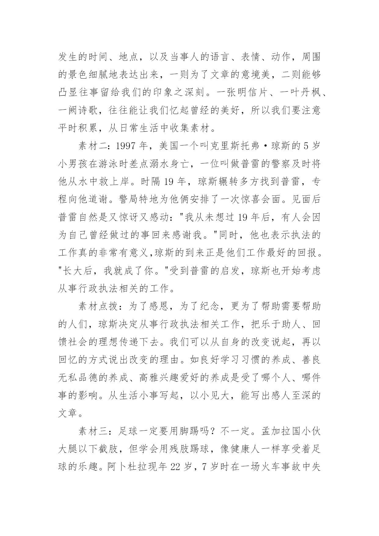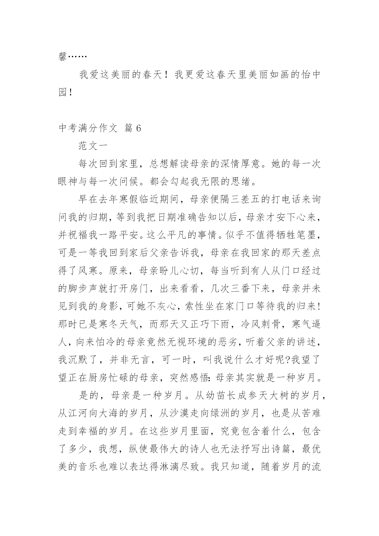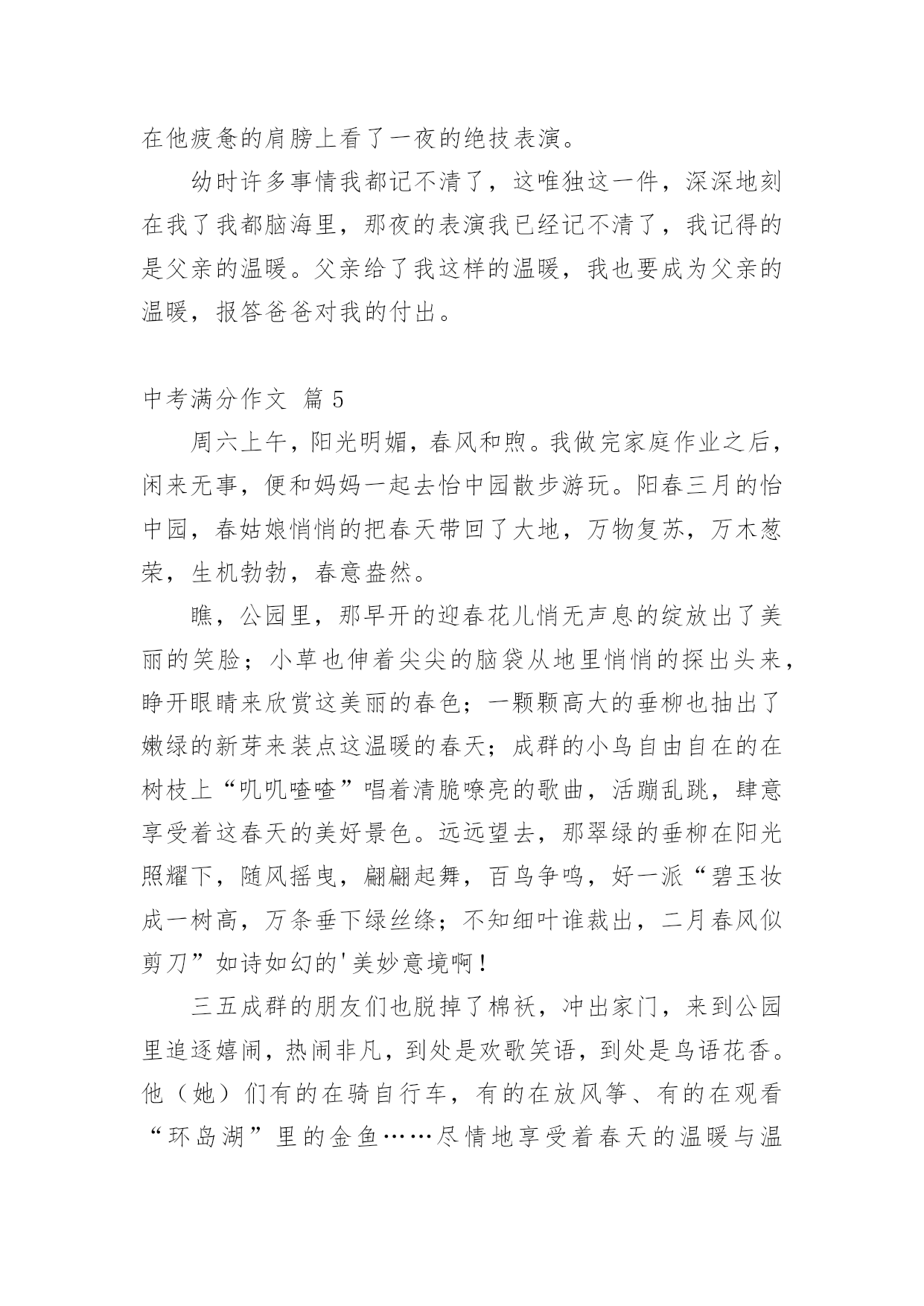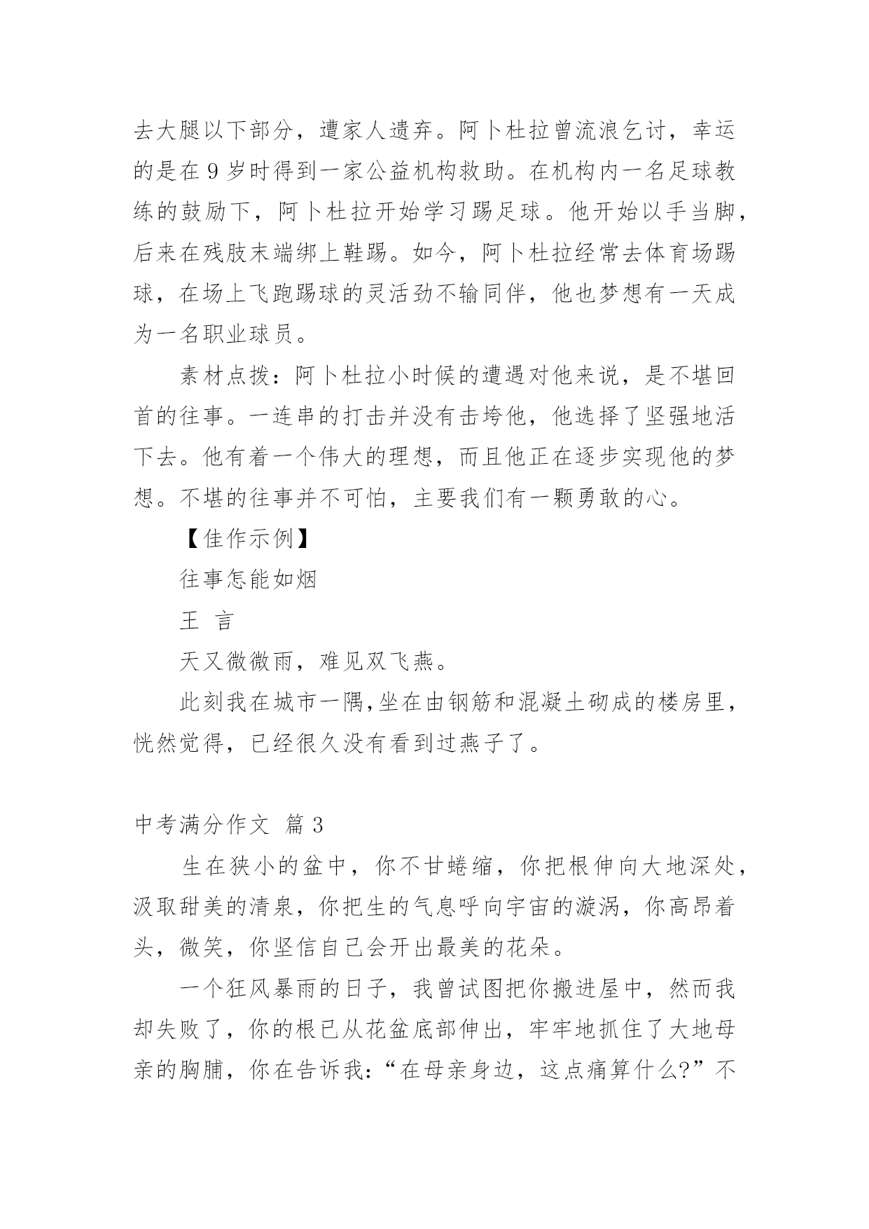 中考满分作文【热门】中考满分作文汇编9篇在日常学习、工作或生活中,大家或多或少都会接触过作文吧,作文要求篇章结构完整,一定要避免无结尾作文的出现。那么问题来了,到底应如何写一篇优秀的作文呢?下面是小编收集整理的中考满分作文9篇,仅供参考,欢迎大家阅读。中考满分作文篇1现如今的人们都生活的很累,因为他们得装,装高雅,装阔,装相,装蒜,但奇怪的是,就是没人装俗。不过说来也是,俗的人是不用装的。有句话不是这样讲吗:俗人本天成,雅者偶得之。俗人的眼界不远,心愿不大,志趣不多,格调不高。但俗人拿得起,放得下,遇到挫折扛得住。由此观之,俗人也是一粒响当当的铜豌豆。俗人的眼,是杂的,俗人的眼,是碎的,俗人的'心,是散的,俗人的精神,是游手好闲的。俗人一年到头辛辛苦苦,勤勤恳恳地去赚钱,但到头来或许连半间厕所都买不下来,但兜里却会揣着一部苹果6。俗人一天到晚规规矩矩地在各自的岗位上各司其职。但也晚回家时也时不时会在网上愤青一把。不要骂俗人,不要说俗人,俗人怎么了?俗人也是不容玷污的!俗人虽不能像屈原,一曲《离骚》传唱古今,但至少不会附庸风雅;俗人虽不能同毛泽东,率领三军平定天下,但至少不会装聋作哑;俗人虽不能有潘安之貌,比西子之容,但至少不会娇柔做作;俗人虽不能同诸葛先生一般,与君主畅聊隆中,但至少不会猥自拿捏。俗人活得真性情,故常有大自在。不过俗也不能太过,一过便就成了低级趣味。正如那低俗的,常是庸人;那媚俗的,常是潮人;那恶俗的,常是混人;那卑俗的,常是小人。而且,只要俗人俗得自在,那也常否极泰来地多出了些俗趣。亲见我一俗人大朋友,一不小心在艺术上取得了些许成就,而每当人们称赞褒扬时,他总是很俗俗地说道:这也没什么的,我就一运气好的俗人罢了。而且,再加之被称赞时的不好意思,活脱脱的如一个二八少女出出楼阁。今幸得闲时,细品俗人后,发现,其实低调的俗人更像雅士。中考满分作文篇2【名师题解】题目要求写美好的往事,而且要求写印象深刻的、一直被我们铭记的往事。围绕这一要求作文,才能做到不跑题,不偏题。由题目可以看出,本文可选取的题材十分宽泛、自由,每个人的生活中肯定会有几件挥之不去的往事,会感觉有很多话可以写,有很多事例可以举,因此写起来不会感到吃力。"怎能如烟"其实就是"并不能如烟",作为题目的谓语,陈述说明"往事"虽然已成过去但并没有如烟般消散,而是留下些什么,让我们品味和感悟。在题材的选取上,可以写个人生活,回首往事,追忆童年,抒发对友人、对亲人或者对长辈的感念;可以写名人轶事,阅览明星,解读贤者,抒写对偶像、对榜样的膜拜与沉思;可以追溯历史,以历史人物的人性光芒为火炬,照耀自己在求索的巷道中前行……作文重在抒情,可以写:往事教我们珍惜眼前人,眼前事;往事无论痛苦还是幸福,都是人生一笔宝贵的财富;往事是生命曾经存在过的证明,在往事的陪伴下,让我们走好未来的路。作文重在说理,可以写:我们可以从往事中总结经验和教训,在人生路上继续前行;有些往事可以激励自己,化为人生的动力并建立人生的目标。【推荐素材】素材一:他说这话的时候,正是风和日丽的夏日正午,阳光从翠绿层叠的`高枝上洒下来,森林中有着一层绿玉般的光影,照在每一条曲折的小径上。地上开满了野花,鸟鸣带着怡人的尾音,美丽的森林安详宁静地包围着我们。席慕蓉《胡凡小姐的故事》。素材点拨:这段文字写得非常细腻。我们在写作时,尤其在写这类以叙事或者抒情为主要部分的文章时,最好能把发生的时间、地点,以及当事人的语言、表情、动作,周围的景色细腻地表达出来,一则为了文章的意境美,二则能够凸显往事留给我们的印象之深刻。一张明信片、一叶丹枫、一阙诗歌,往往能让我们忆起曾经的美好,所以我们要注意平时积累,从日常生活中收集素材。素材二:1997年,美国一个叫克里斯托弗·琼斯的5岁小男孩在游泳时差点溺水身亡,一位叫做普雷的警察及时将他从水中救上岸。时隔19年,琼斯辗转多方找到普雷,专程向他道谢。警局特地为他俩安排了一次惊喜会面。见面后普雷自然是又惊讶又感动:"我从未想过19年后,有人会因为自己曾经做过的事回来感谢我。"同时,他也表示执法的工作真的非常有意义,琼斯的到来正是他们工作最好的回报。"长大后,我就成了你。"受到普雷的启发,琼斯也开始考虑从事行政执法相关的工作。素材点拨:为了感恩,为了纪念,更为了帮助需要帮助的人们,琼斯决定从事行政执法相关工作,把乐于助人、回馈社会的理想传递下去。我们可以从自身的改变说起,再以回忆的方式说出改变的理由。如良好学习习惯的养成、善良无私品德的养成、高雅兴趣爱好的养成是受了哪个人、哪件事的影响。从生活小事写起,以小见大,能写出感人至深的文章。素材三:足球一定要用脚踢吗?不一定。孟加拉国小伙大腿以下截肢,但学会用残肢踢球,像健康人一样享受着足球的乐趣。阿卜杜拉现年22岁,7岁时在一场火