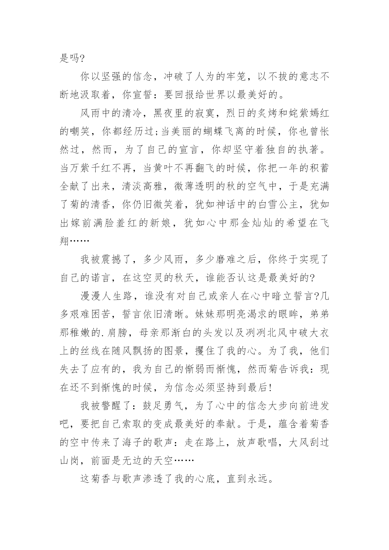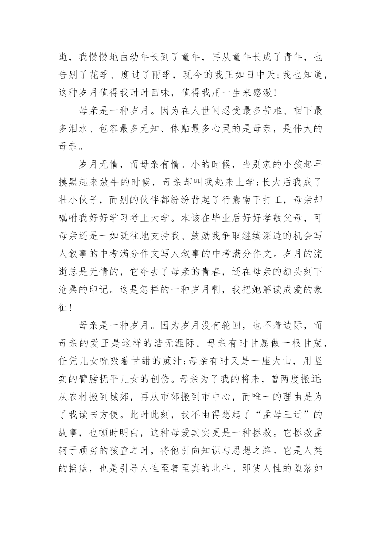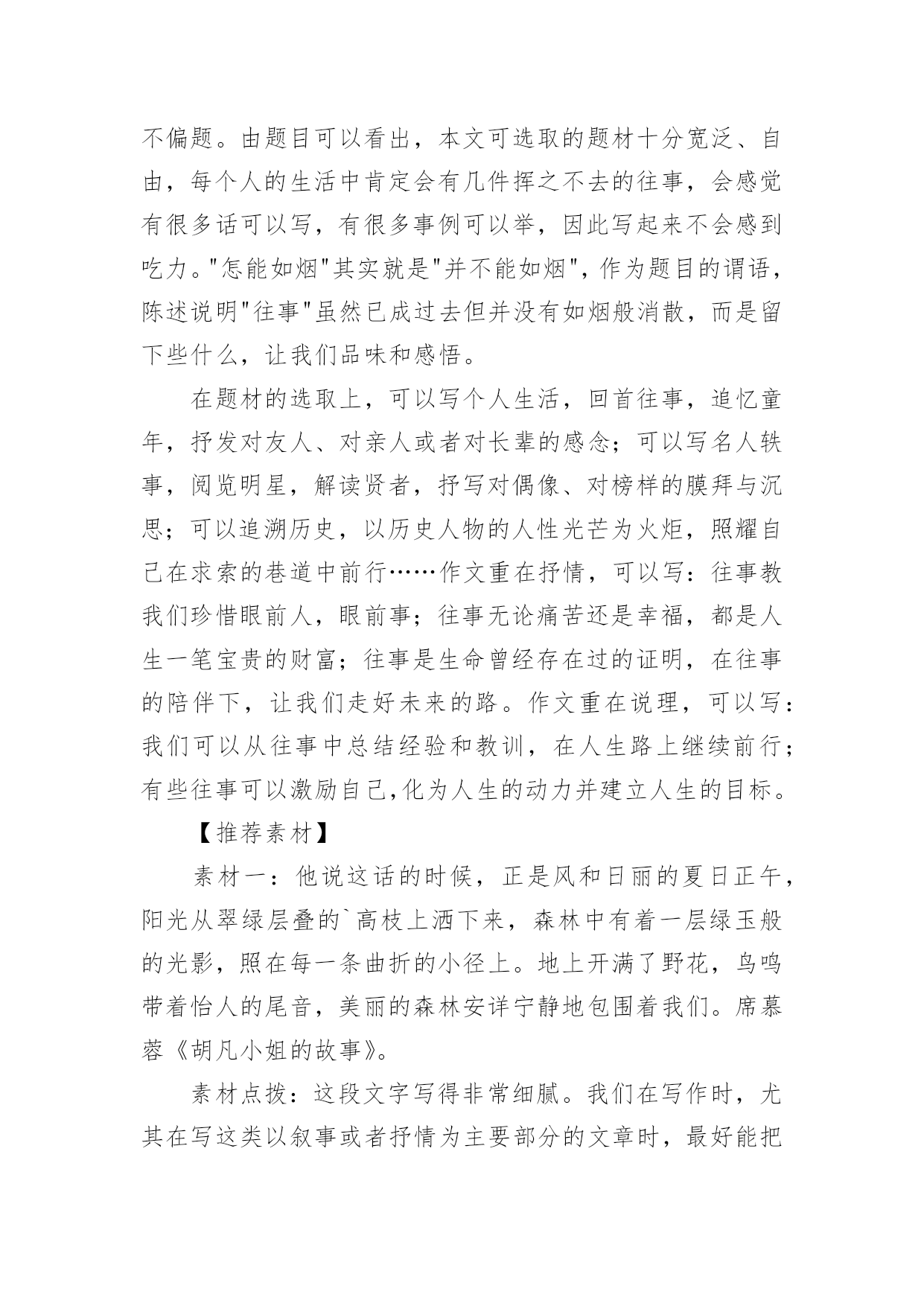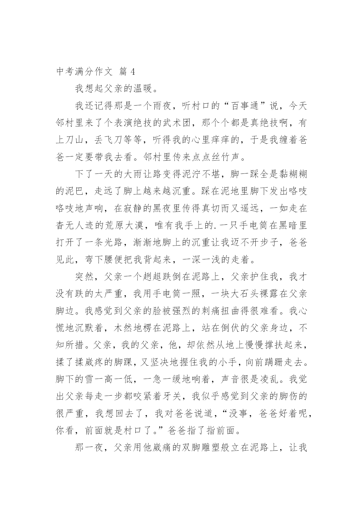 中考满分作文【热门】中考满分作文汇编9篇在日常学习、工作或生活中,大家或多或少都会接触过作文吧,作文要求篇章结构完整,一定要避免无结尾作文的出现。那么问题来了,到底应如何写一篇优秀的作文呢?下面是小编收集整理的中考满分作文9篇,仅供参考,欢迎大家阅读。中考满分作文篇1现如今的人们都生活的很累,因为他们得装,装高雅,装阔,装相,装蒜,但奇怪的是,就是没人装俗。不过说来也是,俗的人是不用装的。有句话不是这样讲吗:俗人本天成,雅者偶得之。俗人的眼界不远,心愿不大,志趣不多,格调不高。但俗人拿得起,放得下,遇到挫折扛得住。由此观之,俗人也是一粒响当当的铜豌豆。俗人的眼,是杂的,俗人的眼,是碎的,俗人的'心,是散的,俗人的精神,是游手好闲的。俗人一年到头辛辛苦苦,勤勤恳恳地去赚钱,但到头来或许连半间厕所都买不下来,但兜里却会揣着一部苹果6。俗人一天到晚规规矩矩地在各自的岗位上各司其职。但也晚回家时也时不时会在网上愤青一把。不要骂俗人,不要说俗人,俗人怎么了?俗人也是不容玷污的!俗人虽不能像屈原,一曲《离骚》传唱古今,但至少不会附庸风雅;俗人虽不能同毛泽东,率领三军平定天下,但至少不会装聋作哑;俗人虽不能有潘安之貌,比西子之容,但至少不会娇柔做作;俗人虽不能同诸葛先生一般,与君主畅聊隆中,但至少不会猥自拿捏。俗人活得真性情,故常有大自在。不过俗也不能太过,一过便就成了低级趣味。正如那低俗的,常是庸人;那媚俗的,常是潮人;那恶俗的,常是混人;那卑俗的,常是小人。而且,只要俗人俗得自在,那也常否极泰来地多出了些俗趣。亲见我一俗人大朋友,一不小心在艺术上取得了些许成就,而每当人们称赞褒扬时,他总是很俗俗地说道:这也没什么的,我就一运气好的俗人罢了。而且,再加之被称赞时的不好意思,活脱脱的如一个二八少女出出楼阁。今幸得闲时,细品俗人后,发现,其实低调的俗人更像雅士。中考满分作文篇2【名师题解】题目要求写美好的往事,而且要求写印象深刻的、一直被我们铭记的往事。围绕这一要求作文,才能做到不跑题,不偏题。由题目可以看出,本文可选取的题材十分宽泛、自由,每个人的生活中肯定会有几件挥之不去的往事,会感觉有很多话可以写,有很多事例可以举,因此写起来不会感到吃力。"怎能如烟"其实就是"并不能如烟",作为题目的谓语,陈述说明"往事"虽然已成过去但并没有如烟般消散,而是留下些什么,让我们品味和感悟。在题材的选取上,可以写个人生活,回首往事,追忆童年,抒发对友人、对亲人或者对长辈的感念;可以写名人轶事,阅览明星,解读贤者,抒写对偶像、对榜样的膜拜与沉思;可以追溯历史,以历史人物的人性光芒为火炬,照耀自己在求索的巷道中前行……作文重在抒情,可以写:往事教我们珍惜眼前人,眼前事;往事无论痛苦还是幸福,都是人生一笔宝贵的财富;往事是生命曾经存在过的证明,在往事的陪伴下,让我们走好未来的路。作文重在说理,可以写:我们可以从往事中总结经验和教训,在人生路上继续前行;有些往事可以激励自己,化为人生的动力并建立人生的目标。【推荐素材】素材一:他说这话的时候,正是风和日丽的夏日正午,阳光从翠绿层叠的`高枝上洒下来,森林中有着一层绿玉般的光影,照在每一条曲折的小径上。地上开满了野花,鸟鸣带着怡人的尾音,美丽的森林安详宁静地包围着我们。席慕蓉《胡凡小姐的故事》。素材点拨:这段文字写得非常细腻。我们在写作时,尤其在写这类以叙事或者抒情为主要部分的文章时,最好能把发生的时间、地点,以及当事人的语言、表情、动作,周围的景色细腻地表达出来,一则为了文章的意境美,二则能够凸显往事留给我们的印象之深刻。一张明信片、一叶丹枫、一阙诗歌,往往能让我们忆起曾经的美好,所以我们要注意平时积累,从日常生活中收集素材。素材二:1997年,美国一个叫克里斯托弗·琼斯的5岁小男孩在游泳时差点溺水身亡,一位叫做普雷的警察及时将他从水中救上岸。时隔19年,琼斯辗转多方找到普雷,专程向他道谢。警局特地为他俩安排了一次惊喜会面。见面后普雷自然是又惊讶又感动:"我从未想过19年后,有人会因为自己曾经做过的事回来感谢我。"同时,他也表示执法的工作真的非常有意义,琼斯的到来正是他们工作最好的回报。"长大后,我就成了你。"受到普雷的启发,琼斯也开始考虑从事行政执法相关的工作。素材点拨:为了感恩,为了纪念,更为了帮助需要帮助的人们,琼斯决定从事行政执法相关工作,把乐于助人、回馈社会的理想传递下去。我们可以从自身的改变说起,再以回忆的方式说出改变的理由。如良好学习习惯的养成、善良无私品德的养成、高雅兴趣爱好的养成是受了哪个人、哪件事的影响。从生活小事写起,以小见大,能写出感人至深的文章。素材三:足球一定要用脚踢吗?不一定。孟加拉国小伙大腿以下截肢,但学会用残肢踢球,像健康人一样享受着足球的乐趣。阿卜杜拉现年22岁,7岁时在一场火
