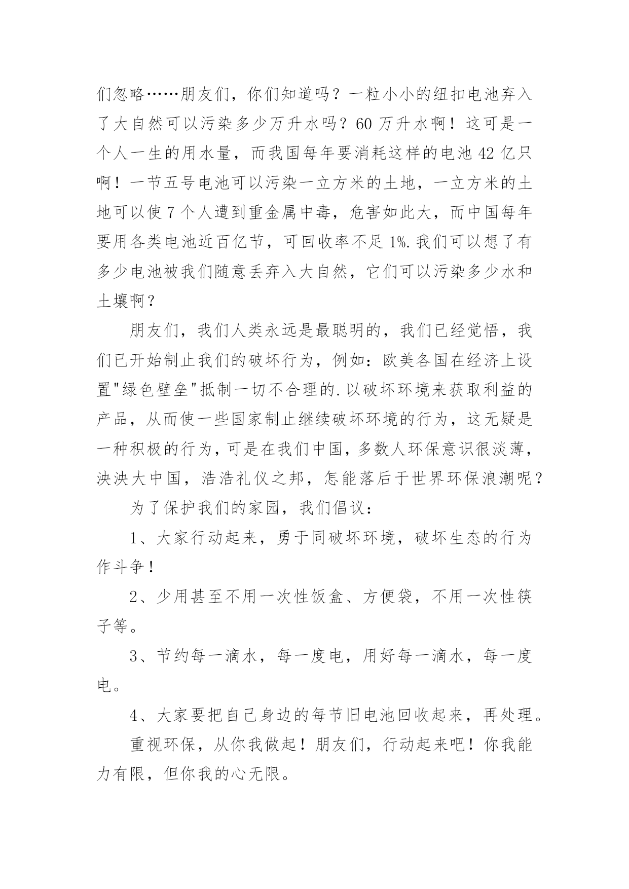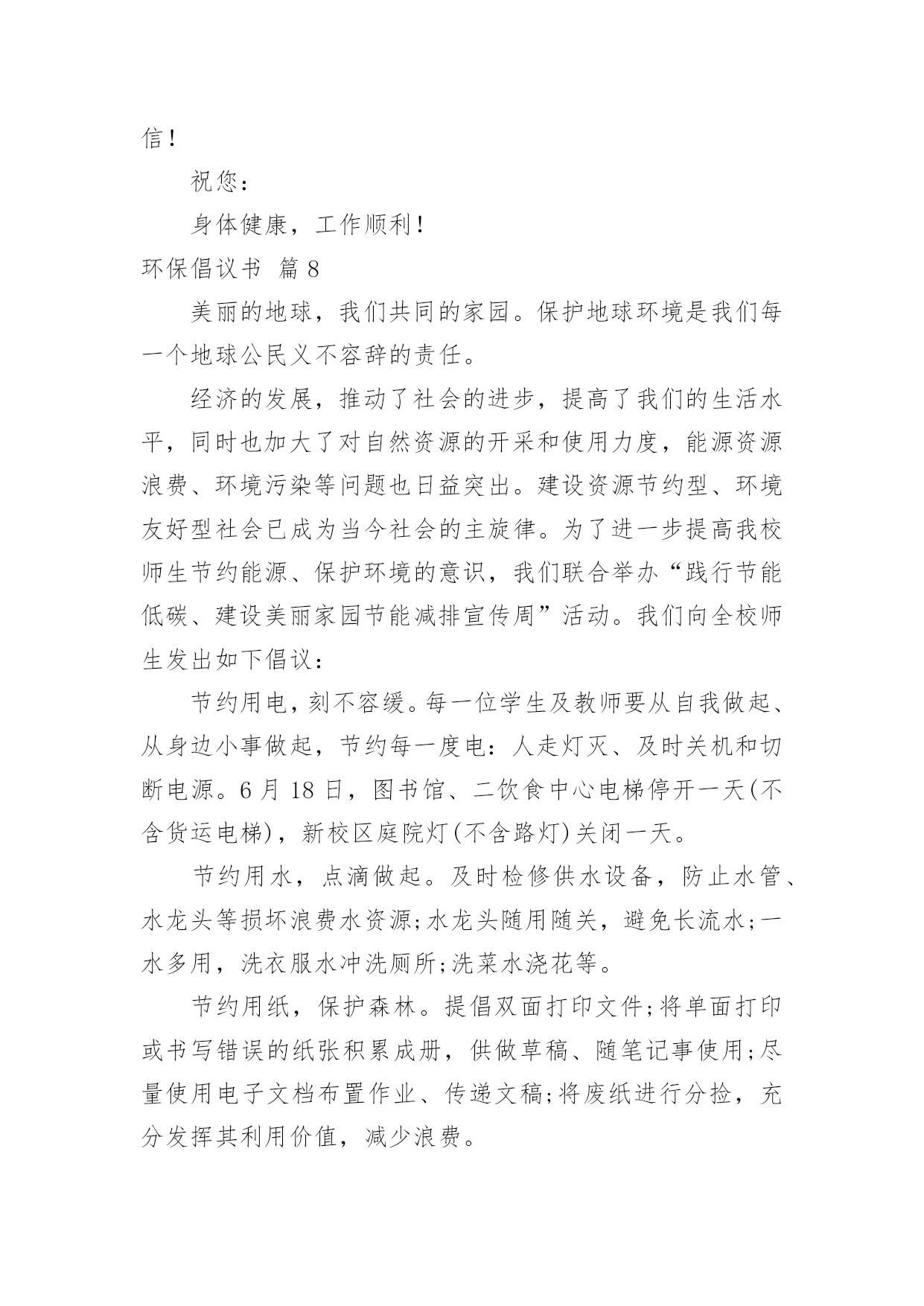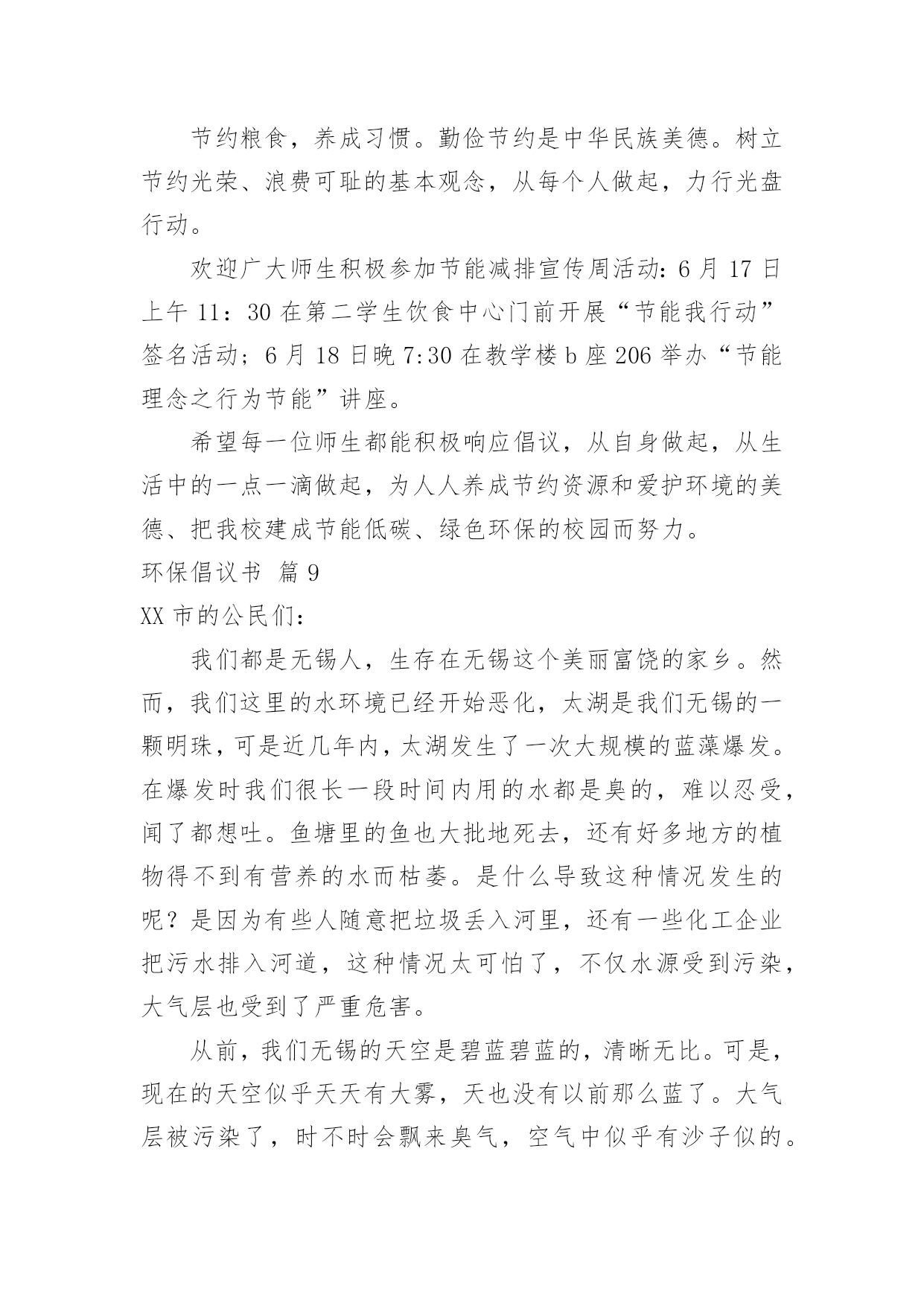 环保倡议书有关环保倡议书汇编9篇环保倡议书篇1亲爱的同学们:目前,广州所有的高校基本都已停用一次性餐具。配合相应的消毒措施,使用可回收餐具(不锈钢餐盘汤匙和筷子),这既能确保真正的卫生和健康,也是大学生良好素质的重要体现。为什么我们要向一次性餐具说"不"呢?一、一次性卫生筷子并不卫生据调查,目前市面上许多一次性筷子根本就没有经过任何消毒,外包装又相当低劣,自然免不了运输过程中的脏上加脏了!二、一次性汤匙也不卫生一次性汤匙同样是消毒不过关,包装也不规范。三、一次性餐具造成巨大的环境破坏据保守统计,我们每人每天至少要用掉两双一次性筷子,全院六千多名学生,那么我们两个月就可以吃掉一个番职院的树木!而树木虽然是可再生资源,其再生周期却长达数年,甚至几十年。至于一次性汤匙造成的白色污染,更是几十年都难消除。我们是不是该认真想想:我们用不用为子孙后代负责?地球,毕竟只有一个!四、一次性餐具造成严重的浪费一些同学用餐时,一次要拿几双筷子、几个汤匙,多余的就随手扔在桌上,这种有目共睹的严重浪费现象让一切有良知的大学生深感痛心!试问:我们有那么多的资源来这样奢侈地浪费吗?现在,在院领导的高度关怀下,经和饭堂负责人多次协商,各饭堂均同意停用一次性餐具,而提供可回收筷子和不锈钢汤匙,并引进先进的红外线高温消毒系统,确保餐具(餐盘、筷子和汤匙)的卫生消毒。众所周知,我院正兴起"素质拓展"和"文明修身"热潮,并取得了累累硕果,当看到其他高校已不再用一次性餐具而代之以可回收汤匙,当看到其他高校的同学用餐后都自觉把餐具送到回收点,我们难道不觉得这是我们的瑕疵吗?同学们,从现在做起,从自身做起,为了真正的健康,让我们一起向一次性餐具大声说:"no"!环保倡议书篇2建议书尊敬的校长:您好。感谢您在百忙之中抽出时间来看这封建议书。我是本校六年级一班的学生。我感谢学校领导老师六年来对我的教育培养。在即将离开母校之际,我想留下一点建议,算是对母校的一点贡献吧。学校教学大楼东边的那个废弃的水泥池子,每当下雨的时候,里面总是积着许多水。其他的时候还好些,一到夏天秋天,水里落进许多树叶,树叶变成腐殖质滋生出大量的孑孓。五、六年级的教室离水池最近,上课的四十分钟里,不知什么时候,同学们就被蚊子叮了。这是些花斑蚊,白天就盯人,被它叮着的地方,总是鼓起一个好大好大的包,非常痒。这个水池归我们六年级两个班的同学打扫。但打扫池里的树叶很麻烦,每周一下午六年级的全体同学一起打扫,也要用一节课的时间。所以,我建议将这个水池用土填满,种上花草。这样,既美化了环境又减少了同学们打扫卫生的辛苦,岂不是一举两得?为了母校的明天更加美好,请您接受我的建议吧!浪小六年一班XXX20xx年10月17日环保倡议书篇3各位同学:你们好!小鸟依旧啼叫,花朵依旧绽放,地球母亲带给我们一个美丽的世界,她是那么的仁慈和宽容,面对母亲无私的仁慈与宽容,我们人类_地球母亲的宠儿,却伤害她最深。生机盎然的森林,倾刻间被肆意的砍伐了;清澈甜爽的泉水,早已变得乌黑恶臭;肆无忌惮的开采,抽取地球母亲的血液……小鸟的啼叫沙哑了,花朵的颜色黯淡了,曾经仁慈、宽容的地球母亲,终于忍耐不住,要惩罚我们_地球的宠儿人类。于是猖獗的沙尘蒙住了我们的眼睛;恶臭的污水,刺激着我们的鼻孔;突如其来的SARS,更是让贪婪的人类措手不及;山体的滑坡,夺去了无辜者的生命;变化无常的"厄尔尼诺"现象,范围和能量都在变大;还有废旧电池的污染一直被我们忽略……朋友们,你们知道吗?一粒小小的纽扣电池弃入了大自然可以污染多少万升水吗?60万升水啊!这可是一个人一生的用水量,而我国每年要消耗这样的电池42亿只啊!一节五号电池可以污染一立方米的土地,一立方米的土地可以使7个人遭到重金属中毒,危害如此大,而中国每年要用各类电池近百亿节,可回收率不足1%.我们可以想了有多少电池被我们随意丢弃入大自然,它们可以污染多少水和土壤啊?朋友们,我们人类永远是最聪明的,我们已经觉悟,我们已开始制止我们的破坏行为,例如:欧美各国在经济上设置"绿色壁垒"抵制一切不合理的.以破坏环境来获取利益的产品,从而使一些国家制止继续破坏环境的行为,这无疑是一种积极的行为,可是在我们中国,多数人环保意识很淡薄,泱泱大中国,浩浩礼仪之邦,怎能落后于世界环保浪潮呢?为了保护我们的家园,我们倡议:1、大家行动起来,勇于同破坏环境,破坏生态的行为作斗争!2、少用甚至不用一次性饭盒、方便袋,不用一次性筷子等。3、节约每一滴水,每一度电,用好每一滴水,每一度电。4、大家要把自己身边的每节旧电池回收起来,再处理。重视环保,从你我做起!朋友们,行动起来吧!你我能力有限,但你我的心无限。环保倡议书篇4环境是我们人类生存的必要条件。在社会发展,科技进步的今天,人们已经越来越重视环保,渴望一个干净,健康,环保