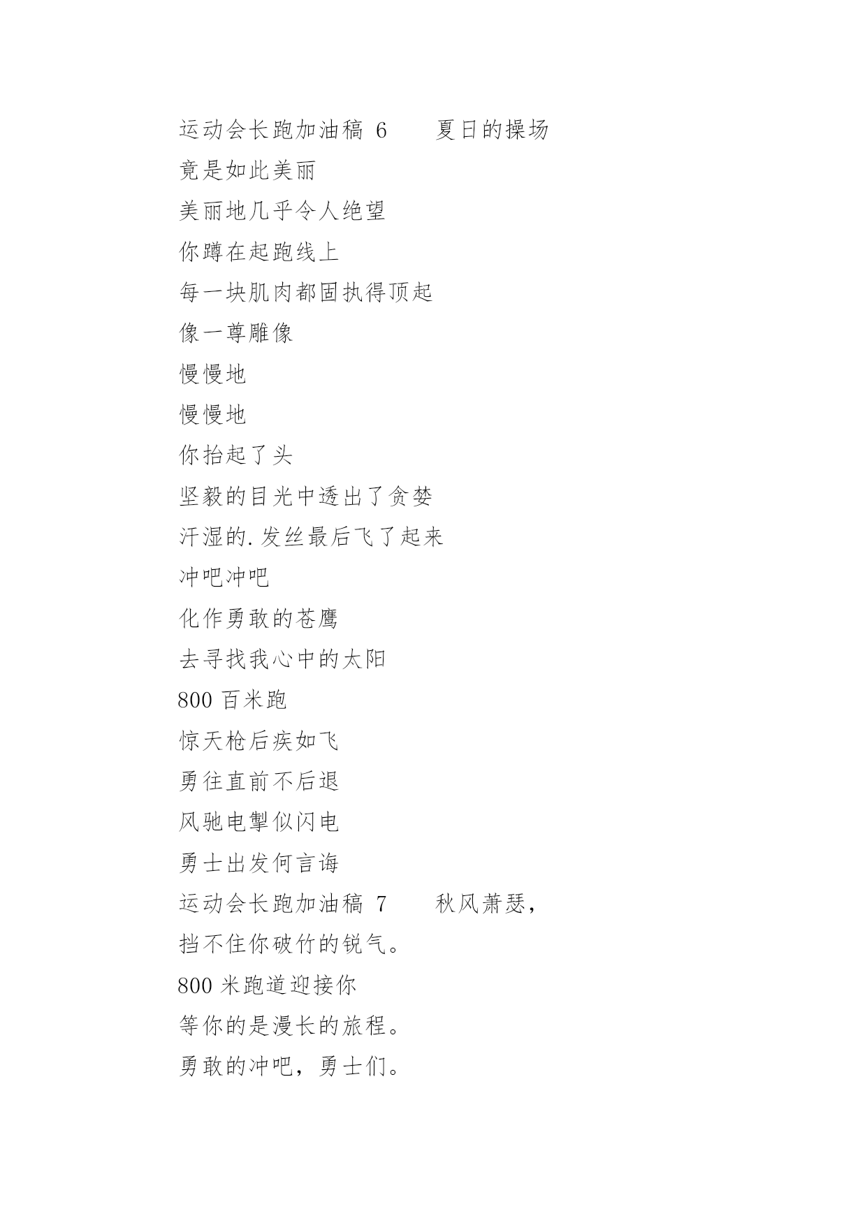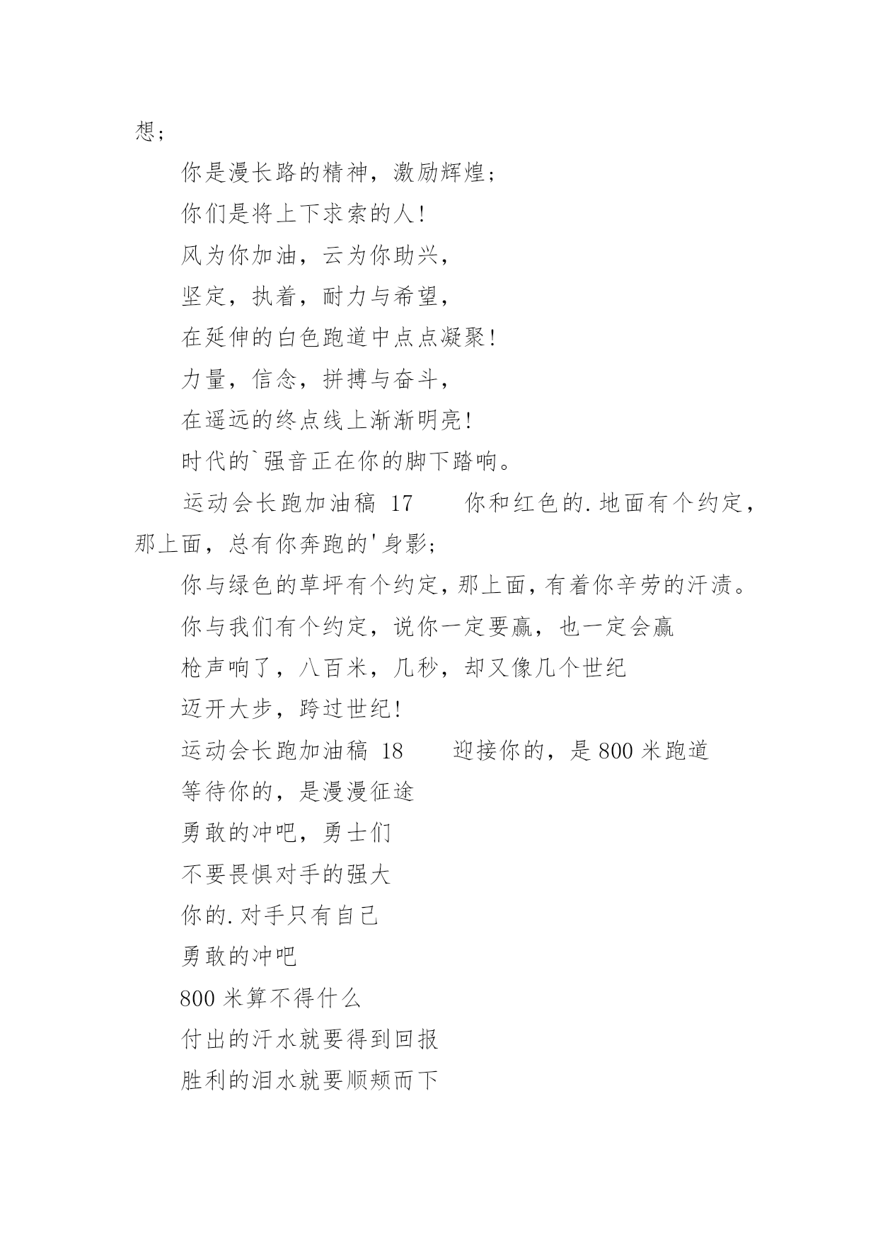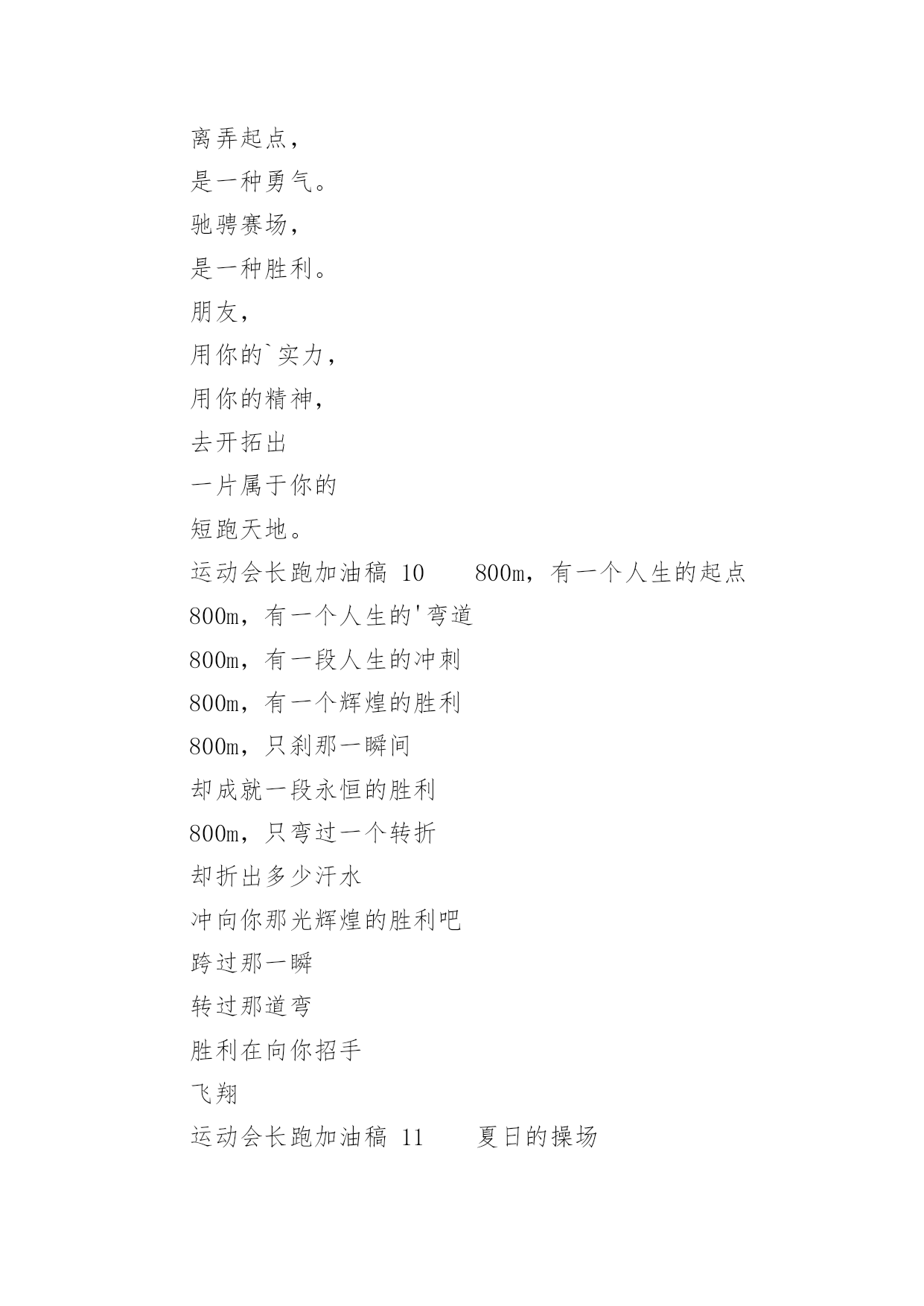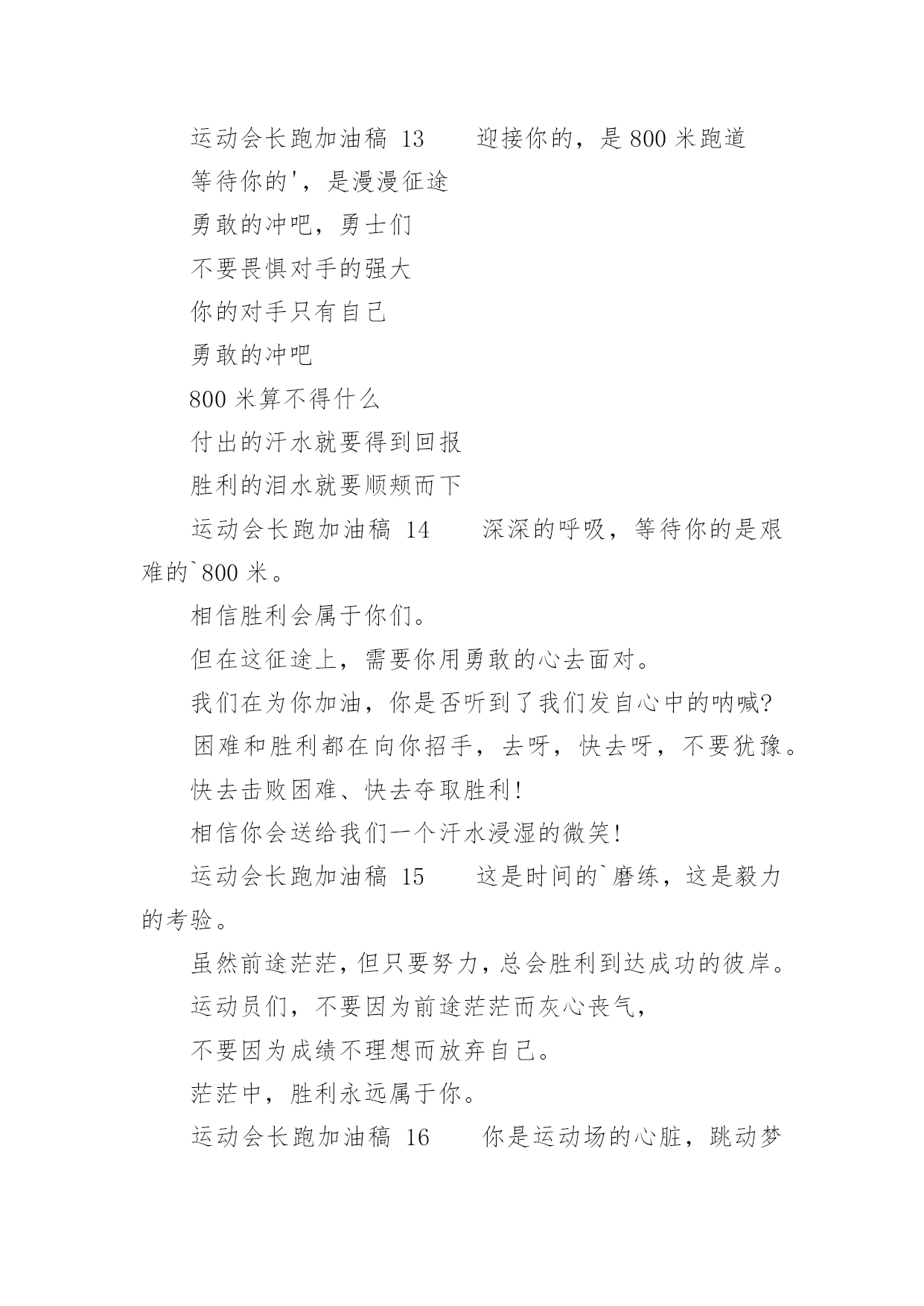 运动会长跑加油稿运动会长跑加油稿(精选18篇)在当今社会生活中,需要使用加油稿的场合越来越多,借助加油稿可以更好地为他人加油打气。那么问题来了,到底应如何写好一份加油稿呢?以下是小编为大家整理的运动会长跑加油稿,希望对大家有所帮助。运动会长跑加油稿1踏上跑道是一种选择奔出起点是一种勇气驰骋赛场是一种骄傲执著坚持是一种胜利……冲黑白相间的跑道,本不美丽。但因有你们,它才焕发光彩,在你们身上,散发出你们青春的`气息。勇敢奔向终点的每一步,都是汗水挥洒的伟大,白色终点线,不管成功或失败。只要挑战自己,就是成功。运动会长跑加油稿2不为掌声的诠释,不为刻意的征服,只有辛勤的汗水化作追求的脚步。心中坚定的信念,脚下沉稳的步伐,你用行动诉说着一个不变的`真理:没有比脚更长的路,没有比人更高的山。希望在终点向你招手,努力吧!用你坚韧不拔的毅志,去迎接终点的鲜花与掌声,相信成功属于你!运动会长跑加油稿3这是时间的磨练,这是毅力的考验。虽然前途茫茫,但只要努力,总会胜利到达成功的彼岸。运动员们,不要因为前途茫茫而灰心丧气,不要因为成绩不理想而放弃自己。茫茫中,胜利永远属于你。风行天下你没有忘记,把闪亮的青春飞扬,你没有忘记,把身姿驰向胜利的方向,风一样的.驰骋,风一样的纵横,不要轻言放弃,因为我们已为青春宣誓——风行天下!运动会长跑加油稿4迎接你的,是800米跑道等待你的,是漫漫征途勇敢的冲吧,勇士们不要畏惧对手的强大你的`对手只有自己勇敢的.冲吧800米算不得什么付出的汗水就要得到回报胜利的泪水就要顺颊而下秋风会为你喝彩阳光会为你庆功掌声就要为你响起运动会长跑加油稿5那雪白的起跑线,凝聚了你数的辛酸与汗水。那800米的跑道对你来说是那么漫长,但你知道:你只有努力去拼搏,去战胜自己!奔跑在赛道的你,请放飞你的'心,释放你的自信。你的眼睛会展现一切,要正视对方。你的英气将会压倒一切,你的对手会在你自信的脚步下败下阵来!既然力量在冲荡,那么不要吝啬,努力地奔跑吧!加油吧,我们将是你的坚强后盾!运动会长跑加油稿6夏日的操场竟是如此美丽美丽地几乎令人绝望你蹲在起跑线上每一块肌肉都固执得顶起像一尊雕像慢慢地慢慢地你抬起了头坚毅的目光中透出了贪婪汗湿的.发丝最后飞了起来冲吧冲吧化作勇敢的苍鹰去寻找我心中的太阳800百米跑惊天枪后疾如飞勇往直前不后退风驰电掣似闪电勇士出发何言诲运动会长跑加油稿7秋风萧瑟,挡不住你破竹的锐气。800米跑道迎接你等你的是漫长的旅程。勇敢的冲吧,勇士们。不要害怕对手的力量,你的对手只有你自己。勇敢的.冲吧!迎接自我,挑战自我,战胜自我!我们相信你能做到。青春的脚步,青春的速度,青春的活力,青春的激情,它将尽情地反映在你身上。加油,终点就在眼前!运动会长跑加油稿8起跑线上你们一字排开健美的肌肉蕴含着爆发力量坚定的目光中充满了自信枪响了你们开始了并不长的征程笔直的.跑道上有你们稳健的足迹不远的终点将留下你们冲刺时矫捷的背影加油吧掌声将为你响起加油吧运动会长跑加油稿9胜利和鲜花终将属于你们致短跑运动员踏上跑道,是一种选择。离弄起点,是一种勇气。驰骋赛场,是一种胜利。朋友,用你的`实力,用你的精神,去开拓出一片属于你的短跑天地。运动会长跑加油稿10800m,有一个人生的起点800m,有一个人生的'弯道800m,有一段人生的冲刺800m,有一个辉煌的胜利800m,只刹那一瞬间却成就一段永恒的胜利800m,只弯过一个转折却折出多少汗水冲向你那光辉煌的胜利吧跨过那一瞬转过那道弯胜利在向你招手飞翔运动会长跑加油稿11夏日的操场竟是如此美丽美丽地几乎令人绝望你蹲在起跑线上每一块肌肉都固执得顶起像一尊雕像慢慢地慢慢地你抬起了头坚毅的目光中透出了贪婪汗湿的.发丝终于飞了起来冲吧冲吧化作勇敢的苍鹰去寻找我心中的太阳运动会长跑加油稿12走过荒山野岭高峡低谷我们在沿途燃起篝火,一站一站的路被抛在身后我们感到疲惫感到困惑。还有那么长的路伸向远方,远方那片星光藏在哪儿远方那颗童话树躲在何处努力吧奋斗吧远方有我们的'理想有我们的希望运动会长跑加油稿13迎接你的,是800米跑道等待你的',是漫漫征途勇敢的冲吧,勇士们不要畏惧对手的强大你的对手只有自己勇敢的冲吧800米算不得什么付出的汗水就要得到回报胜利的泪水就要顺颊而下运动会长跑加油稿14深深的呼吸,等待你的是艰难的`800米。相信胜利会属于你们。但在这征途上,需要你用勇敢的心去面对。我们在为你加油,你是否听到了我们发自心中的呐喊?困难和胜利都在向你招手,去呀,快去呀,不要犹豫。快去击败困难、快去夺取胜利!相信你会送给我们一个汗水浸湿的微笑!运动会长跑加油稿15这是时间的`磨练,这是毅力的考验。虽然前途茫茫,但只要努力,总会胜利到达成功的彼岸。运动员们,不要因为前途茫茫而灰心丧气,不要因为成绩不理想而放弃自己。茫