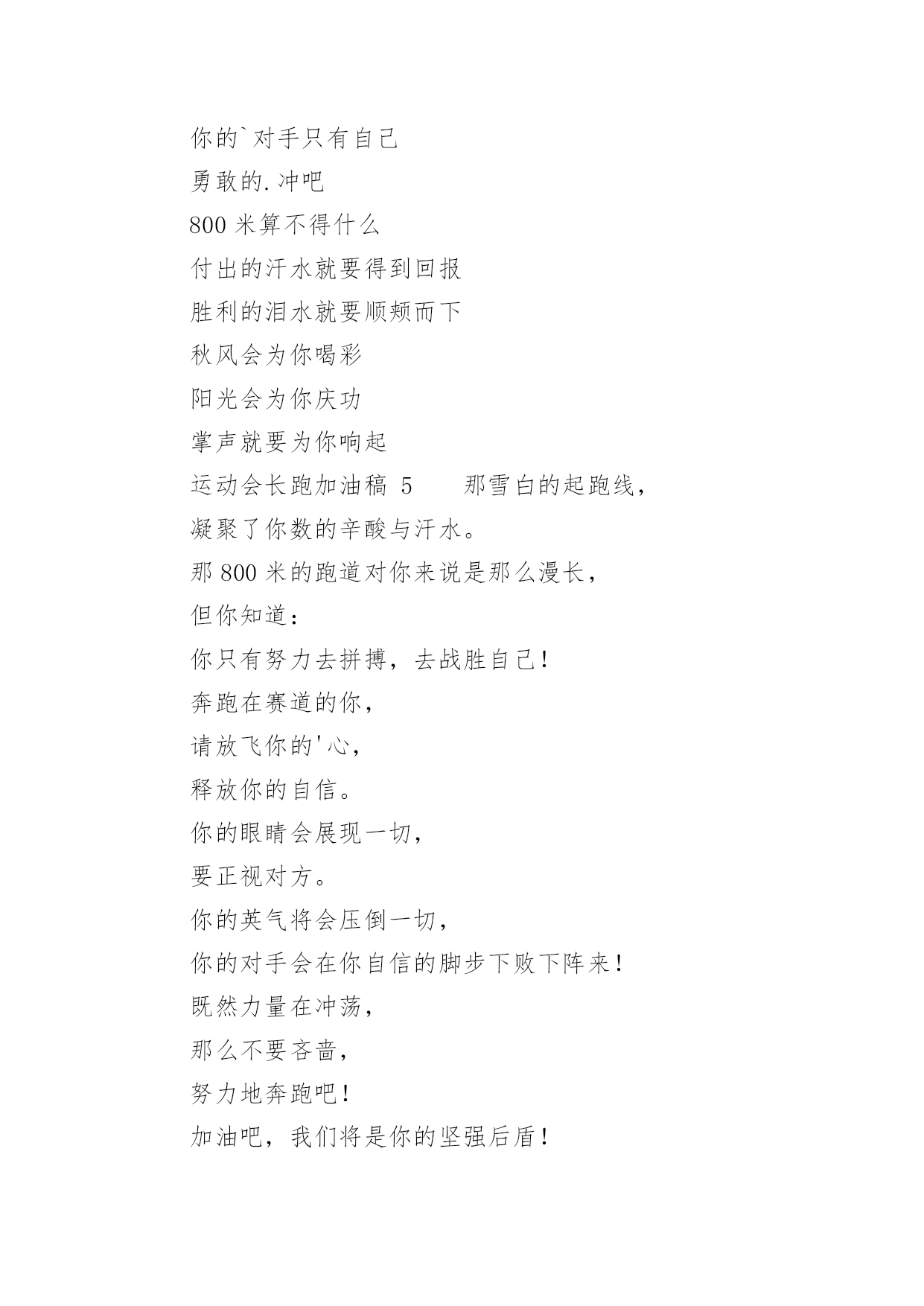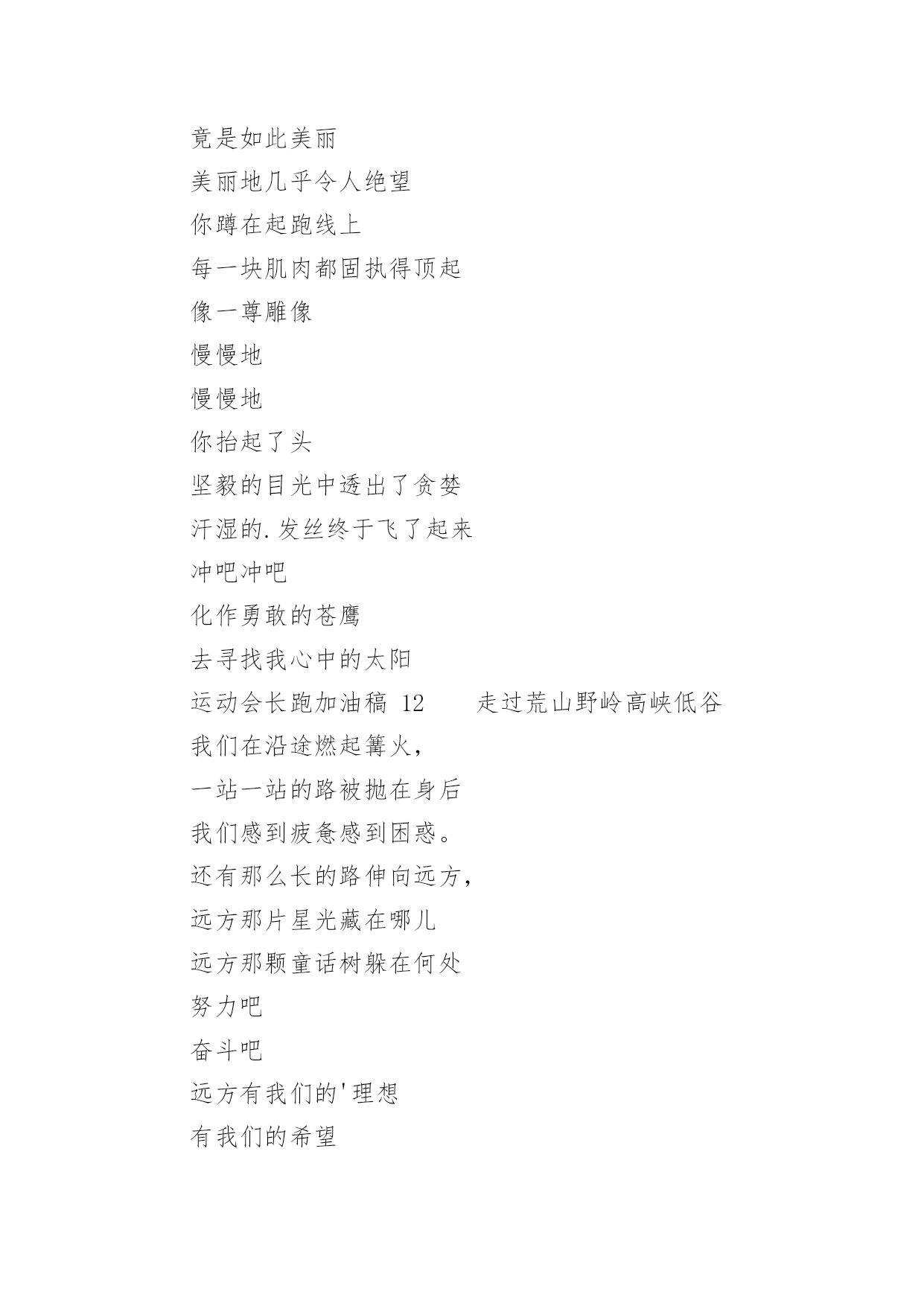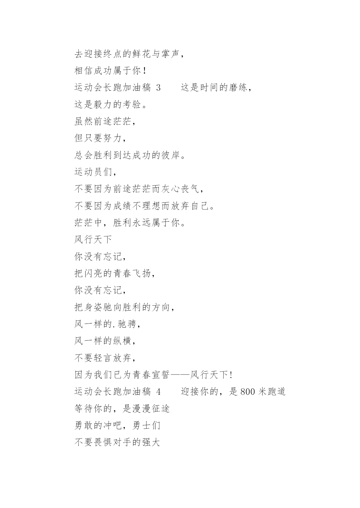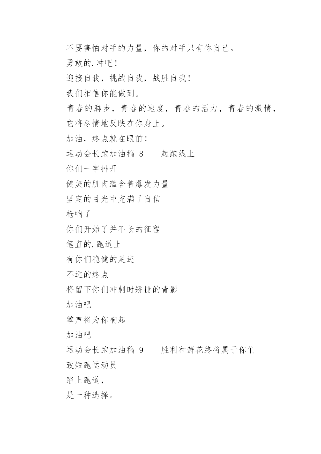 运动会长跑加油稿运动会长跑加油稿(精选18篇)在当今社会生活中,需要使用加油稿的场合越来越多,借助加油稿可以更好地为他人加油打气。那么问题来了,到底应如何写好一份加油稿呢?以下是小编为大家整理的运动会长跑加油稿,希望对大家有所帮助。运动会长跑加油稿1踏上跑道是一种选择奔出起点是一种勇气驰骋赛场是一种骄傲执著坚持是一种胜利……冲黑白相间的跑道,本不美丽。但因有你们,它才焕发光彩,在你们身上,散发出你们青春的`气息。勇敢奔向终点的每一步,都是汗水挥洒的伟大,白色终点线,不管成功或失败。只要挑战自己,就是成功。运动会长跑加油稿2不为掌声的诠释,不为刻意的征服,只有辛勤的汗水化作追求的脚步。心中坚定的信念,脚下沉稳的步伐,你用行动诉说着一个不变的`真理:没有比脚更长的路,没有比人更高的山。希望在终点向你招手,努力吧!用你坚韧不拔的毅志,去迎接终点的鲜花与掌声,相信成功属于你!运动会长跑加油稿3这是时间的磨练,这是毅力的考验。虽然前途茫茫,但只要努力,总会胜利到达成功的彼岸。运动员们,不要因为前途茫茫而灰心丧气,不要因为成绩不理想而放弃自己。茫茫中,胜利永远属于你。风行天下你没有忘记,把闪亮的青春飞扬,你没有忘记,把身姿驰向胜利的方向,风一样的.驰骋,风一样的纵横,不要轻言放弃,因为我们已为青春宣誓——风行天下!运动会长跑加油稿4迎接你的,是800米跑道等待你的,是漫漫征途勇敢的冲吧,勇士们不要畏惧对手的强大你的`对手只有自己勇敢的.冲吧800米算不得什么付出的汗水就要得到回报胜利的泪水就要顺颊而下秋风会为你喝彩阳光会为你庆功掌声就要为你响起运动会长跑加油稿5那雪白的起跑线,凝聚了你数的辛酸与汗水。那800米的跑道对你来说是那么漫长,但你知道:你只有努力去拼搏,去战胜自己!奔跑在赛道的你,请放飞你的'心,释放你的自信。你的眼睛会展现一切,要正视对方。你的英气将会压倒一切,你的对手会在你自信的脚步下败下阵来!既然力量在冲荡,那么不要吝啬,努力地奔跑吧!加油吧,我们将是你的坚强后盾!运动会长跑加油稿6夏日的操场竟是如此美丽美丽地几乎令人绝望你蹲在起跑线上每一块肌肉都固执得顶起像一尊雕像慢慢地慢慢地你抬起了头坚毅的目光中透出了贪婪汗湿的.发丝最后飞了起来冲吧冲吧化作勇敢的苍鹰去寻找我心中的太阳800百米跑惊天枪后疾如飞勇往直前不后退风驰电掣似闪电勇士出发何言诲运动会长跑加油稿7秋风萧瑟,挡不住你破竹的锐气。800米跑道迎接你等你的是漫长的旅程。勇敢的冲吧,勇士们。不要害怕对手的力量,你的对手只有你自己。勇敢的.冲吧!迎接自我,挑战自我,战胜自我!我们相信你能做到。青春的脚步,青春的速度,青春的活力,青春的激情,它将尽情地反映在你身上。加油,终点就在眼前!运动会长跑加油稿8起跑线上你们一字排开健美的肌肉蕴含着爆发力量坚定的目光中充满了自信枪响了你们开始了并不长的征程笔直的.跑道上有你们稳健的足迹不远的终点将留下你们冲刺时矫捷的背影加油吧掌声将为你响起加油吧运动会长跑加油稿9胜利和鲜花终将属于你们致短跑运动员踏上跑道,是一种选择。离弄起点,是一种勇气。驰骋赛场,是一种胜利。朋友,用你的`实力,用你的精神,去开拓出一片属于你的短跑天地。运动会长跑加油稿10800m,有一个人生的起点800m,有一个人生的'弯道800m,有一段人生的冲刺800m,有一个辉煌的胜利800m,只刹那一瞬间却成就一段永恒的胜利800m,只弯过一个转折却折出多少汗水冲向你那光辉煌的胜利吧跨过那一瞬转过那道弯胜利在向你招手飞翔运动会长跑加油稿11夏日的操场竟是如此美丽美丽地几乎令人绝望你蹲在起跑线上每一块肌肉都固执得顶起像一尊雕像慢慢地慢慢地你抬起了头坚毅的目光中透出了贪婪汗湿的.发丝终于飞了起来冲吧冲吧化作勇敢的苍鹰去寻找我心中的太阳运动会长跑加油稿12走过荒山野岭高峡低谷我们在沿途燃起篝火,一站一站的路被抛在身后我们感到疲惫感到困惑。还有那么长的路伸向远方,远方那片星光藏在哪儿远方那颗童话树躲在何处努力吧奋斗吧远方有我们的'理想有我们的希望运动会长跑加油稿13迎接你的,是800米跑道等待你的',是漫漫征途勇敢的冲吧,勇士们不要畏惧对手的强大你的对手只有自己勇敢的冲吧800米算不得什么付出的汗水就要得到回报胜利的泪水就要顺颊而下运动会长跑加油稿14深深的呼吸,等待你的是艰难的`800米。相信胜利会属于你们。但在这征途上,需要你用勇敢的心去面对。我们在为你加油,你是否听到了我们发自心中的呐喊?困难和胜利都在向你招手,去呀,快去呀,不要犹豫。快去击败困难、快去夺取胜利!相信你会送给我们一个汗水浸湿的微笑!运动会长跑加油稿15这是时间的`磨练,这是毅力的考验。虽然前途茫茫,但只要努力,总会胜利到达成功的彼岸。运动员们,不要因为前途茫茫而灰心丧气,不要因为成绩不理想而放弃自己。茫