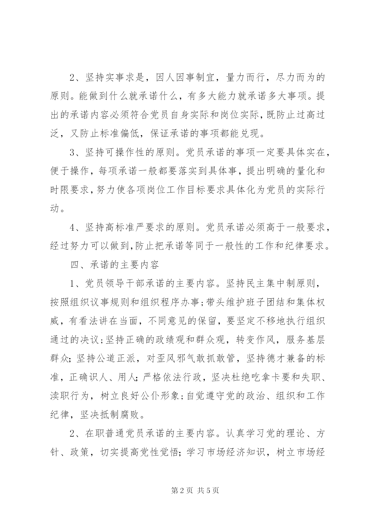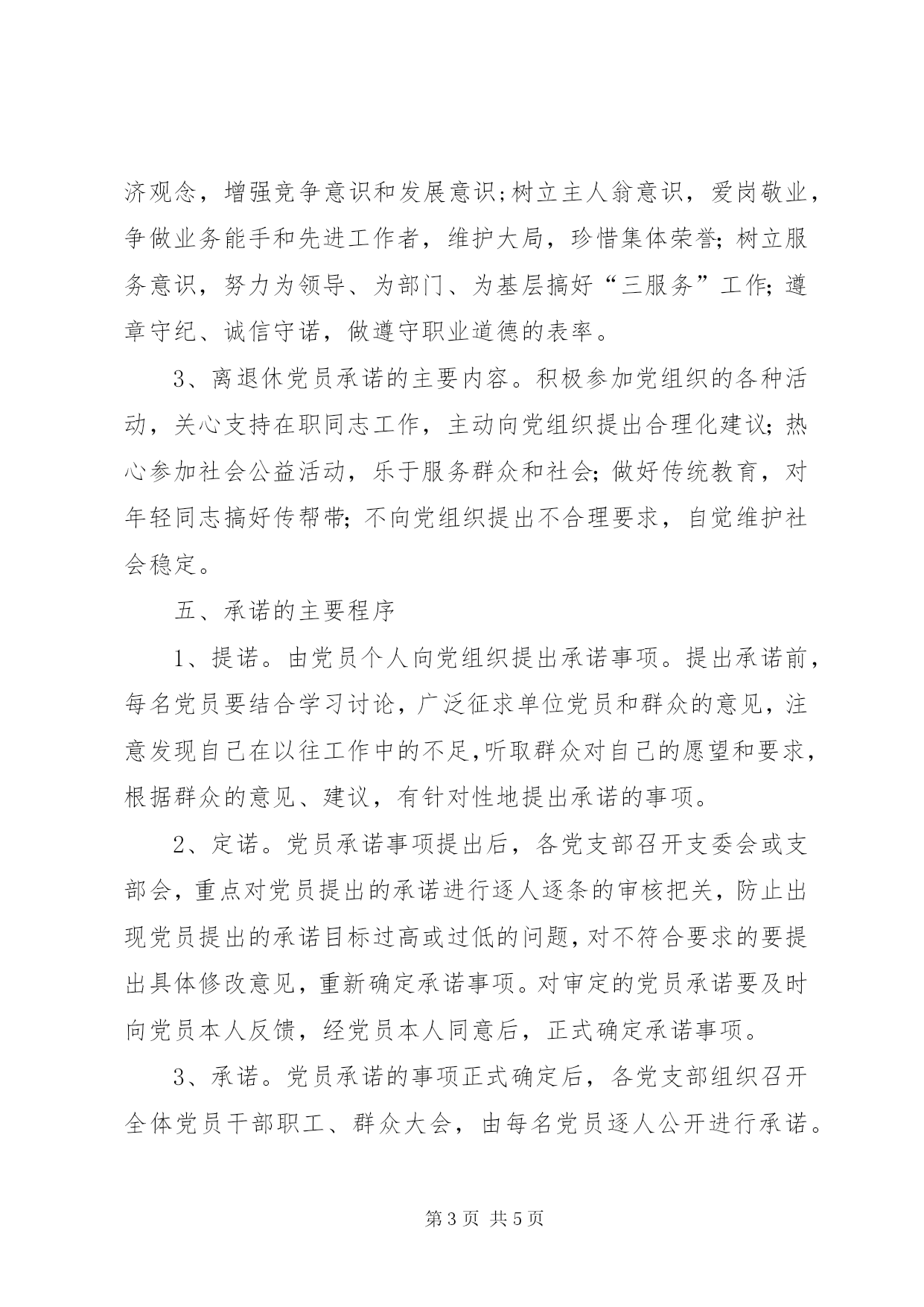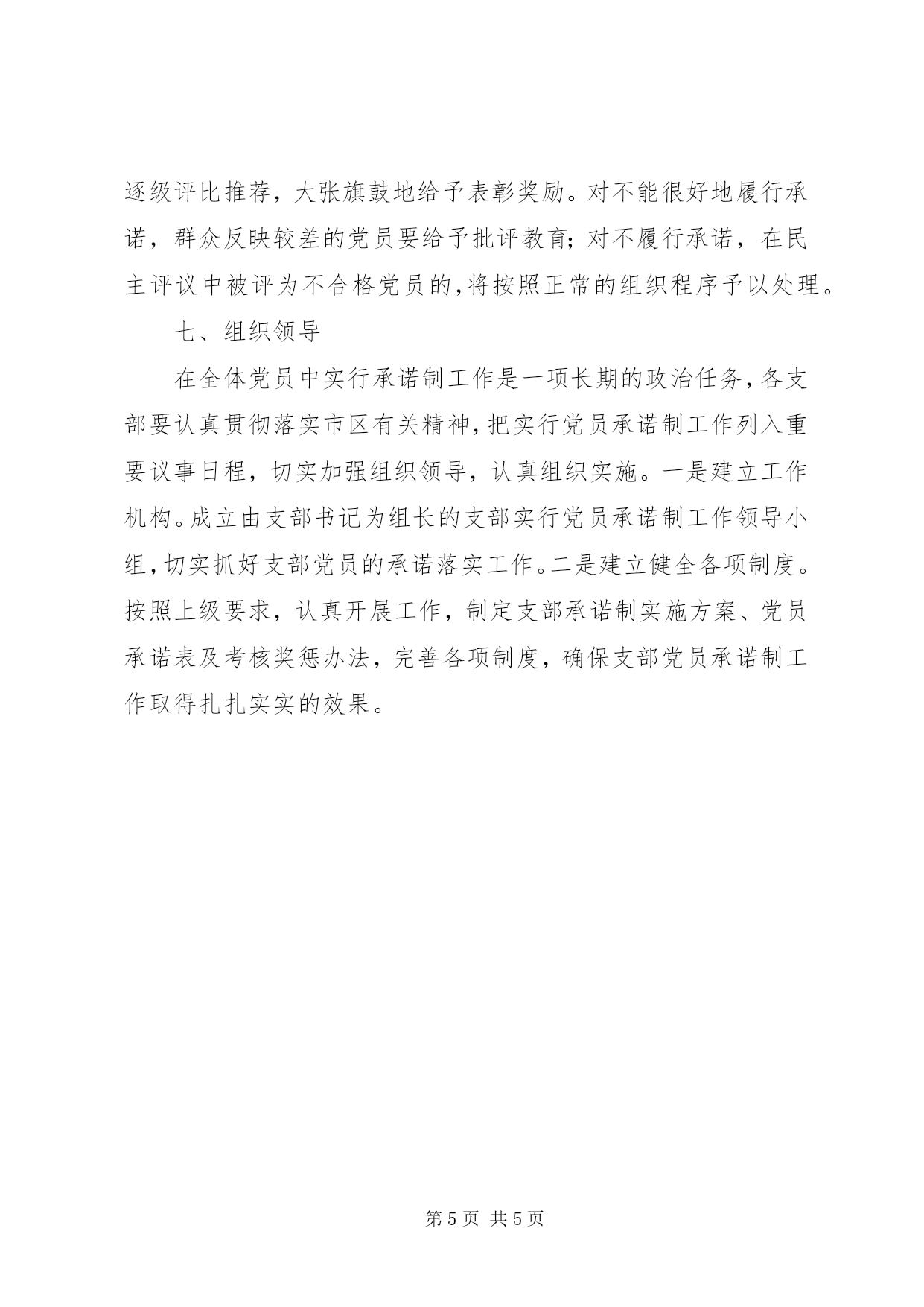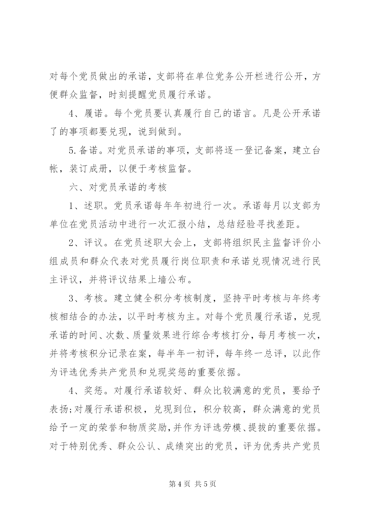 第PAGE\*Arabic\*MERGEFORMAT5页共NUMPAGES\*MERGEFORMAT5页工商局党员承诺制方案为贯彻落实中共市委《关于在全市共产党员中推行承诺制的通知》和中共区委组织部《关于在全区推行党员承诺制工作中应注意的几个问题的通知》精神和要求,充分发挥共产党员在全局工作中的模范作用,更好地接受广大人民群众的监督,经区局研究,决定在全体党员中实行党员承诺制,并提出如下实施方案。一、指导思想坚持以邓小平理论和“三个代表”重要思想、科学发展观为指导,以《党章》规定的党员义务、权利为依据,以巩固党的执政地位、提高党的执政能力为根本,以“提高党员素质、加强支部组织、服务人民群众、促进各项工作”为目标,通过党员承诺制,形成目标明确、监督严格、奖惩分明、操作规范的新型管理机制,激发和调动党员的工作主动性、积极性和创造性,增强党组织的凝聚力和战斗力,为促进我区经济社会快速发展提供坚强的组织保证。二、承诺范围局属各支部全体党员均在承诺范围之内。三、坚持的原则1、坚持符合时代特点、体现先进性的原则。党员承诺内容的提出,要对照《党章》和胡锦涛同志提出的新时期保持共产党员先进性的六条基本要求及支部保持共产党员先进性具体要求,真正体现先进性。2、坚持实事求是,因人因事制宜,量力而行,尽力而为的原则。能做到什么就承诺什么,有多大能力就承诺多大事项。提出的承诺内容必须符合党员自身实际和岗位实际,既防止过高过泛,又防止标准偏低,保证承诺的事项都能兑现。3、坚持可操作性的原则。党员承诺的事项一定要具体实在,便于操作,每项承诺一般都要落实到具体事,提出明确的量化和时限要求,努力使各项岗位工作目标要求具体化为党员的实际行动。4、坚持高标准严要求的原则。党员承诺必须高于一般要求,经过努力可以做到,防止把承诺等同于一般性的工作和纪律要求。四、承诺的主要内容1、党员领导干部承诺的主要内容。坚持民主集中制原则,按照组织议事规则和组织程序办事;带头维护班子团结和集体权威,有看法讲在当面,不同意见的保留,要坚定不移地执行组织通过的决议;坚持正确的政绩观和群众观,转变作风,服务基层群众;坚持公道正派,对歪风邪气敢抓敢管,坚持德才兼备的标准,正确识人、用人;严格依法行政,坚决杜绝吃拿卡要和失职、渎职行为,树立良好公仆形象;自觉遵守党的政治、组织和工作纪律,坚决抵制腐败。2、在职普通党员承诺的主要内容。认真学习党的理论、方针、政策,切实提高党性觉悟;学习市场经济知识,树立市场经济观念,增强竞争意识和发展意识;树立主人翁意识,爱岗敬业,争做业务能手和先进工作者,维护大局,珍惜集体荣誉;树立服务意识,努力为领导、为部门、为基层搞好“三服务”工作;遵章守纪、诚信守诺,做遵守职业道德的表率。3、离退休党员承诺的主要内容。积极参加党组织的各种活动,关心支持在职同志工作,主动向党组织提出合理化建议;热心参加社会公益活动,乐于服务群众和社会;做好传统教育,对年轻同志搞好传帮带;不向党组织提出不合理要求,自觉维护社会稳定。五、承诺的主要程序1、提诺。由党员个人向党组织提出承诺事项。提出承诺前,每名党员要结合学习讨论,广泛征求单位党员和群众的意见,注意发现自己在以往工作中的不足,听取群众对自己的愿望和要求,根据群众的意见、建议,有针对性地提出承诺的事项。2、定诺。党员承诺事项提出后,各党支部召开支委会或支部会,重点对党员提出的承诺进行逐人逐条的审核把关,防止出现党员提出的承诺目标过高或过低的问题,对不符合要求的要提出具体修改意见,重新确定承诺事项。对审定的党员承诺要及时向党员本人反馈,经党员本人同意后,正式确定承诺事项。3、承诺。党员承诺的事项正式确定后,各党支部组织召开全体党员干部职工、群众大会,由每名党员逐人公开进行承诺。对每个党员做出的承诺,支部将在单位党务公开栏进行公开,方便群众监督,时刻提醒党员履行承诺。4、履诺。每个党员要认真履行自己的诺言。凡是公开承诺了的事项都要兑现,说到做到。5.备诺。对党员承诺的事项,支部将逐一登记备案,建立台帐,装订成册,以便于考核监督。六、对党员承诺的考核1、述职。党员承诺每年年初进行一次。承诺每月以支部为单位在党员活动中进行一次汇报小结,总结经验寻找差距。2、评议。在党员述职大会上,支部将组织民主监督评价小组成员和群众代表对党员履行岗位职责和承诺兑现情况进行民主评议,并将评议结果上墙公布。3、考核。建立健全积分考核制度,坚持平时考核与年终考核相结合的办法,以平时考核为主。对每个党员履行承诺,兑现承诺的时间、次数、质量效果进行综合考核打分,每月考核一次,并将考核积分记录在案,每半年一初评,每年终一总评,以此作为评选优秀共产党员和兑现奖惩的重要依据。4、奖惩。对履行承诺较好、群众比较满意的党员,要给予表扬;对履行承