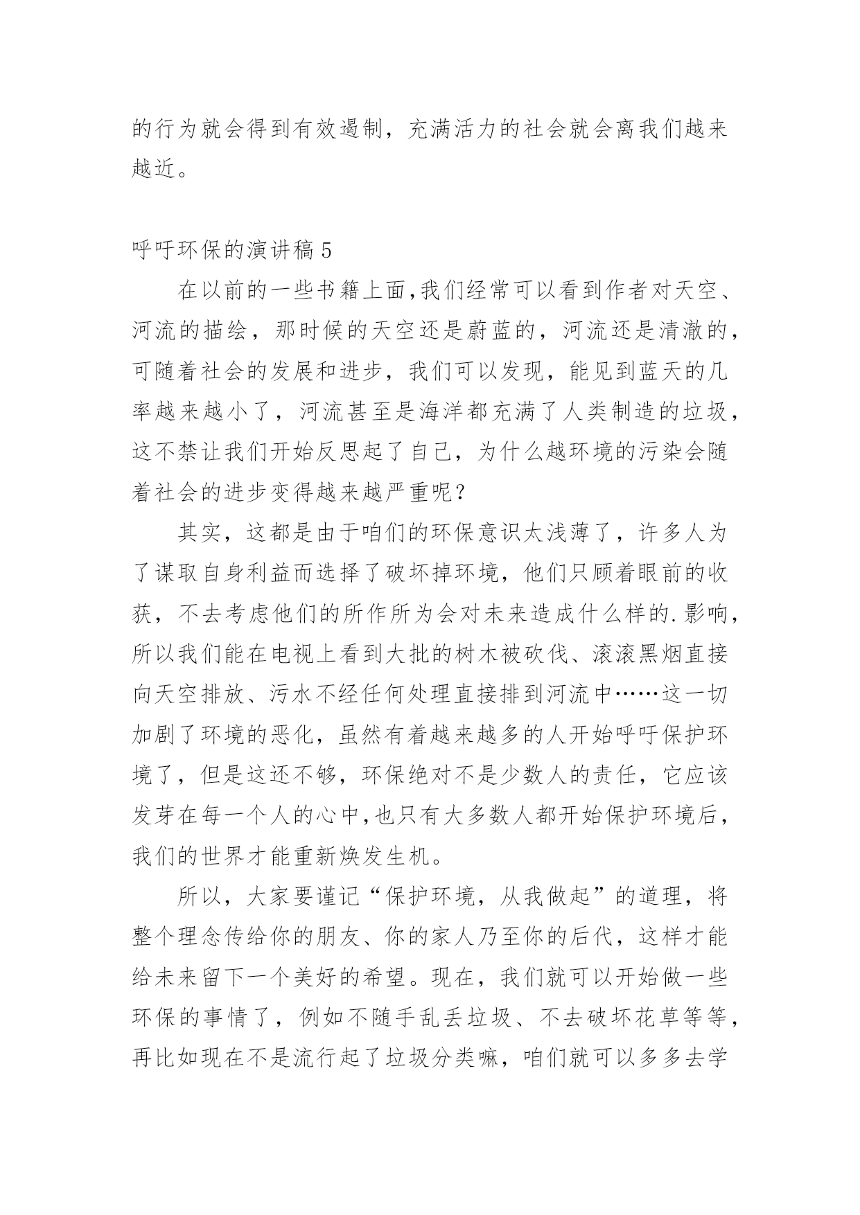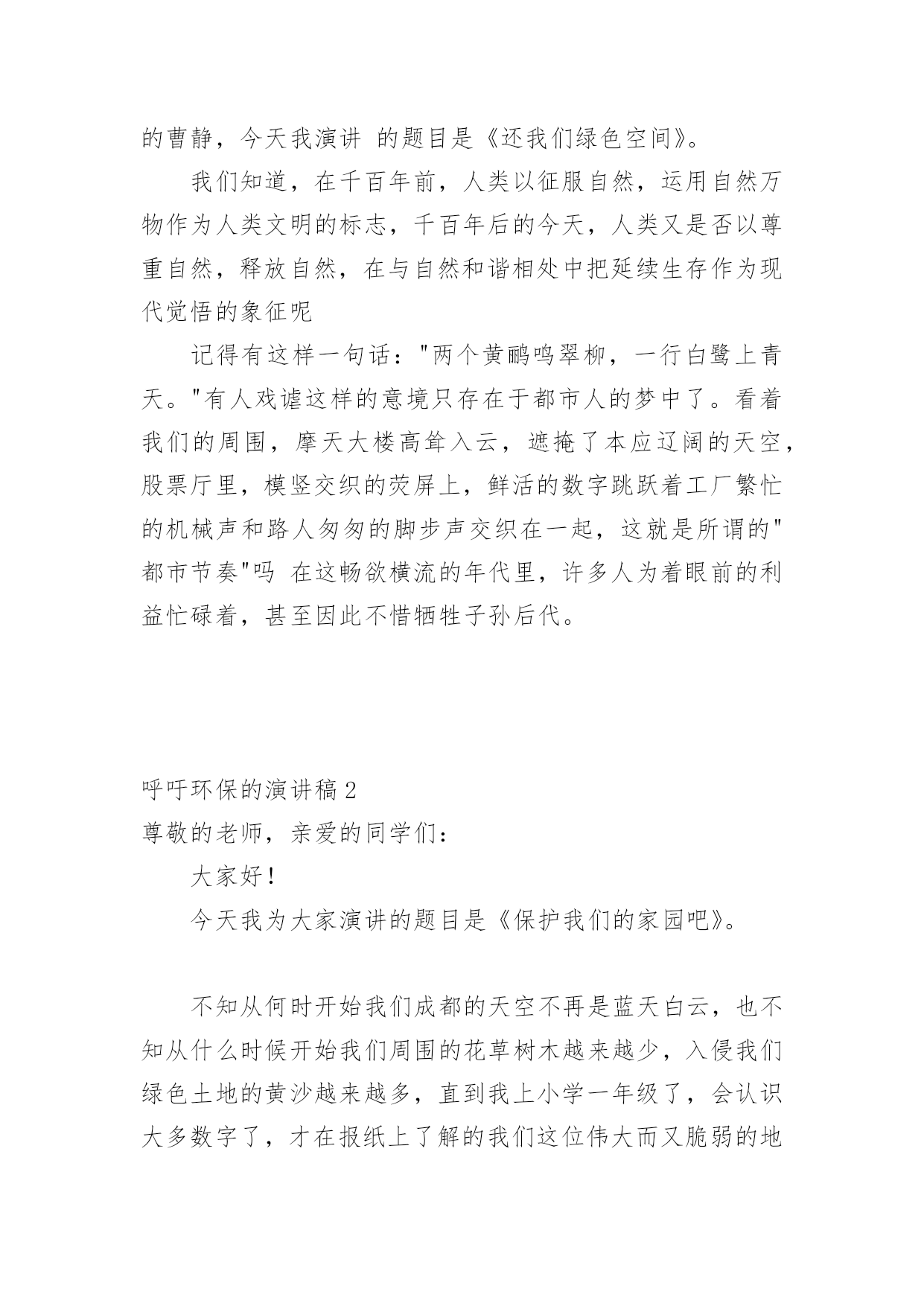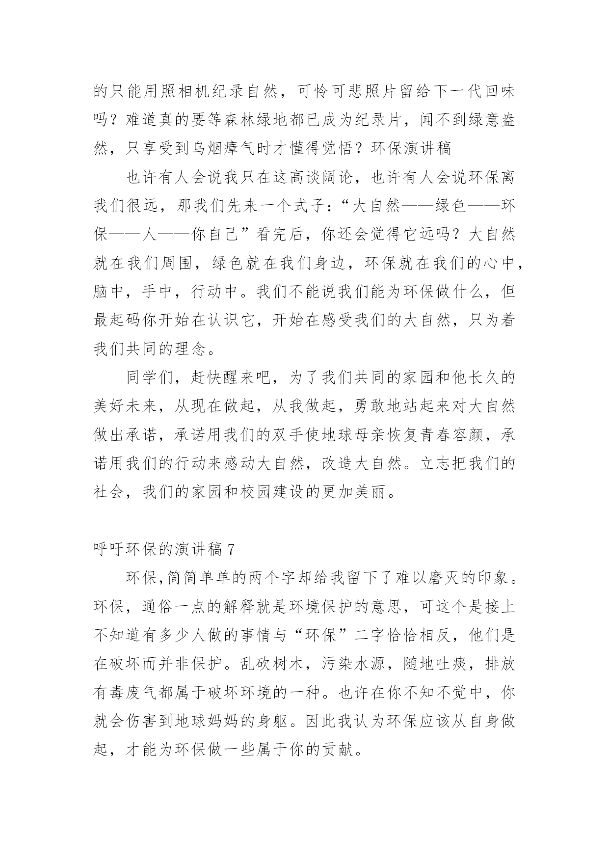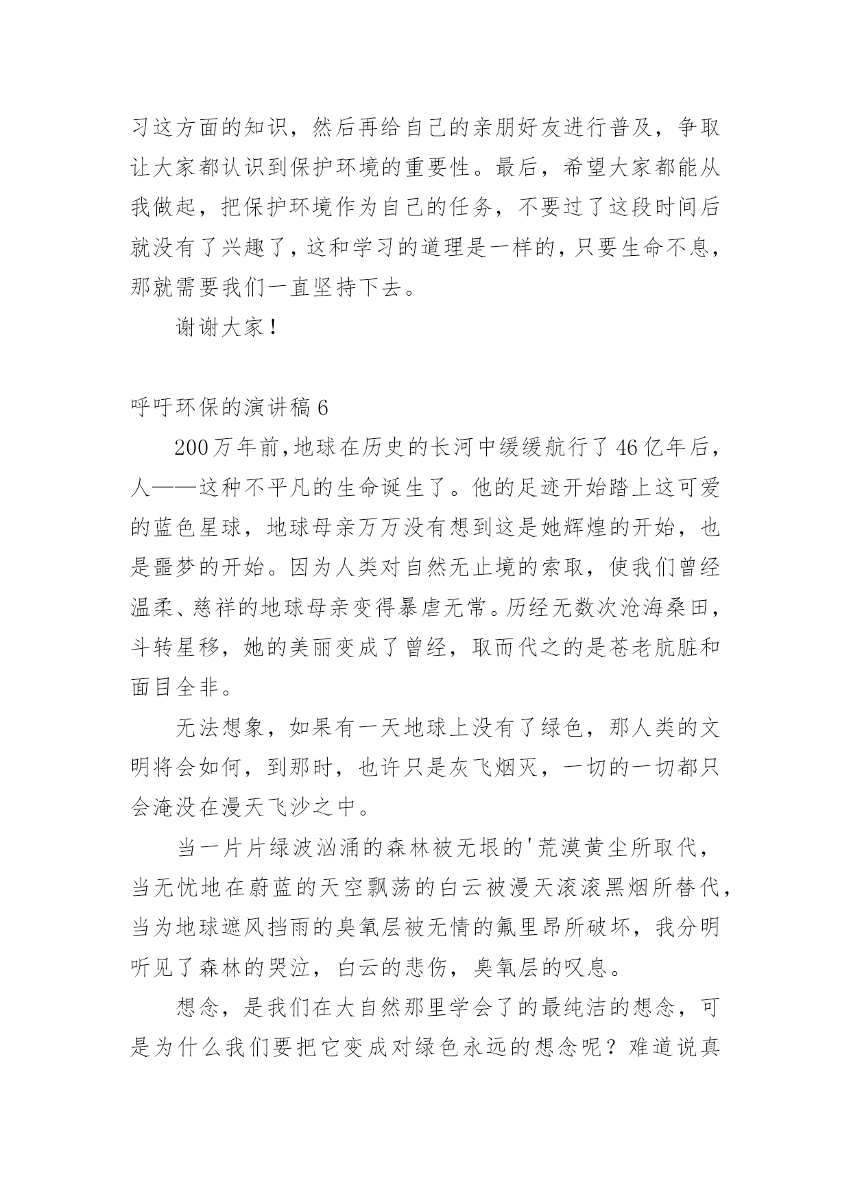 呼吁环保的演讲稿呼吁环保的演讲稿9篇演讲稿的格式由称谓、开场白、主干、结尾等几部分组成。在当下社会,演讲稿使用的情况越来越多,那么,怎么去写演讲稿呢?下面是小编为大家收集的呼吁环保的演讲稿,仅供参考,欢迎大家阅读。呼吁环保的演讲稿1各位领导,各位老师,各位同学:大家下午好!我是07计3的xx,今天我演讲的主要题目是《环境的呼吁》。环境是我们人类的好朋友,跟我们的生活息息相关。但是我们因为一时的私利,大量砍伐树木,造成水土流失和大量动物惨遭灭绝。环境对人类来说既是天堂,又是地狱,人们睁大那贪梦的双眼,恨不得将所有的财富占为己有。人类破坏环境,就是在破坏自己,自己的生存环境,人类应该用眼睛证实一下,这奇特现象存在的事实,进而能不能改善我们的生态环境。环境向我们呼吁,必须尽快采取一切措施,拯救日趋频危的野生动物,拯救我们的生存环境。生物学家发出了震撼全球的警告:"全世界将有5000种动物在不长的时期灭绝"。但同时几乎发出同一声音:"本世纪上半期,每隔5年就有一种哺乳动物灭绝,本世纪下半期,已加速到每隔两年就在灭绝一种。"警告就在空中回荡,悲剧仍在脚下发展。进入高文明社会的人类,正在野蛮愚昧的破坏生态环境。地球上指可数的野生动物资源大国,在想方设法保护他们的同时,也无可奈何地看着他们惨遭扑杀,践踏,掠夺……人类在破坏环境时,也在破坏国家的保护动物,大熊猫。素有"国宝"之称等等命运同样不佳,如果再破坏生态环境,这些世代赖以繁衍的`家园也遭到疯狂的扫荡,株连九族的下场并不鲜见,是我们人类残酷无情的破坏他们。我国的长江,黄河目前也遭到同样的破坏,导致水污染严重,人们将垃圾扔到里面。使黄河,长江的水,不再是以前那样的清澈见底了。导致长江,黄河被污染的诸多因素中,人为因素是重要的因素之一。只要这个因素不彻底消除,那么"天敌"的罪名依然是人类难逃的梦魇!·保护野生动物就是保护人类自己。保护环境不仅有利于我们的身体健康,同时也在为我们的子孙后代造福,保护环境的主要目的是改善环境质量,保障人体健康和促进社会经济的可持续发展,保护环境不仅要从小事做起,更要从自己做起,积极的和破坏环境的人做斗争。让环境和以前一样没有任何污染,一种天然的灵性告诉我们:只有和平相处才能继续生存。让我们携起手来共创美好明天。还我们绿色空间各位领导,各位老师,各位同学,大家好!我是07计3的曹静,今天我演讲的题目是《还我们绿色空间》。我们知道,在千百年前,人类以征服自然,运用自然万物作为人类文明的标志,千百年后的今天,人类又是否以尊重自然,释放自然,在与自然和谐相处中把延续生存作为现代觉悟的象征呢记得有这样一句话:"两个黄鹂鸣翠柳,一行白鹭上青天。"有人戏谑这样的意境只存在于都市人的梦中了。看着我们的周围,摩天大楼高耸入云,遮掩了本应辽阔的天空,股票厅里,模竖交织的荧屏上,鲜活的数字跳跃着工厂繁忙的机械声和路人匆匆的脚步声交织在一起,这就是所谓的"都市节奏"吗在这畅欲横流的年代里,许多人为着眼前的利益忙碌着,甚至因此不惜牺牲子孙后代。呼吁环保的演讲稿2尊敬的老师,亲爱的同学们:大家好!今天我为大家演讲的题目是《保护我们的家园吧》。不知从何时开始我们成都的天空不再是蓝天白云,也不知从什么时候开始我们周围的花草树木越来越少,入侵我们绿色土地的黄沙越来越多,直到我上小学一年级了,会认识大多数字了,才在报纸上了解的我们这位伟大而又脆弱的地球妈妈遭到破坏了。因为人类的重经济发展,现代水利工程,如防洪、发电、航运、灌溉、养殖供水等在发挥一种或多种经济效益的同时,对工程所在地、上下游、河口乃至整个流域的自然环境和社会环境都会产生负面影响,也造成了一定范围内水资源破坏,就因为这样我们的水资源受到严重的破坏;还有一些采矿行业对水资源的破坏不容忽视,如煤炭开采中每采一吨煤要排漏0.88立方米水,按我省年采煤3亿吨计算,每年仅因采煤损失地下水资源高达2.64亿立方米,并对地下水体地质构造造成极大的'破坏,就因为这样我们的水资源遭到非常严重的破坏;还有人类无限度的乱砍乱伐,造成植被严重破坏,对水土保湿及水资源的地表埋藏也造成一定的影响,因为这样我们的水资源又破坏了。其实这些还只是生态平衡受到破坏的一小部分例子,还有很多比我们想象的还要严重的多得多,所以整个大自然就严重受到了破坏,我们人类无情的对待了大自然,大自然已经在尽力反抗我们,我们人类就要对自己所干的一切付出相应的代价,难道我们还不觉醒吗?我们应当保护地球——我们的妈妈,保护地球上的生态环境。全球几乎各个国家都意识到了这个问题,正在对保护地球做相应的措施:1994年美国环保署规定,进口汽油中硫、苯等有害物质必须低于有关标准,否则禁止进;我国在参照“污染者付费原则”的基础上,于1979年在《环境保护法(试行)》第6条规定了“谁污染谁治理”原则,