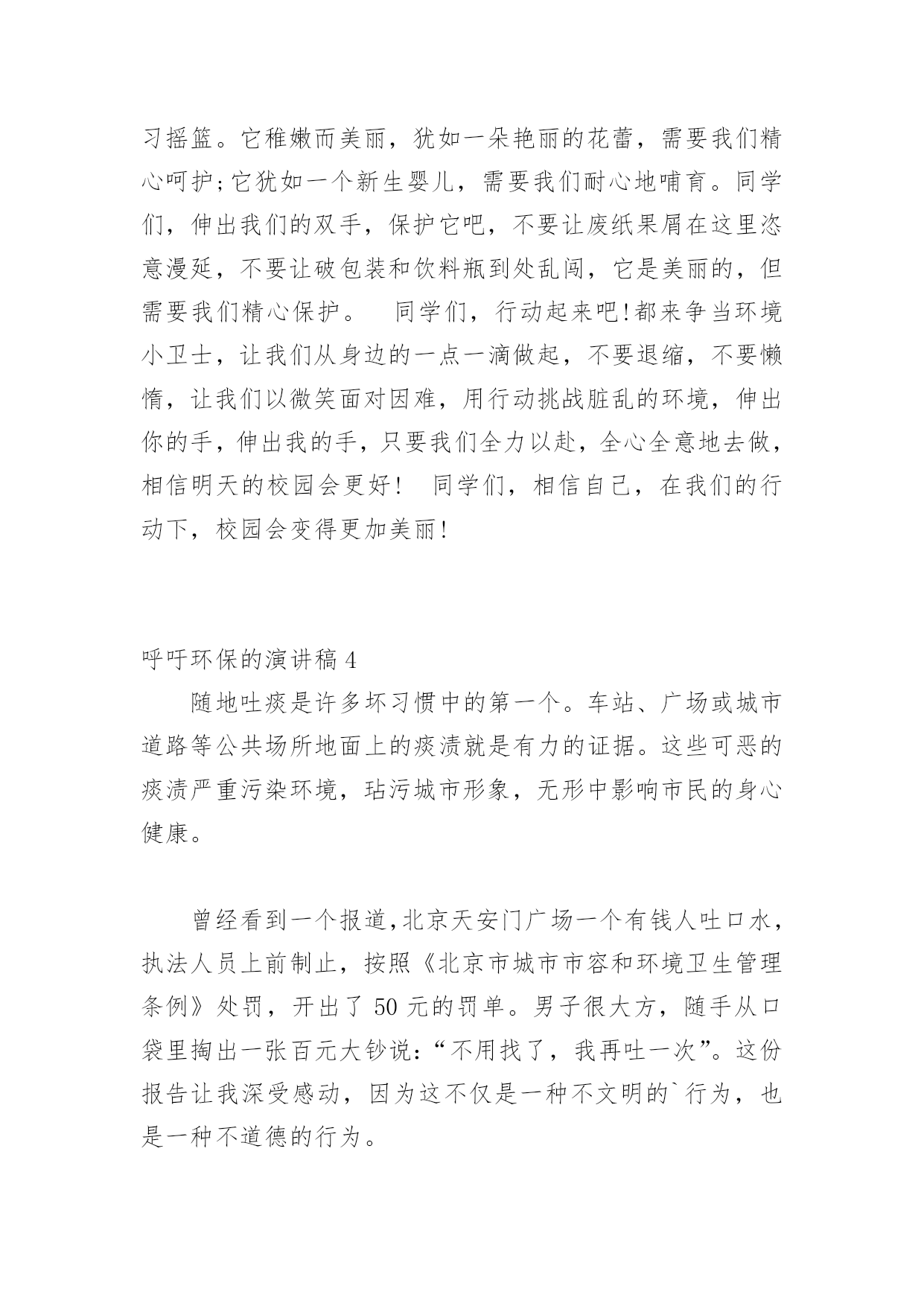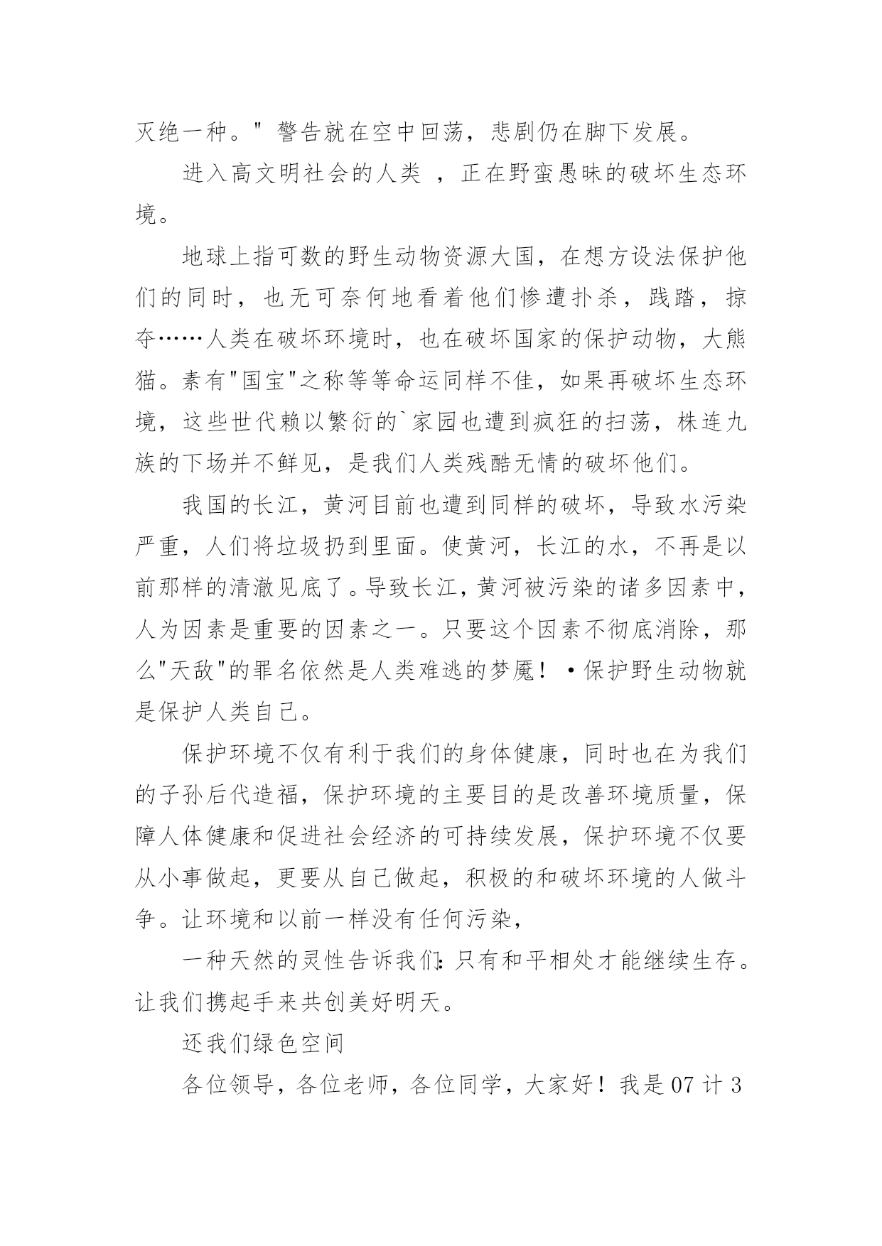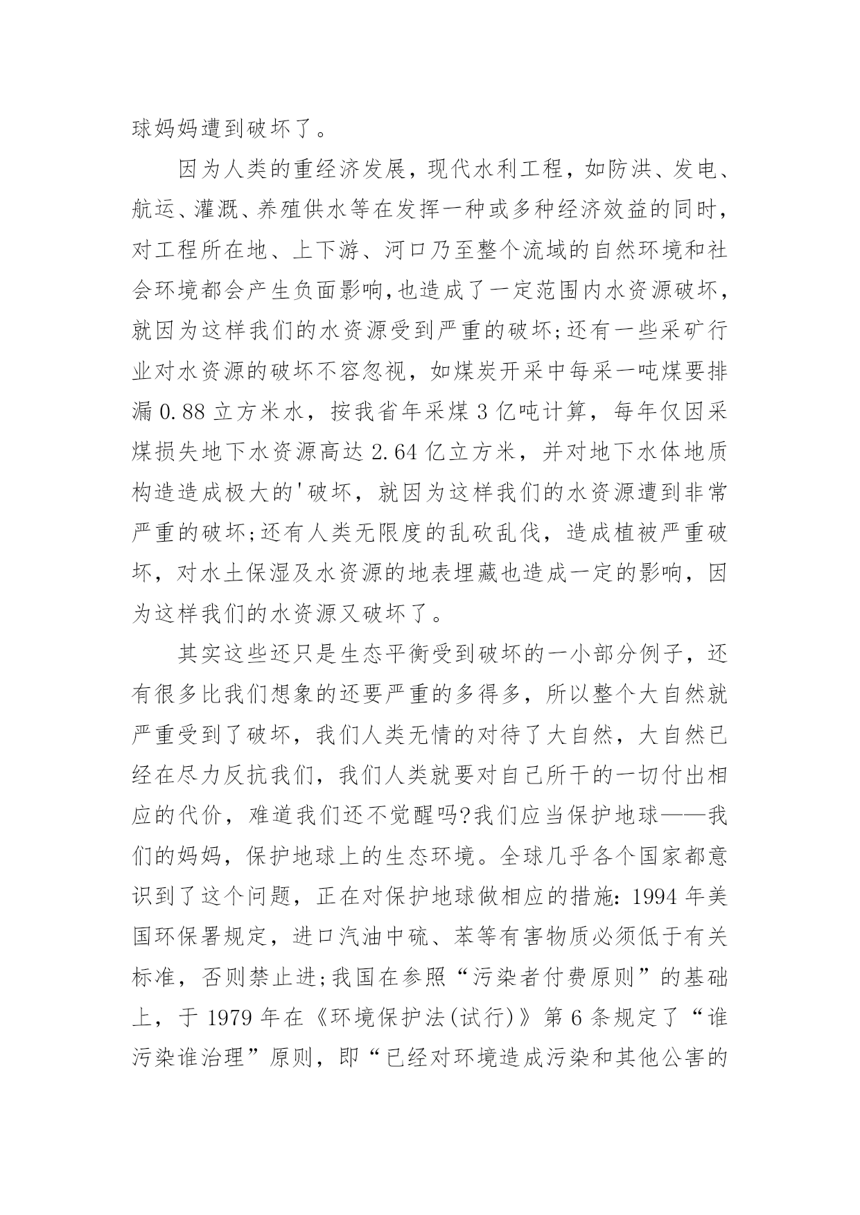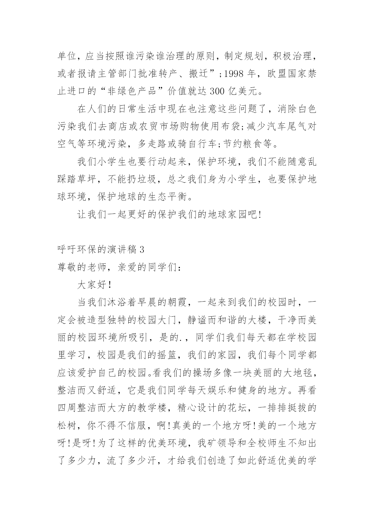 呼吁环保的演讲稿呼吁环保的演讲稿9篇演讲稿的格式由称谓、开场白、主干、结尾等几部分组成。在当下社会,演讲稿使用的情况越来越多,那么,怎么去写演讲稿呢?下面是小编为大家收集的呼吁环保的演讲稿,仅供参考,欢迎大家阅读。呼吁环保的演讲稿1各位领导,各位老师,各位同学:大家下午好!我是07计3的xx,今天我演讲的主要题目是《环境的呼吁》。环境是我们人类的好朋友,跟我们的生活息息相关。但是我们因为一时的私利,大量砍伐树木,造成水土流失和大量动物惨遭灭绝。环境对人类来说既是天堂,又是地狱,人们睁大那贪梦的双眼,恨不得将所有的财富占为己有。人类破坏环境,就是在破坏自己,自己的生存环境,人类应该用眼睛证实一下,这奇特现象存在的事实,进而能不能改善我们的生态环境。环境向我们呼吁,必须尽快采取一切措施,拯救日趋频危的野生动物,拯救我们的生存环境。生物学家发出了震撼全球的警告:"全世界将有5000种动物在不长的时期灭绝"。但同时几乎发出同一声音:"本世纪上半期,每隔5年就有一种哺乳动物灭绝,本世纪下半期,已加速到每隔两年就在灭绝一种。"警告就在空中回荡,悲剧仍在脚下发展。进入高文明社会的人类,正在野蛮愚昧的破坏生态环境。地球上指可数的野生动物资源大国,在想方设法保护他们的同时,也无可奈何地看着他们惨遭扑杀,践踏,掠夺……人类在破坏环境时,也在破坏国家的保护动物,大熊猫。素有"国宝"之称等等命运同样不佳,如果再破坏生态环境,这些世代赖以繁衍的`家园也遭到疯狂的扫荡,株连九族的下场并不鲜见,是我们人类残酷无情的破坏他们。我国的长江,黄河目前也遭到同样的破坏,导致水污染严重,人们将垃圾扔到里面。使黄河,长江的水,不再是以前那样的清澈见底了。导致长江,黄河被污染的诸多因素中,人为因素是重要的因素之一。只要这个因素不彻底消除,那么"天敌"的罪名依然是人类难逃的梦魇!·保护野生动物就是保护人类自己。保护环境不仅有利于我们的身体健康,同时也在为我们的子孙后代造福,保护环境的主要目的是改善环境质量,保障人体健康和促进社会经济的可持续发展,保护环境不仅要从小事做起,更要从自己做起,积极的和破坏环境的人做斗争。让环境和以前一样没有任何污染,一种天然的灵性告诉我们:只有和平相处才能继续生存。让我们携起手来共创美好明天。还我们绿色空间各位领导,各位老师,各位同学,大家好!我是07计3的曹静,今天我演讲的题目是《还我们绿色空间》。我们知道,在千百年前,人类以征服自然,运用自然万物作为人类文明的标志,千百年后的今天,人类又是否以尊重自然,释放自然,在与自然和谐相处中把延续生存作为现代觉悟的象征呢记得有这样一句话:"两个黄鹂鸣翠柳,一行白鹭上青天。"有人戏谑这样的意境只存在于都市人的梦中了。看着我们的周围,摩天大楼高耸入云,遮掩了本应辽阔的天空,股票厅里,模竖交织的荧屏上,鲜活的数字跳跃着工厂繁忙的机械声和路人匆匆的脚步声交织在一起,这就是所谓的"都市节奏"吗在这畅欲横流的年代里,许多人为着眼前的利益忙碌着,甚至因此不惜牺牲子孙后代。呼吁环保的演讲稿2尊敬的老师,亲爱的同学们:大家好!今天我为大家演讲的题目是《保护我们的家园吧》。不知从何时开始我们成都的天空不再是蓝天白云,也不知从什么时候开始我们周围的花草树木越来越少,入侵我们绿色土地的黄沙越来越多,直到我上小学一年级了,会认识大多数字了,才在报纸上了解的我们这位伟大而又脆弱的地球妈妈遭到破坏了。因为人类的重经济发展,现代水利工程,如防洪、发电、航运、灌溉、养殖供水等在发挥一种或多种经济效益的同时,对工程所在地、上下游、河口乃至整个流域的自然环境和社会环境都会产生负面影响,也造成了一定范围内水资源破坏,就因为这样我们的水资源受到严重的破坏;还有一些采矿行业对水资源的破坏不容忽视,如煤炭开采中每采一吨煤要排漏0.88立方米水,按我省年采煤3亿吨计算,每年仅因采煤损失地下水资源高达2.64亿立方米,并对地下水体地质构造造成极大的'破坏,就因为这样我们的水资源遭到非常严重的破坏;还有人类无限度的乱砍乱伐,造成植被严重破坏,对水土保湿及水资源的地表埋藏也造成一定的影响,因为这样我们的水资源又破坏了。其实这些还只是生态平衡受到破坏的一小部分例子,还有很多比我们想象的还要严重的多得多,所以整个大自然就严重受到了破坏,我们人类无情的对待了大自然,大自然已经在尽力反抗我们,我们人类就要对自己所干的一切付出相应的代价,难道我们还不觉醒吗?我们应当保护地球——我们的妈妈,保护地球上的生态环境。全球几乎各个国家都意识到了这个问题,正在对保护地球做相应的措施:1994年美国环保署规定,进口汽油中硫、苯等有害物质必须低于有关标准,否则禁止进;我国在参照“污染者付费原则”的基础上,于1979年在《环境保护法(试行)》第6条规定了“谁污染谁治理”原则,