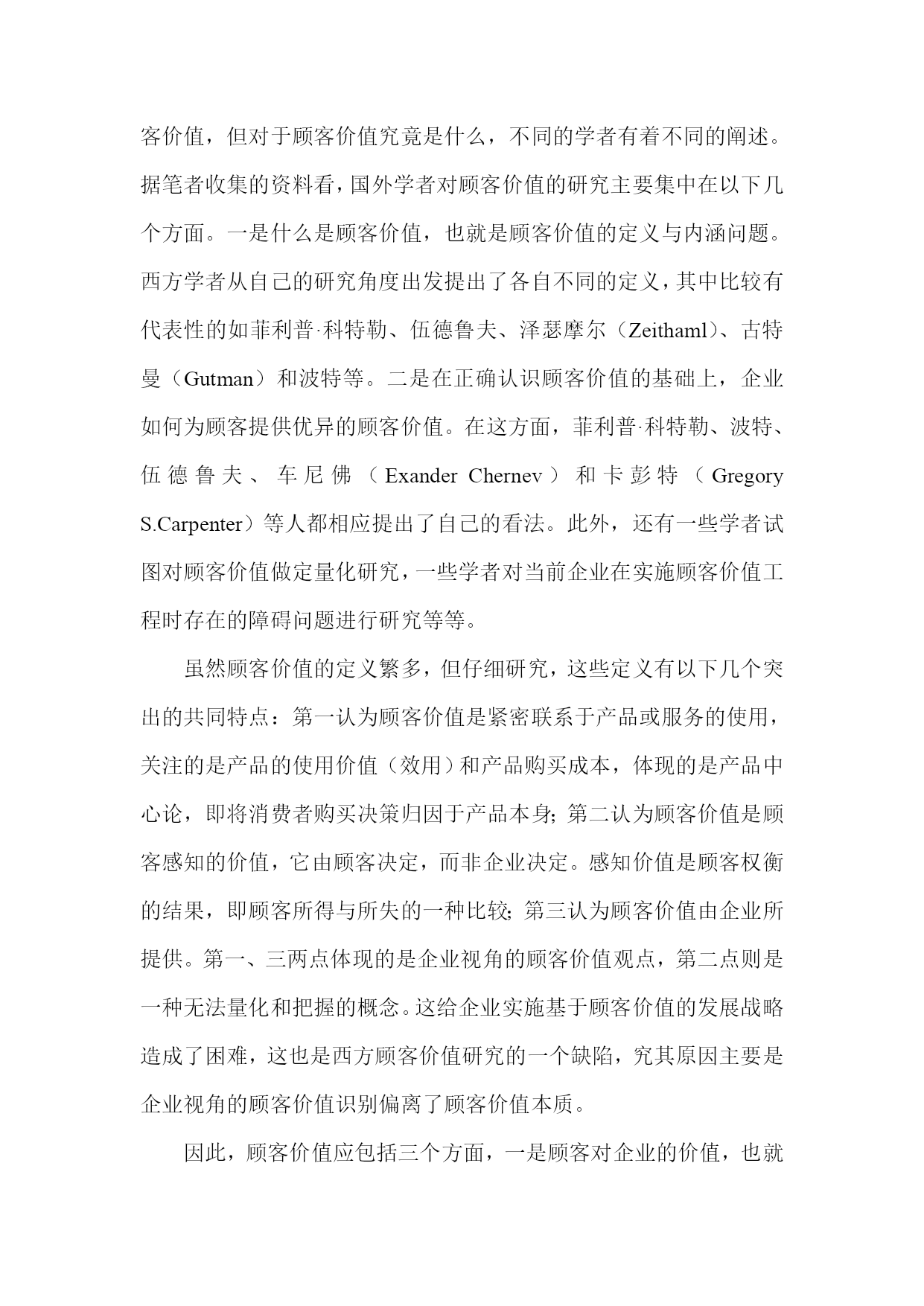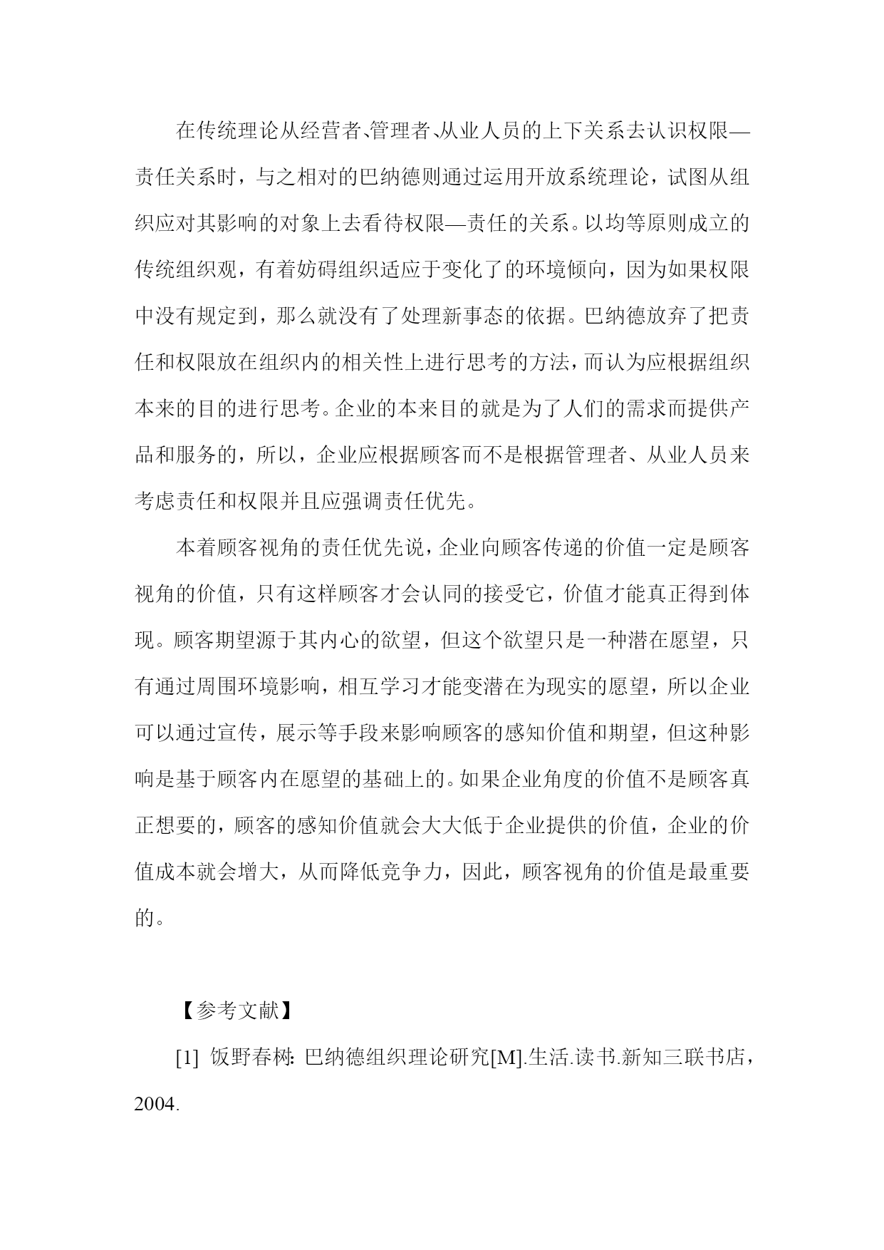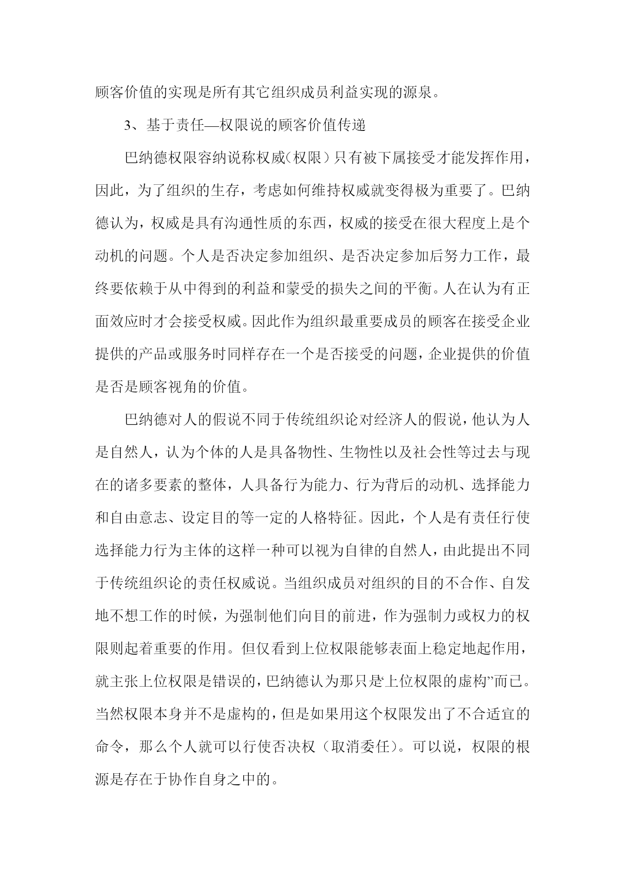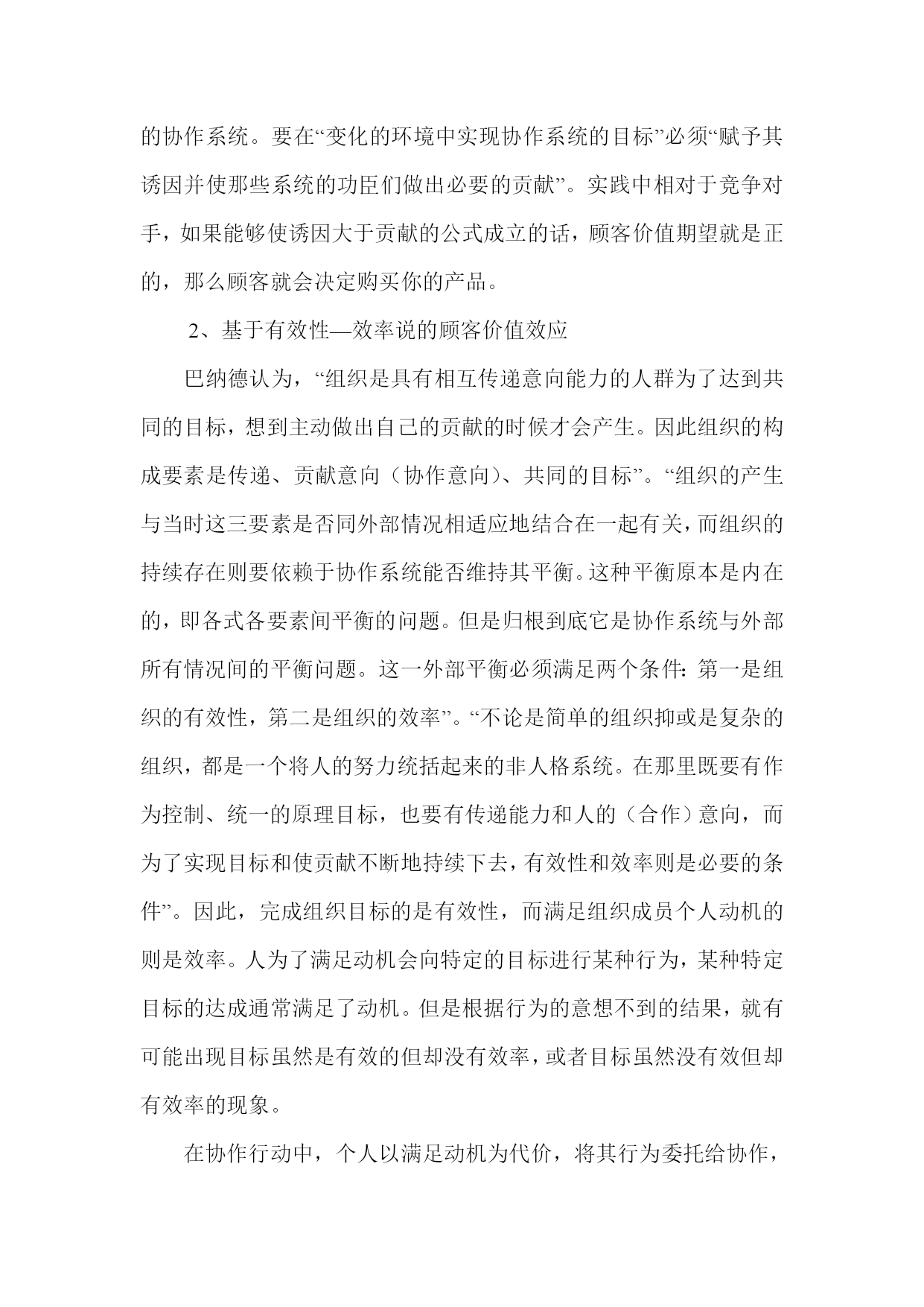 基于巴纳德组织理论的顾客价值分析【摘要】20世纪90年代中外学者开始重视和研究顾客价值,但对顾客价值究竟是什么的定义繁多。本文认为顾客价值包含顾客价值效应、顾客价值传递和顾客价值期望三个方面,并尝试从巴纳德组织理论中提供相应的理论依据,提出基于动机——诱因说的顾客价值期望、基于有效性——效率论的顾客价值效应和基于责任——权限说的顾客价值传递。【关键词】巴纳德组织理论顾客价值顾客价值效应顾客价值传递顾客价值期望巴纳德作为杰出的企业管理实践者受到世界管理界的普遍尊重。《经理人员的职能》(1938)一书抽象地提出了企业的生存发展“管理者必须要做什么,如何行为,为什么行为”的管理理论。但正如巴纳德又说到“但是不久我领悟到为了达到这一目的就必须阐述他们活动的本质,也就是正式组织的本质”。因此,组织理论作为管理理论的基础理论,首先在书中得到了确立。顾客价值是企业经营的本质所在,顾客价值的本质之源正蕴含在组织本质之中。一、顾客价值定义分析中外学者从20世纪90年代以后开始从顾客角度认识和研究顾客价值,但对于顾客价值究竟是什么,不同的学者有着不同的阐述。据笔者收集的资料看,国外学者对顾客价值的研究主要集中在以下几个方面。一是什么是顾客价值,也就是顾客价值的定义与内涵问题。西方学者从自己的研究角度出发提出了各自不同的定义,其中比较有代表性的如菲利普·科特勒、伍德鲁夫、泽瑟摩尔(Zeithaml)、古特曼(Gutman)和波特等。二是在正确认识顾客价值的基础上,企业如何为顾客提供优异的顾客价值。在这方面,菲利普·科特勒、波特、伍德鲁夫、车尼佛(ExanderChernev)和卡彭特(GregoryS.Carpenter)等人都相应提出了自己的看法。此外,还有一些学者试图对顾客价值做定量化研究,一些学者对当前企业在实施顾客价值工程时存在的障碍问题进行研究等等。虽然顾客价值的定义繁多,但仔细研究,这些定义有以下几个突出的共同特点:第一认为顾客价值是紧密联系于产品或服务的使用,关注的是产品的使用价值(效用)和产品购买成本,体现的是产品中心论,即将消费者购买决策归因于产品本身;第二认为顾客价值是顾客感知的价值,它由顾客决定,而非企业决定。感知价值是顾客权衡的结果,即顾客所得与所失的一种比较;第三认为顾客价值由企业所提供。第一、三两点体现的是企业视角的顾客价值观点,第二点则是一种无法量化和把握的概念。这给企业实施基于顾客价值的发展战略造成了困难,这也是西方顾客价值研究的一个缺陷,究其原因主要是企业视角的顾客价值识别偏离了顾客价值本质。因此,顾客价值应包括三个方面,一是顾客对企业的价值,也就是顾客对企业的意义、重要性、必要性,即顾客价值效应。二是企业传递给顾客的价值,也就是企业为顾客选择、创造、提供的价值,即顾客价值传递。三是顾客对价值的看法,也就是在顾客看来有什么意义,是否重要、是否必要,即顾客价值期望。因为企业要生存发展必须追求自己的组织效率,因此,必须要认清顾客价值对企业的意义,其次要了解顾客需要什么、顾客眼中的价值是什么,然后集合自己的资源在对企业有意义的前提下把顾客需要的价值传递给他们。顾客价值不是一个静态的概念,而是一个动态的系统工程,是现代企业经营的本质所在。二、顾客价值内涵分析1、基于动机—诱因说的顾客价值期望顾客价值的以上三层含义,其中顾客视角的价值即顾客价值期望是最为重要的,不仅在于它是顾客价值含义的集中体现,更在于其把握的不可确定性。因此,要正确把握顾客价值的内涵,必须从其本质开始,从顾客价值期望形成的原因开始分析。基于顾客视角的顾客价值期望并非天然自生的,它来源于顾客的利益要求。顾客利益要求又始于顾客动机,即人的需求。对于人的动机,有多种说法,但大多把人的物质需求作为第一动机。巴纳德也把人的动机分为不同的层次,但他把经济利益的利已心放在第四位上,认为人并没有太强的经济利益动机。巴纳德提出的这个动机论,虽早在20世纪30年代,但现在看来依然能诠释今天的需求现状。人们对产品或服务的需求满足已由最初的产品或服务的使用价值跃升到附着在产品或服务上的非物质价值了。巴纳德根据人的动机,提出根据个人特征所给予的诱因有物质诱因、个人的非物质的机会、令人满意的物质条件和理想的恩惠。而作为普遍起作用的诱因有:与社会相联系的魅力、对于周围环境习惯性的做法和态度上的适应、广泛的参与机会和精神沟通。根据人们动机的层次和满意度来讲物质诱因不可缺少,但比重和物质需求提供的满意度已大大降低。因此,对于顾客的诱因,要从质量、给予顾客以信用、良好的交易环境、良好的服务态度、一惯性、参与机会和伙伴意识等几方面考虑。对应于人的动机(需求),企业应提供相应的诱因,但给予什么样的诱因,须先弄清组织的主要成员。企业作为提供产品的组织,包括生产产品、输送产品到产品出售后根据市场