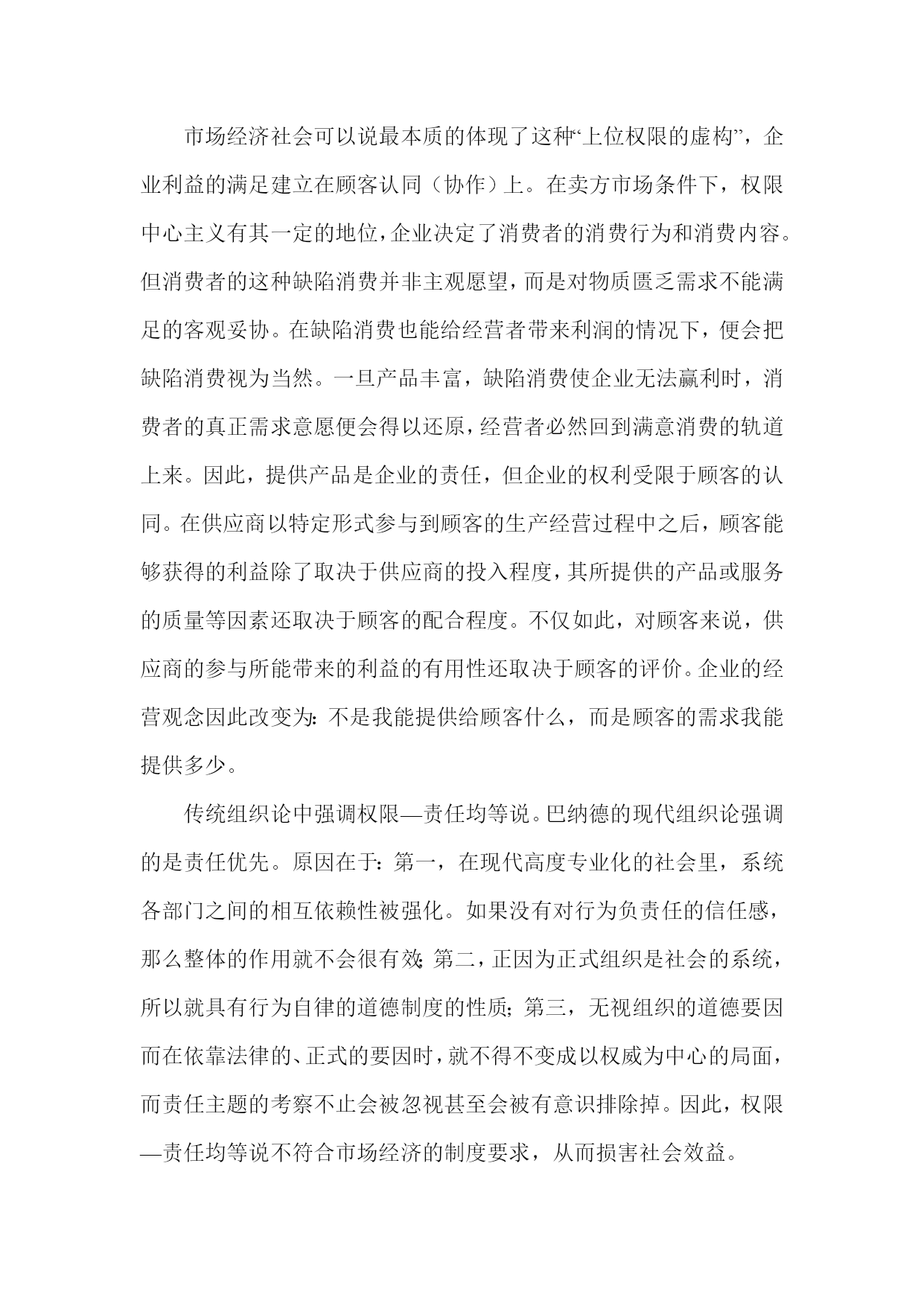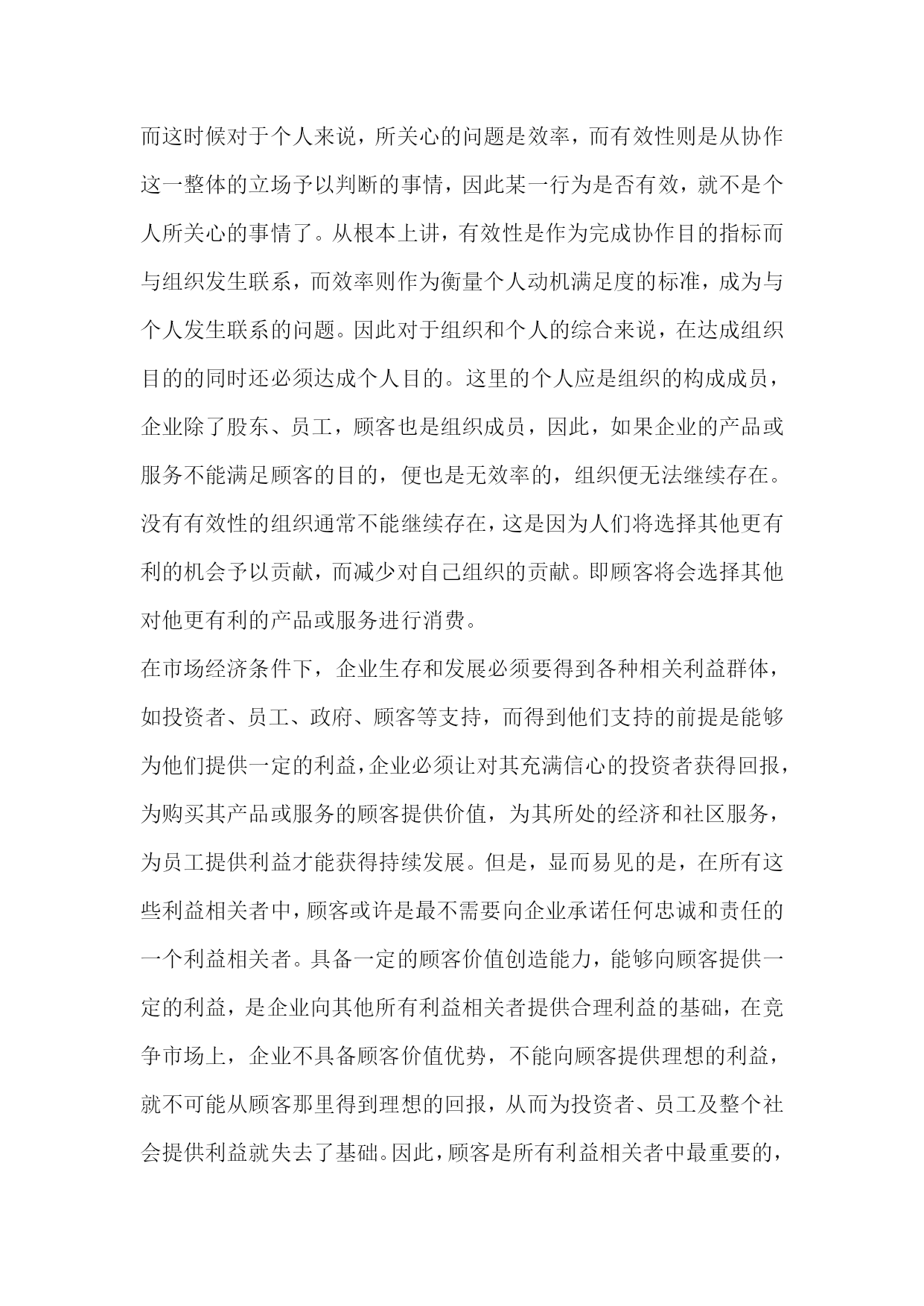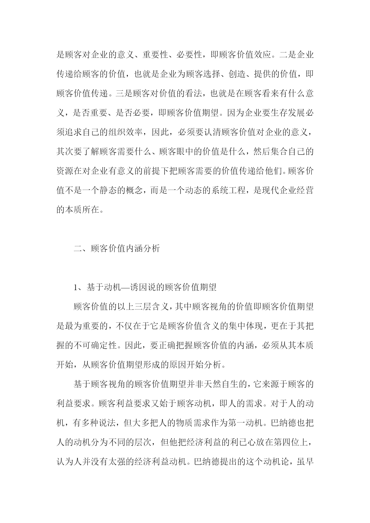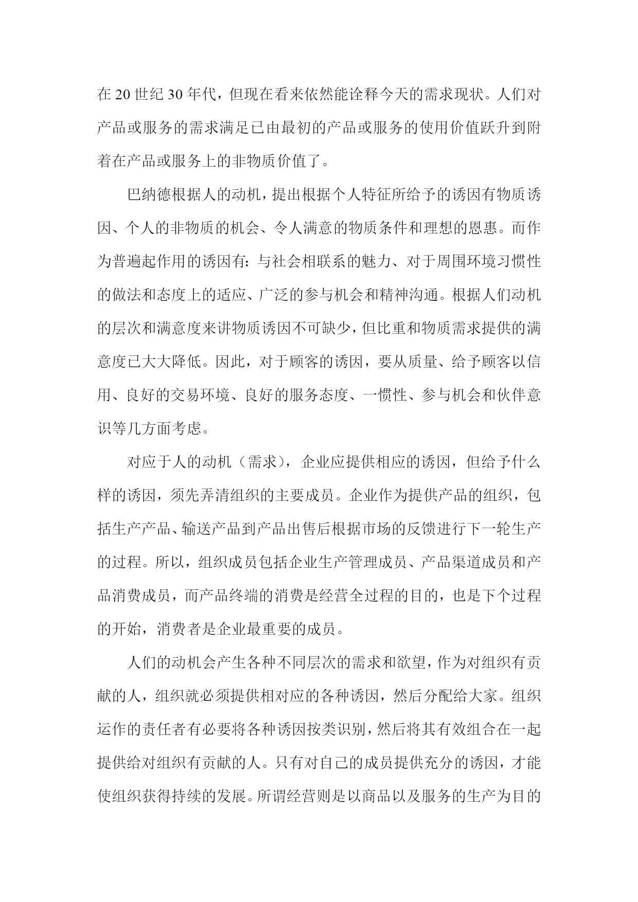 基于巴纳德组织理论的顾客价值分析【摘要】20世纪90年代中外学者开始重视和研究顾客价值,但对顾客价值究竟是什么的定义繁多。本文认为顾客价值包含顾客价值效应、顾客价值传递和顾客价值期望三个方面,并尝试从巴纳德组织理论中提供相应的理论依据,提出基于动机——诱因说的顾客价值期望、基于有效性——效率论的顾客价值效应和基于责任——权限说的顾客价值传递。【关键词】巴纳德组织理论顾客价值顾客价值效应顾客价值传递顾客价值期望巴纳德作为杰出的企业管理实践者受到世界管理界的普遍尊重。《经理人员的职能》(1938)一书抽象地提出了企业的生存发展“管理者必须要做什么,如何行为,为什么行为”的管理理论。但正如巴纳德又说到“但是不久我领悟到为了达到这一目的就必须阐述他们活动的本质,也就是正式组织的本质”。因此,组织理论作为管理理论的基础理论,首先在书中得到了确立。顾客价值是企业经营的本质所在,顾客价值的本质之源正蕴含在组织本质之中。一、顾客价值定义分析中外学者从20世纪90年代以后开始从顾客角度认识和研究顾客价值,但对于顾客价值究竟是什么,不同的学者有着不同的阐述。据笔者收集的资料看,国外学者对顾客价值的研究主要集中在以下几个方面。一是什么是顾客价值,也就是顾客价值的定义与内涵问题。西方学者从自己的研究角度出发提出了各自不同的定义,其中比较有代表性的如菲利普·科特勒、伍德鲁夫、泽瑟摩尔(Zeithaml)、古特曼(Gutman)和波特等。二是在正确认识顾客价值的基础上,企业如何为顾客提供优异的顾客价值。在这方面,菲利普·科特勒、波特、伍德鲁夫、车尼佛(ExanderChernev)和卡彭特(GregoryS.Carpenter)等人都相应提出了自己的看法。此外,还有一些学者试图对顾客价值做定量化研究,一些学者对当前企业在实施顾客价值工程时存在的障碍问题进行研究等等。虽然顾客价值的定义繁多,但仔细研究,这些定义有以下几个突出的共同特点:第一认为顾客价值是紧密联系于产品或服务的使用,关注的是产品的使用价值(效用)和产品购买成本,体现的是产品中心论,即将消费者购买决策归因于产品本身;第二认为顾客价值是顾客感知的价值,它由顾客决定,而非企业决定。感知价值是顾客权衡的结果,即顾客所得与所失的一种比较;第三认为顾客价值由企业所提供。第一、三两点体现的是企业视角的顾客价值观点,第二点则是一种无法量化和把握的概念。这给企业实施基于顾客价值的发展战略造成了困难,这也是西方顾客价值研究的一个缺陷,究其原因主要是企业视角的顾客价值识别偏离了顾客价值本质。因此,顾客价值应包括三个方面,一是顾客对企业的价值,也就是顾客对企业的意义、重要性、必要性,即顾客价值效应。二是企业传递给顾客的价值,也就是企业为顾客选择、创造、提供的价值,即顾客价值传递。三是顾客对价值的看法,也就是在顾客看来有什么意义,是否重要、是否必要,即顾客价值期望。因为企业要生存发展必须追求自己的组织效率,因此,必须要认清顾客价值对企业的意义,其次要了解顾客需要什么、顾客眼中的价值是什么,然后集合自己的资源在对企业有意义的前提下把顾客需要的价值传递给他们。顾客价值不是一个静态的概念,而是一个动态的系统工程,是现代企业经营的本质所在。二、顾客价值内涵分析1、基于动机—诱因说的顾客价值期望顾客价值的以上三层含义,其中顾客视角的价值即顾客价值期望是最为重要的,不仅在于它是顾客价值含义的集中体现,更在于其把握的不可确定性。因此,要正确把握顾客价值的内涵,必须从其本质开始,从顾客价值期望形成的原因开始分析。基于顾客视角的顾客价值期望并非天然自生的,它来源于顾客的利益要求。顾客利益要求又始于顾客动机,即人的需求。对于人的动机,有多种说法,但大多把人的物质需求作为第一动机。巴纳德也把人的动机分为不同的层次,但他把经济利益的利已心放在第四位上,认为人并没有太强的经济利益动机。巴纳德提出的这个动机论,虽早在20世纪30年代,但现在看来依然能诠释今天的需求现状。人们对产品或服务的需求满足已由最初的产品或服务的使用价值跃升到附着在产品或服务上的非物质价值了。巴纳德根据人的动机,提出根据个人特征所给予的诱因有物质诱因、个人的非物质的机会、令人满意的物质条件和理想的恩惠。而作为普遍起作用的诱因有:与社会相联系的魅力、对于周围环境习惯性的做法和态度上的适应、广泛的参与机会和精神沟通。根据人们动机的层次和满意度来讲物质诱因不可缺少,但比重和物质需求提供的满意度已大大降低。因此,对于顾客的诱因,要从质量、给予顾客以信用、良好的交易环境、良好的服务态度、一惯性、参与机会和伙伴意识等几方面考虑。对应于人的动机(需求),企业应提供相应的诱因,但给予什么样的诱因,须先弄清组织的主要成员。企业作为提供产品的组织,包括生产产品、输送产品到产品出售后根据市场