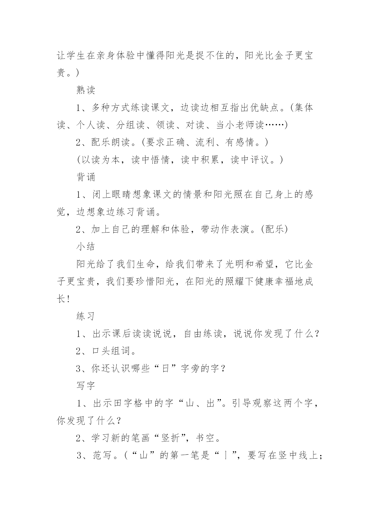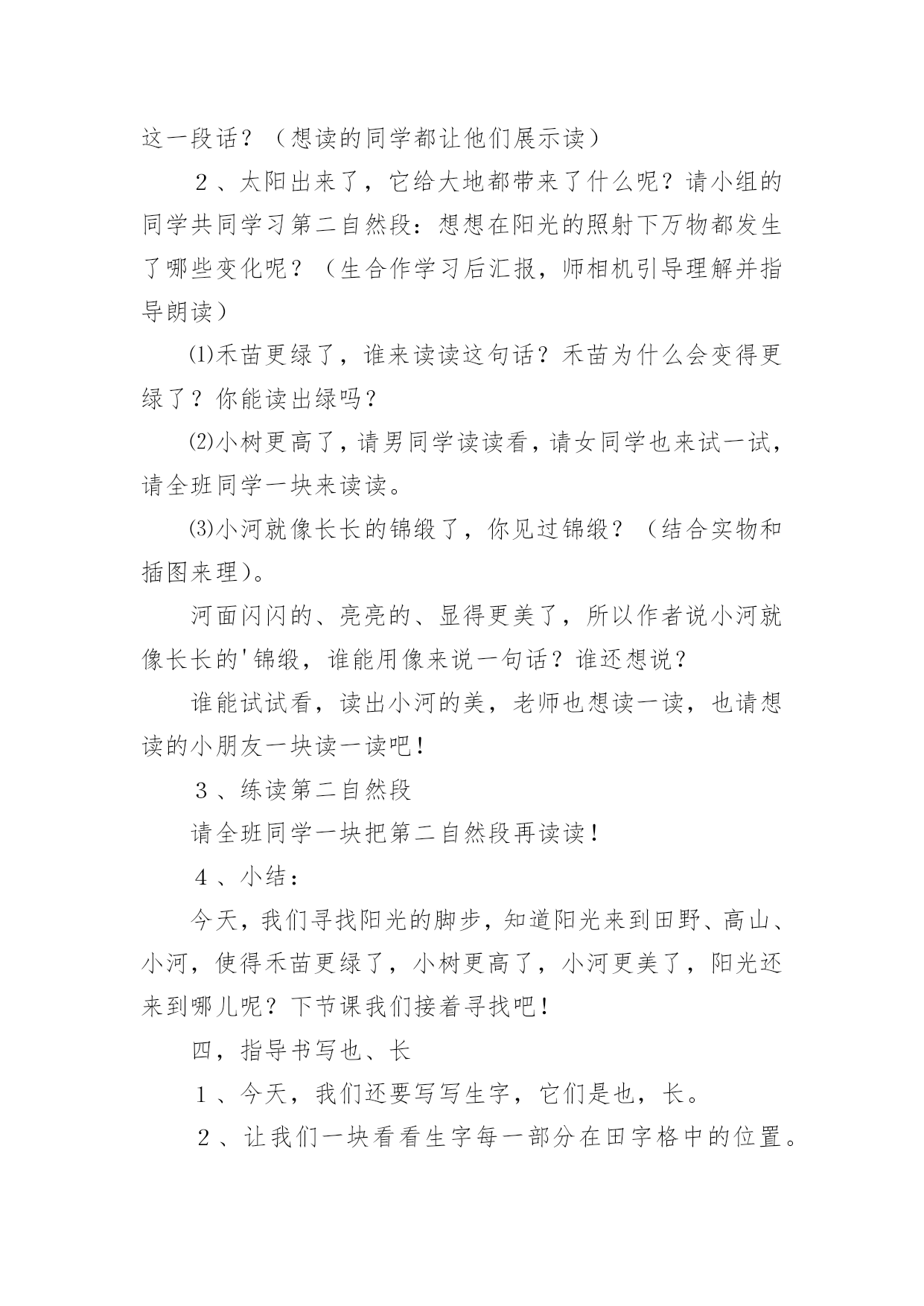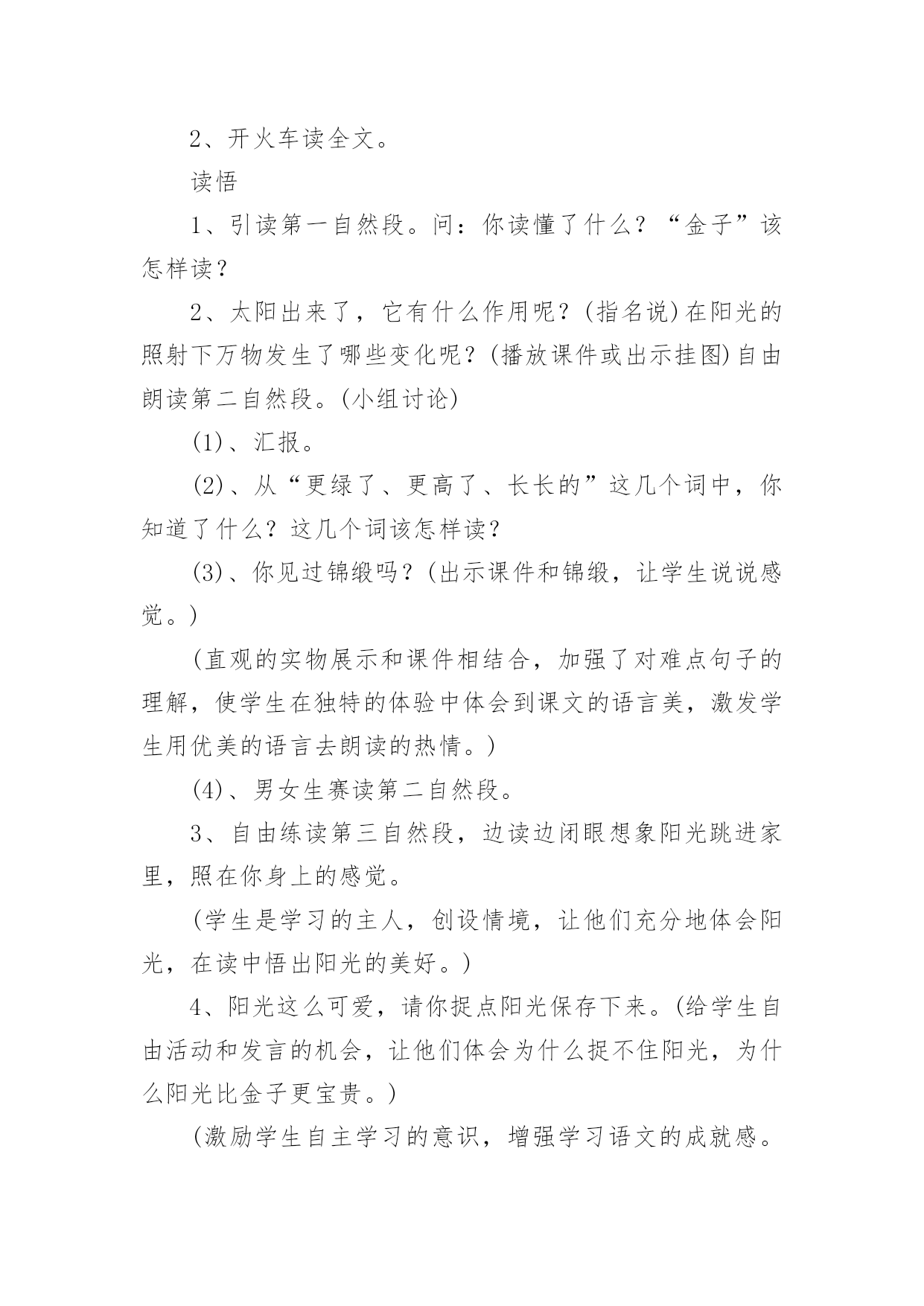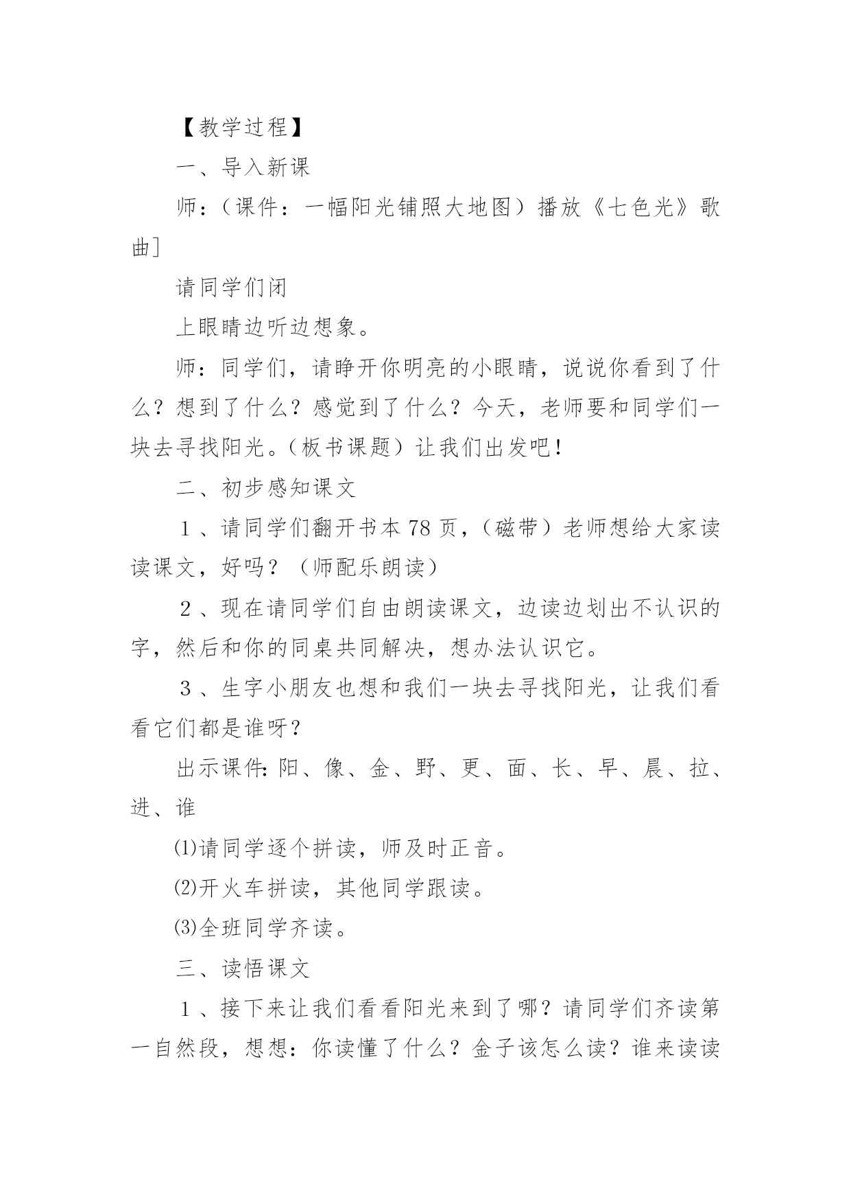 《阳光》教学设计《阳光》教学设计15篇作为一名辛苦耕耘的教育工作者,有必要进行细致的教学设计准备工作,教学设计是一个系统设计并实现学习目标的过程,它遵循学习效果最优的原则吗,是课件开发质量高低的关键所在。教学设计应该怎么写呢?以下是小编帮大家整理的《阳光》教学设计,仅供参考,希望能够帮助到大家。《阳光》教学设计1【教学目标】1、认识12个生字,会写2个生字,认识笔画竖提和偏旁阝2、正确,流利地朗读课文3、感受阳光的美好和宝贵。【教学重点、难点】重点:能读生字并练习朗读。难点:理解河面闪着阳光,小河就像长长的锦缎了这句话。【教学准备】1、生字卡片、课件。2、一条丝绸围巾3、布置学生观察阳光,充分感受阳光。【教学过程】一、导入新课师:(课件:一幅阳光铺照大地图)播放《七色光》歌曲]请同学们闭上眼睛边听边想象。师:同学们,请睁开你明亮的小眼睛,说说你看到了什么?想到了什么?感觉到了什么?今天,老师要和同学们一块去寻找阳光。(板书课题)让我们出发吧!二、初步感知课文1、请同学们翻开书本78页,(磁带)老师想给大家读读课文,好吗?(师配乐朗读)2、现在请同学们自由朗读课文,边读边划出不认识的字,然后和你的同桌共同解决,想办法认识它。3、生字小朋友也想和我们一块去寻找阳光,让我们看看它们都是谁呀?出示课件:阳、像、金、野、更、面、长、早、晨、拉、进、谁⑴请同学逐个拼读,师及时正音。⑵开火车拼读,其他同学跟读。⑶全班同学齐读。三、读悟课文1、接下来让我们看看阳光来到了哪?请同学们齐读第一自然段,想想:你读懂了什么?金子该怎么读?谁来读读这一段话?(想读的同学都让他们展示读)2、太阳出来了,它给大地都带来了什么呢?请小组的同学共同学习第二自然段:想想在阳光的照射下万物都发生了哪些变化呢?(生合作学习后汇报,师相机引导理解并指导朗读)⑴禾苗更绿了,谁来读读这句话?禾苗为什么会变得更绿了?你能读出绿吗?⑵小树更高了,请男同学读读看,请女同学也来试一试,请全班同学一块来读读。⑶小河就像长长的锦缎了,你见过锦缎?(结合实物和插图来理)。河面闪闪的、亮亮的、显得更美了,所以作者说小河就像长长的'锦缎,谁能用像来说一句话?谁还想说?谁能试试看,读出小河的美,老师也想读一读,也请想读的小朋友一块读一读吧!3、练读第二自然段请全班同学一块把第二自然段再读读!4、小结:今天,我们寻找阳光的脚步,知道阳光来到田野、高山、小河,使得禾苗更绿了,小树更高了,小河更美了,阳光还来到哪儿呢?下节课我们接着寻找吧!四,指导书写也、长1、今天,我们还要写写生字,它们是也,长。2、让我们一块看看生字每一部分在田字格中的位置。3、你来说老师来写,可要认真看噢,先写也,第一笔是横折钩,第二笔是竖,第三笔是竖弯钩,跟老师书空一遍。4、看看长,认识新笔画竖提,看看怎么写,第一笔丿第二笔是竖提,第三笔是撇第四笔是捺,请书空。5、跟老师做做写字操:抬头、挺胸、肩放平、脚放好,身子离桌一拳。(配乐)6、学生描红书写,师巡视。7、展示评议。五、结束:小朋友,下课后,让我们一块走出教室去找找阳光的脚步!【板书设计】8、阳光禾苗更绿了小树更高了小河更美了《阳光》教学设计2导入1、游戏:找朋友。(给生字宝宝找到它的拼音朋友。)2、开火车读全文。读悟1、引读第一自然段。问:你读懂了什么?“金子”该怎样读?2、太阳出来了,它有什么作用呢?(指名说)在阳光的照射下万物发生了哪些变化呢?(播放课件或出示挂图)自由朗读第二自然段。(小组讨论)(1)、汇报。(2)、从“更绿了、更高了、长长的”这几个词中,你知道了什么?这几个词该怎样读?(3)、你见过锦缎吗?(出示课件和锦缎,让学生说说感觉。)(直观的实物展示和课件相结合,加强了对难点句子的理解,使学生在独特的体验中体会到课文的语言美,激发学生用优美的语言去朗读的热情。)(4)、男女生赛读第二自然段。3、自由练读第三自然段,边读边闭眼想象阳光跳进家里,照在你身上的感觉。(学生是学习的主人,创设情境,让他们充分地体会阳光,在读中悟出阳光的美好。)4、阳光这么可爱,请你捉点阳光保存下来。(给学生自由活动和发言的机会,让他们体会为什么捉不住阳光,为什么阳光比金子更宝贵。)(激励学生自主学习的意识,增强学习语文的成就感。让学生在亲身体验中懂得阳光是捉不住的,阳光比金子更宝贵。)熟读1、多种方式练读课文,边读边相互指出优缺点。(集体读、个人读、分组读、领读、对读、当小老师读……)2、配乐朗读。(要求正确、流利、有感情。)(以读为本,读中悟情,读中积累,读中评议。)背诵1、闭上眼睛想象课文的情景和阳光照在自己身上的感觉,边想象边练习背诵。2、加上自己的理解和体验,带动作表演。(配乐)小结阳光给了我们生命,给我们带来了光明和希望,它比金子更宝贵,我们要珍惜阳光,在阳光的