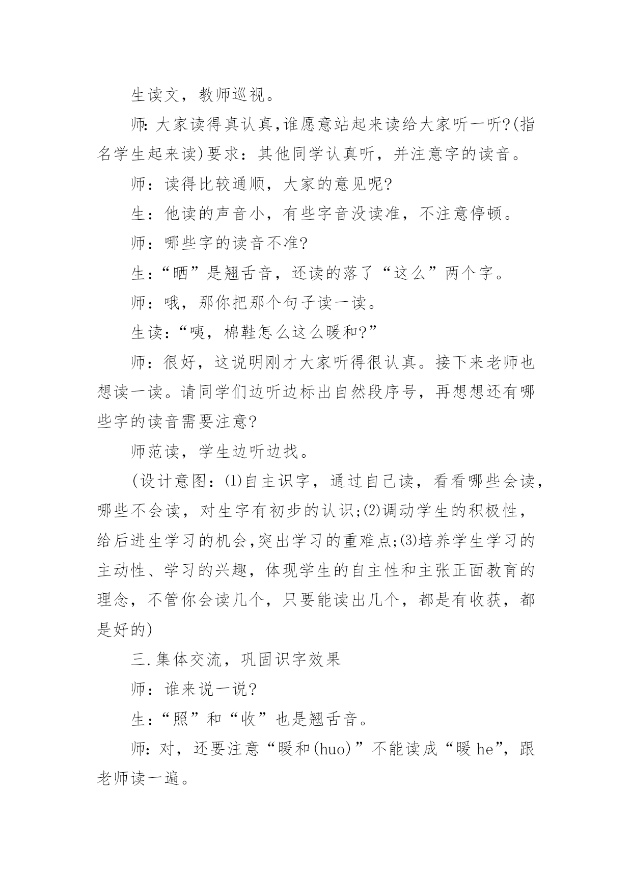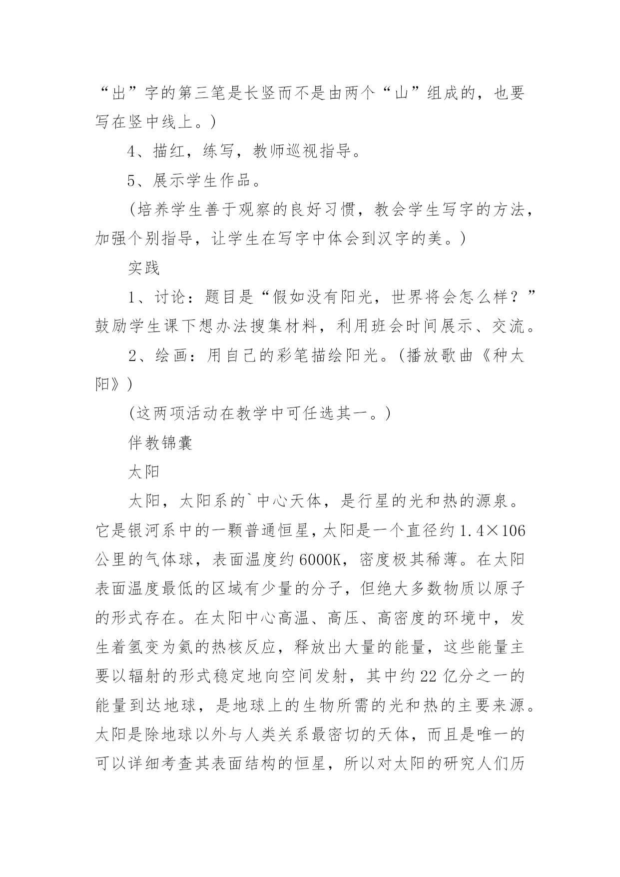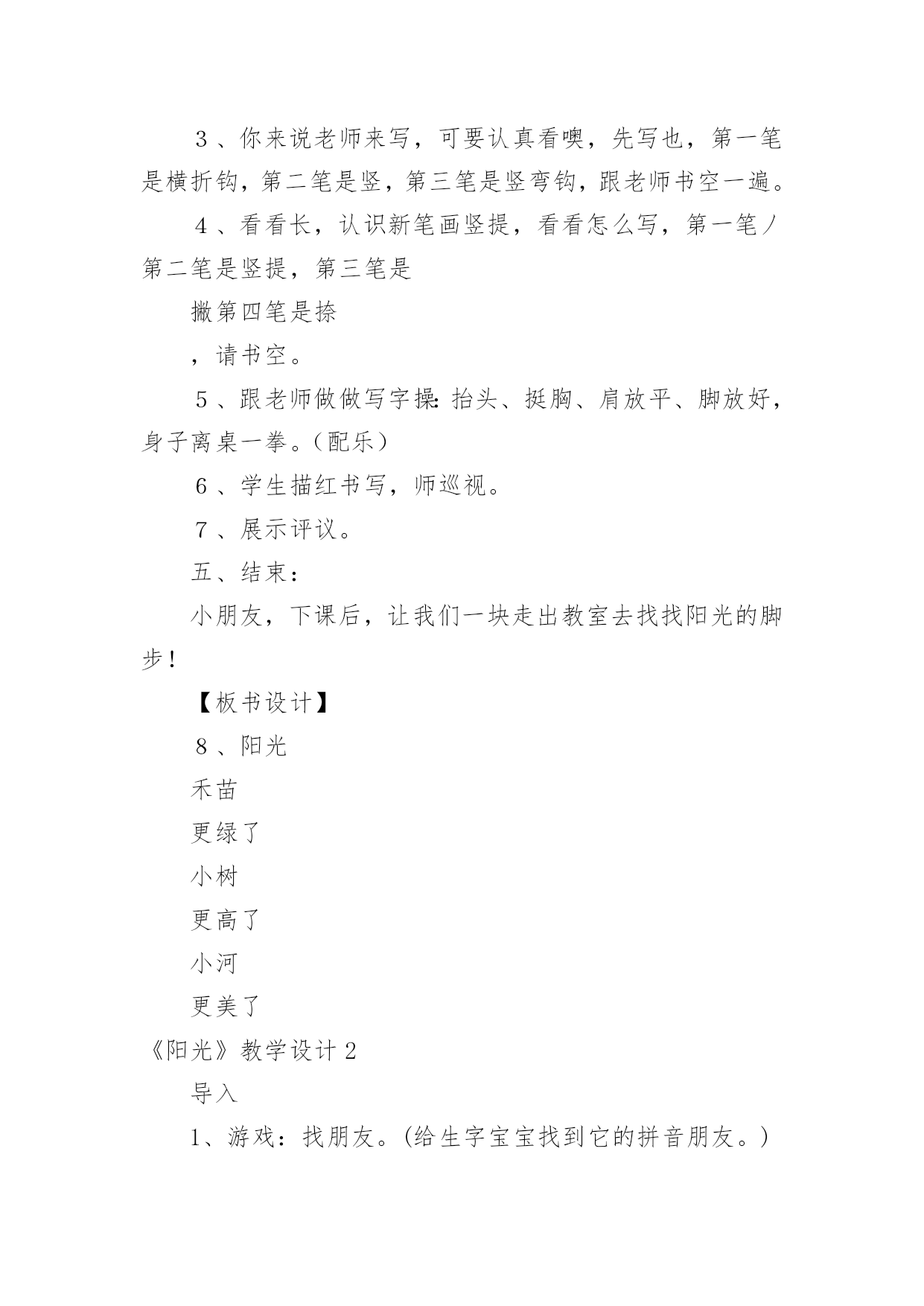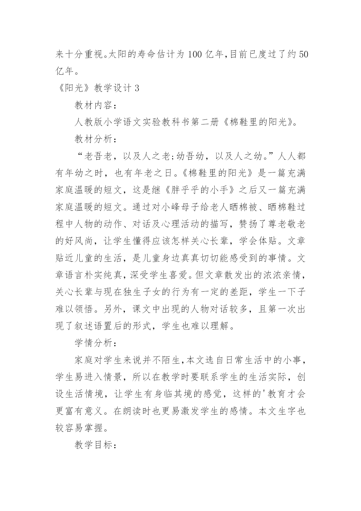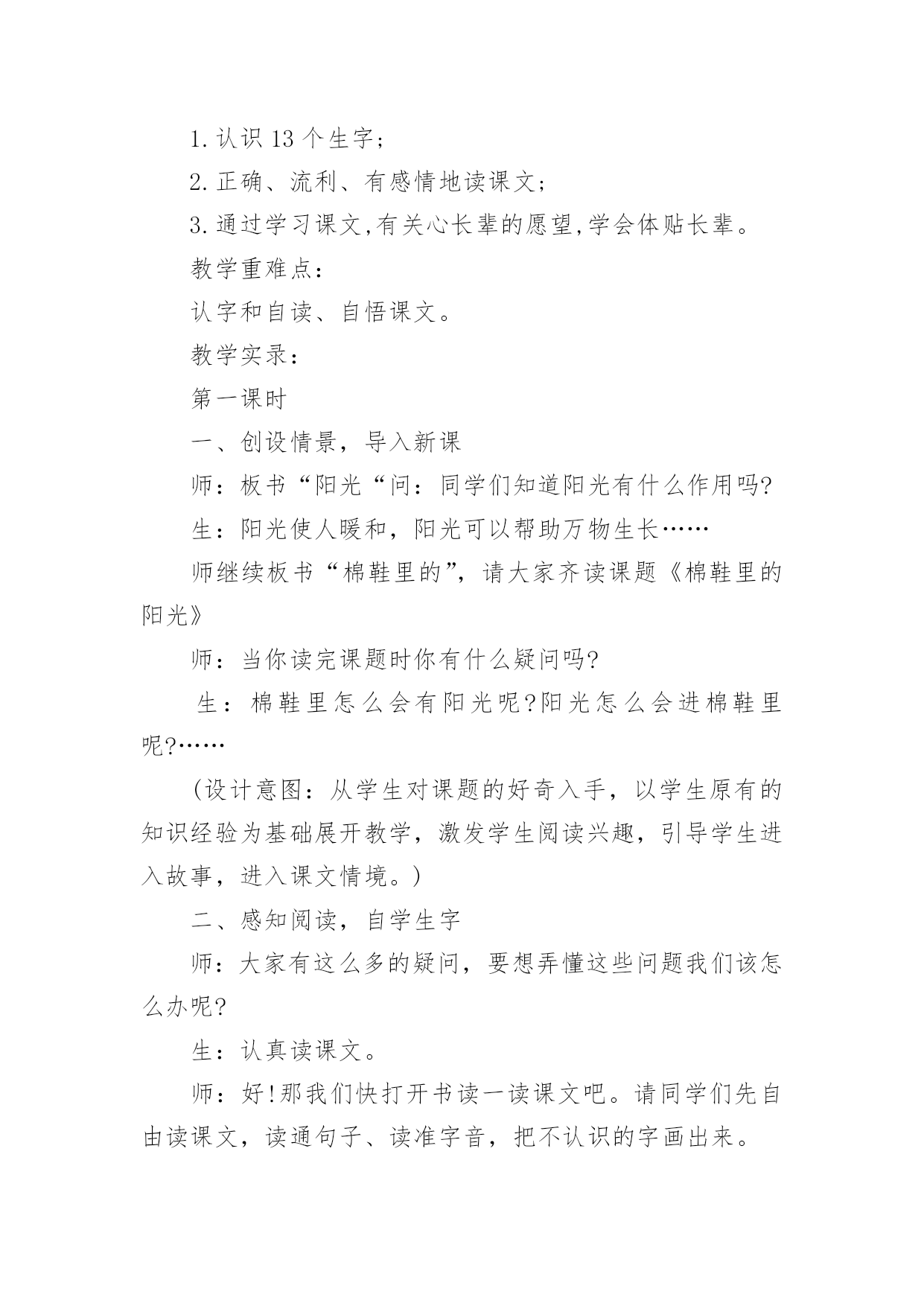 《阳光》教学设计《阳光》教学设计15篇作为一名辛苦耕耘的教育工作者,有必要进行细致的教学设计准备工作,教学设计是一个系统设计并实现学习目标的过程,它遵循学习效果最优的原则吗,是课件开发质量高低的关键所在。教学设计应该怎么写呢?以下是小编帮大家整理的《阳光》教学设计,仅供参考,希望能够帮助到大家。《阳光》教学设计1【教学目标】1、认识12个生字,会写2个生字,认识笔画竖提和偏旁阝2、正确,流利地朗读课文3、感受阳光的美好和宝贵。【教学重点、难点】重点:能读生字并练习朗读。难点:理解河面闪着阳光,小河就像长长的锦缎了这句话。【教学准备】1、生字卡片、课件。2、一条丝绸围巾3、布置学生观察阳光,充分感受阳光。【教学过程】一、导入新课师:(课件:一幅阳光铺照大地图)播放《七色光》歌曲]请同学们闭上眼睛边听边想象。师:同学们,请睁开你明亮的小眼睛,说说你看到了什么?想到了什么?感觉到了什么?今天,老师要和同学们一块去寻找阳光。(板书课题)让我们出发吧!二、初步感知课文1、请同学们翻开书本78页,(磁带)老师想给大家读读课文,好吗?(师配乐朗读)2、现在请同学们自由朗读课文,边读边划出不认识的字,然后和你的同桌共同解决,想办法认识它。3、生字小朋友也想和我们一块去寻找阳光,让我们看看它们都是谁呀?出示课件:阳、像、金、野、更、面、长、早、晨、拉、进、谁⑴请同学逐个拼读,师及时正音。⑵开火车拼读,其他同学跟读。⑶全班同学齐读。三、读悟课文1、接下来让我们看看阳光来到了哪?请同学们齐读第一自然段,想想:你读懂了什么?金子该怎么读?谁来读读这一段话?(想读的同学都让他们展示读)2、太阳出来了,它给大地都带来了什么呢?请小组的同学共同学习第二自然段:想想在阳光的照射下万物都发生了哪些变化呢?(生合作学习后汇报,师相机引导理解并指导朗读)⑴禾苗更绿了,谁来读读这句话?禾苗为什么会变得更绿了?你能读出绿吗?⑵小树更高了,请男同学读读看,请女同学也来试一试,请全班同学一块来读读。⑶小河就像长长的锦缎了,你见过锦缎?(结合实物和插图来理)。河面闪闪的、亮亮的、显得更美了,所以作者说小河就像长长的'锦缎,谁能用像来说一句话?谁还想说?谁能试试看,读出小河的美,老师也想读一读,也请想读的小朋友一块读一读吧!3、练读第二自然段请全班同学一块把第二自然段再读读!4、小结:今天,我们寻找阳光的脚步,知道阳光来到田野、高山、小河,使得禾苗更绿了,小树更高了,小河更美了,阳光还来到哪儿呢?下节课我们接着寻找吧!四,指导书写也、长1、今天,我们还要写写生字,它们是也,长。2、让我们一块看看生字每一部分在田字格中的位置。3、你来说老师来写,可要认真看噢,先写也,第一笔是横折钩,第二笔是竖,第三笔是竖弯钩,跟老师书空一遍。4、看看长,认识新笔画竖提,看看怎么写,第一笔丿第二笔是竖提,第三笔是撇第四笔是捺,请书空。5、跟老师做做写字操:抬头、挺胸、肩放平、脚放好,身子离桌一拳。(配乐)6、学生描红书写,师巡视。7、展示评议。五、结束:小朋友,下课后,让我们一块走出教室去找找阳光的脚步!【板书设计】8、阳光禾苗更绿了小树更高了小河更美了《阳光》教学设计2导入1、游戏:找朋友。(给生字宝宝找到它的拼音朋友。)2、开火车读全文。读悟1、引读第一自然段。问:你读懂了什么?“金子”该怎样读?2、太阳出来了,它有什么作用呢?(指名说)在阳光的照射下万物发生了哪些变化呢?(播放课件或出示挂图)自由朗读第二自然段。(小组讨论)(1)、汇报。(2)、从“更绿了、更高了、长长的”这几个词中,你知道了什么?这几个词该怎样读?(3)、你见过锦缎吗?(出示课件和锦缎,让学生说说感觉。)(直观的实物展示和课件相结合,加强了对难点句子的理解,使学生在独特的体验中体会到课文的语言美,激发学生用优美的语言去朗读的热情。)(4)、男女生赛读第二自然段。3、自由练读第三自然段,边读边闭眼想象阳光跳进家里,照在你身上的感觉。(学生是学习的主人,创设情境,让他们充分地体会阳光,在读中悟出阳光的美好。)4、阳光这么可爱,请你捉点阳光保存下来。(给学生自由活动和发言的机会,让他们体会为什么捉不住阳光,为什么阳光比金子更宝贵。)(激励学生自主学习的意识,增强学习语文的成就感。让学生在亲身体验中懂得阳光是捉不住的,阳光比金子更宝贵。)熟读1、多种方式练读课文,边读边相互指出优缺点。(集体读、个人读、分组读、领读、对读、当小老师读……)2、配乐朗读。(要求正确、流利、有感情。)(以读为本,读中悟情,读中积累,读中评议。)背诵1、闭上眼睛想象课文的情景和阳光照在自己身上的感觉,边想象边练习背诵。2、加上自己的理解和体验,带动作表演。(配乐)小结阳光给了我们生命,给我们带来了光明和希望,它比金子更宝贵,我们要珍惜阳光,在阳光的
