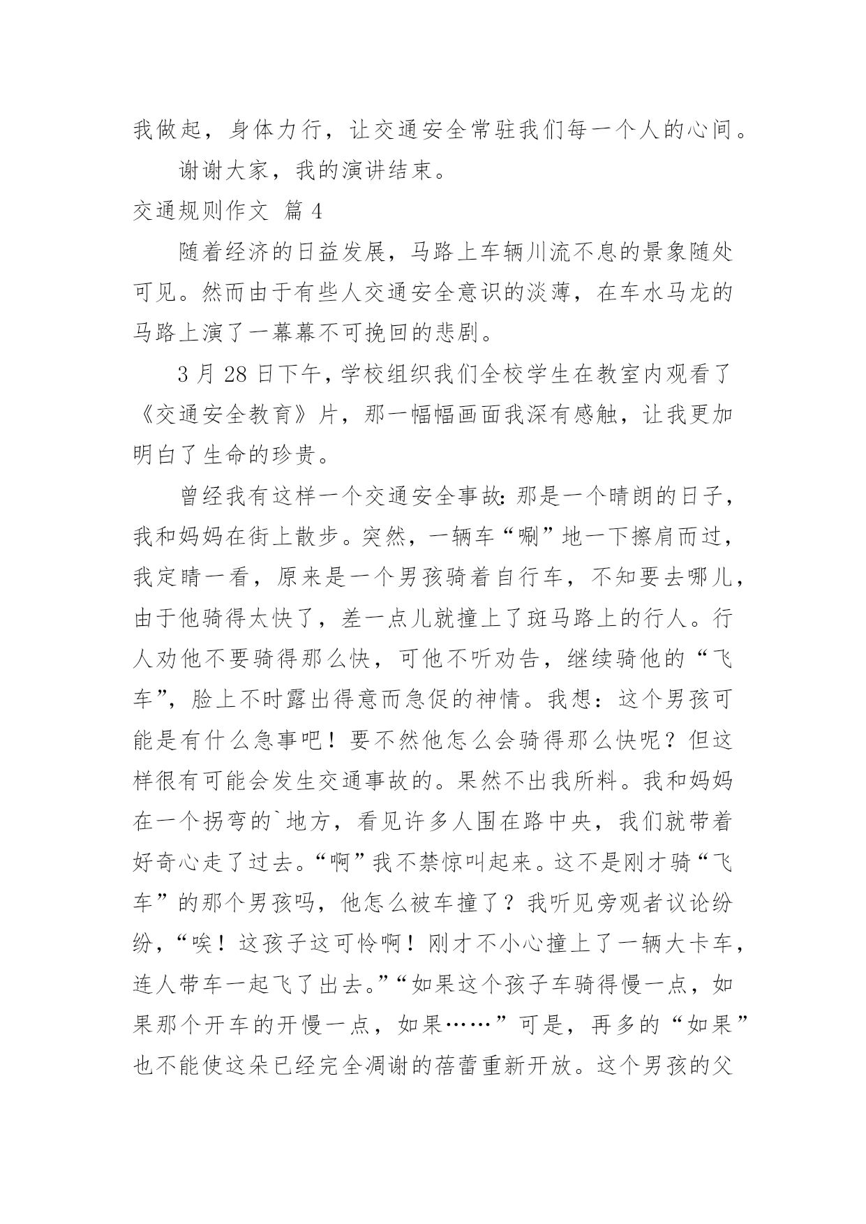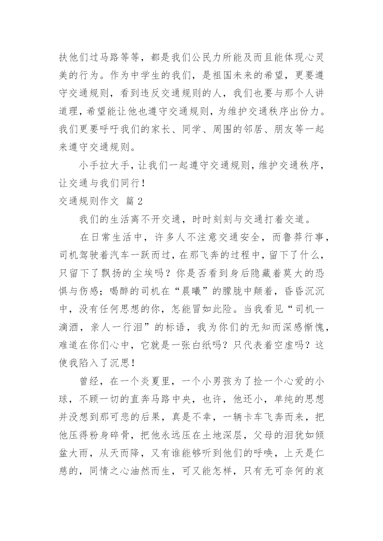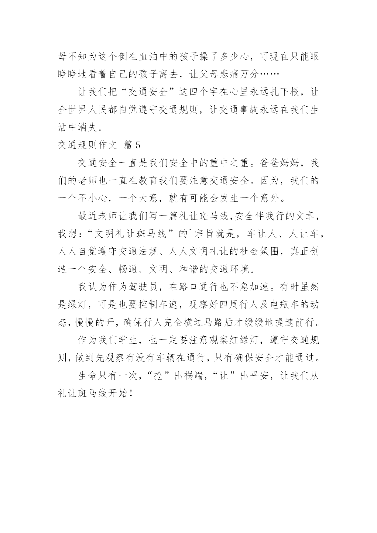 交通规则作文交通规则作文(优)在学习、工作或生活中,大家一定都接触过作文吧,写作文可以锻炼我们的独处习惯,让自己的心静下来,思考自己未来的方向。怎么写作文才能避免踩雷呢?以下是小编精心整理的交通规则作文7篇,欢迎大家分享。交通规则作文篇1生活处处少不了交通,在纵横交错的大马路上,各种车辆及行人来来往往,而管理他们的,就要数交通规则了。交通规则是道德规范,更是法律规范,我就来说说酒后驾车吧。在刚刚过去的五一假期中,我的.一个邻居开着私家车带着他儿子去常州玩,在吃晚饭时喝了很多酒,结果回家的路上正好撞上警察检察酒后驾车,检察结果是酒精超标,被处以驾照扣12分且没收,罚款800的处分,才了结此事。本来快乐的一天就被这件事打破了。这位邻居回家后还对着我们“诉苦”,随后其他人议论纷纷。有人说:“你知道要开车还要喝酒,是自找苦吃啊!”还有人说:“幸亏没出大事,你啊,开车要当心,可别再发生这种事了。”我认为,交通规则是要我们遵守的,交通秩序是要我们维护的,我们不能违反交通规则,要以身作则。我们再将视野缩小到每一个小细节,它们对交通秩序也很有帮助。比如每一次“红灯停,绿灯行”,每一次捡掉路上的一个垃圾或几块石头,每一次给老人、残疾人等让路,扶他们过马路等等,都是我们公民力所能及而且能体现心灵美的行为。作为中学生的我们,是祖国未来的希望,更要遵守交通规则,看到违反交通规则的人,我们也要与那个人讲道理,希望能让他也遵守交通规则,为维护交通秩序出份力。我们更要呼吁我们的家长、同学、周围的邻居、朋友等一起来遵守交通规则。小手拉大手,让我们一起遵守交通规则,维护交通秩序,让交通与我们同行!交通规则作文篇2我们的生活离不开交通,时时刻刻与交通打着交道。在日常生活中,许多人不注意交通安全,而鲁莽行事,司机驾驶着汽车一跃而过,在那飞奔的过程中,留下了什么,只留下了飘扬的尘埃吗?你是否看到身后隐藏着莫大的恐惧与伤感;喝醉的司机在“晨曦”的朦胧中颠着,昏昏沉沉中,没有任何思想的你,怎能冒如此险。当我看见“司机一滴酒,亲人一行泪”的标语,我为你们的无知而深感惭愧,难道在你们心中,它就是一张白纸吗?只代表着空虚吗?这使我陷入了沉思!曾经,在一个炎夏里,一个小男孩为了捡一个心爱的小球,不顾一切的直奔马路中央,也许,他还小,单纯的思想并没想到那可悲的后果,真是不幸,一辆卡车飞奔而来,把他压得粉身碎骨,把他永远压在土地深层,父母的泪犹如倾盆大雨,从天而降,又有谁能够听到他们的呼唤,上天是仁慈的,同情之心油然而生,可又能怎样,只有无可奈何的哀叹,忍受着痛苦,真是可悲啊!一辆载重汽车由于超载以至被滚下那万丈深渊,那轰隆声回响山谷,可那位年轻的司机却抛弃一切毫无声息的走了,走得那样伤感,那样的悲痛。那一件件血淋淋的事实在我们的眼前一闪而过,可那悲痛的情景却铭刻于心,那是血的挣扎,那是痛苦的泪痕,那是同情的目光。在一次次恶剧不断重演之时,我们是否有所体会,难道不应该为此而珍惜宝贵的生命吗?也许他们死不瞑目,在黑暗中,那哀叹永不停息。也许,他们在告诫我们:应该注意交通安全,珍惜拥有。这是他们唯一的话语,这是他们一生中最为精典的佳话。他们已深深领悟到生命的脆弱与顽强,它取决于你对它的珍惜。遵守交通,注意交通安全,这是全人类的呼唤,大家没有理由,只有责任,有为全人类生活美满幸福的责任,这便是大家唯一的准则。亲爱的同学们,朋友们,珍惜自己的生命吧,做一个合格的公民,遵守交通安全、交通法规,让幸福永远伴随着我们,在那时候,你将会知道交通安全的重要性与对于生命的垄断,为了一切,让我们共同为交通事业而努力、共同欢呼、共同为祖国取下最为灿烂的一页,让那交通的泪痕永不渗出,在那张白净的脸上露出幸福的微笑!随着交通事业的发展,在现代交通日益发达的今天。我国马路交通事业日新月异,人们日常的出行,也成为社会生活中的重要组成部分,同时也给马路交通安全到来了新的课题。对于我们这些祖国未来的接班人来说文明遵守交通规则,更是尤为重要。马路行车是一种社会行为,是否遵守交通规则,它直接反映了一个国家的公民素质。许多人认识不足,不理解,总认为是个人的事。缺少法制观念和社会责任感,有的甚至只图个人的方便,想怎么走就怎么走。违反交通秩序,直至酿成交通事故,造成不必要的财产损失和人员伤亡。所以目前一个首要问题就应该加强交通管理法制化,科学化,文明化,形成良好的'习惯和道德风尚。有时我在放学回家的路上,看见中学生冒着寒风,在路口体验“交通协管员”的工作,在红灯亮时,有一小伙子置协管员呼声不顾,仍要往前冲,被协管员强行拦住,小伙子对协管员破口大骂,甚至拳脚相加,对协管员不尊重,不服管的现象屡见不鲜。一些骑车人和行人只有在交警面前,才会自觉些,而很少把协管员当回事,甚至恶语相加,其实,从某种以上来说,这是不尊重自己的生命,换