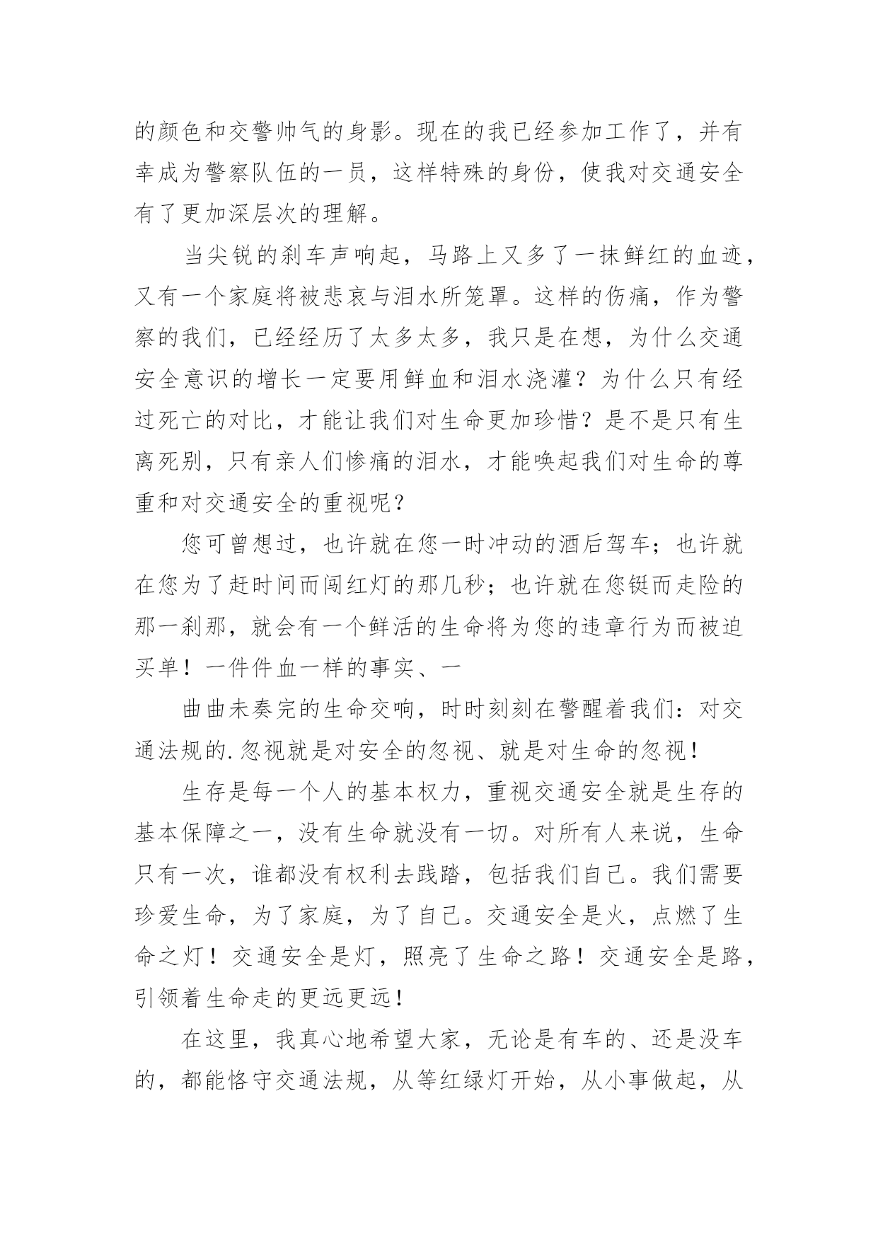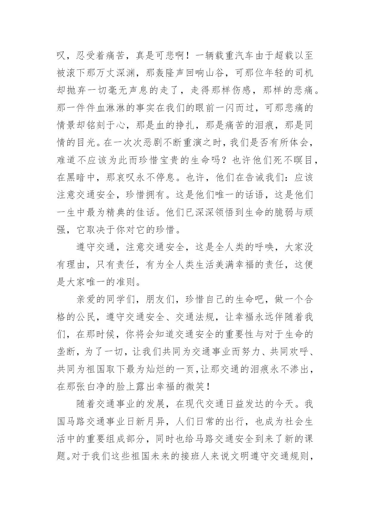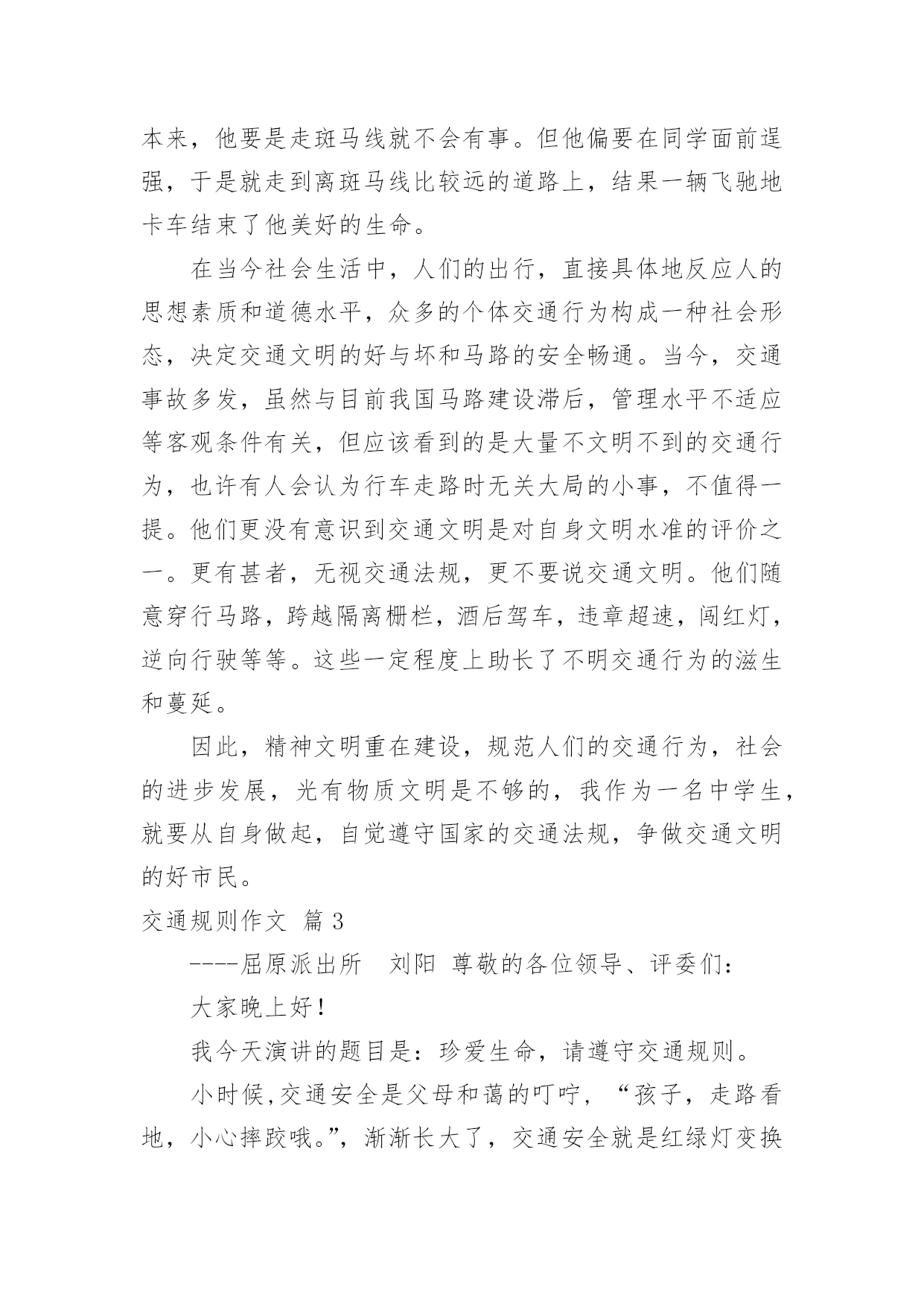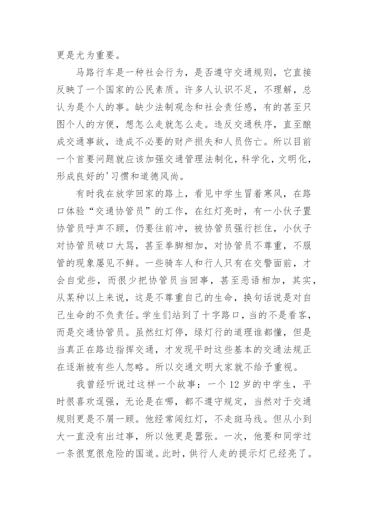 交通规则作文交通规则作文(优)在学习、工作或生活中,大家一定都接触过作文吧,写作文可以锻炼我们的独处习惯,让自己的心静下来,思考自己未来的方向。怎么写作文才能避免踩雷呢?以下是小编精心整理的交通规则作文7篇,欢迎大家分享。交通规则作文篇1生活处处少不了交通,在纵横交错的大马路上,各种车辆及行人来来往往,而管理他们的,就要数交通规则了。交通规则是道德规范,更是法律规范,我就来说说酒后驾车吧。在刚刚过去的五一假期中,我的.一个邻居开着私家车带着他儿子去常州玩,在吃晚饭时喝了很多酒,结果回家的路上正好撞上警察检察酒后驾车,检察结果是酒精超标,被处以驾照扣12分且没收,罚款800的处分,才了结此事。本来快乐的一天就被这件事打破了。这位邻居回家后还对着我们“诉苦”,随后其他人议论纷纷。有人说:“你知道要开车还要喝酒,是自找苦吃啊!”还有人说:“幸亏没出大事,你啊,开车要当心,可别再发生这种事了。”我认为,交通规则是要我们遵守的,交通秩序是要我们维护的,我们不能违反交通规则,要以身作则。我们再将视野缩小到每一个小细节,它们对交通秩序也很有帮助。比如每一次“红灯停,绿灯行”,每一次捡掉路上的一个垃圾或几块石头,每一次给老人、残疾人等让路,扶他们过马路等等,都是我们公民力所能及而且能体现心灵美的行为。作为中学生的我们,是祖国未来的希望,更要遵守交通规则,看到违反交通规则的人,我们也要与那个人讲道理,希望能让他也遵守交通规则,为维护交通秩序出份力。我们更要呼吁我们的家长、同学、周围的邻居、朋友等一起来遵守交通规则。小手拉大手,让我们一起遵守交通规则,维护交通秩序,让交通与我们同行!交通规则作文篇2我们的生活离不开交通,时时刻刻与交通打着交道。在日常生活中,许多人不注意交通安全,而鲁莽行事,司机驾驶着汽车一跃而过,在那飞奔的过程中,留下了什么,只留下了飘扬的尘埃吗?你是否看到身后隐藏着莫大的恐惧与伤感;喝醉的司机在“晨曦”的朦胧中颠着,昏昏沉沉中,没有任何思想的你,怎能冒如此险。当我看见“司机一滴酒,亲人一行泪”的标语,我为你们的无知而深感惭愧,难道在你们心中,它就是一张白纸吗?只代表着空虚吗?这使我陷入了沉思!曾经,在一个炎夏里,一个小男孩为了捡一个心爱的小球,不顾一切的直奔马路中央,也许,他还小,单纯的思想并没想到那可悲的后果,真是不幸,一辆卡车飞奔而来,把他压得粉身碎骨,把他永远压在土地深层,父母的泪犹如倾盆大雨,从天而降,又有谁能够听到他们的呼唤,上天是仁慈的,同情之心油然而生,可又能怎样,只有无可奈何的哀叹,忍受着痛苦,真是可悲啊!一辆载重汽车由于超载以至被滚下那万丈深渊,那轰隆声回响山谷,可那位年轻的司机却抛弃一切毫无声息的走了,走得那样伤感,那样的悲痛。那一件件血淋淋的事实在我们的眼前一闪而过,可那悲痛的情景却铭刻于心,那是血的挣扎,那是痛苦的泪痕,那是同情的目光。在一次次恶剧不断重演之时,我们是否有所体会,难道不应该为此而珍惜宝贵的生命吗?也许他们死不瞑目,在黑暗中,那哀叹永不停息。也许,他们在告诫我们:应该注意交通安全,珍惜拥有。这是他们唯一的话语,这是他们一生中最为精典的佳话。他们已深深领悟到生命的脆弱与顽强,它取决于你对它的珍惜。遵守交通,注意交通安全,这是全人类的呼唤,大家没有理由,只有责任,有为全人类生活美满幸福的责任,这便是大家唯一的准则。亲爱的同学们,朋友们,珍惜自己的生命吧,做一个合格的公民,遵守交通安全、交通法规,让幸福永远伴随着我们,在那时候,你将会知道交通安全的重要性与对于生命的垄断,为了一切,让我们共同为交通事业而努力、共同欢呼、共同为祖国取下最为灿烂的一页,让那交通的泪痕永不渗出,在那张白净的脸上露出幸福的微笑!随着交通事业的发展,在现代交通日益发达的今天。我国马路交通事业日新月异,人们日常的出行,也成为社会生活中的重要组成部分,同时也给马路交通安全到来了新的课题。对于我们这些祖国未来的接班人来说文明遵守交通规则,更是尤为重要。马路行车是一种社会行为,是否遵守交通规则,它直接反映了一个国家的公民素质。许多人认识不足,不理解,总认为是个人的事。缺少法制观念和社会责任感,有的甚至只图个人的方便,想怎么走就怎么走。违反交通秩序,直至酿成交通事故,造成不必要的财产损失和人员伤亡。所以目前一个首要问题就应该加强交通管理法制化,科学化,文明化,形成良好的'习惯和道德风尚。有时我在放学回家的路上,看见中学生冒着寒风,在路口体验“交通协管员”的工作,在红灯亮时,有一小伙子置协管员呼声不顾,仍要往前冲,被协管员强行拦住,小伙子对协管员破口大骂,甚至拳脚相加,对协管员不尊重,不服管的现象屡见不鲜。一些骑车人和行人只有在交警面前,才会自觉些,而很少把协管员当回事,甚至恶语相加,其实,从某种以上来说,这是不尊重自己的生命,换