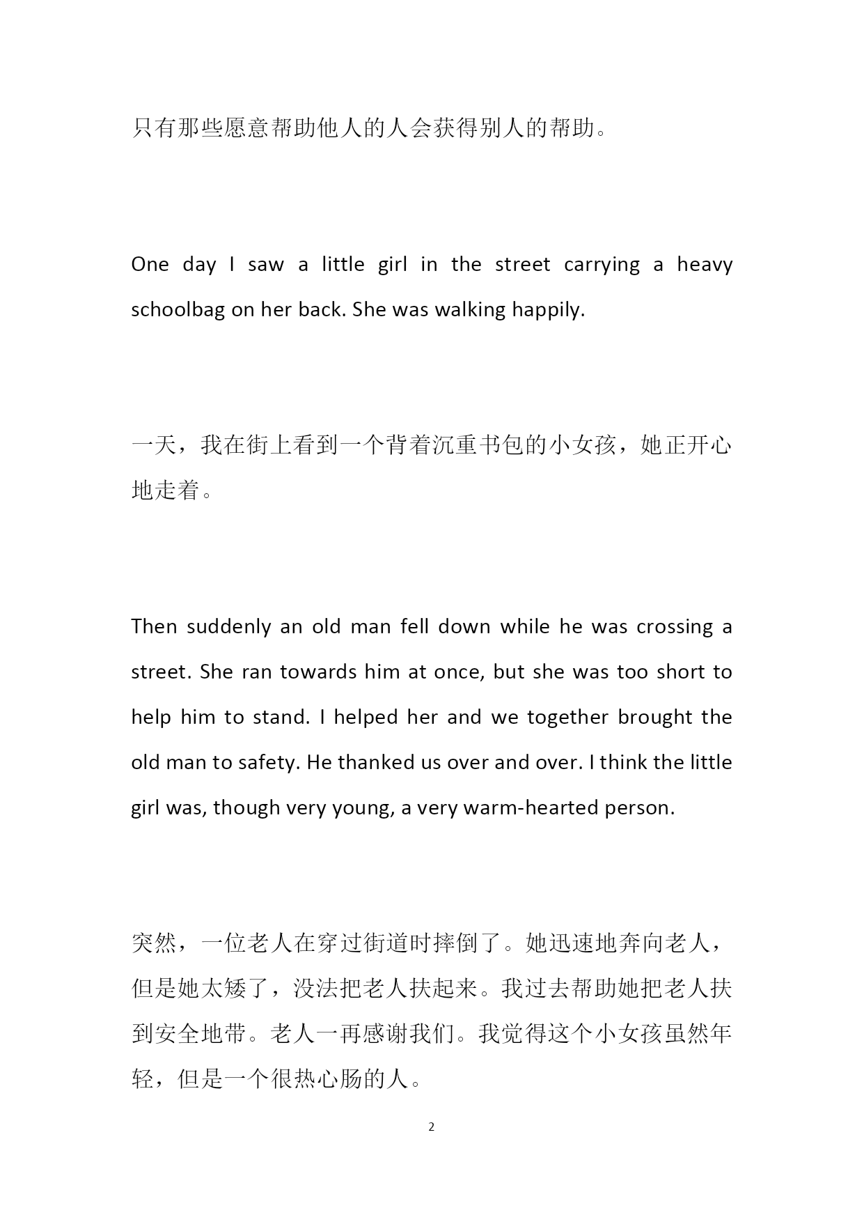 PAGE\*MERGEFORMAT2中考英语作文范例:学会互助题目:请以“EveryoneNeedsHelp”为题,写一篇不少于60单词的作文。EveryoneNeedsHelp1Didyougetanyhelpfromothers?2Didyougiveanyhelptopeoplewhentheyneeded?3Tellyourstory参考作文Inourdailylife,wearedealingwithdifferentkindsofpeople,nomatterathome,inschool,oratsomeotherplaces.Everyoneneedshelp,Ithink.Andonlywhoarewillingtohelpotherswillalsobehelped.在我们的日常生活中我们会遇到各种各样的人,无论是在家里、学校,还是在其他地方,我觉得我们都需要帮助。并且只有那些愿意帮助他人的人会获得别人的帮助。OnedayIsawalittlegirlinthestreetcarryingaheavyschoolbagonherback.Shewaswalkinghappily.一天,我在街上看到一个背着沉重书包的小女孩,她正开心地走着。Thensuddenlyanoldmanfelldownwhilehewascrossingastreet.Sherantowardshimatonce,butshewastooshorttohelphimtostand.Ihelpedherandwetogetherbroughttheoldmantosafety.Hethankedusoverandover.Ithinkthelittlegirlwas,thoughveryyoung,averywarm-heartedperson.突然,一位老人在穿过街道时摔倒了。她迅速地奔向老人,但是她太矮了,没法把老人扶起来。我过去帮助她把老人扶到安全地带。老人一再感谢我们。我觉得这个小女孩虽然年轻,但是一个很热心肠的人。