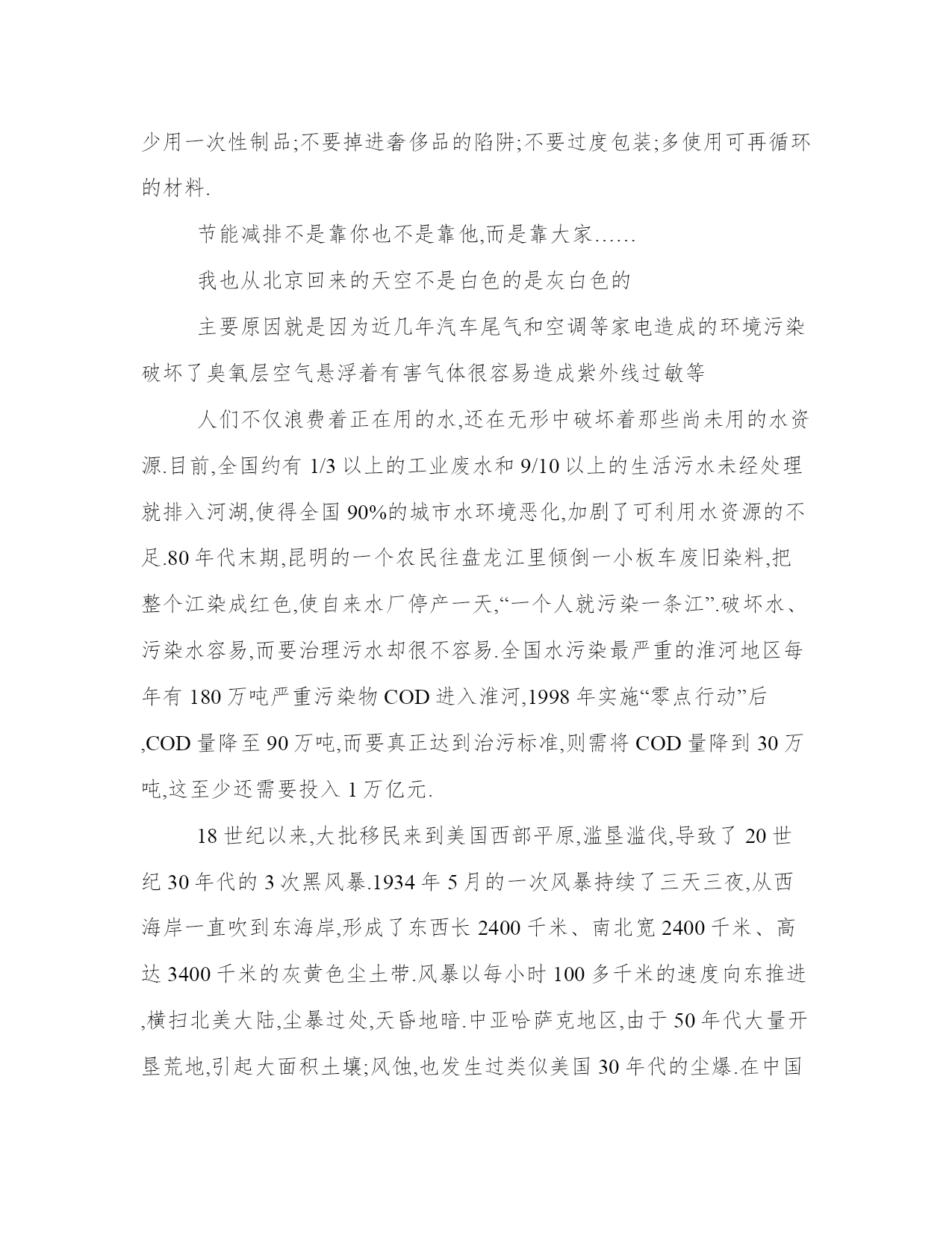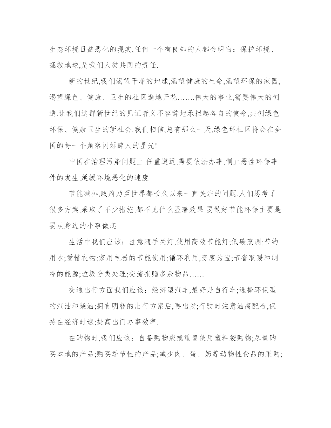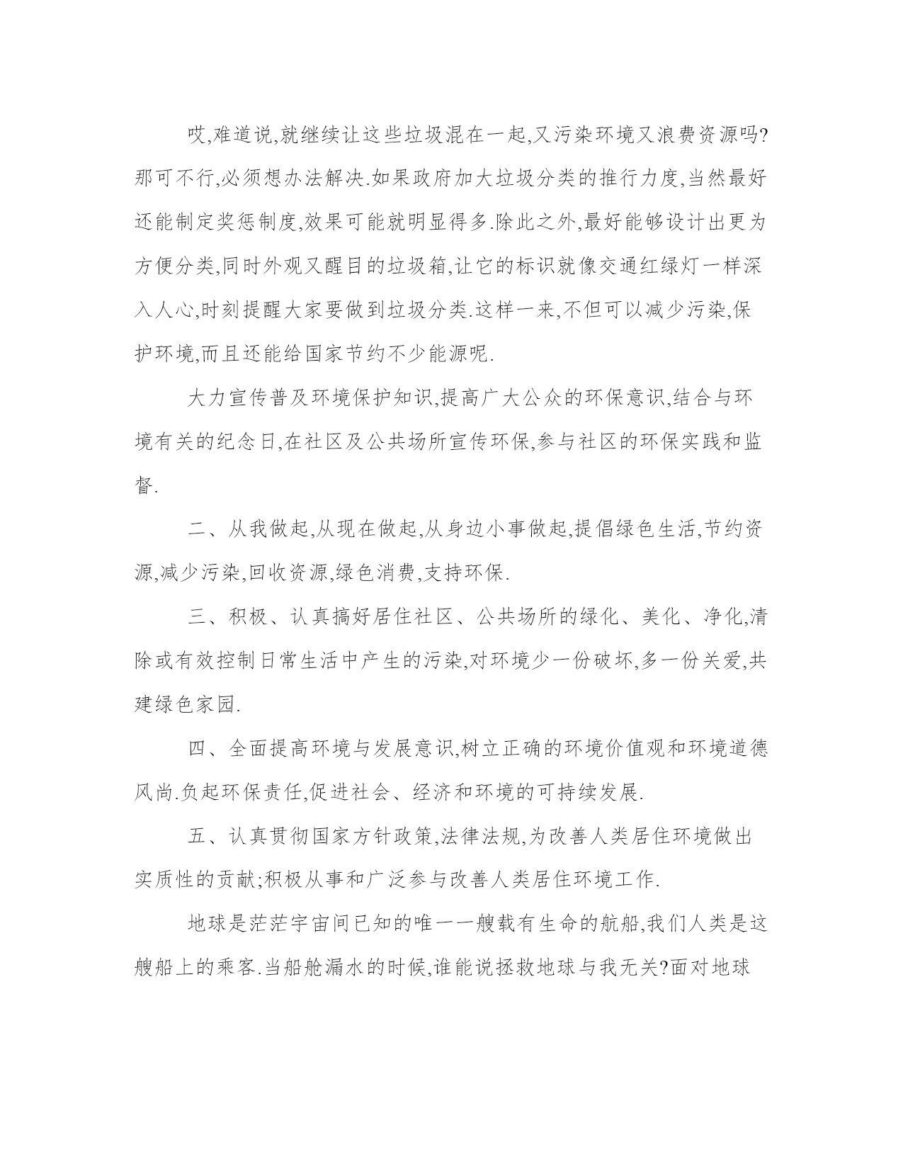 关于环保的建议书(二)别把垃圾浪费掉你知道吗?我国每年都有价值250亿元的资源被白白浪费了!这些资源既不是石油也不是天然气,更不是高科技产品,而是我们每个家庭每天都在产生的生活垃圾.由于我们没有将垃圾进行适当的分类,不仅使那些可利用而没有得到利用的废弃物成为二次污染的源头,而且还造成巨大的资源浪费,实在是太可惜了!让我们先来看一看生活垃圾全部混在一起都会带来哪些后果吧!首先,会增加填埋或焚烧的垃圾量.仅在我们北京,垃圾占地就已达1万亩啦,焚烧垃圾越多,释放的有毒气体也就越多,同时还会产生有害炉渣和灰尘呢,这些都对我们的健康构成了极大威胁.我们再来算算垃圾不分类会造成多大的资源浪费吧.据有关部门统计,我国每年约有300万吨废钢铁,600万吨废纸没得到利用.而我们经常随手丢弃的废干电池,每年就有60多亿只,里面总共含有7万多吨锌,10万吨二氧化锰呢.这些资源如果都能被重新利用,将会成为多大的社会财富啊.既然垃圾分类这么重要,为什么大家总是做不好呢?我们调查后发现,很多人怕麻烦、环保意识不够,还有一个重要的原因是,大街上和社区里方便分类垃圾箱特别少,让人们很难养成垃圾分类的好习惯.哎,难道说,就继续让这些垃圾混在一起,又污染环境又浪费资源吗?那可不行,必须想办法解决.如果政府加大垃圾分类的推行力度,当然最好还能制定奖惩制度,效果可能就明显得多.除此之外,最好能够设计出更为方便分类,同时外观又醒目的垃圾箱,让它的标识就像交通红绿灯一样深入人心,时刻提醒大家要做到垃圾分类.这样一来,不但可以减少污染,保护环境,而且还能给国家节约不少能源呢.大力宣传普及环境保护知识,提高广大公众的环保意识,结合与环境有关的纪念日,在社区及公共场所宣传环保,参与社区的环保实践和监督.二、从我做起,从现在做起,从身边小事做起,提倡绿色生活,节约资源,减少污染,回收资源,绿色消费,支持环保.三、积极、认真搞好居住社区、公共场所的绿化、美化、净化,清除或有效控制日常生活中产生的污染,对环境少一份破坏,多一份关爱,共建绿色家园.四、全面提高环境与发展意识,树立正确的环境价值观和环境道德风尚.负起环保责任,促进社会、经济和环境的可持续发展.五、认真贯彻国家方针政策,法律法规,为改善人类居住环境做出实质性的贡献;积极从事和广泛参与改善人类居住环境工作.地球是茫茫宇宙间已知的唯一一艘载有生命的航船,我们人类是这艘船上的乘客.当船舱漏水的时候,谁能说拯救地球与我无关?面对地球生态环境日益恶化的现实,任何一个有良知的人都会明白:保护环境、拯救地球,是我们人类共同的责任.新的世纪,我们渴望干净的地球,渴望健康的生命,渴望环保的家园,渴望绿色、健康、卫生的社区遍地开花…….伟大的事业,需要伟大的创造.让我们这群新世纪的见证者义不容辞地承担起各自的使命,共创绿色环保、健康卫生的新社会.我们相信,总有那么一天,绿色环社区将会在全国的每一个角落闪烁醉人的星光!中国在治理污染问题上,任重道远,需要依法办事,制止恶性环保事件的发生,延缓环境恶化的速度.节能减排,政府乃至世界都长久以来一直关注的问题.人们思考了很多方案,采取了不少措施,都不见什么显著效果,要做好节能环保主要是要从身边的小事做起.生活中我们应该:注意随手关灯,使用高效节能灯;低碳烹调;节约用水;爱惜衣物;家用电器的节能使用;循环利用,变废为宝;节省取暖和制冷的能源;垃圾分类处理;交流捐赠多余物品……交通出行方面我们应该:经济型汽车,最好是自行车;选择环保型的汽油和柴油;拥有明智的出行方案后,再出发;行驶时注意油离配合,保持在经济时速;提高出门办事效率.在购物时,我们应该:自备购物袋或重复使用塑料袋购物;尽量购买本地的产品;购买季节性的产品;减少肉、蛋、奶等动物性食品的采购;少用一次性制品;不要掉进奢侈品的陷阱;不要过度包装;多使用可再循环的材料.节能减排不是靠你也不是靠他,而是靠大家……我也从北京回来的天空不是白色的是灰白色的主要原因就是因为近几年汽车尾气和空调等家电造成的环境污染破坏了臭氧层空气悬浮着有害气体很容易造成紫外线过敏等人们不仅浪费着正在用的水,还在无形中破坏着那些尚未用的水资源.目前,全国约有1/3以上的工业废水和9/10以上的生活污水未经处理就排入河湖,使得全国90%的城市水环境恶化,加剧了可利用水资源的不足.80年代末期,昆明的一个农民往盘龙江里倾倒一小板车废旧染料,把整个江染成红色,使自来水厂停产一天,“一个人就污染一条江”.破坏水、污染水容易,而要治理污水却很不容易.全国水污染最严重的淮河地区每年有180万吨严重污染物COD进入淮河,1998年实施“零点行动”后,COD量降至90万吨,而要真正达到治污标准,则需将COD量降到30万吨,这至少还需要投入1万亿元