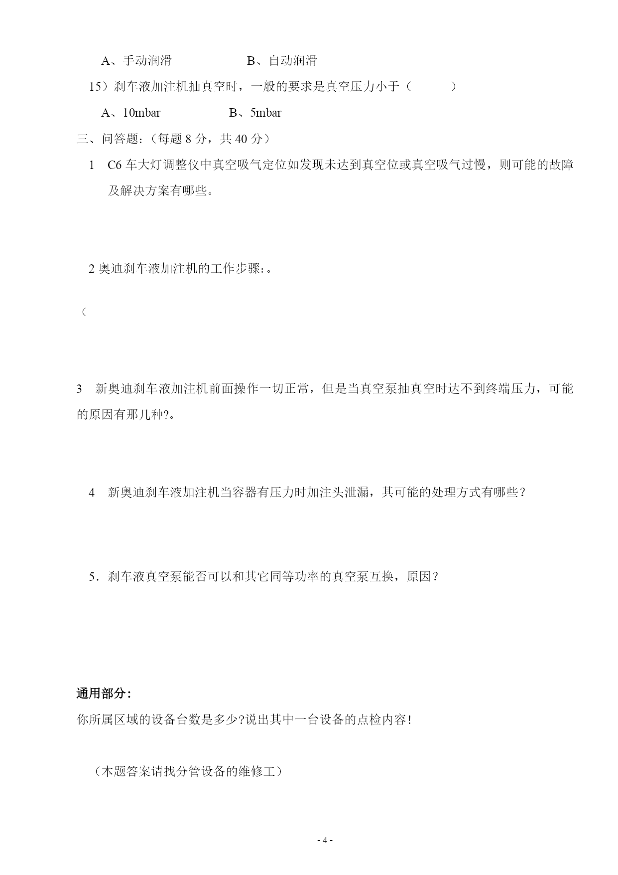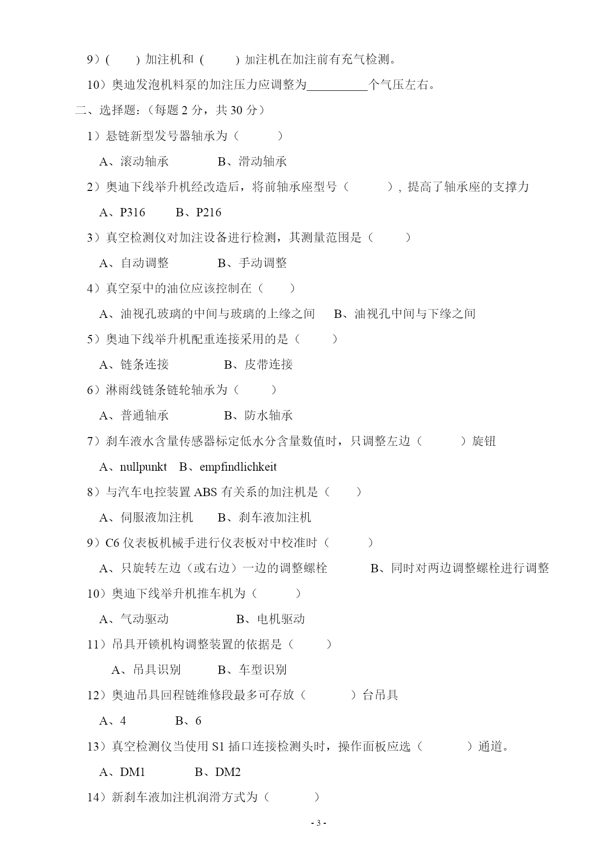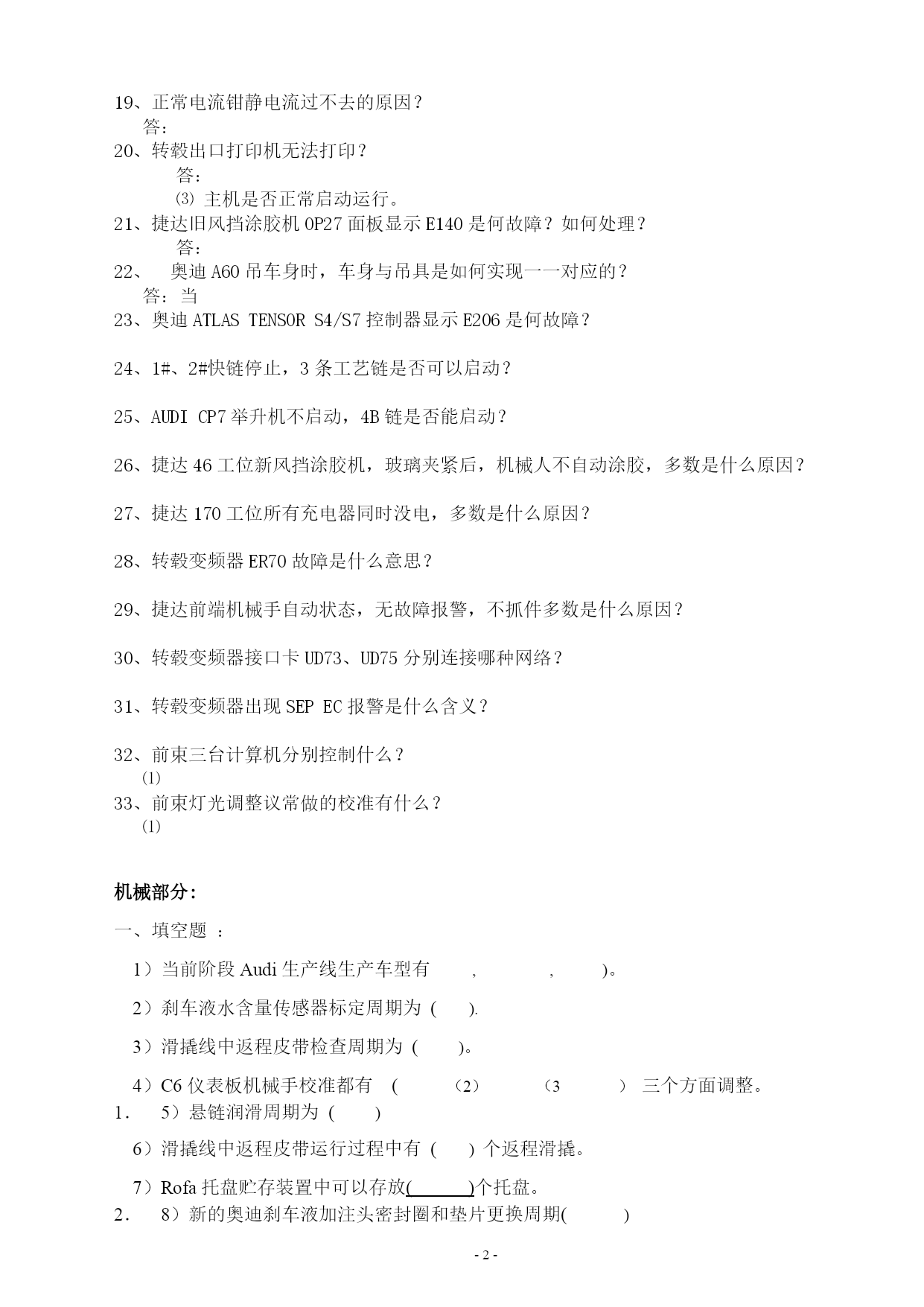 -PAGE4-上线电钳工理论试题姓名:车间:班组:电器部分简答题1,现场用的西门子可编程控制器当中OB1的作用是什么?2,AUDI旧刹车液加注机ABS什么时候打开?最大时间是多少?3,ATLAS力矩扳手重新更换线修理后,需进行的必要操作是什么?4,总装车间的现场总线主要有那些?5,用于AUDIA6的AFT装配线行走小车的供电方式是什么?6,A61剪式升降台处车型检测何时开始?7,AUDICP7下线举升机开锁机构如何实现对三种车型的检测?B6:C5:C6:8,AUDIEHB线滑触线有几条?作用是什么?9,宝来仪表板,前端模块滑触线有几条?作用是什么?10,VW线2#工艺链为什么有两个驱动站?11,VW线新玻璃涂胶机E7钥匙变换后,设备恢复原位时,必须作的工作是什么?12,1#下线举升机复位时,哪个动作需要时间延长?13,MBN底盘摸块有几个同步补偿开关?分别在那里?适配器通讯故障原因?答:15、安装接收站,接收卡的注意事项?答:16、转毂中适配器无法连接可能发生什么故障?答:。17、电流钳可能发生什么故障?答:电流钳电流过大可能是什么故障?答:19、正常电流钳静电流过不去的原因?答:20、转毂出口打印机无法打印?答:⑶主机是否正常启动运行。21、捷达旧风挡涂胶机OP27面板显示E140是何故障?如何处理?答:奥迪A60吊车身时,车身与吊具是如何实现一一对应的?答:当23、奥迪ATLASTENSORS4/S7控制器显示E206是何故障?24、1#、2#快链停止,3条工艺链是否可以启动?25、AUDICP7举升机不启动,4B链是否能启动?26、捷达46工位新风挡涂胶机,玻璃夹紧后,机械人不自动涂胶,多数是什么原因?27、捷达170工位所有充电器同时没电,多数是什么原因?28、转毂变频器ER70故障是什么意思?29、捷达前端机械手自动状态,无故障报警,不抓件多数是什么原因?30、转毂变频器接口卡UD73、UD75分别连接哪种网络?31、转毂变频器出现SEPEC报警是什么含义?32、前束三台计算机分别控制什么?⑴33、前束灯光调整议常做的校准有什么?⑴机械部分:一、填空题:1)当前阶段Audi生产线生产车型有,,)。2)刹车液水含量传感器标定周期为().3)滑撬线中返程皮带检查周期为()。4)C6仪表板机械手校准都有((2)(3)三个方面调整。5)悬链润滑周期为()6)滑撬线中返程皮带运行过程中有()个返程滑撬。7)Rofa托盘贮存装置中可以存放()个托盘。8)新的奥迪刹车液加注头密封圈和垫片更换周期()9)()加注机和()加注机在加注前有充气检测。10)奥迪发泡机料泵的加注压力应调整为个气压左右。二、选择题:(每题2分,共30分)1)悬链新型发号器轴承为()A、滚动轴承B、滑动轴承2)奥迪下线举升机经改造后,将前轴承座型号(),提高了轴承座的支撑力A、P316B、P2163)真空检测仪对加注设备进行检测,其测量范围是()A、自动调整B、手动调整4)真空泵中的油位应该控制在()A、油视孔玻璃的中间与玻璃的上缘之间B、油视孔中间与下缘之间5)奥迪下线举升机配重连接采用的是()A、链条连接B、皮带连接6)淋雨线链条链轮轴承为()A、普通轴承B、防水轴承7)刹车液水含量传感器标定低水分含量数值时,只调整左边()旋钮A、nullpunktB、empfindlichkeit8)与汽车电控装置ABS有关系的加注机是()A、伺服液加注机B、刹车液加注机9)C6仪表板机械手进行仪表板对中校准时()A、只旋转左边(或右边)一边的调整螺栓B、同时对两边调整螺栓进行调整10)奥迪下线举升机推车机为()A、气动驱动B、电机驱动11)吊具开锁机构调整装置的依据是()A、吊具识别B、车型识别12)奥迪吊具回程链维修段最多可存放()台吊具A、4B、613)真空检测仪当使用S1插口连接检测头时,操作面板应选()通道。A、DM1B、DM214)新刹车液加注机润滑方式为()A、手动润滑B、自动润滑15)刹车液加注机抽真空时,一般的要求是真空压力小于()A、10mbarB、5mbar三、问答题:(每题8分,共40分)C6车大灯调整仪中真空吸气定位如发现未达到真空位或真空吸气过慢,则可能的故障及解决方案有哪些。2奥迪刹车液加注机的工作步骤:。(3新奥迪刹车液加注机前面操作一切正常,但是当真空泵抽真空时达不到终端压力,可能的原因有那几种?。4新奥迪刹车液加注机当容器有压力时加注头泄漏,其可能的处理方式有哪些