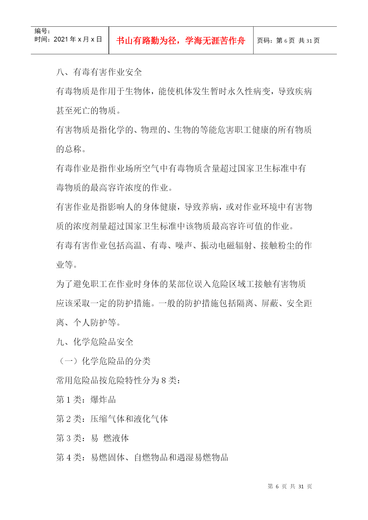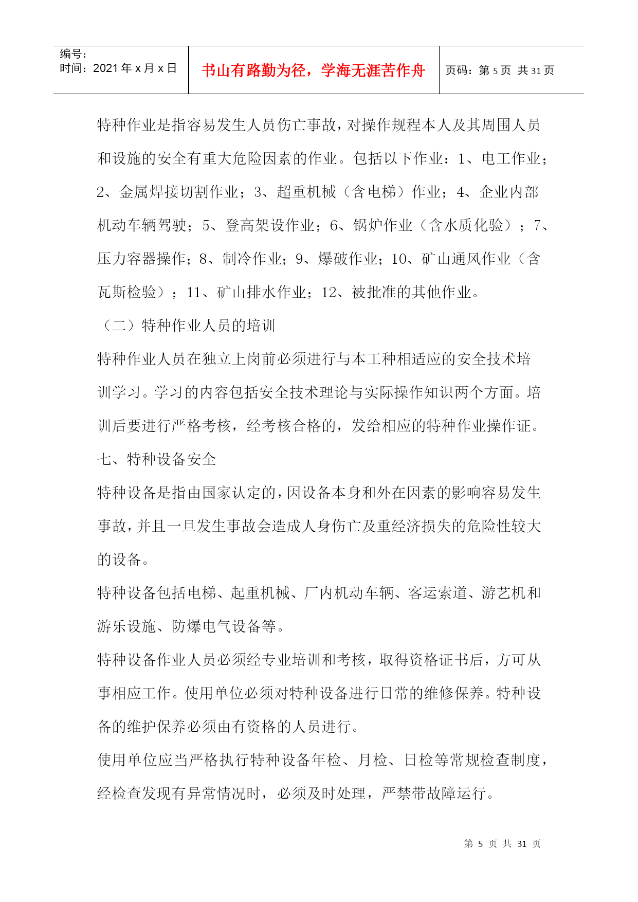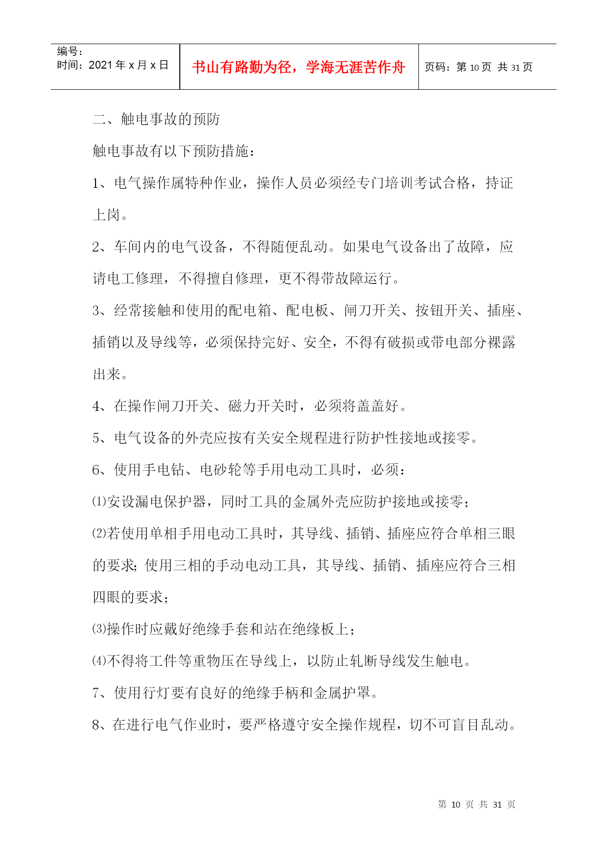 编号:时间:2021年x月x日书山有路勤为径,学海无涯苦作舟页码:第PAGE31页共NUMPAGES31页第PAGE\*MERGEFORMAT31页共NUMPAGES\*MERGEFORMAT31页员工安全文明生产培训讲义第一章安全文明生产基础知识一、安全教育制度(一)安全教育的规定1、企业必须认真地对新工人进行安全生产的入厂教育、车间教育和现场教育,并且经过考试合格后,才能准许进入操作岗位。2、对于从事特种作业的工人必须进行专门的安全操作技术训练,经过考试合格后,才能准许他们持证上岗操作。3、企业必须建立安全活动日和在班前班后会上检查安全生产情况等制度,对职工进行经常的安全教育。并且注意结合职工文化生活,进行各种安全生产的宣传活动。4、在采用新的生产方法、添设新的技术设备、制造新的产品或调换工人工作的时候,必须对工人进行新操作法和新工作岗位的安全教育。(二)新工人入厂“三级教育”的内容1、厂级安全教育的主要内容⑴工厂的性质及其主要工艺过程;⑵我国安全生产的方针、政策法规和管理体制;⑶本企业劳动安全卫生规章制度及状况、劳动纪律和有关事故案例;⑷工厂内特别危险的地点和设备及其安全防护注意事项;⑸新工人的安全心理教育;⑹有关机械、电气、起重、运输等安全技术知识;⑺有关防火防爆和工厂消防规程的知识;⑻有关防尘防毒的注意事项;⑼安全防护装置和个人劳动防护用品的正确使用方法;⑽新工人的安全生产责任制等内容。2、车间安全教育的主要内容⑴本车间的生产性质和主要的工艺流程;⑵本车间预防工伤事故和职业病的主要措施;⑶本车间的危险部位及其应注意事项;⑷本车间的安全生产的一般情况及其注意事项;⑸本车间的典型事故案例;⑹新工人的安全生产职责和遵守纪律的重要性。3、班组安全教育的主要内容⑴班组的工作性质、工艺流程、安全生产的概况和安全生产职责范围;⑵新工人将要从事的生产性质、安全生产责任制、安全操作规程以其它有关安全知识和各种安全防护、保险装置的作用;⑶工作地点的安全生产和文明生产的具体要求;⑷容易发生工伤事故的工作地点、操作步骤和典型事故按例介绍;⑸个人防护用品的正确使用和保管;⑹发生事故以后的紧急救护和自救常识;⑺工厂、车间内常见的安全标志、安全色介绍;⑻遵章守纪的重要性和必要性。二、安全操作规程为了保障广大职工在劳动生产过程中的安全健康,防止和减少事故,劳动法把遵守安全操作规程作为职业安全卫生方面的重要措施,专门做出规定,如劳动法第五十六条规定:“劳动者在劳动过程中必须严格遵守安全操作规程。”安全操作规程根据各岗位的作业内容,全面系统地考虑技术、设备、环境条件,规定了从事生产活动人员在各自岗位上应履行的职责,以及完成任务所必需的作业程序和动作标准,是现场操作的根据。安全操作规程作为劳动者在劳动过程中的行为规范,可以消除违章指挥、违反劳动纪律和无知蛮干等不安全行为,安全操作规程的发展生产,保障经济建设顺利进行的基本条件。是维护生产顺利进行,保护职工身体健康的基本条件,因此劳动者必须严格遵守。三、安全检查制度企业对生产中的安全工作,除进行经常的检查外,每年还应定期地进行二至四次群众性的检查,这种检查包括普遍检查、专业检查和季节性检查,这几种检查可以结合进行。开展安全生产检查,必须有明确的目的、要求和具体计划,并且必须建立由企业领导负责、有关人员参加的安全生产检查组织,以加强领导,做好这项工作。安全生产检查应该始终贯彻领导与群众相结合的原则,依靠群众,边检查,边改进,并且及时地总结和推广先进经验。有些限于物质技术条件当时不能解决的问题,也应该订出计划,按期解决,务须作到条条有着落,件件有交代。四、安全色及安全标识安全色与安全标识是为了防止事故的发生,作形象而醒目的信息向人们提供了表达禁止、警告、指令、提示等信息。了解它们所表达的安全信息含义对于我们在工作、生活中趋利避害、预防事故发生具有重要的作用。五、个体防护为了避免劳动者在生产过程中发生事故工减轻事故伤害程度,而需要给劳动者配备一定的防护用品。劳动防护用品按用途分为以下几种:1、预防飞来物的安全帽、安全鞋、护目镜和面罩等。2、为防止与高温、锋利、带电等物体接触时受到伤害的各类防护手套、防护鞋等。3、对辐射热进行屏蔽防护的全套防护服。4、对放射性射线进行屏蔽防护的防护镜、防护面具等。5、对作业环境中的粉尘、毒物或噪声进行防护的口罩、面具或耳塞等。六、特种作业安全(一)特种作业定义与分类特种作业是指容易发生人员伤亡事故,对操作规程本人及其周围人员和设施的安全有重大危险因素的作业。包括以下作业:1、电工作业;2、金属焊接切割作业;3、超重机械(含电梯)作业;4