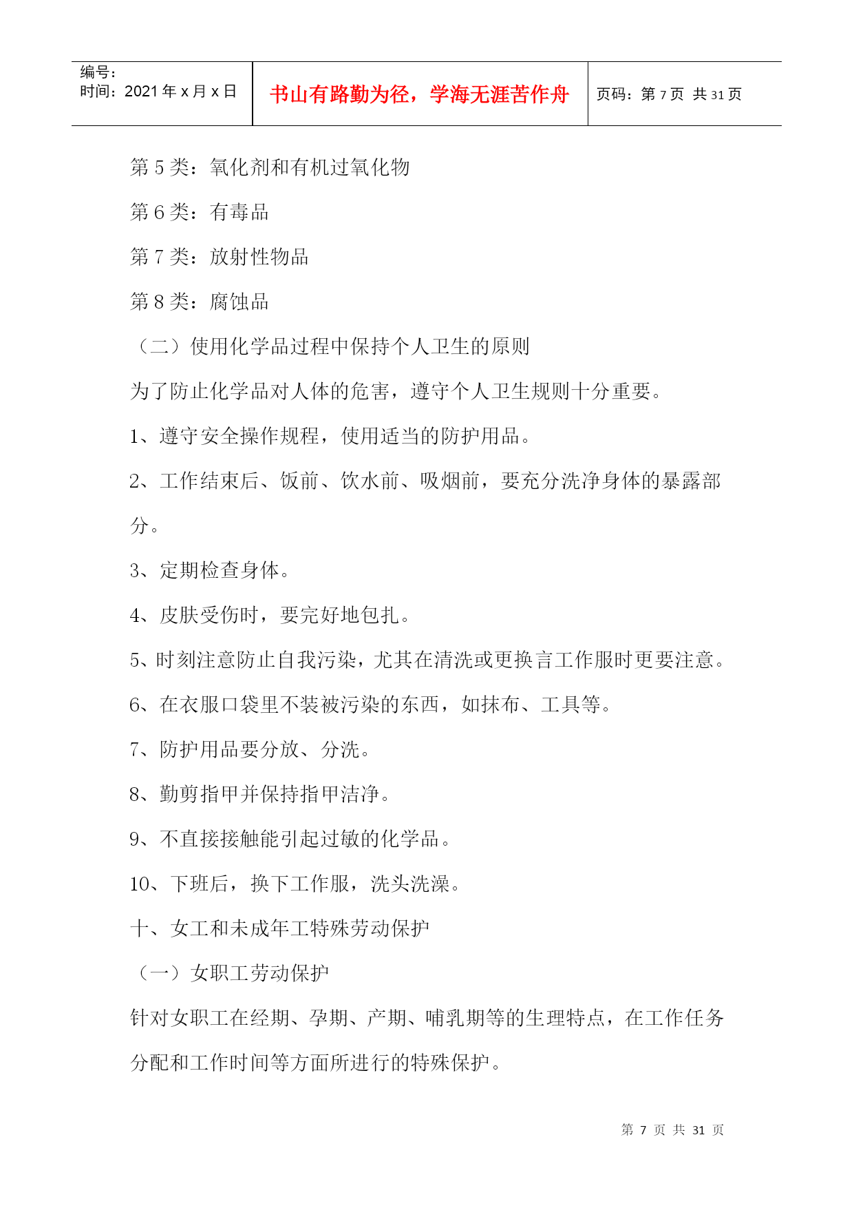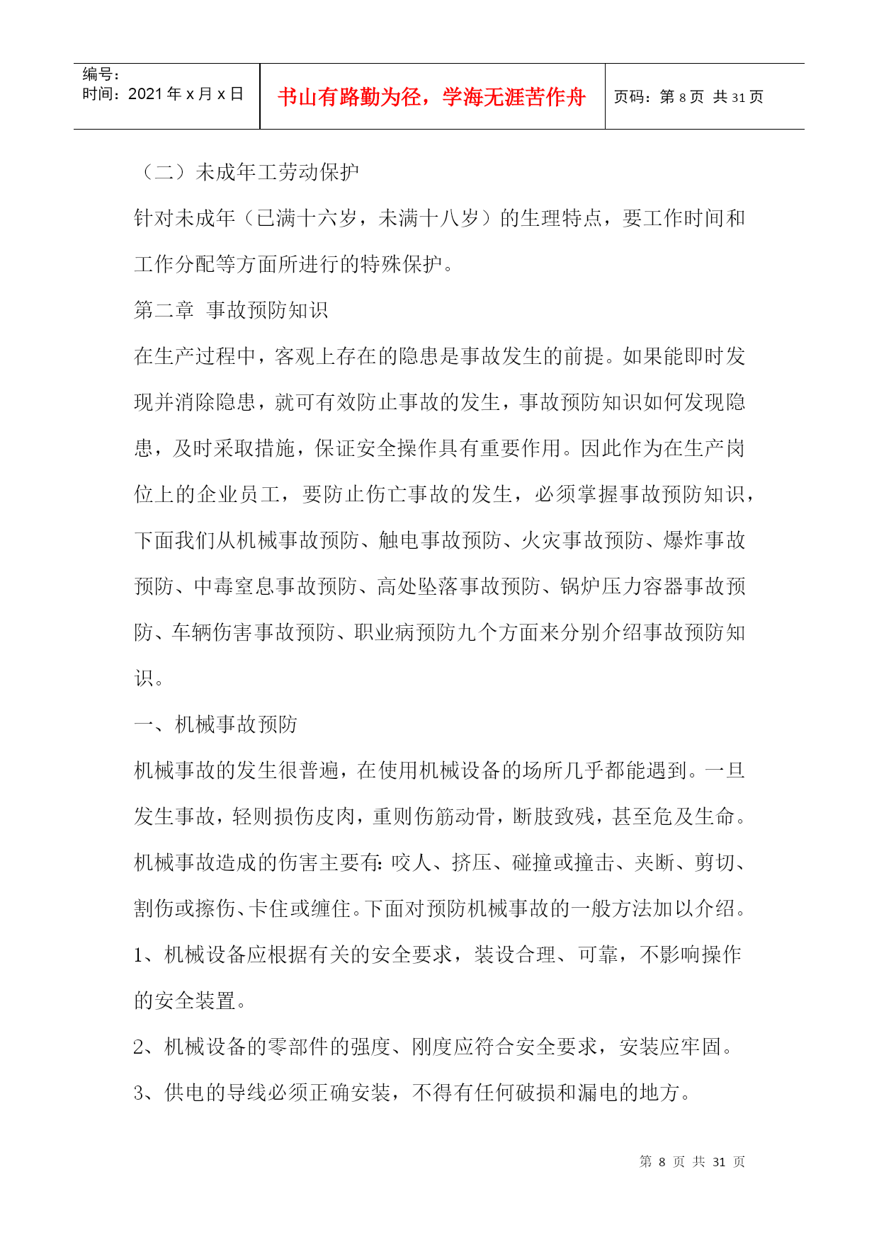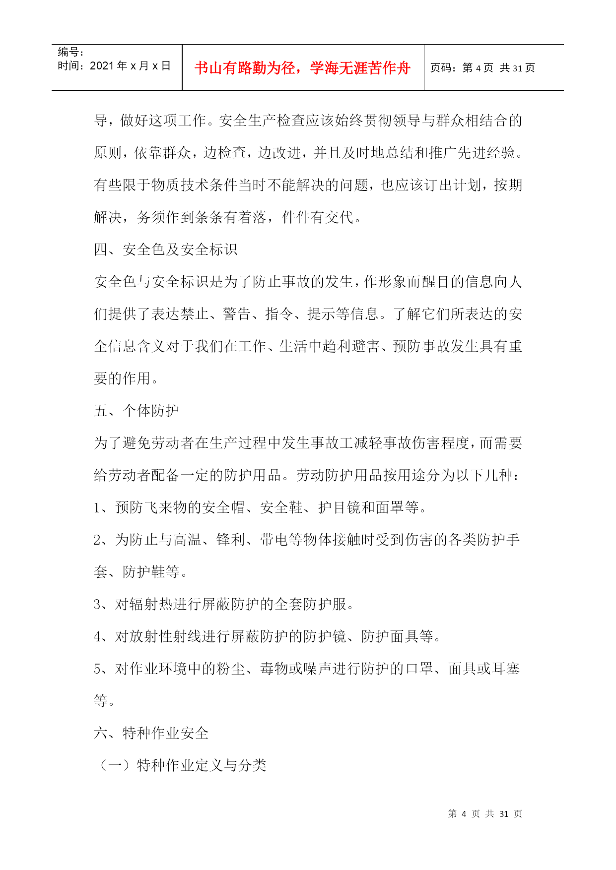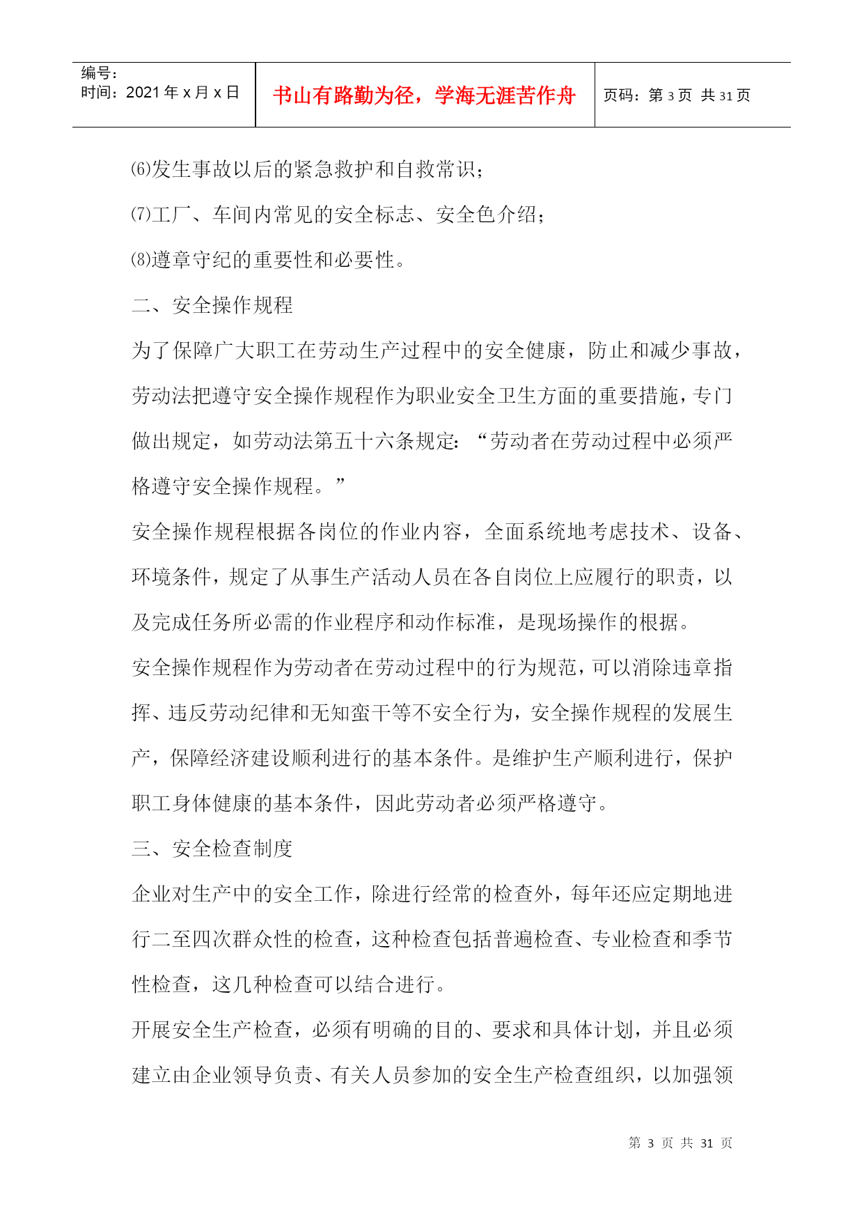 编号:时间:2021年x月x日书山有路勤为径,学海无涯苦作舟页码:第PAGE31页共NUMPAGES31页第PAGE\*MERGEFORMAT31页共NUMPAGES\*MERGEFORMAT31页员工安全文明生产培训讲义第一章安全文明生产基础知识一、安全教育制度(一)安全教育的规定1、企业必须认真地对新工人进行安全生产的入厂教育、车间教育和现场教育,并且经过考试合格后,才能准许进入操作岗位。2、对于从事特种作业的工人必须进行专门的安全操作技术训练,经过考试合格后,才能准许他们持证上岗操作。3、企业必须建立安全活动日和在班前班后会上检查安全生产情况等制度,对职工进行经常的安全教育。并且注意结合职工文化生活,进行各种安全生产的宣传活动。4、在采用新的生产方法、添设新的技术设备、制造新的产品或调换工人工作的时候,必须对工人进行新操作法和新工作岗位的安全教育。(二)新工人入厂“三级教育”的内容1、厂级安全教育的主要内容⑴工厂的性质及其主要工艺过程;⑵我国安全生产的方针、政策法规和管理体制;⑶本企业劳动安全卫生规章制度及状况、劳动纪律和有关事故案例;⑷工厂内特别危险的地点和设备及其安全防护注意事项;⑸新工人的安全心理教育;⑹有关机械、电气、起重、运输等安全技术知识;⑺有关防火防爆和工厂消防规程的知识;⑻有关防尘防毒的注意事项;⑼安全防护装置和个人劳动防护用品的正确使用方法;⑽新工人的安全生产责任制等内容。2、车间安全教育的主要内容⑴本车间的生产性质和主要的工艺流程;⑵本车间预防工伤事故和职业病的主要措施;⑶本车间的危险部位及其应注意事项;⑷本车间的安全生产的一般情况及其注意事项;⑸本车间的典型事故案例;⑹新工人的安全生产职责和遵守纪律的重要性。3、班组安全教育的主要内容⑴班组的工作性质、工艺流程、安全生产的概况和安全生产职责范围;⑵新工人将要从事的生产性质、安全生产责任制、安全操作规程以其它有关安全知识和各种安全防护、保险装置的作用;⑶工作地点的安全生产和文明生产的具体要求;⑷容易发生工伤事故的工作地点、操作步骤和典型事故按例介绍;⑸个人防护用品的正确使用和保管;⑹发生事故以后的紧急救护和自救常识;⑺工厂、车间内常见的安全标志、安全色介绍;⑻遵章守纪的重要性和必要性。二、安全操作规程为了保障广大职工在劳动生产过程中的安全健康,防止和减少事故,劳动法把遵守安全操作规程作为职业安全卫生方面的重要措施,专门做出规定,如劳动法第五十六条规定:“劳动者在劳动过程中必须严格遵守安全操作规程。”安全操作规程根据各岗位的作业内容,全面系统地考虑技术、设备、环境条件,规定了从事生产活动人员在各自岗位上应履行的职责,以及完成任务所必需的作业程序和动作标准,是现场操作的根据。安全操作规程作为劳动者在劳动过程中的行为规范,可以消除违章指挥、违反劳动纪律和无知蛮干等不安全行为,安全操作规程的发展生产,保障经济建设顺利进行的基本条件。是维护生产顺利进行,保护职工身体健康的基本条件,因此劳动者必须严格遵守。三、安全检查制度企业对生产中的安全工作,除进行经常的检查外,每年还应定期地进行二至四次群众性的检查,这种检查包括普遍检查、专业检查和季节性检查,这几种检查可以结合进行。开展安全生产检查,必须有明确的目的、要求和具体计划,并且必须建立由企业领导负责、有关人员参加的安全生产检查组织,以加强领导,做好这项工作。安全生产检查应该始终贯彻领导与群众相结合的原则,依靠群众,边检查,边改进,并且及时地总结和推广先进经验。有些限于物质技术条件当时不能解决的问题,也应该订出计划,按期解决,务须作到条条有着落,件件有交代。四、安全色及安全标识安全色与安全标识是为了防止事故的发生,作形象而醒目的信息向人们提供了表达禁止、警告、指令、提示等信息。了解它们所表达的安全信息含义对于我们在工作、生活中趋利避害、预防事故发生具有重要的作用。五、个体防护为了避免劳动者在生产过程中发生事故工减轻事故伤害程度,而需要给劳动者配备一定的防护用品。劳动防护用品按用途分为以下几种:1、预防飞来物的安全帽、安全鞋、护目镜和面罩等。2、为防止与高温、锋利、带电等物体接触时受到伤害的各类防护手套、防护鞋等。3、对辐射热进行屏蔽防护的全套防护服。4、对放射性射线进行屏蔽防护的防护镜、防护面具等。5、对作业环境中的粉尘、毒物或噪声进行防护的口罩、面具或耳塞等。六、特种作业安全(一)特种作业定义与分类特种作业是指容易发生人员伤亡事故,对操作规程本人及其周围人员和设施的安全有重大危险因素的作业。包括以下作业:1、电工作业;2、金属焊接切割作业;3、超重机械(含电梯)作业;4