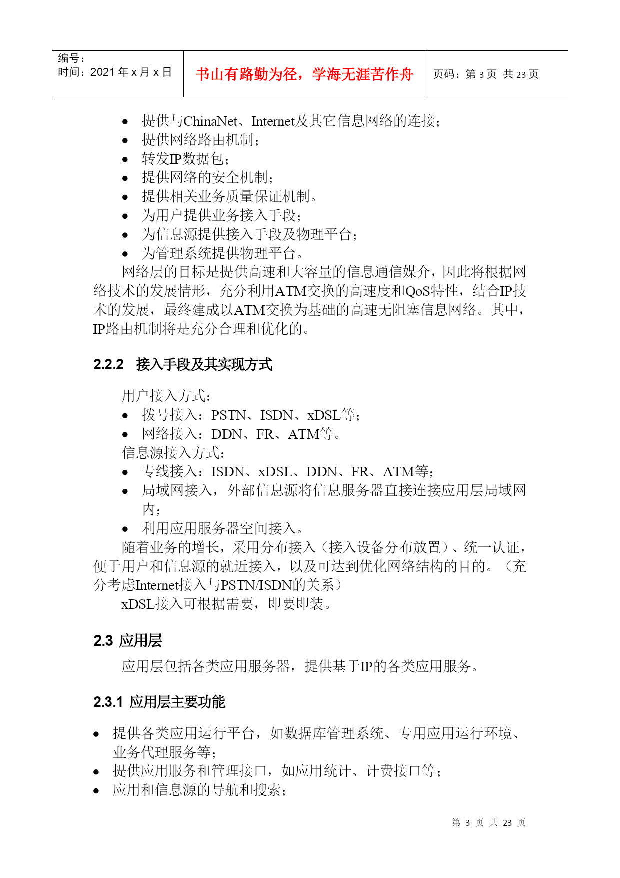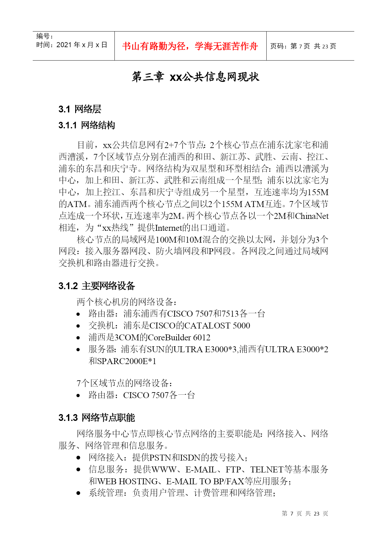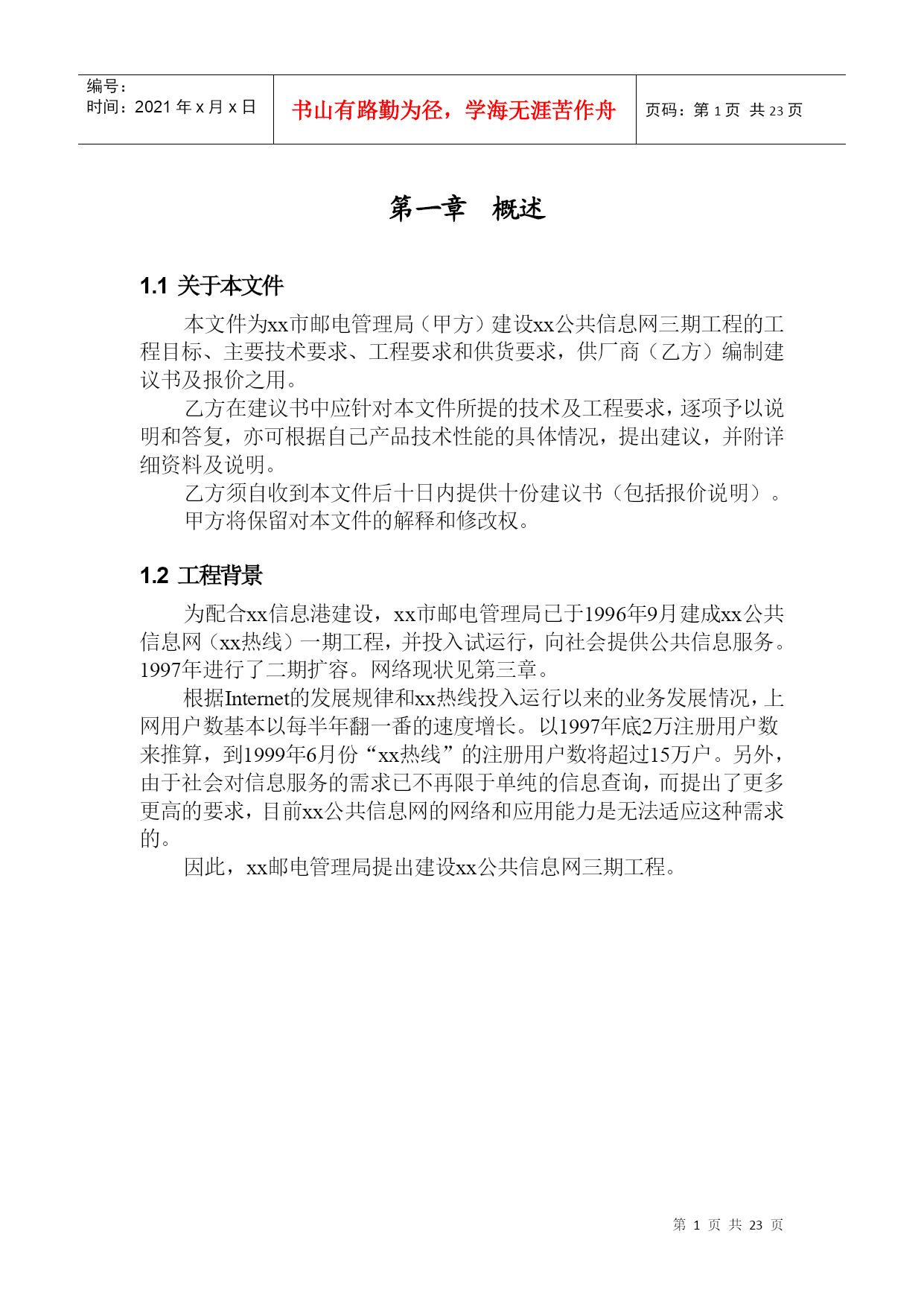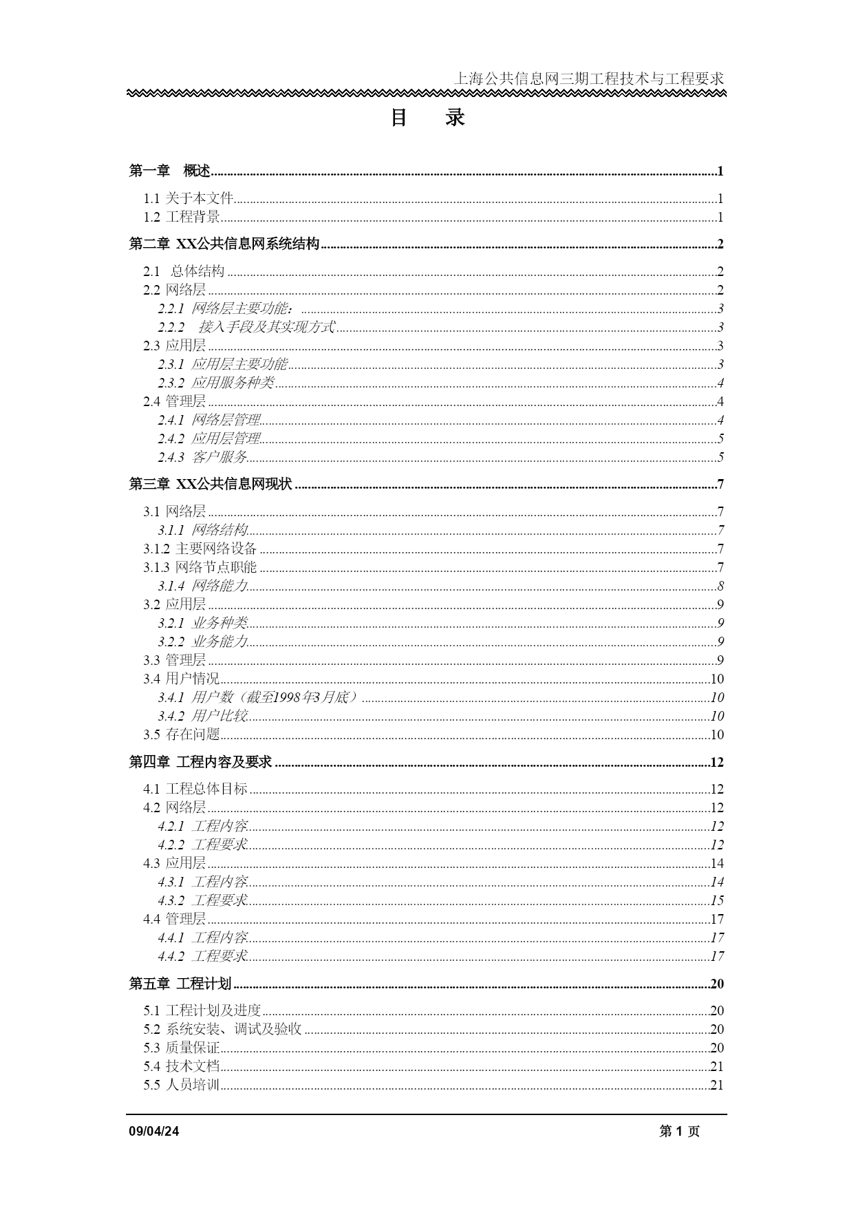 上海公共信息网三期工程技术与工程要求PAGE2第PAGE1页DATE\@"MM/dd/yy"09/04/24xx公共信息网三期工程技术与工程要求xx市邮电管理局xx公共信息网三期工程项目组1998年4月目录TOC\o"1-3"第一章概述PAGEREF_Toc416516561\h11.1关于本文件PAGEREF_Toc416516562\h11.2工程背景PAGEREF_Toc416516563\h1第二章xx公共信息网系统结构PAGEREF_Toc416516564\h22.1总体结构PAGEREF_Toc416516565\h22.2网络层PAGEREF_Toc416516566\h22.2.1网络层主要功能:PAGEREF_Toc416516567\h32.2.2接入手段及其实现方式PAGEREF_Toc416516568\h32.3应用层PAGEREF_Toc416516569\h32.3.1应用层主要功能PAGEREF_Toc416516570\h32.3.2应用服务种类PAGEREF_Toc416516571\h42.4管理层PAGEREF_Toc416516572\h42.4.1网络层管理PAGEREF_Toc416516573\h42.4.2应用层管理PAGEREF_Toc416516574\h52.4.3客户服务PAGEREF_Toc416516575\h5第三章xx公共信息网现状PAGEREF_Toc416516576\h73.1网络层PAGEREF_Toc416516577\h73.1.1网络结构PAGEREF_Toc416516578\h73.1.2主要网络设备PAGEREF_Toc416516579\h73.1.3网络节点职能PAGEREF_Toc416516580\h73.1.4网络能力PAGEREF_Toc416516581\h83.2应用层PAGEREF_Toc416516582\h93.2.1业务种类PAGEREF_Toc416516583\h93.2.2业务能力PAGEREF_Toc416516584\h93.3管理层PAGEREF_Toc416516585\h93.4用户情况PAGEREF_Toc416516586\h103.4.1用户数(截至1998年3月底)PAGEREF_Toc416516587\h103.4.2用户比较PAGEREF_Toc416516588\h103.5存在问题PAGEREF_Toc416516589\h10第四章工程内容及要求PAGEREF_Toc416516590\h124.1工程总体目标PAGEREF_Toc416516591\h124.2网络层PAGEREF_Toc416516592\h124.2.1工程内容PAGEREF_Toc416516593\h124.2.2工程要求PAGEREF_Toc416516594\h124.3应用层PAGEREF_Toc416516595\h144.3.1工程内容PAGEREF_Toc416516596\h144.3.2工程要求PAGEREF_Toc416516597\h154.4管理层PAGEREF_Toc416516598\h174.4.1工程内容PAGEREF_Toc416516599\h174.4.2工程要求PAGEREF_Toc416516600\h17第五章工程计划PAGEREF_Toc416516601\h205.1工程计划及进度PAGEREF_Toc416516602\h205.2系统安装、调试及验收PAGEREF_Toc416516603\h205.3质量保证PAGEREF_Toc416516604\h205.4技术文档PAGEREF_Toc416516605\h215.5人员培训PAGEREF_Toc416516606\h21编号:时间:2021年x月x日书山有路勤为径,学海无涯苦作舟页码:第PAGE21页共NUMPAGES23页第PAGE\*MERGEFORMAT21页共NUMPAGES\*MERG