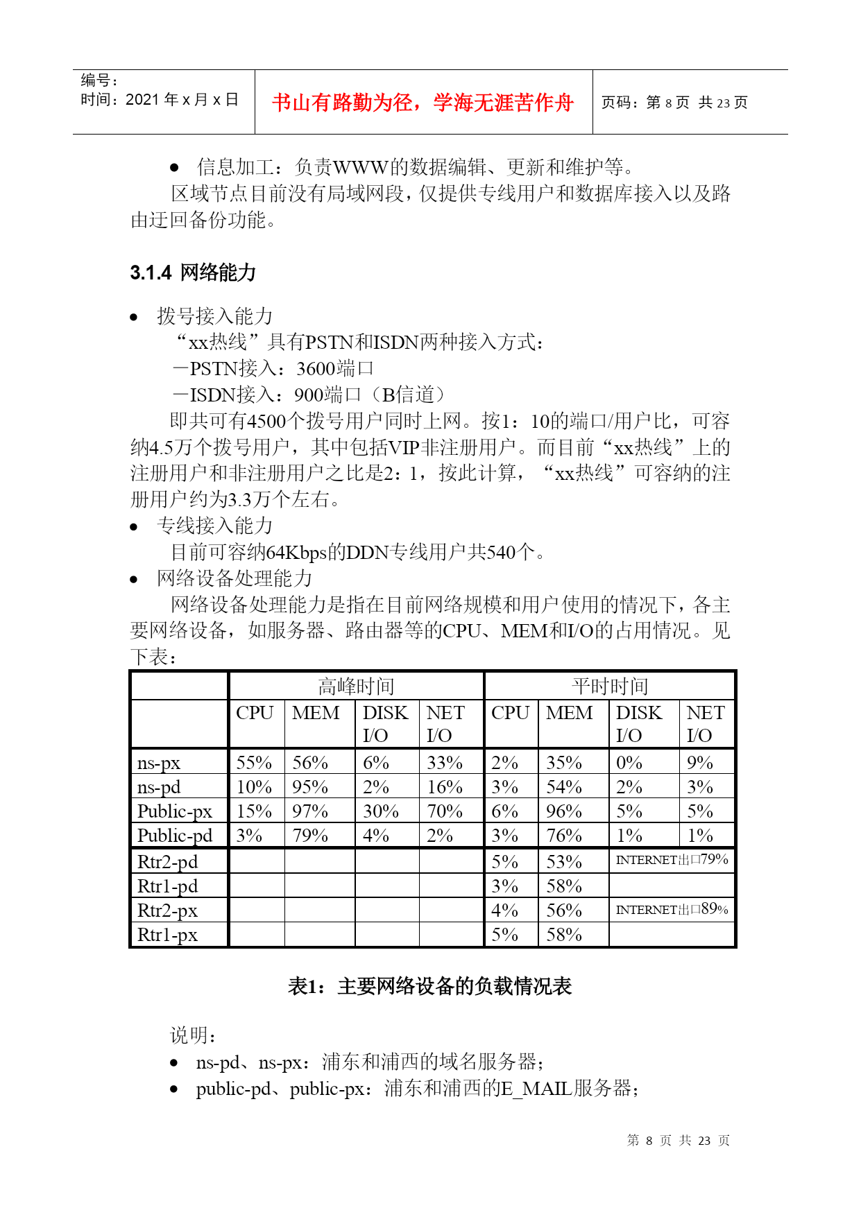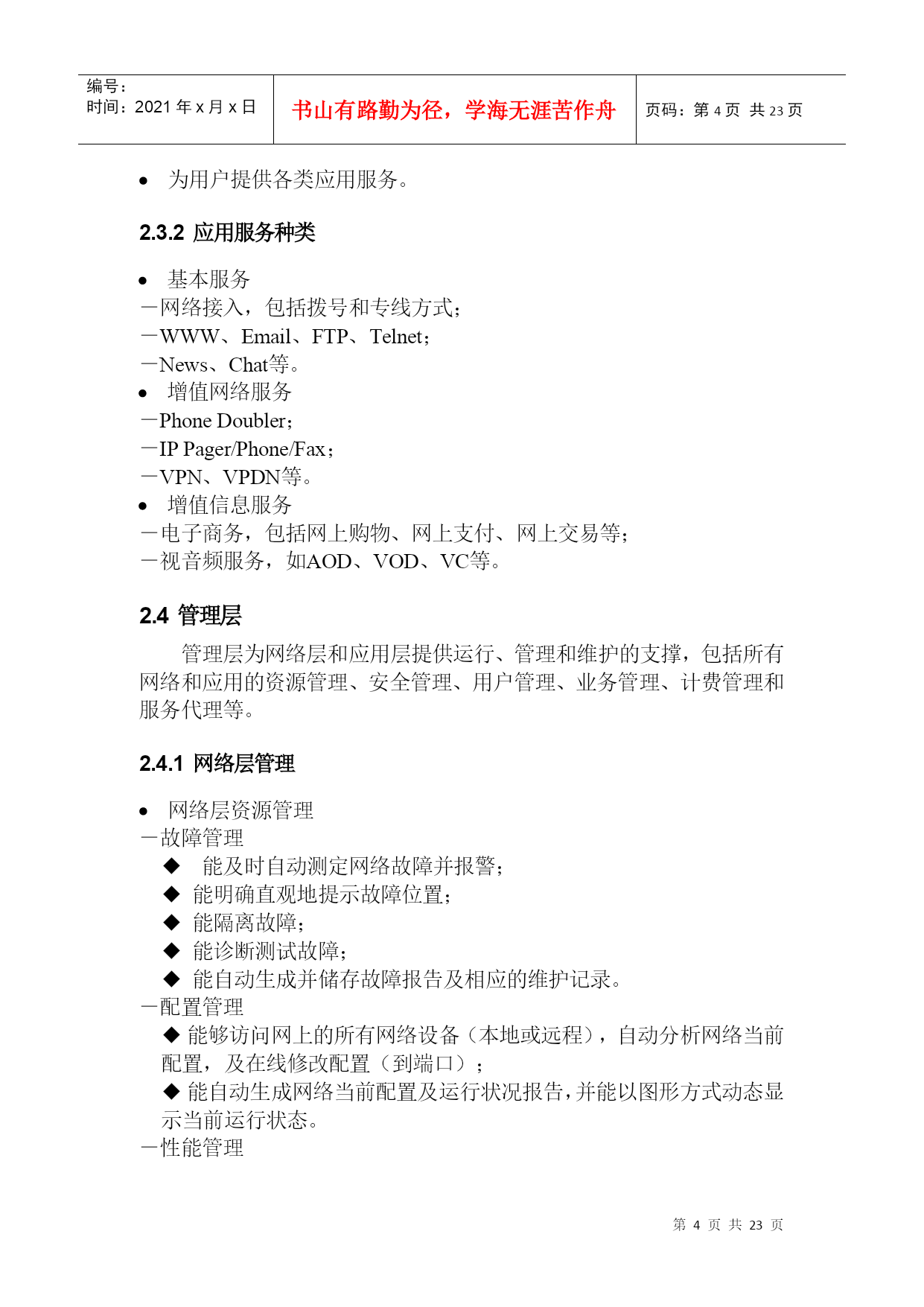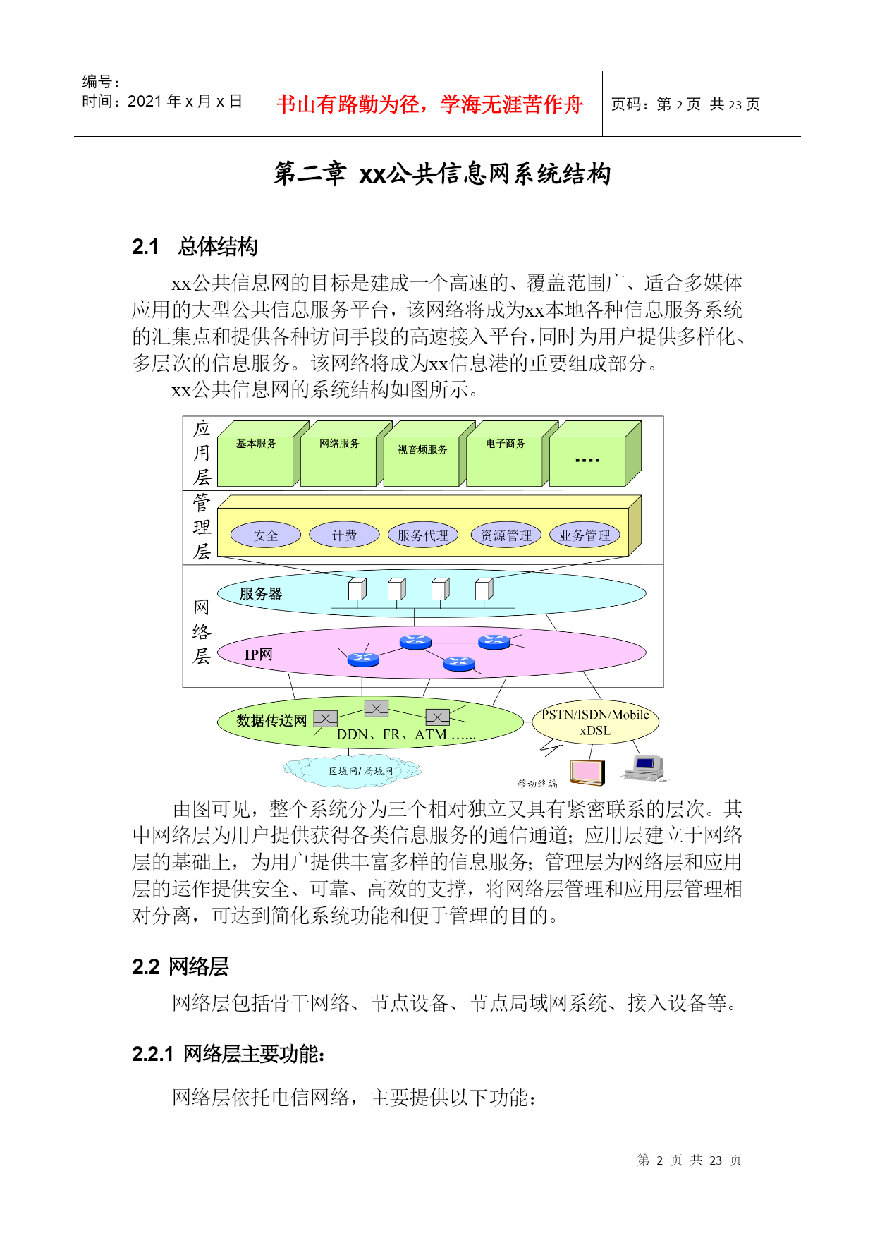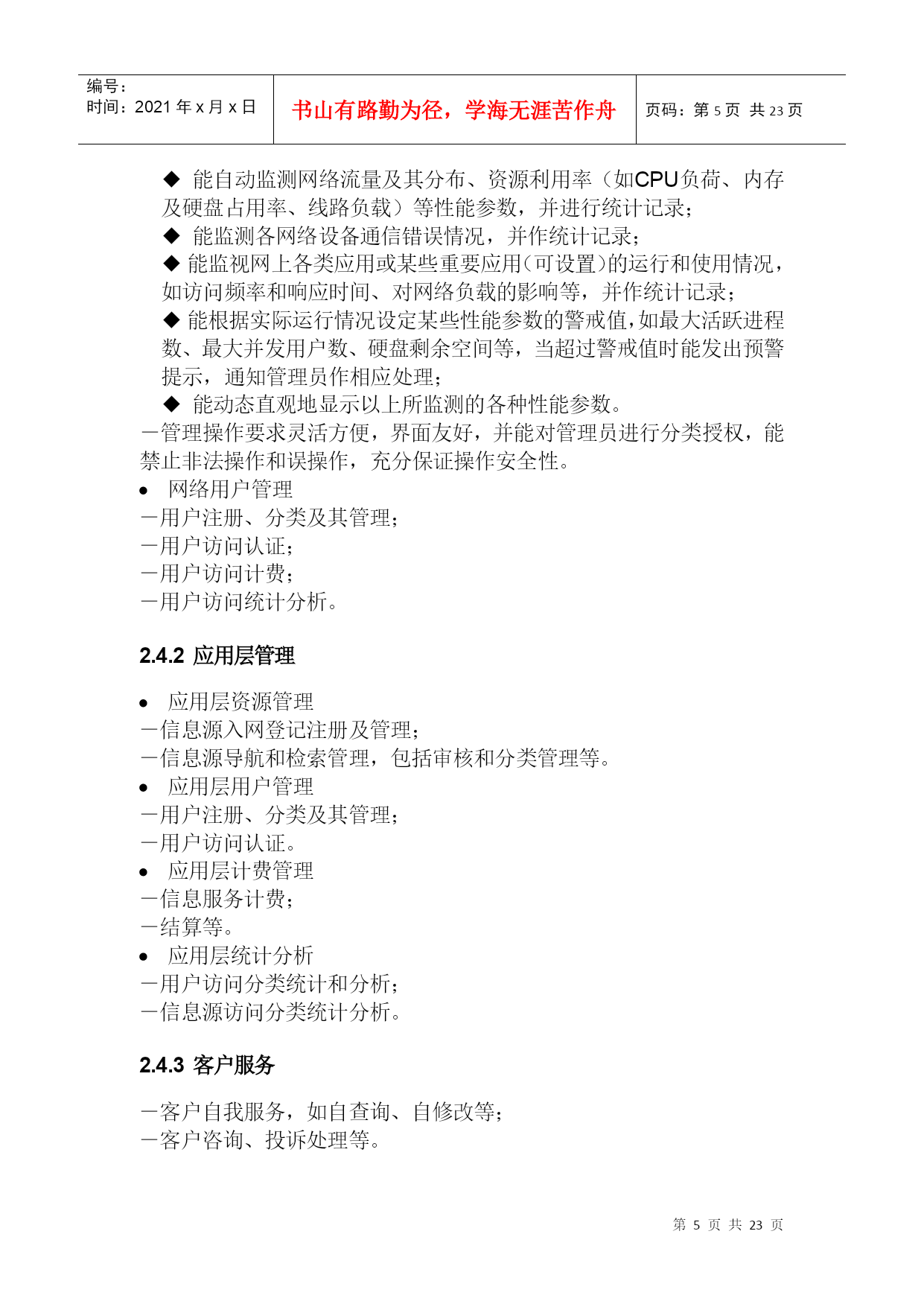 上海公共信息网三期工程技术与工程要求PAGE2第PAGE1页DATE\@"MM/dd/yy"09/04/24xx公共信息网三期工程技术与工程要求xx市邮电管理局xx公共信息网三期工程项目组1998年4月目录TOC\o"1-3"第一章概述PAGEREF_Toc416516561\h11.1关于本文件PAGEREF_Toc416516562\h11.2工程背景PAGEREF_Toc416516563\h1第二章xx公共信息网系统结构PAGEREF_Toc416516564\h22.1总体结构PAGEREF_Toc416516565\h22.2网络层PAGEREF_Toc416516566\h22.2.1网络层主要功能:PAGEREF_Toc416516567\h32.2.2接入手段及其实现方式PAGEREF_Toc416516568\h32.3应用层PAGEREF_Toc416516569\h32.3.1应用层主要功能PAGEREF_Toc416516570\h32.3.2应用服务种类PAGEREF_Toc416516571\h42.4管理层PAGEREF_Toc416516572\h42.4.1网络层管理PAGEREF_Toc416516573\h42.4.2应用层管理PAGEREF_Toc416516574\h52.4.3客户服务PAGEREF_Toc416516575\h5第三章xx公共信息网现状PAGEREF_Toc416516576\h73.1网络层PAGEREF_Toc416516577\h73.1.1网络结构PAGEREF_Toc416516578\h73.1.2主要网络设备PAGEREF_Toc416516579\h73.1.3网络节点职能PAGEREF_Toc416516580\h73.1.4网络能力PAGEREF_Toc416516581\h83.2应用层PAGEREF_Toc416516582\h93.2.1业务种类PAGEREF_Toc416516583\h93.2.2业务能力PAGEREF_Toc416516584\h93.3管理层PAGEREF_Toc416516585\h93.4用户情况PAGEREF_Toc416516586\h103.4.1用户数(截至1998年3月底)PAGEREF_Toc416516587\h103.4.2用户比较PAGEREF_Toc416516588\h103.5存在问题PAGEREF_Toc416516589\h10第四章工程内容及要求PAGEREF_Toc416516590\h124.1工程总体目标PAGEREF_Toc416516591\h124.2网络层PAGEREF_Toc416516592\h124.2.1工程内容PAGEREF_Toc416516593\h124.2.2工程要求PAGEREF_Toc416516594\h124.3应用层PAGEREF_Toc416516595\h144.3.1工程内容PAGEREF_Toc416516596\h144.3.2工程要求PAGEREF_Toc416516597\h154.4管理层PAGEREF_Toc416516598\h174.4.1工程内容PAGEREF_Toc416516599\h174.4.2工程要求PAGEREF_Toc416516600\h17第五章工程计划PAGEREF_Toc416516601\h205.1工程计划及进度PAGEREF_Toc416516602\h205.2系统安装、调试及验收PAGEREF_Toc416516603\h205.3质量保证PAGEREF_Toc416516604\h205.4技术文档PAGEREF_Toc416516605\h215.5人员培训PAGEREF_Toc416516606\h21编号:时间:2021年x月x日书山有路勤为径,学海无涯苦作舟页码:第PAGE21页共NUMPAGES23页第PAGE\*MERGEFORMAT21页共NUMPAGES\*MERG