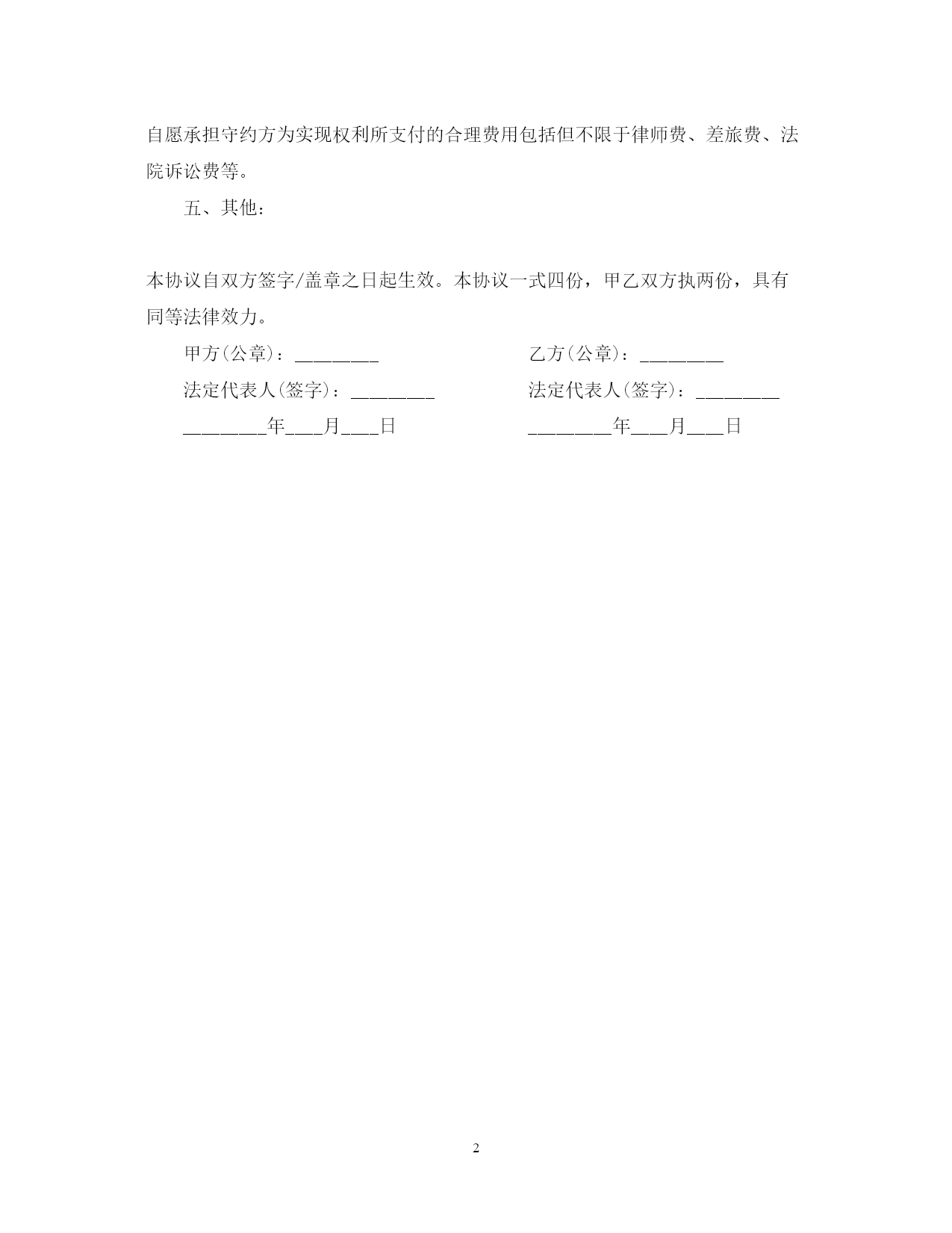 此资料由网络收集而来,如有侵权请告知上传者立即删除。资料共分享,我们负责传递知识。PAGEPAGE2机电设备采购合同模板需方/买方(以下简称“甲方”):供方/卖方(以下简称“乙方”):甲乙双方经协商一致,就甲方向乙方购买机电产品事宜,达成以下协议,双方共同遵守:一、产品名称、数量、价格卖方保证所提供的所有设备是全新的,并且采用卖方最新设计和合格的材料制造,各方面符合合同所规定的质量、规格、型号等要求。二、质量要求、技术标准执行国家、地方颁发的质量标准和行业标准。在供货时附出厂说明书、合格证,作为本合同的有效附件。三、卖方对质量负责的条件及期限:1、设备自安装、调试合格之日起保质期2年。。2、因设备质量问题发生争议,由乙方所在地的技术单位进行质量鉴定。3、产品的风险自发货之日起转移至买方,但产品的所有权自买方付清所有款项之日起转移至买方,在买方付钱所有款项之前,本合同所述的产品的所有权归卖方。四、违约责任1、逾期交货的,乙方应每天按合同总价的万分之五向对方支付违约金。2、甲方无正当理由拒收的,应向乙方支付合同总价30%的违约金。3、如一方违反本合同的约定,违约方除应承担本协议第八条的违约责任外,还自愿承担守约方为实现权利所支付的合理费用包括但不限于律师费、差旅费、法院诉讼费等。五、其他:本协议自双方签字/盖章之日起生效。本协议一式四份,甲乙双方执两份,具有同等法律效力。甲方(公章):_________乙方(公章):_________法定代表人(签字):_________法定代表人(签字):__________________年____月____日_________年____月____日