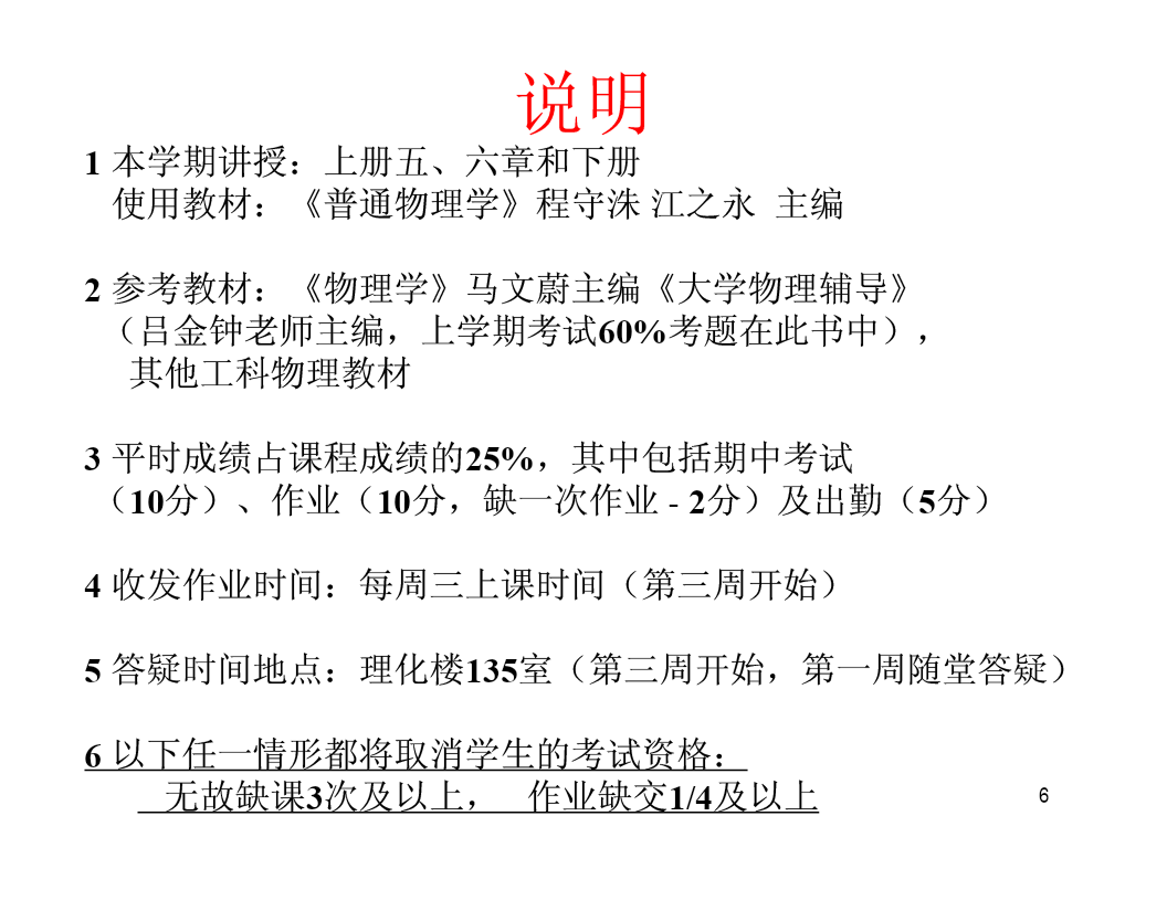 课程:大学物理(下)1授课人王凤平23PhysicistDiscovery4AfterPhysicsBeforePhysics5说明1本学期讲授:上册五、六章和下册使用教材:《普通物理学》程守洙江之永主编2参考教材:《物理学》马文蔚主编《大学物理辅导》(吕金钟老师主编,上学期考试60%考题在此书中),其他工科物理教材3平时成绩占课程成绩的25%,其中包括期中考试(10分)、作业(10分,缺一次作业-2分)及出勤(5分)4收发作业时间:每周三上课时间(第三周开始)5答疑时间地点:理化楼135室(第三周开始,第一周随堂答疑)6以下任一情形都将取消学生的考试资格:无故缺课3次及以上,作业缺交1/4及以上67本学期的校内竞赛在在10月12日。原则上校内竞赛成绩太差、未列入教务处公布名单的同学不允许参加校外竞赛。8校内竞赛获奖的同学期末卷面成绩加10分,校外竞赛获奖的同学期末免考,按100分计最终成绩。9本学期的大物补考时间本周六下午2点,内容和上学期期末试卷基本一一对应。成绩算法与期末相同,以前的平时成绩占25%,上学期没有平时成绩的同学按以前的重修生对待(基本保持卷面成绩为最终成绩)。7热学绪论一、热学的研究对象热学:研究物体的热现象及热运动的规律。热运动:物体中分子或原子无规则的运动。热现象:由于物体温度的变化而引起物体性质、形态的变化。热现象是组成物体的分子或原子热运动的结果热现象的例子:热胀冷缩、相变、高温退磁。8二、热学的研究方法:两种1.宏观法:热力学。由观察和实验总结出热现象的规律构成热现象的宏观理论。由最基本实验规律(运用数学)逻辑推理优点:可靠、普遍。缺点:未揭示微观本质。2.微观法:统计力学物质的微观结构+统计方法优点:揭示了热现象的微观本质。缺点:可靠性、普遍性差。宏观法与微观法相辅相成。9第五章第五章气体动理论气体动理论§§55--11热运动热运动理想气体理想气体一、热力学系统与外界1.热力学系统:热力学研究的对象1).它包含极大量的分子、原子。232)以阿佛加德罗常数NA=6.023×10/mol计。2.外界:热力学系统以外的物质。例:若汽缸内气体为系统,其它为外界10二、宏观量与微观量1.宏观量:表征大量分子集体特征的量,一般可直接测量。1)广延量:可以累加,如M、V、E等。2)强度量:不可累加,如P、T、ρ等。2.微观量:表征个别分子性质的物理量,一般不可直接测量如:质量m、速度v、动量p、能量ε等。微观量与宏观量有一定的内在联系。例如:气体的压强是大量分子撞击器壁的平均效果,它与大量分子对器壁的冲力的平均值有关。11三、平衡态1.平衡态定义在外界条件不变的情况下,系统的宏观性质均匀一致、不随时间改变的状态,称为平衡态。2.说明:(两个概念)1).平衡态是一个理想化模型,主要研究平衡态的热学规律。2)动态平衡微观上,无规则的热运动宏观量不随时间改变。(分子运动是永恒的)123)涨落平衡态下系统的宏观量,如压强P等不随时间改变,但不能保证任何时刻大量分子撞击器壁的情况完全一样,这称为涨落现象,分子数越多,涨落就越小。上例中两侧粒子数不可能严格相同,这里的偏差也就是涨落。布朗运动是可观测的涨落现象之一。13四、状态参量四、状态参量在平衡状态下,描述系统状态有关特性的变量,如:体积、浓度等称为状态参量。对一定量(质量为m,摩尔质量为M)气体,其状态一般用:(1)体积V,(2)压强P,(3)温度T描述系统状态,称其为气体的状态参量。五、温度、五、温度、温标温标14五、温度、温标绝热板导热板AABBA、B两体系互不影响热平衡:发生热接触的两个各自达到平衡态平衡态,经过足够长时间所达到的共同的新热平衡态.CA设A和B、B和C分别热平衡,则A和CB一定热平衡。15热力学第零定律若两个热力学系统中的每一个都与第三个热力学系统处于热平衡,则它们彼此也必定处于热平衡---热力学第零定律。定律表明:处在同一热平衡的所有热力学系统都具有一个共同的宏观性质,定义:这个决定系统热平衡的宏观性质的物理量为温度,换言之,温度是决定一系统是否与其它系统处于热平衡的宏观性质,其特征在于一切互为热平衡的系统都具有相同的温度.16温标:温度的数值表示方法。华氏温标:1714年荷兰华伦海特建立,以水结冰的温度为32°F,水沸腾的温度为212°F摄氏温标:1742年瑞典天文学家摄尔修斯建立,