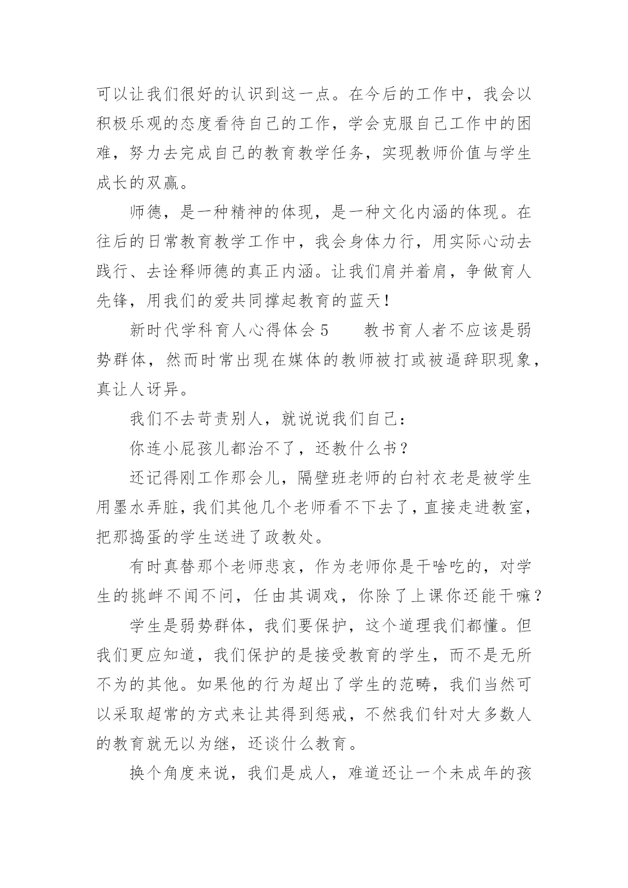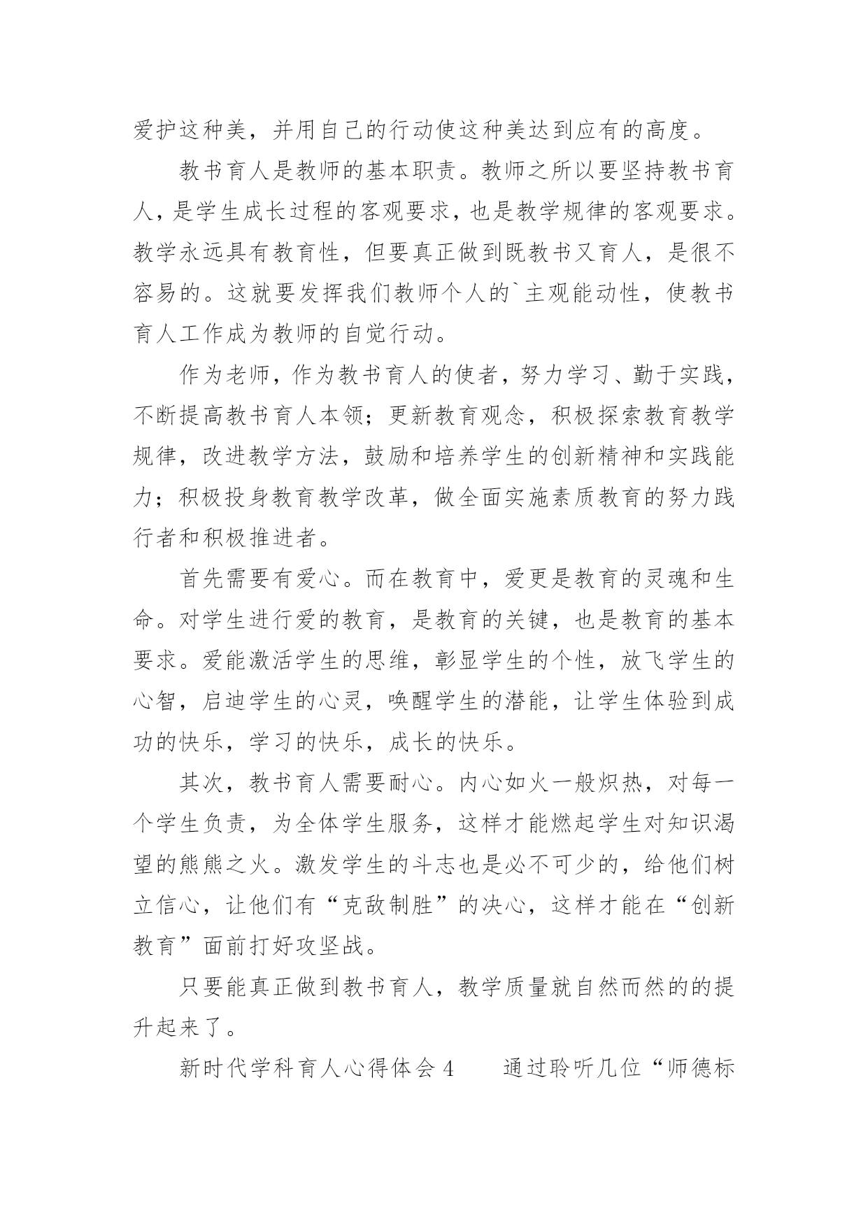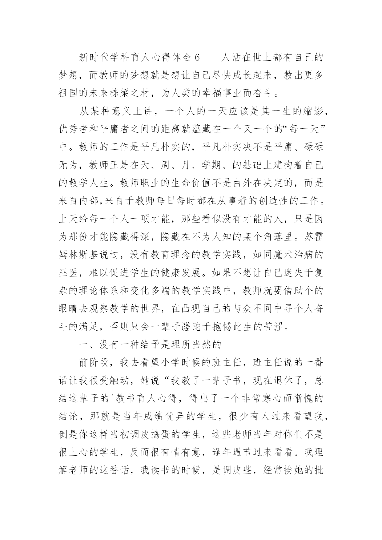 新时代学科育人心得体会新时代学科育人心得体会(精选8篇)在平日里,心中难免会有一些新的想法,写一篇心得体会,记录下来,这样有利于我们不断提升自我。是不是无从下笔、没有头绪?下面是小编为大家收集的新时代学科育人心得体会(精选8篇),欢迎大家分享。新时代学科育人心得体会1每个人的生命都是一朵花,每朵花盛开时都是那么美,让人充满期待,让我们放慢匆忙的脚步,俯下身子,去认真聆听花开的声音。在学习了王生英老师的事迹后,觉得她以坚韧顽强的意志和不屈不挠的精神扎根山区小学教育,在平凡的岗位上37年耕耘不辍,她就在聆听花开的声音。怀着对教师职业的特殊情感,高中毕业后我义无反顾地走上了三尺讲台,开始了我的从教旅程,一如花一般静静地绽放,悄悄吐露自己的芬芳,只为自己今生无怨无悔的选择。十几年来,我深深地体会到:教师的爱是滴滴甘露,即使枯萎的心灵也能苏醒;教师的爱是缕缕春风,即使冰冷的感情也会消融。怎样才能成为一名新时期的合格教师?在我看来,从一点一滴做起,在平凡中放歌,在平静中耕耘,在平常中闪光,让自己成为一名合格的教师。因为只有这样,才能以崇高的情操去影响学生、教育学生。既然选择了教师这个职业,就应该伸出热情的双手,怀着一颗热诚的心,在平凡的岗位上,以高度的责任感来提升自己。既然选择了这个职业,就要以此为荣,热爱它,而不是只把这个职业当作一种谋生的手段。教师是一个寂寞的职业。每个教师心中都有一座伟大的丰碑、一个伟大的理想,那就是以学生为本,教人务实,教人求真,教人创新。这都需要有一颗耐得住寂寞的`决心。教师是一个美丽的职业。她的美丽不仅在于她的无名,也在于她的淡泊与高尚,她用脱俗的气质阐述着生命的真谛。有一首诗歌最为动人,那就是师德;有一种人生最为美丽,那就是做教师;有一种风景最为亮丽,那就是师魂;有一种魔棒最为神奇,那就是粉笔;有一种平台最为神圣,那就是讲台。三寸粉笔写出人生风流,三尺讲台化作千顷苗圃。既然选择了教师这一高尚的职业,就应该勇敢地锤炼自己。如果我是一块砖,就应该属于巍峨的万里长城;如果我是一抹红霞,那就应该染遍祖国的万里山河。三寸粉笔写信仰,三尺讲台谋发展。信仰是浩瀚海洋的明灯,是漫漫黑夜里渴望的黎明。只要拿稳三寸粉笔,站稳三尺讲台,就要用心血与汗水去浇灌祖国的花朵,让种子发芽,让理想开花。人都说学生是花,教师是园丁。其实,教师的生命也是一朵花,是悄悄绽放、默默吐芳、扮美人间的花。如果仔细聆听,你会听到生命的律动,会听到世界上最美妙的声音!新时代学科育人心得体会2学校组织学习“全国教书育人楷模”十位教师的先进事迹,我深受感动,深深地体会到优秀教师的平凡和伟大,从他们身上,我看到了优秀教师那种爱岗敬业、无私奉献、事业为重的高尚品质,对工作一丝不苟的高度负责的敬业精神,乐于助人的高尚职业道德,而这些正是我们这些年轻老师有待学习的地方,在今后的工作和学习中多多发挥这些精神,提高自己。现结合学习材料有感而发,谈几点体会。一、立足本质,拥有一颗真诚的爱心优秀教师崇高的人生追求、高尚的师德情操、无私的奉献精神,感人至深,催人奋进。通过学习,我深刻体会到,作为一名教师,对于任何学生就是一个"爱"字。以无限的真情去关爱,用爱去感化每一个学生的心灵。当学生在学习上遇到困难,不厌其烦的耐心指导,当学生做错了事的时候,指导分析让学生知道做错事的原因。用温馨的语言教育学生,用母亲般的爱感化学生,使学生感受到教师的爱犹如父母,甚至胜于父母。感受到能在快乐中学习,在快乐中成长。总而言之,作为教师,我们要用自己的爱心、细心和关心让孩子真正能健康快乐地成长,那才是我们最大的幸福。二、对工作必须有强烈的事业心、责任感。我们应当学习优秀教师以学生为动力,以育人为首的精神。老师必须具有足够的耐心和责任心,不仅要规范学生的行为,更要了解学生的思想动态,对每一个学生都要进行有针对性地教育。时时处处观察学生,了解学生,对出现的问题及时指导解决。从自己身边的小事做起,要求别人做到的,自己必须努力做到。时时以"爱心、耐心、细心",去关心每一位学生,热爱每一个学生是我们的.责任,教育学生子是我们的神圣事业。对学生我们既要爱又要严,时刻把学生放在第一位,是作为一名老师必需承担的责任和义务。三、教师必须做到尊重、理解、信任、鼓励学生。通过学习优秀教师的事迹,我进一步体会到,在教育教学中,尊重学生,是我们老师必备的道德要求,尊重学生的人格,友好的对待他们,理解和信任他们,调动他们的积极性,多和他们交流,多鼓励和表扬他们,要尊重他们,宽容他们的过失,当学生有不足时,多给予激励和赞美,对学生精心呵护,尊重学生人格,善待、宽容、理解每一个学生,让他们感觉到在学校里比在家里的还要幸福的多,感受到学校生活的开心和幸福。四、与时俱进,开拓创新都说人是要活到老学到老的。时代在进步,孩子在成长,