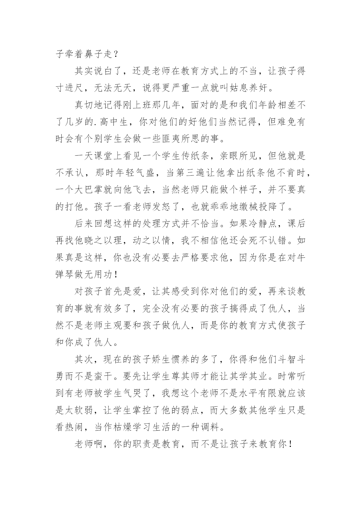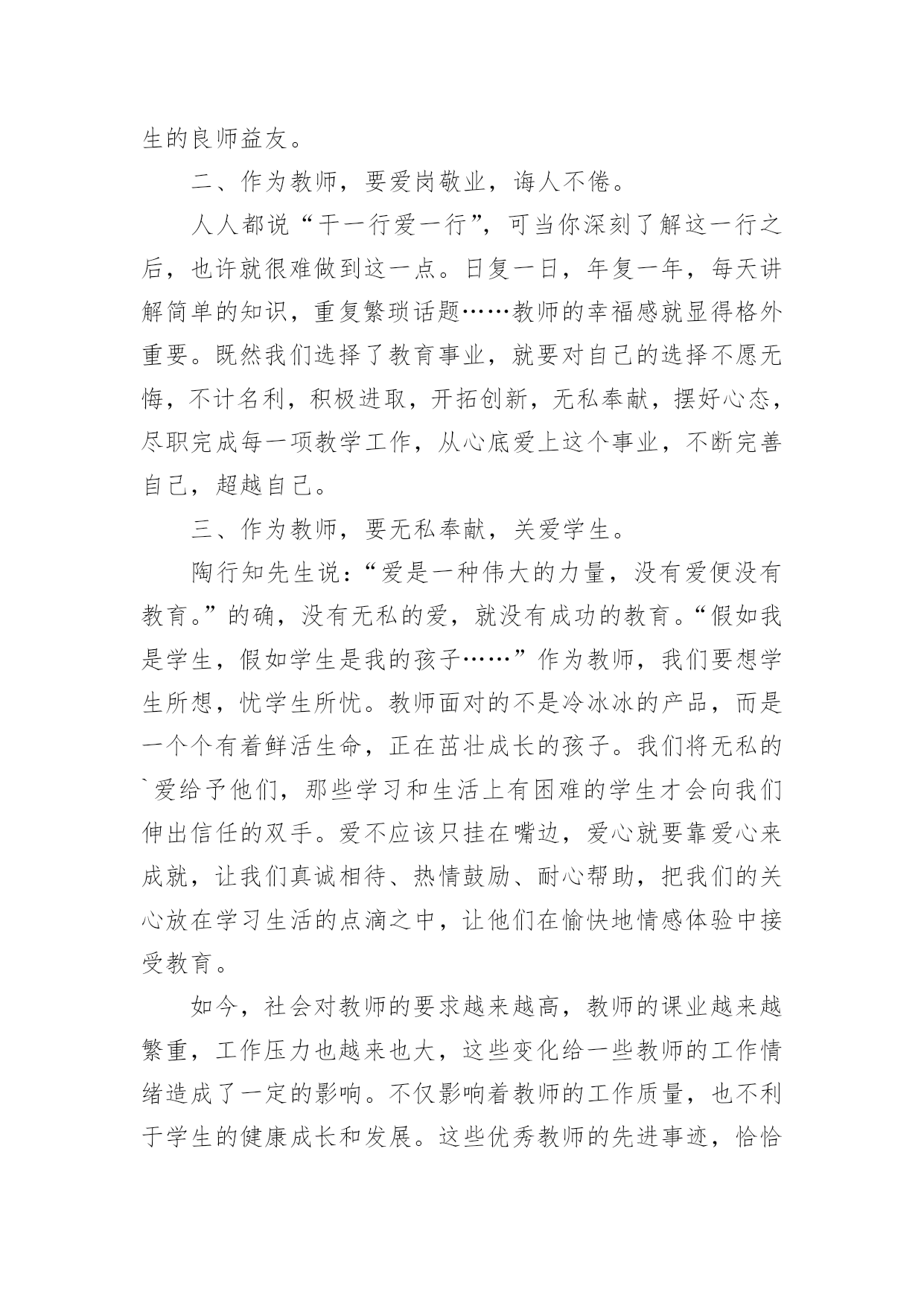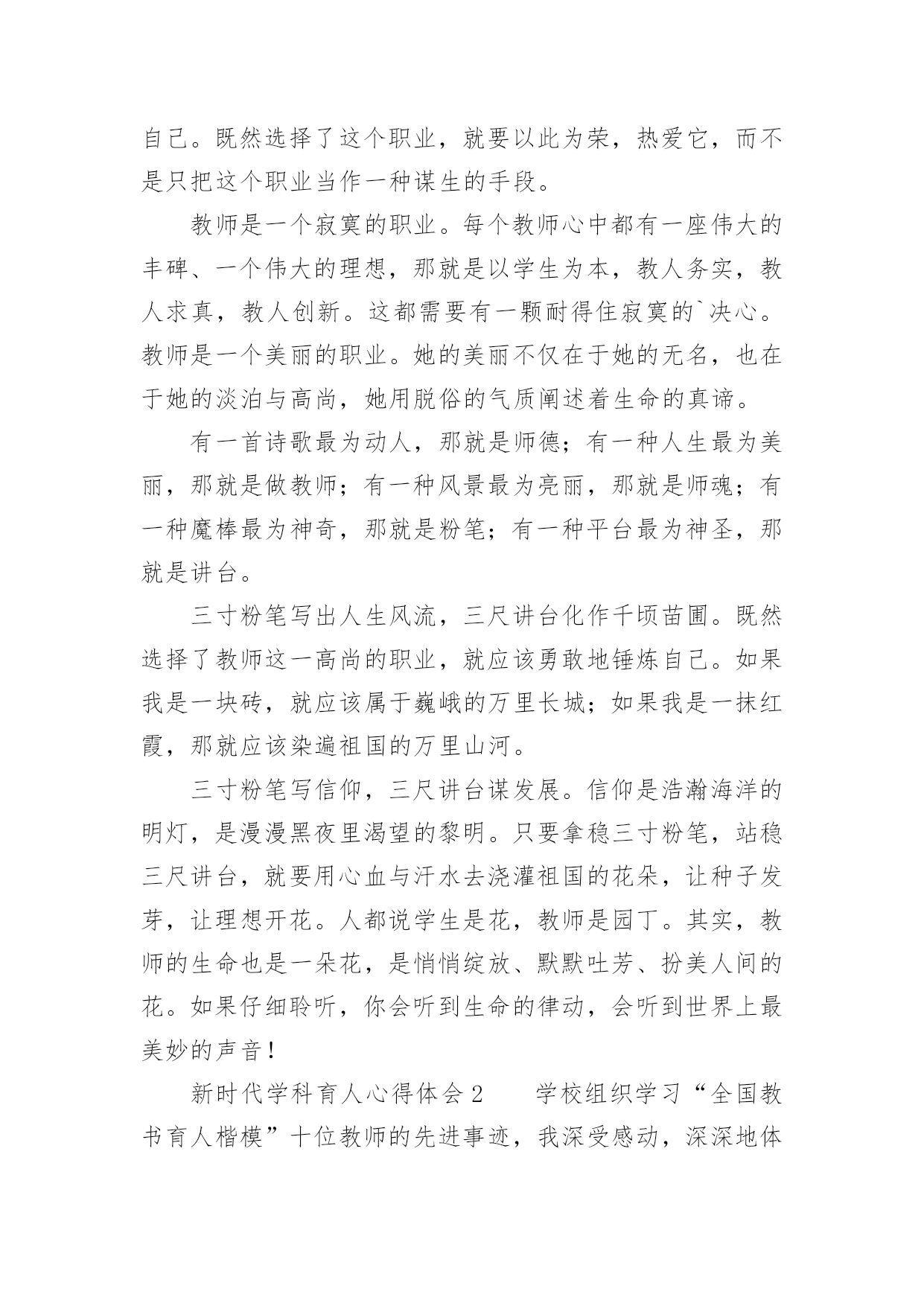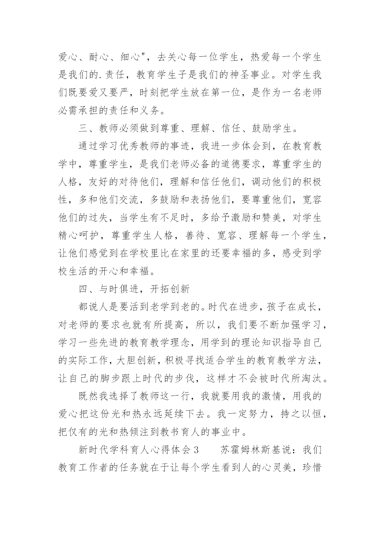 新时代学科育人心得体会新时代学科育人心得体会(精选8篇)在平日里,心中难免会有一些新的想法,写一篇心得体会,记录下来,这样有利于我们不断提升自我。是不是无从下笔、没有头绪?下面是小编为大家收集的新时代学科育人心得体会(精选8篇),欢迎大家分享。新时代学科育人心得体会1每个人的生命都是一朵花,每朵花盛开时都是那么美,让人充满期待,让我们放慢匆忙的脚步,俯下身子,去认真聆听花开的声音。在学习了王生英老师的事迹后,觉得她以坚韧顽强的意志和不屈不挠的精神扎根山区小学教育,在平凡的岗位上37年耕耘不辍,她就在聆听花开的声音。怀着对教师职业的特殊情感,高中毕业后我义无反顾地走上了三尺讲台,开始了我的从教旅程,一如花一般静静地绽放,悄悄吐露自己的芬芳,只为自己今生无怨无悔的选择。十几年来,我深深地体会到:教师的爱是滴滴甘露,即使枯萎的心灵也能苏醒;教师的爱是缕缕春风,即使冰冷的感情也会消融。怎样才能成为一名新时期的合格教师?在我看来,从一点一滴做起,在平凡中放歌,在平静中耕耘,在平常中闪光,让自己成为一名合格的教师。因为只有这样,才能以崇高的情操去影响学生、教育学生。既然选择了教师这个职业,就应该伸出热情的双手,怀着一颗热诚的心,在平凡的岗位上,以高度的责任感来提升自己。既然选择了这个职业,就要以此为荣,热爱它,而不是只把这个职业当作一种谋生的手段。教师是一个寂寞的职业。每个教师心中都有一座伟大的丰碑、一个伟大的理想,那就是以学生为本,教人务实,教人求真,教人创新。这都需要有一颗耐得住寂寞的`决心。教师是一个美丽的职业。她的美丽不仅在于她的无名,也在于她的淡泊与高尚,她用脱俗的气质阐述着生命的真谛。有一首诗歌最为动人,那就是师德;有一种人生最为美丽,那就是做教师;有一种风景最为亮丽,那就是师魂;有一种魔棒最为神奇,那就是粉笔;有一种平台最为神圣,那就是讲台。三寸粉笔写出人生风流,三尺讲台化作千顷苗圃。既然选择了教师这一高尚的职业,就应该勇敢地锤炼自己。如果我是一块砖,就应该属于巍峨的万里长城;如果我是一抹红霞,那就应该染遍祖国的万里山河。三寸粉笔写信仰,三尺讲台谋发展。信仰是浩瀚海洋的明灯,是漫漫黑夜里渴望的黎明。只要拿稳三寸粉笔,站稳三尺讲台,就要用心血与汗水去浇灌祖国的花朵,让种子发芽,让理想开花。人都说学生是花,教师是园丁。其实,教师的生命也是一朵花,是悄悄绽放、默默吐芳、扮美人间的花。如果仔细聆听,你会听到生命的律动,会听到世界上最美妙的声音!新时代学科育人心得体会2学校组织学习“全国教书育人楷模”十位教师的先进事迹,我深受感动,深深地体会到优秀教师的平凡和伟大,从他们身上,我看到了优秀教师那种爱岗敬业、无私奉献、事业为重的高尚品质,对工作一丝不苟的高度负责的敬业精神,乐于助人的高尚职业道德,而这些正是我们这些年轻老师有待学习的地方,在今后的工作和学习中多多发挥这些精神,提高自己。现结合学习材料有感而发,谈几点体会。一、立足本质,拥有一颗真诚的爱心优秀教师崇高的人生追求、高尚的师德情操、无私的奉献精神,感人至深,催人奋进。通过学习,我深刻体会到,作为一名教师,对于任何学生就是一个"爱"字。以无限的真情去关爱,用爱去感化每一个学生的心灵。当学生在学习上遇到困难,不厌其烦的耐心指导,当学生做错了事的时候,指导分析让学生知道做错事的原因。用温馨的语言教育学生,用母亲般的爱感化学生,使学生感受到教师的爱犹如父母,甚至胜于父母。感受到能在快乐中学习,在快乐中成长。总而言之,作为教师,我们要用自己的爱心、细心和关心让孩子真正能健康快乐地成长,那才是我们最大的幸福。二、对工作必须有强烈的事业心、责任感。我们应当学习优秀教师以学生为动力,以育人为首的精神。老师必须具有足够的耐心和责任心,不仅要规范学生的行为,更要了解学生的思想动态,对每一个学生都要进行有针对性地教育。时时处处观察学生,了解学生,对出现的问题及时指导解决。从自己身边的小事做起,要求别人做到的,自己必须努力做到。时时以"爱心、耐心、细心",去关心每一位学生,热爱每一个学生是我们的.责任,教育学生子是我们的神圣事业。对学生我们既要爱又要严,时刻把学生放在第一位,是作为一名老师必需承担的责任和义务。三、教师必须做到尊重、理解、信任、鼓励学生。通过学习优秀教师的事迹,我进一步体会到,在教育教学中,尊重学生,是我们老师必备的道德要求,尊重学生的人格,友好的对待他们,理解和信任他们,调动他们的积极性,多和他们交流,多鼓励和表扬他们,要尊重他们,宽容他们的过失,当学生有不足时,多给予激励和赞美,对学生精心呵护,尊重学生人格,善待、宽容、理解每一个学生,让他们感觉到在学校里比在家里的还要幸福的多,感受到学校生活的开心和幸福。四、与时俱进,开拓创新都说人是要活到老学到老的。时代在进步,孩子在成长,