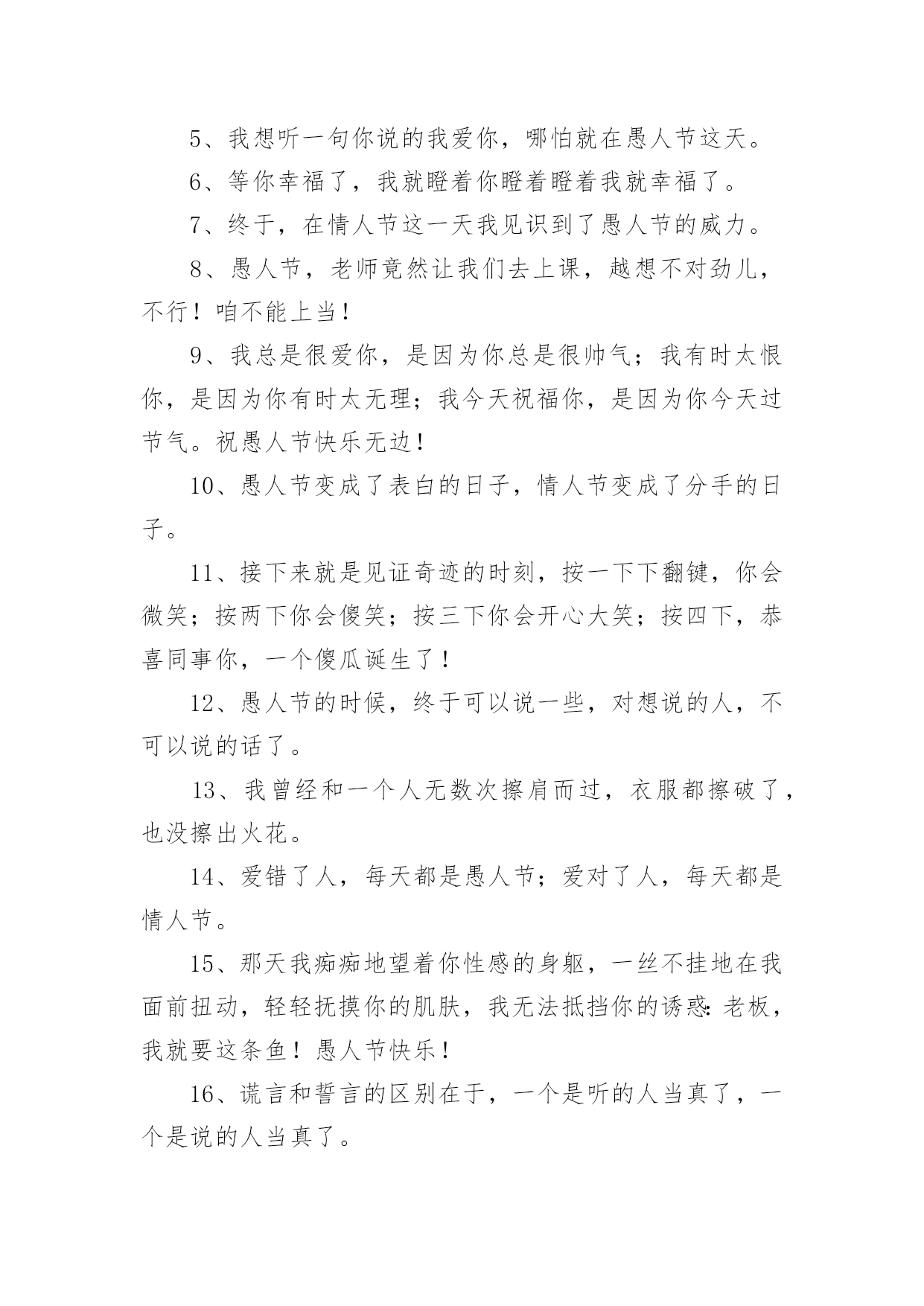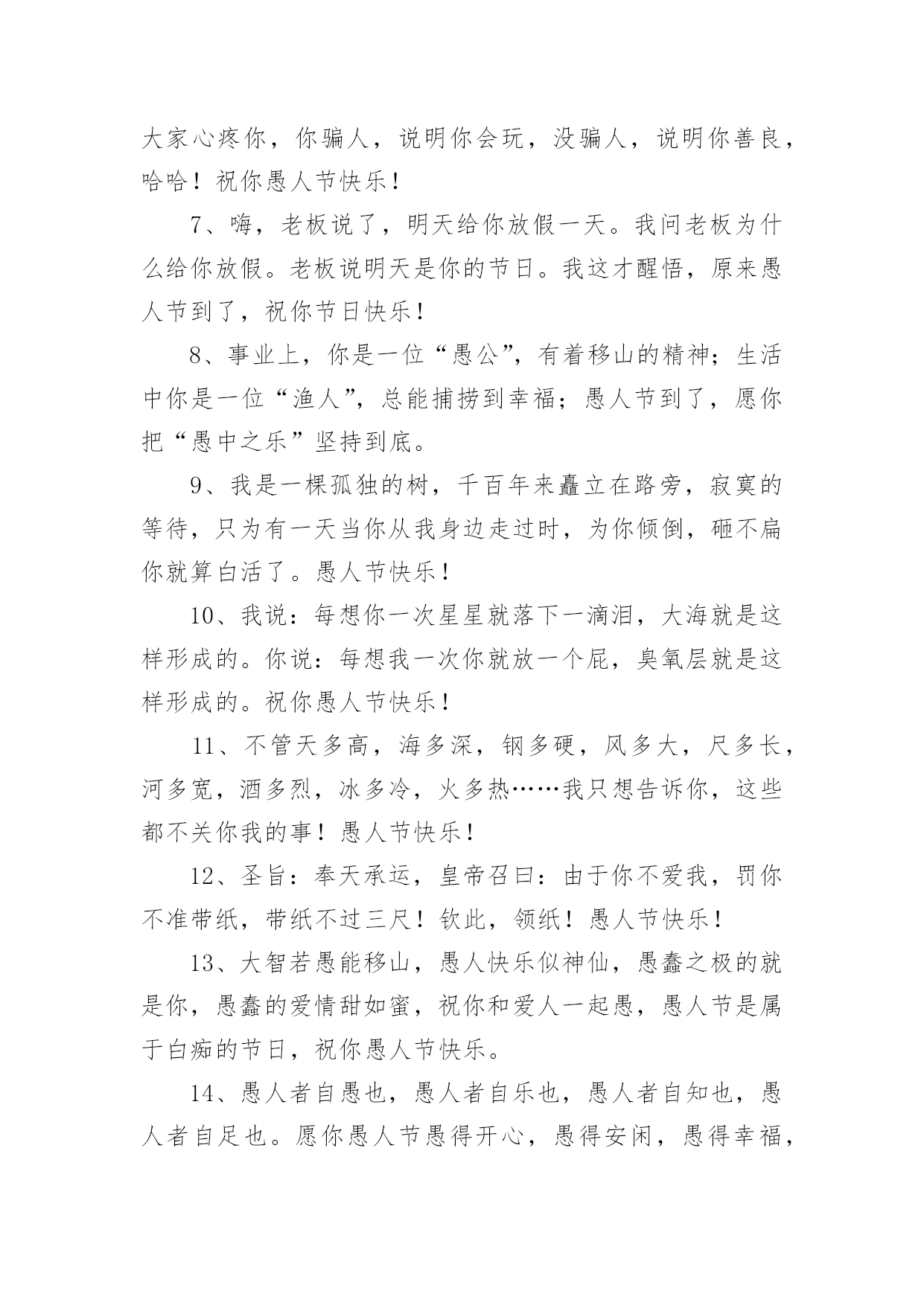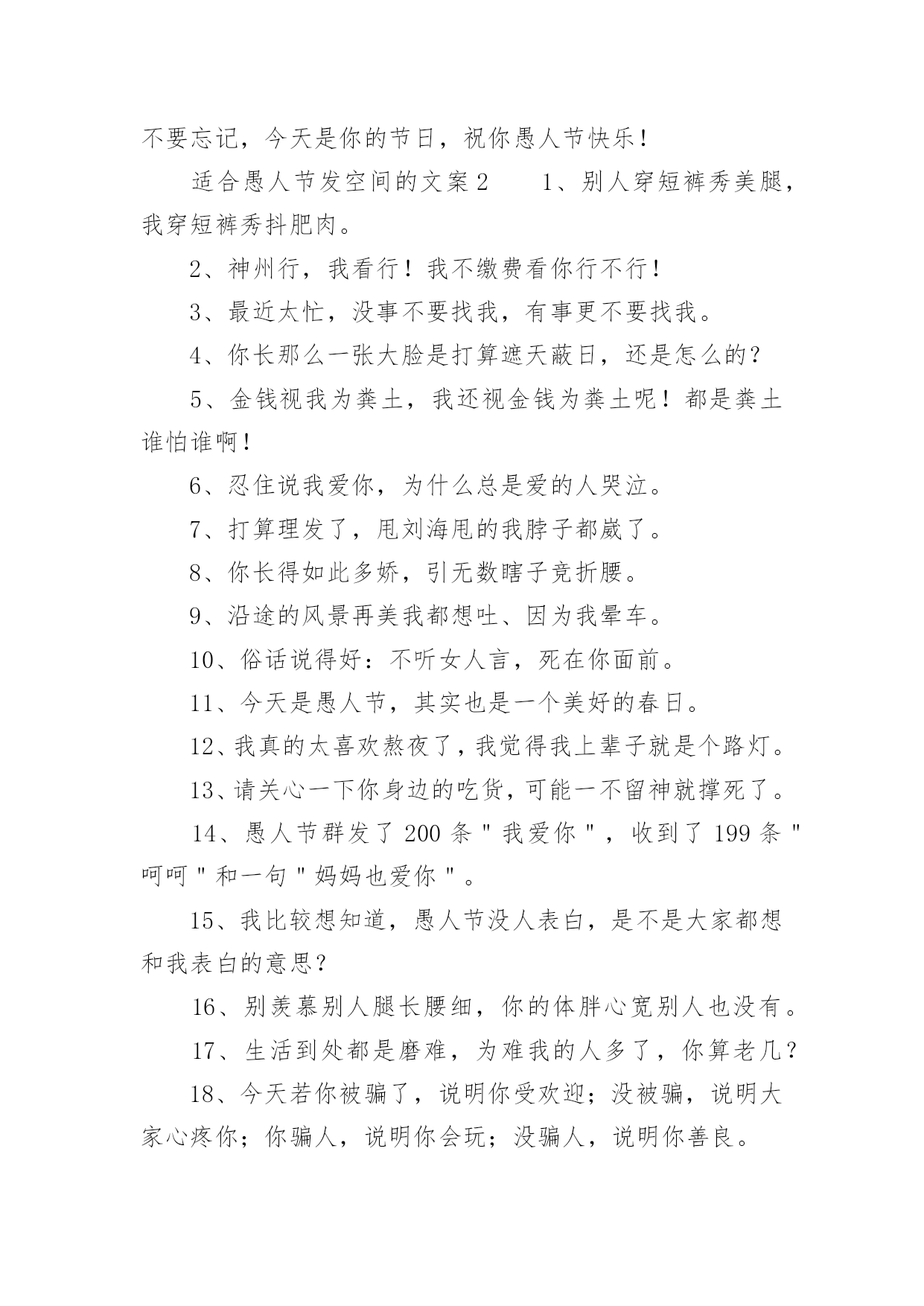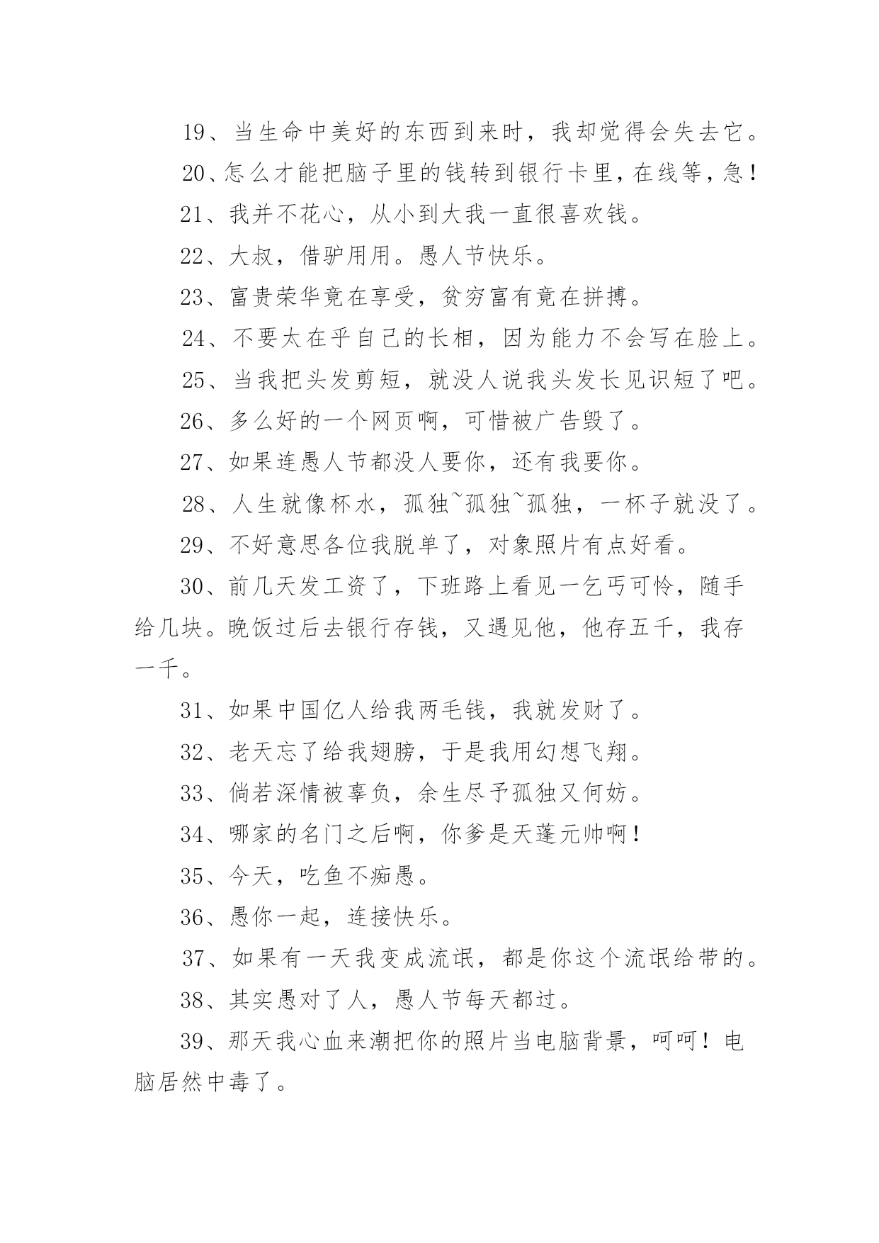 适合愚人节发空间的文案2022适合愚人节发空间的文案(精选160句)随着在线社交网络的爆炸式增长,越来越多人热衷于在社交平台上发布文案,文案用以宣泄自己的小情绪,分享自己的心情。什么样的文案才让人眼前一亮呢?下面是小编收集整理的2022适合愚人节发空间的文案(精选160句),仅供参考,大家一起来看看吧。适合愚人节发空间的文案11、你的脸比陈世美还美你的眼比诸葛亮还亮;我的爱比鲁智深还深我的情比关云长还长,但我的诺言比孙悟空还空。愚人节快乐!2、你站在人群中,被柔柔的风吹起长发,像人间最美的旋律,在我心头久久回荡,我想说:你的假发要掉了……今天是愚人节哦。3、我觉得认识你这么久了,你这人特别的,极度的,非常的,罕见的,与众不同的笨,而且笨得可爱,嘻嘻,别生气啊!愚人节快乐!4、看美女请往下按……不好,美女跑掉了……我都说跑掉了你还按……笨蛋,你还在按……唉,真的没有了!只能祝你愚人节快乐了!5、那次邂逅,我的只眼睛再没离开你,生有幸成为你知己,想你、次,相思泪成河,漂着零落的记忆和雀跃的心,说话,今天愚人节哈6、今天惹你被骗了,那说明你受欢迎,没被骗,说明大家心疼你,你骗人,说明你会玩,没骗人,说明你善良,哈哈!祝你愚人节快乐!7、嗨,老板说了,明天给你放假一天。我问老板为什么给你放假。老板说明天是你的节日。我这才醒悟,原来愚人节到了,祝你节日快乐!8、事业上,你是一位“愚公”,有着移山的精神;生活中你是一位“渔人”,总能捕捞到幸福;愚人节到了,愿你把“愚中之乐”坚持到底。9、我是一棵孤独的树,千百年来矗立在路旁,寂寞的等待,只为有一天当你从我身边走过时,为你倾倒,砸不扁你就算白活了。愚人节快乐!10、我说:每想你一次星星就落下一滴泪,大海就是这样形成的。你说:每想我一次你就放一个屁,臭氧层就是这样形成的。祝你愚人节快乐!11、不管天多高,海多深,钢多硬,风多大,尺多长,河多宽,酒多烈,冰多冷,火多热……我只想告诉你,这些都不关你我的事!愚人节快乐!12、圣旨:奉天承运,皇帝召曰:由于你不爱我,罚你不准带纸,带纸不过三尺!钦此,领纸!愚人节快乐!13、大智若愚能移山,愚人快乐似神仙,愚蠢之极的就是你,愚蠢的爱情甜如蜜,祝你和爱人一起愚,愚人节是属于白痴的节日,祝你愚人节快乐。14、愚人者自愚也,愚人者自乐也,愚人者自知也,愚人者自足也。愿你愚人节愚得开心,愚得安闲,愚得幸福,愚得大丰收!嘻嘻!愚人节快乐!15、愚人节,为了“愚”你同乐,我“愚”重心长地送你这条愚味无穷的短信,愿你做个快乐的“愚”人:日日欢愚,月月愚悦,“愚”人节快乐!16、愚人节愿你生活如愚得水,能力绰绰有愚,财富月月有愚,做事不遗愚力,饮食愚味无穷,茶愚饭后谈笑风生,所以烦恼愚消云散,愚人节快乐!17、愚人节来人欢愉,聪明愚人愚聪明。你愚人来人愚你,愚来愚去愚出情。愚人节来愚人喜,愚人被愚愚舒心。愚人节祝你年年被人愚,年年有愚。18、昨天有人看见你了,你还是那样迷人,穿着格子背心,慢悠悠地走着,一副超然自在的样子,实在是可爱极了,真不知你当年是怎么赛过兔子的。19、愚人节到短信多,我的祝福算最好,收到马上无烦恼,阅读之后痛苦少,转发还能薪水高,群发定会捡钞票。今日愚人节,祝你节日快乐,一切顺心!20、种人可以和我生生世世,叫情人;有一种人可以与我血浓于水,叫亲人;还有一种人被我卖了还在帮数钱,例如看短信的你,就叫愚人!祝节日快乐!21、我发短信有讲究,对方是聪明人就整蛊他,幽默人就开涮他,比较迟钝的人,我就提醒他别被整,愚人节到了,收短信要小心,别被整。祝愚人节快乐!22、这一天,请时刻保持警惕。警惕一切经要发生的未知事件。记得用你聪明的大脑分辨这个充满欺骗而又无罪的一天。否则,我只能祝福你:愚人节快乐!23、天苍苍,野茫茫。今年的希望——太渺茫。水湾湾,路长长,没钱的日子——太漫长,楼高高,人忙忙,结头暗号愚人节快乐。24、对你爱恋藏在心底,对你思念深埋心田,有你陪伴幸福无限,没你陪伴寂寞孤单,想你的心每时每刻,如今,只想告诉你,愚你在此时此刻。愚人节快乐!25、我每天都会向佛祖祈求得到一枝持久盛开的玫瑰花,等到九百九十九朵的时候一起送给你并动情的说:小样儿,我就不信招来的蜜蜂不蛰你!愚人节快乐!26、没有你的天空不蓝,少了你的地球不转;你是我们的骄傲,是你让这节日更加美满;此时此刻我向你发来贺电,祝你在你的节日里笑的灿烂;愚人节快乐!27、量窗量床又量墙,跳上床量窗,靠住墙量床,墙比张床长,床又比窗长,窗长不过床,床又长不过墙,所以墙比床比窗长,读不顺就去撞墙。愚人节快乐!28、最近得了个美白秘方,我亲眼看见一个长得特别黑的人变得特别白,真的很有效!有好事当然想着你,方法就是——用面粉沾水后在脸上涂几层。愚人节快乐!29、好花季季开,好话天天来,好事面