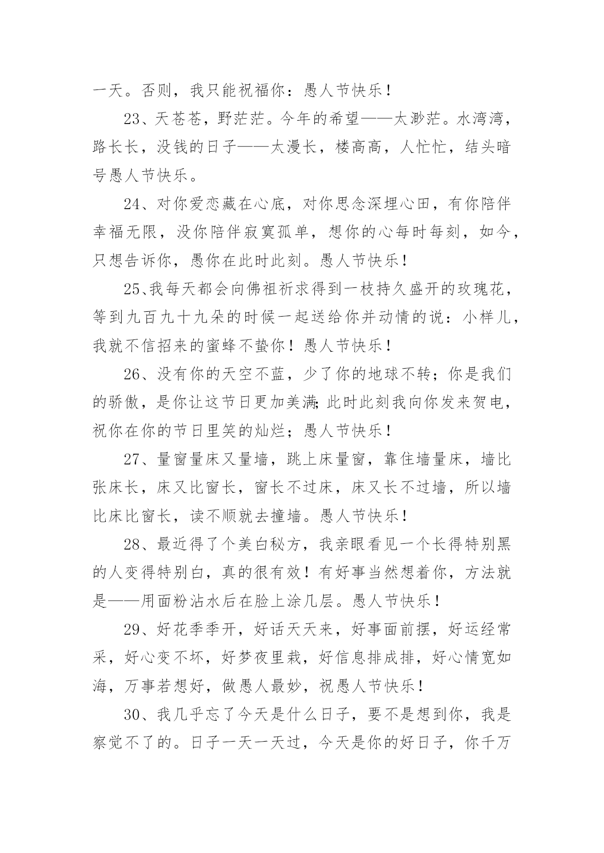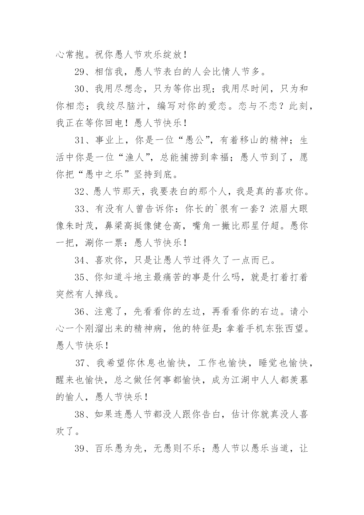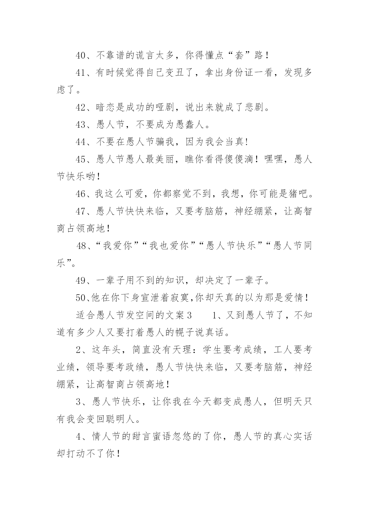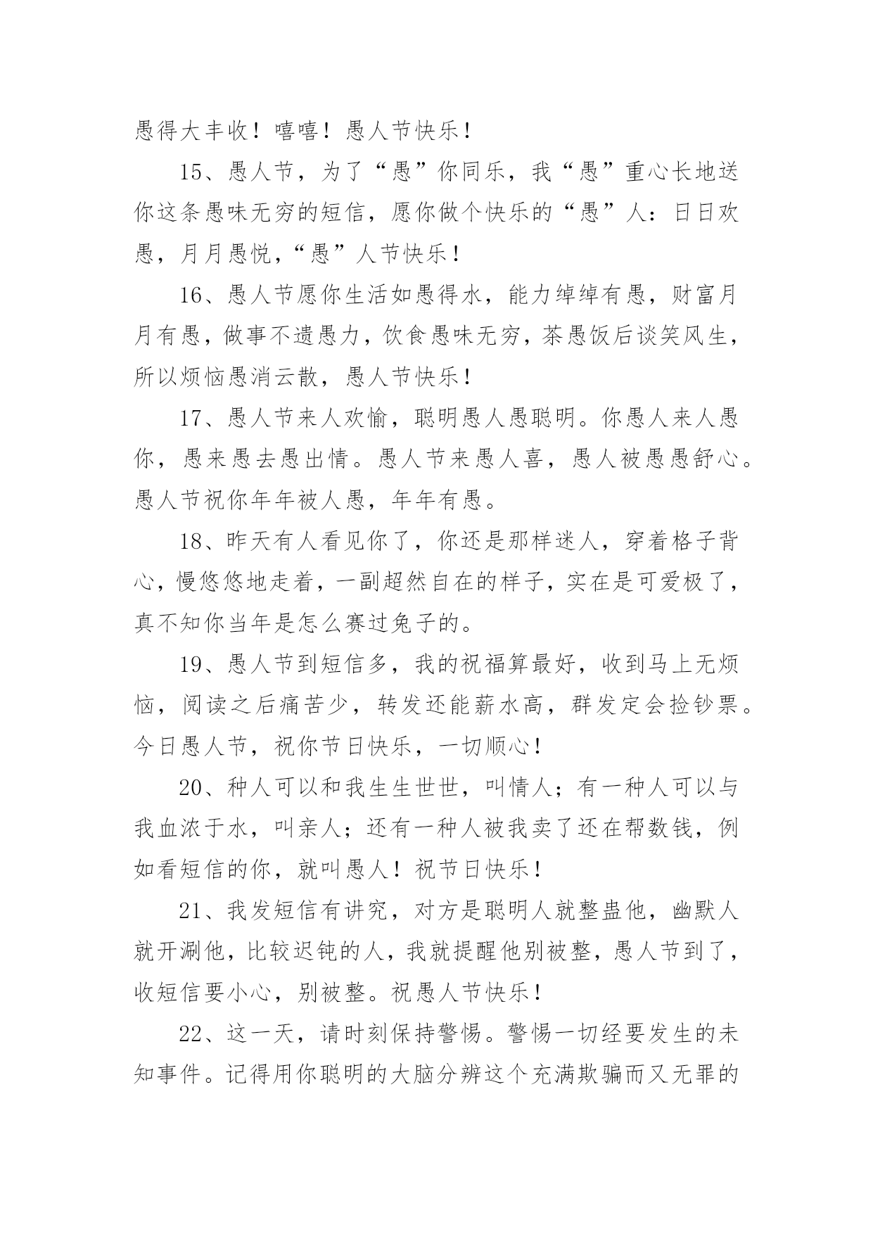 适合愚人节发空间的文案2022适合愚人节发空间的文案(精选160句)随着在线社交网络的爆炸式增长,越来越多人热衷于在社交平台上发布文案,文案用以宣泄自己的小情绪,分享自己的心情。什么样的文案才让人眼前一亮呢?下面是小编收集整理的2022适合愚人节发空间的文案(精选160句),仅供参考,大家一起来看看吧。适合愚人节发空间的文案11、你的脸比陈世美还美你的眼比诸葛亮还亮;我的爱比鲁智深还深我的情比关云长还长,但我的诺言比孙悟空还空。愚人节快乐!2、你站在人群中,被柔柔的风吹起长发,像人间最美的旋律,在我心头久久回荡,我想说:你的假发要掉了……今天是愚人节哦。3、我觉得认识你这么久了,你这人特别的,极度的,非常的,罕见的,与众不同的笨,而且笨得可爱,嘻嘻,别生气啊!愚人节快乐!4、看美女请往下按……不好,美女跑掉了……我都说跑掉了你还按……笨蛋,你还在按……唉,真的没有了!只能祝你愚人节快乐了!5、那次邂逅,我的只眼睛再没离开你,生有幸成为你知己,想你、次,相思泪成河,漂着零落的记忆和雀跃的心,说话,今天愚人节哈6、今天惹你被骗了,那说明你受欢迎,没被骗,说明大家心疼你,你骗人,说明你会玩,没骗人,说明你善良,哈哈!祝你愚人节快乐!7、嗨,老板说了,明天给你放假一天。我问老板为什么给你放假。老板说明天是你的节日。我这才醒悟,原来愚人节到了,祝你节日快乐!8、事业上,你是一位“愚公”,有着移山的精神;生活中你是一位“渔人”,总能捕捞到幸福;愚人节到了,愿你把“愚中之乐”坚持到底。9、我是一棵孤独的树,千百年来矗立在路旁,寂寞的等待,只为有一天当你从我身边走过时,为你倾倒,砸不扁你就算白活了。愚人节快乐!10、我说:每想你一次星星就落下一滴泪,大海就是这样形成的。你说:每想我一次你就放一个屁,臭氧层就是这样形成的。祝你愚人节快乐!11、不管天多高,海多深,钢多硬,风多大,尺多长,河多宽,酒多烈,冰多冷,火多热……我只想告诉你,这些都不关你我的事!愚人节快乐!12、圣旨:奉天承运,皇帝召曰:由于你不爱我,罚你不准带纸,带纸不过三尺!钦此,领纸!愚人节快乐!13、大智若愚能移山,愚人快乐似神仙,愚蠢之极的就是你,愚蠢的爱情甜如蜜,祝你和爱人一起愚,愚人节是属于白痴的节日,祝你愚人节快乐。14、愚人者自愚也,愚人者自乐也,愚人者自知也,愚人者自足也。愿你愚人节愚得开心,愚得安闲,愚得幸福,愚得大丰收!嘻嘻!愚人节快乐!15、愚人节,为了“愚”你同乐,我“愚”重心长地送你这条愚味无穷的短信,愿你做个快乐的“愚”人:日日欢愚,月月愚悦,“愚”人节快乐!16、愚人节愿你生活如愚得水,能力绰绰有愚,财富月月有愚,做事不遗愚力,饮食愚味无穷,茶愚饭后谈笑风生,所以烦恼愚消云散,愚人节快乐!17、愚人节来人欢愉,聪明愚人愚聪明。你愚人来人愚你,愚来愚去愚出情。愚人节来愚人喜,愚人被愚愚舒心。愚人节祝你年年被人愚,年年有愚。18、昨天有人看见你了,你还是那样迷人,穿着格子背心,慢悠悠地走着,一副超然自在的样子,实在是可爱极了,真不知你当年是怎么赛过兔子的。19、愚人节到短信多,我的祝福算最好,收到马上无烦恼,阅读之后痛苦少,转发还能薪水高,群发定会捡钞票。今日愚人节,祝你节日快乐,一切顺心!20、种人可以和我生生世世,叫情人;有一种人可以与我血浓于水,叫亲人;还有一种人被我卖了还在帮数钱,例如看短信的你,就叫愚人!祝节日快乐!21、我发短信有讲究,对方是聪明人就整蛊他,幽默人就开涮他,比较迟钝的人,我就提醒他别被整,愚人节到了,收短信要小心,别被整。祝愚人节快乐!22、这一天,请时刻保持警惕。警惕一切经要发生的未知事件。记得用你聪明的大脑分辨这个充满欺骗而又无罪的一天。否则,我只能祝福你:愚人节快乐!23、天苍苍,野茫茫。今年的希望——太渺茫。水湾湾,路长长,没钱的日子——太漫长,楼高高,人忙忙,结头暗号愚人节快乐。24、对你爱恋藏在心底,对你思念深埋心田,有你陪伴幸福无限,没你陪伴寂寞孤单,想你的心每时每刻,如今,只想告诉你,愚你在此时此刻。愚人节快乐!25、我每天都会向佛祖祈求得到一枝持久盛开的玫瑰花,等到九百九十九朵的时候一起送给你并动情的说:小样儿,我就不信招来的蜜蜂不蛰你!愚人节快乐!26、没有你的天空不蓝,少了你的地球不转;你是我们的骄傲,是你让这节日更加美满;此时此刻我向你发来贺电,祝你在你的节日里笑的灿烂;愚人节快乐!27、量窗量床又量墙,跳上床量窗,靠住墙量床,墙比张床长,床又比窗长,窗长不过床,床又长不过墙,所以墙比床比窗长,读不顺就去撞墙。愚人节快乐!28、最近得了个美白秘方,我亲眼看见一个长得特别黑的人变得特别白,真的很有效!有好事当然想着你,方法就是——用面粉沾水后在脸上涂几层。愚人节快乐!29、好花季季开,好话天天来,好事面